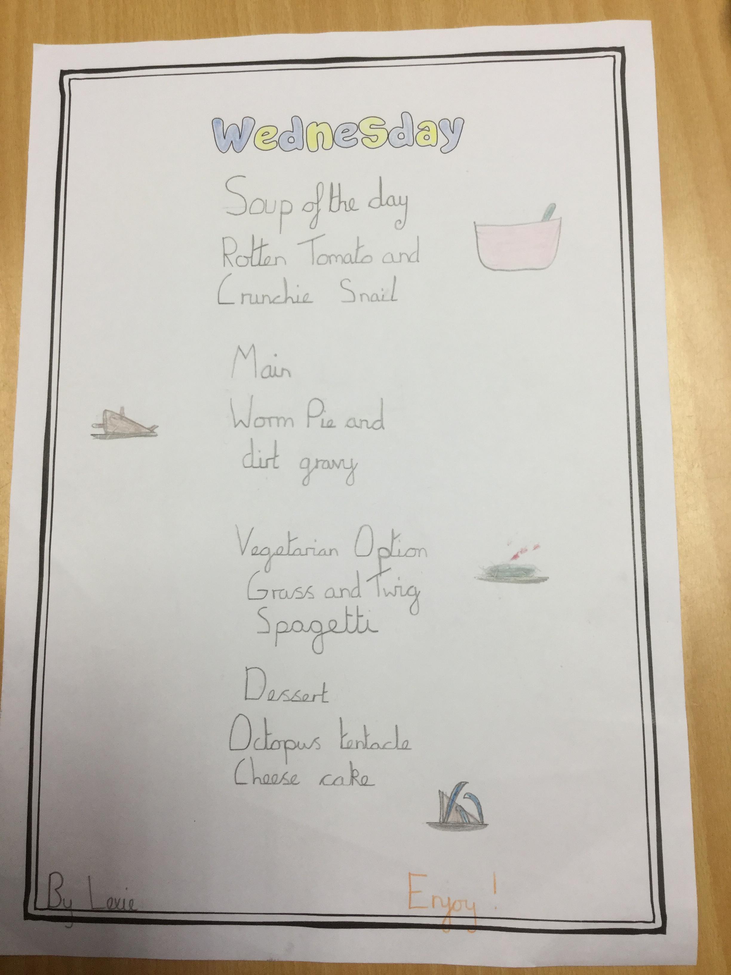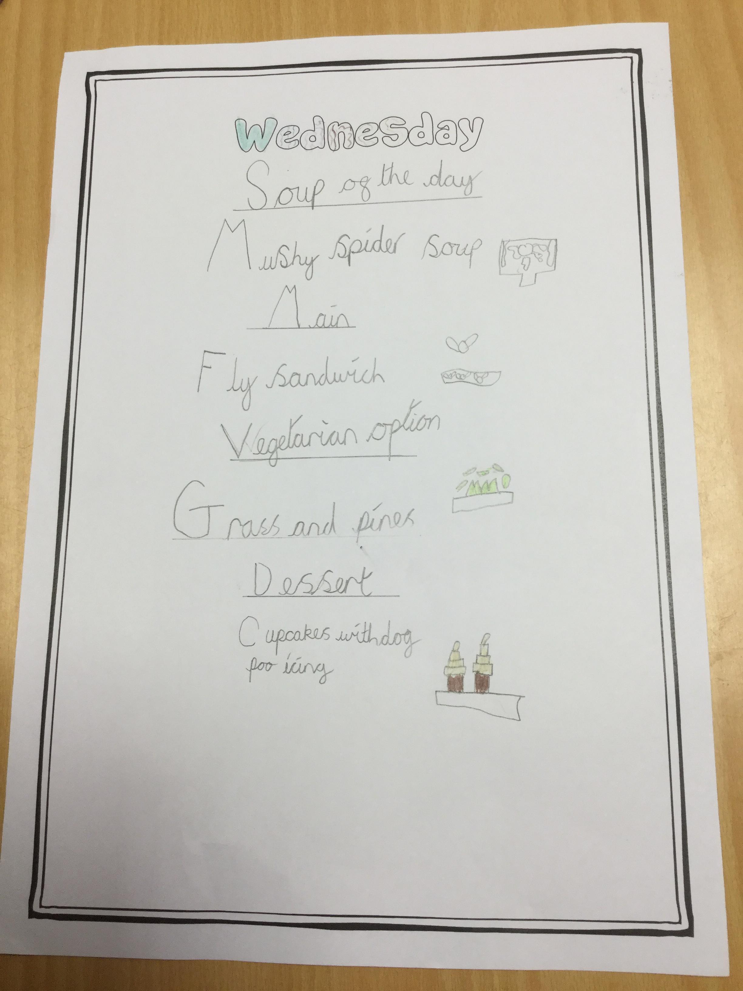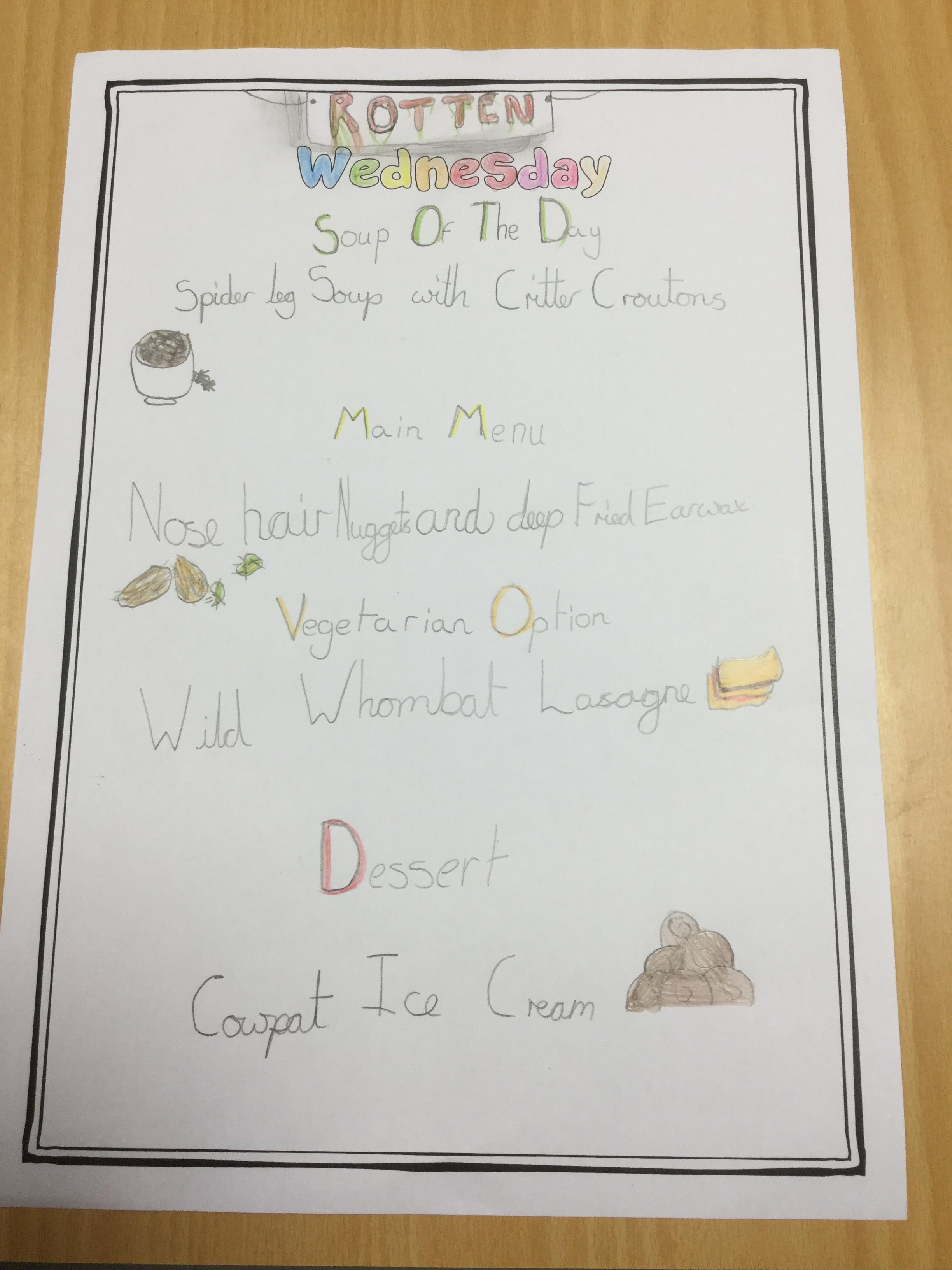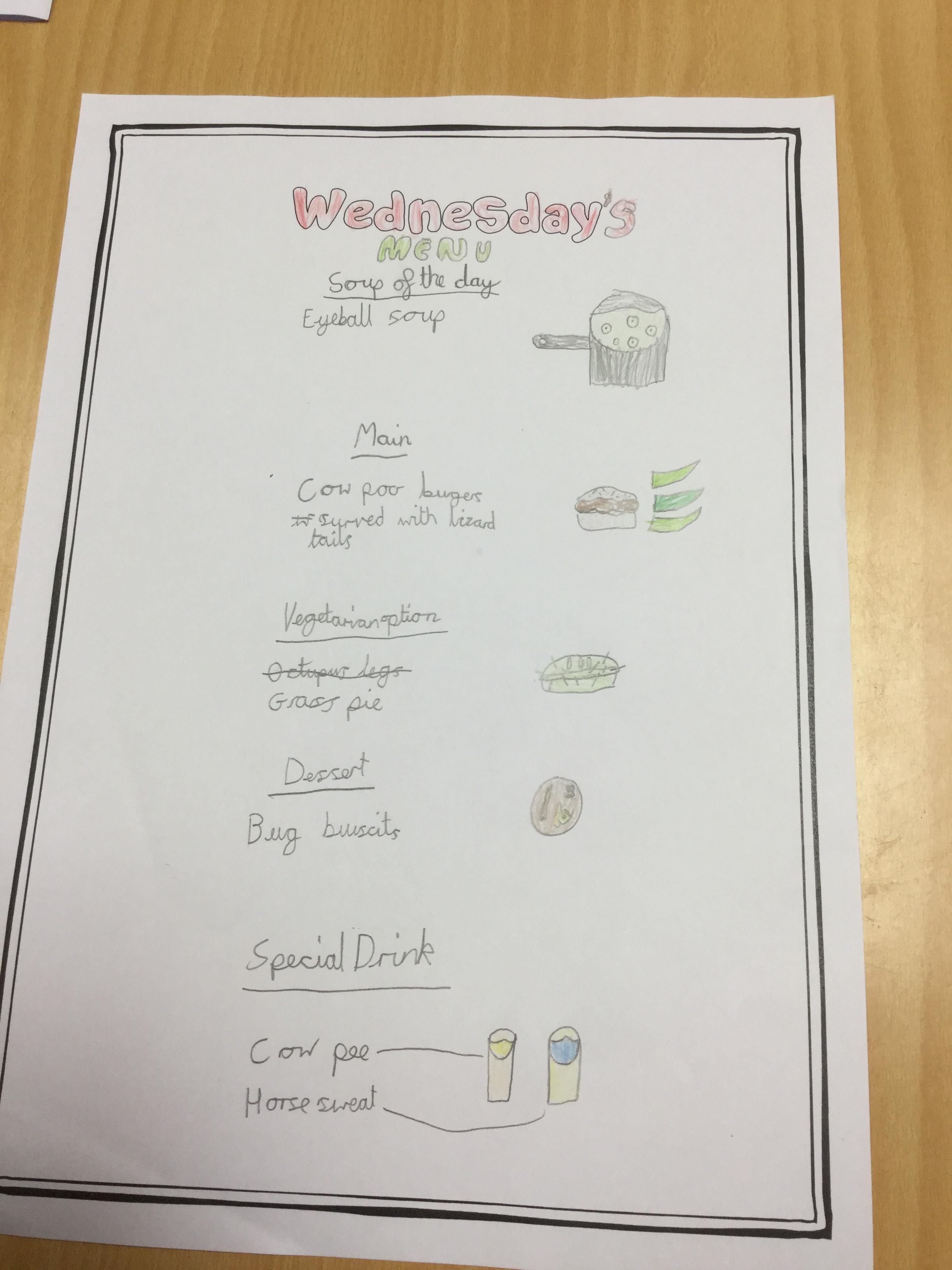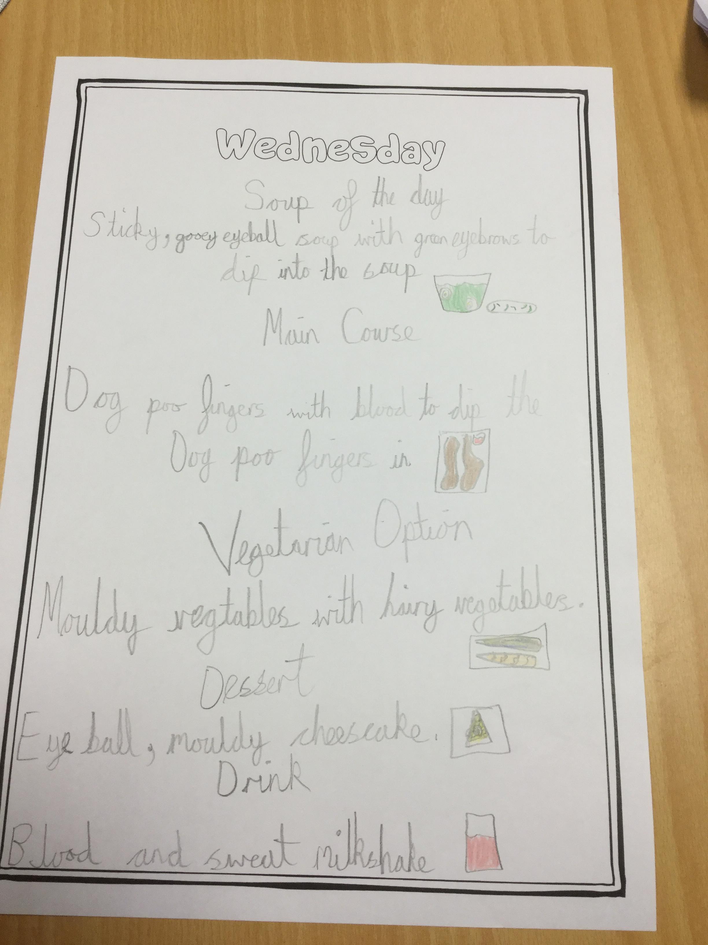The children who visited Mrs Wolfenden’s class (aka Mrs Trafe!) wrote a new disgusting menu for Wednesday. They also got to make Thursday’s pudding - ogre’s eyeballs! They all had fun thinking of gross foods and of course they loved getting to eat their eyeballs at the end!