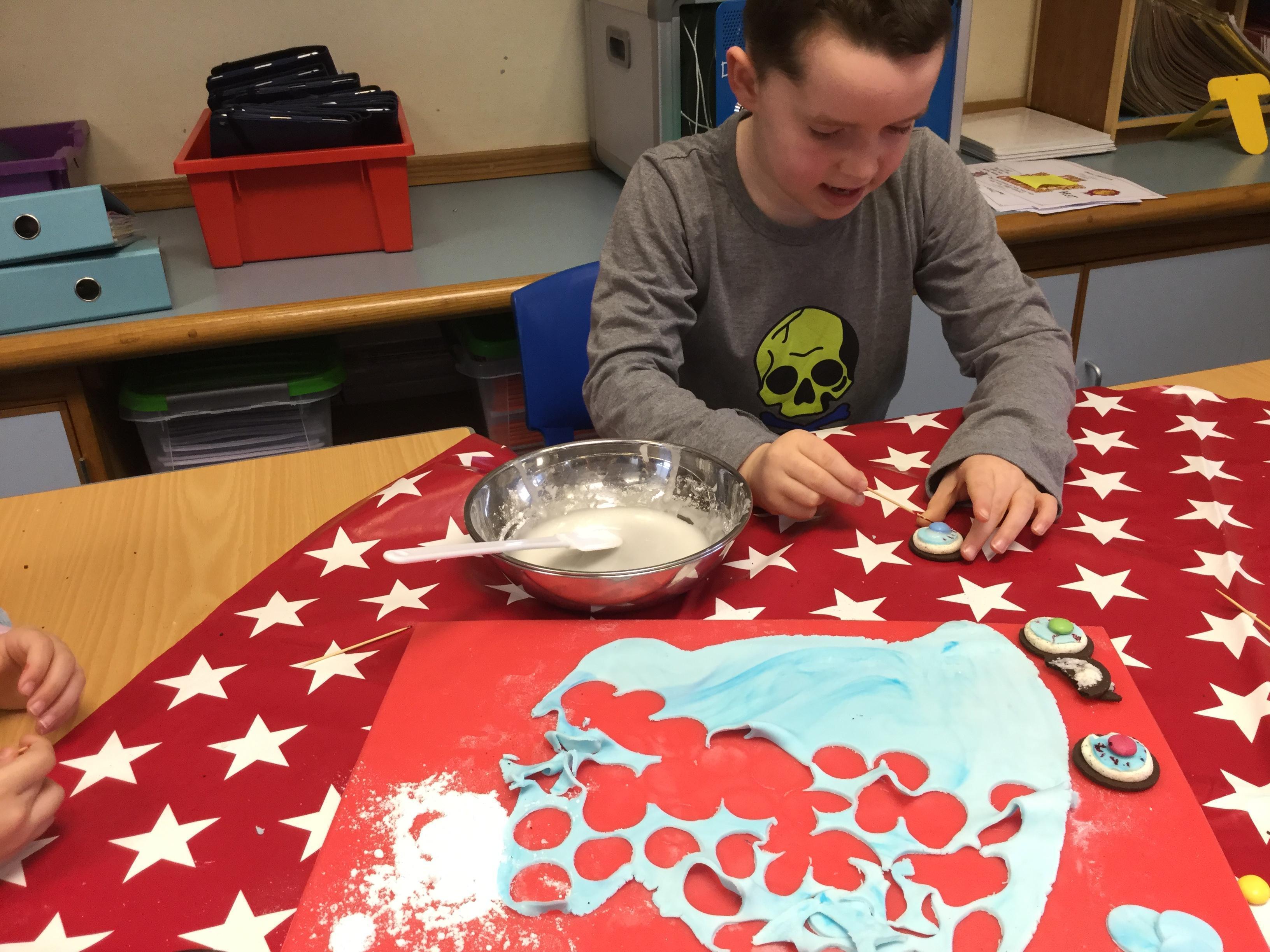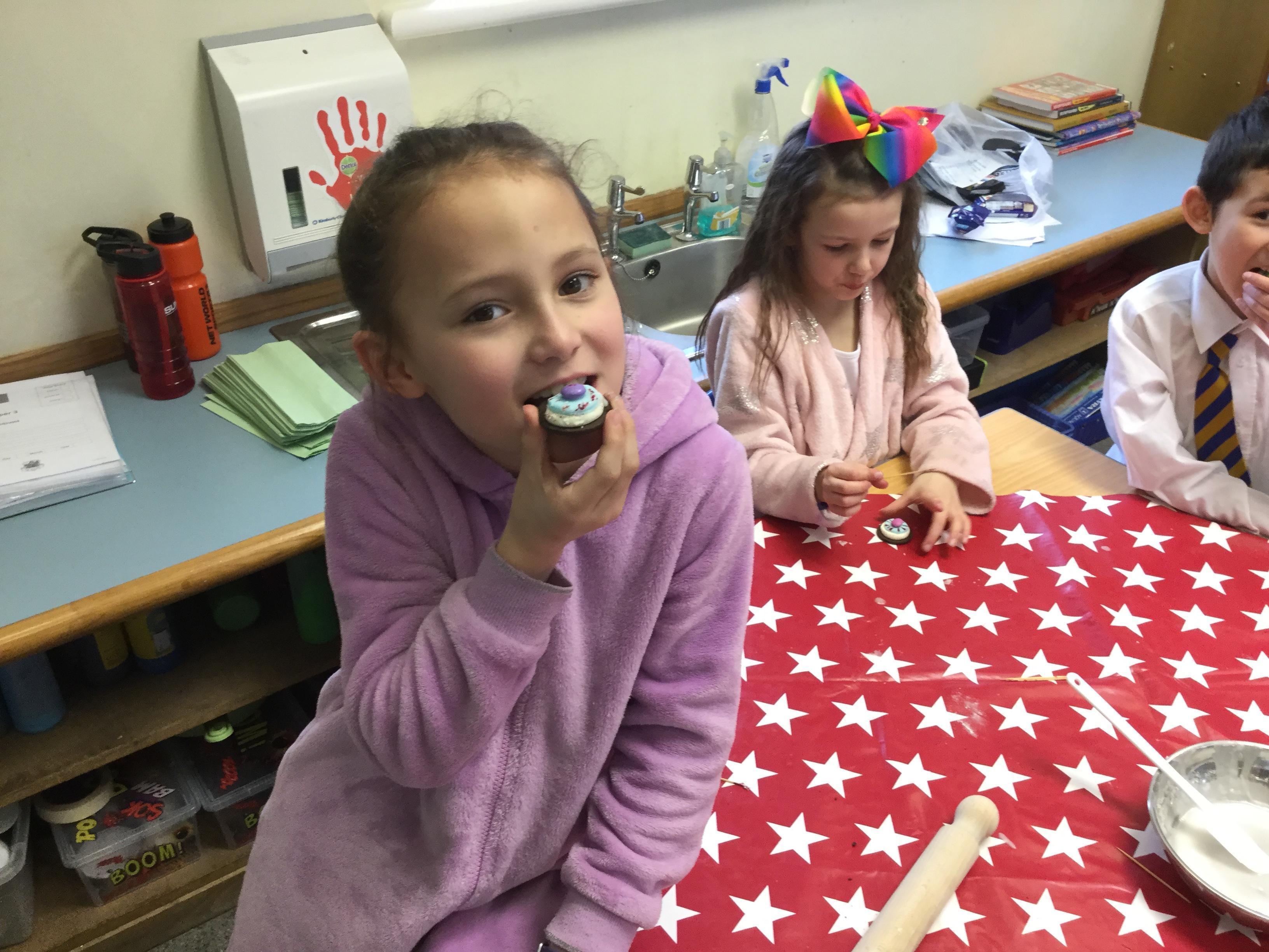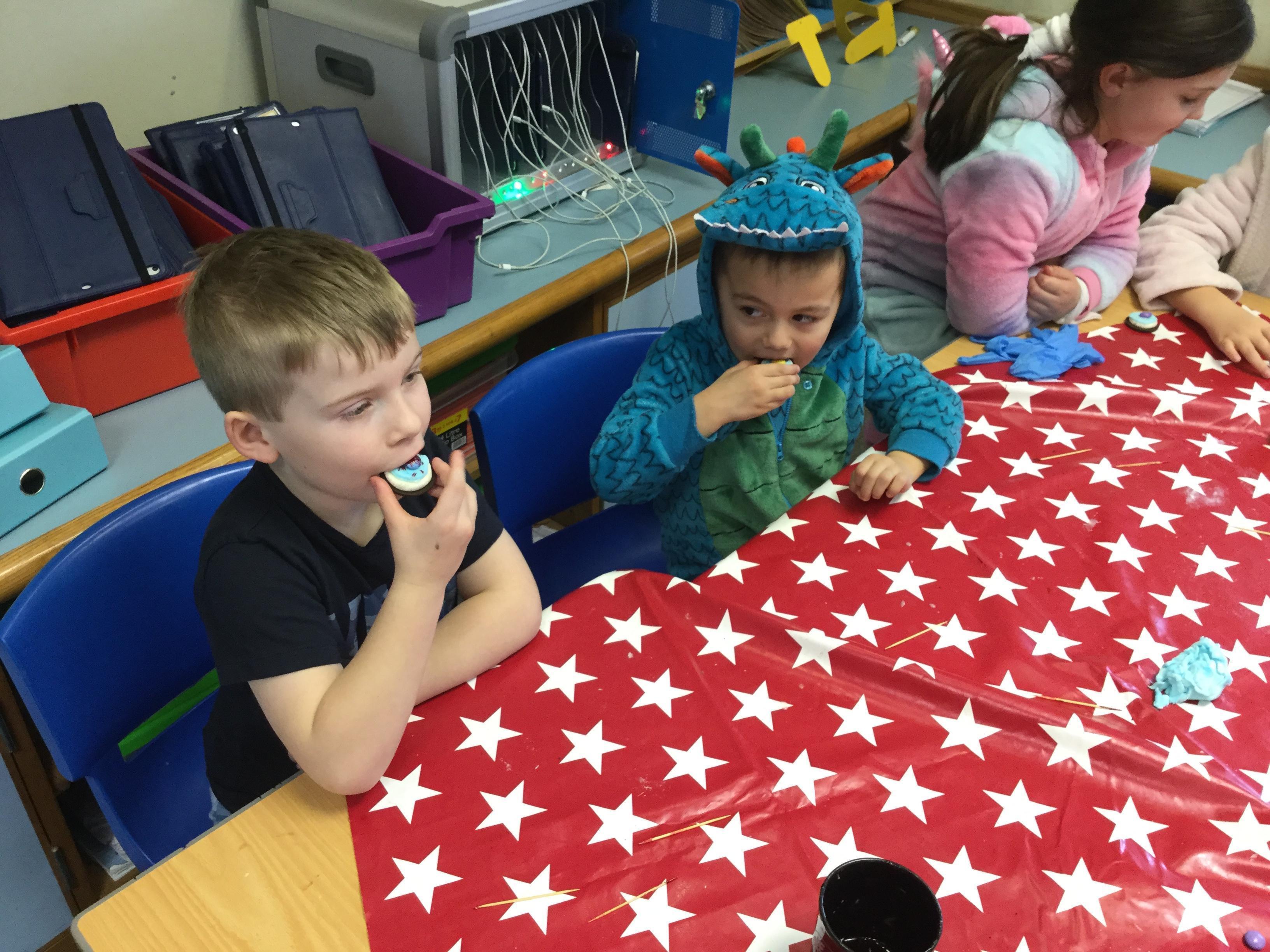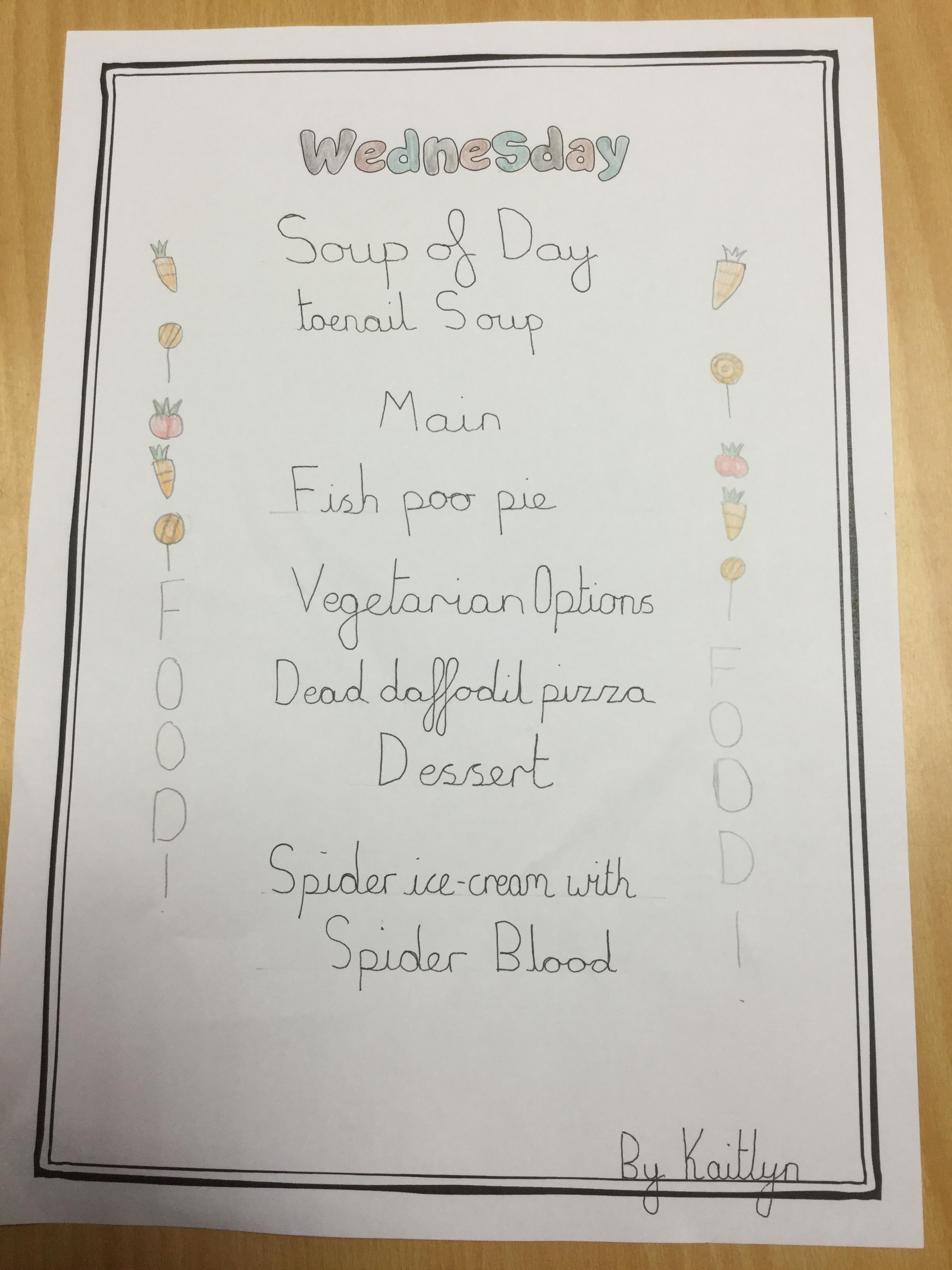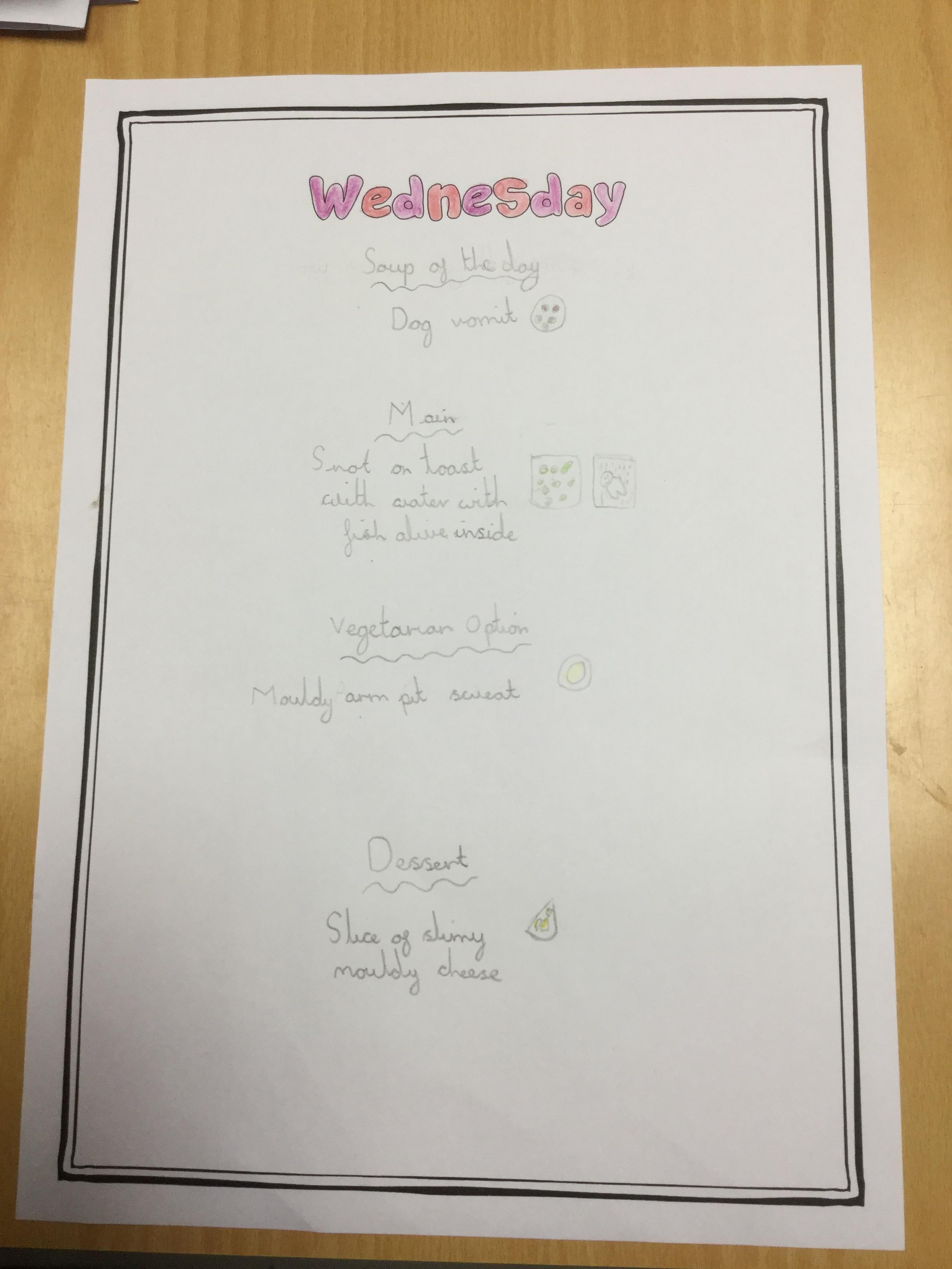 The children who visited Mrs Wolfenden’s class (aka Mrs Trafe!) wrote a new disgusting menu for Wednesday. They also got to make Thursday’s pudding - ogre’s eyeballs! They all had fun thinking of gross foods and of course they loved getting to eat their eyeballs at the end!