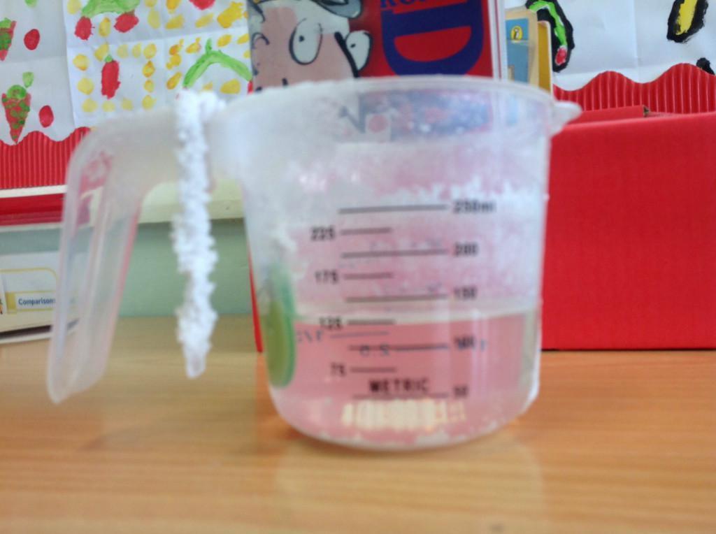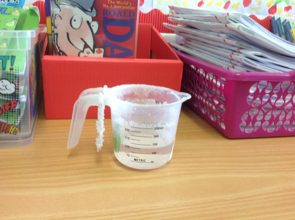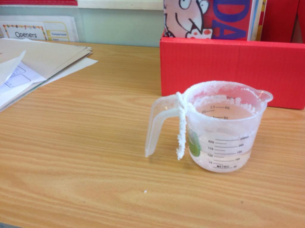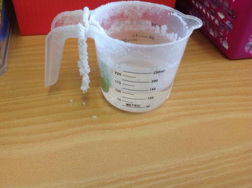 Year 5 made a saltwater solution by dissolving salt in warm water.  A button was hung in the jug and as the water evaporated the salt collected on the button and the string.  We learnt that this is a  reversible change.