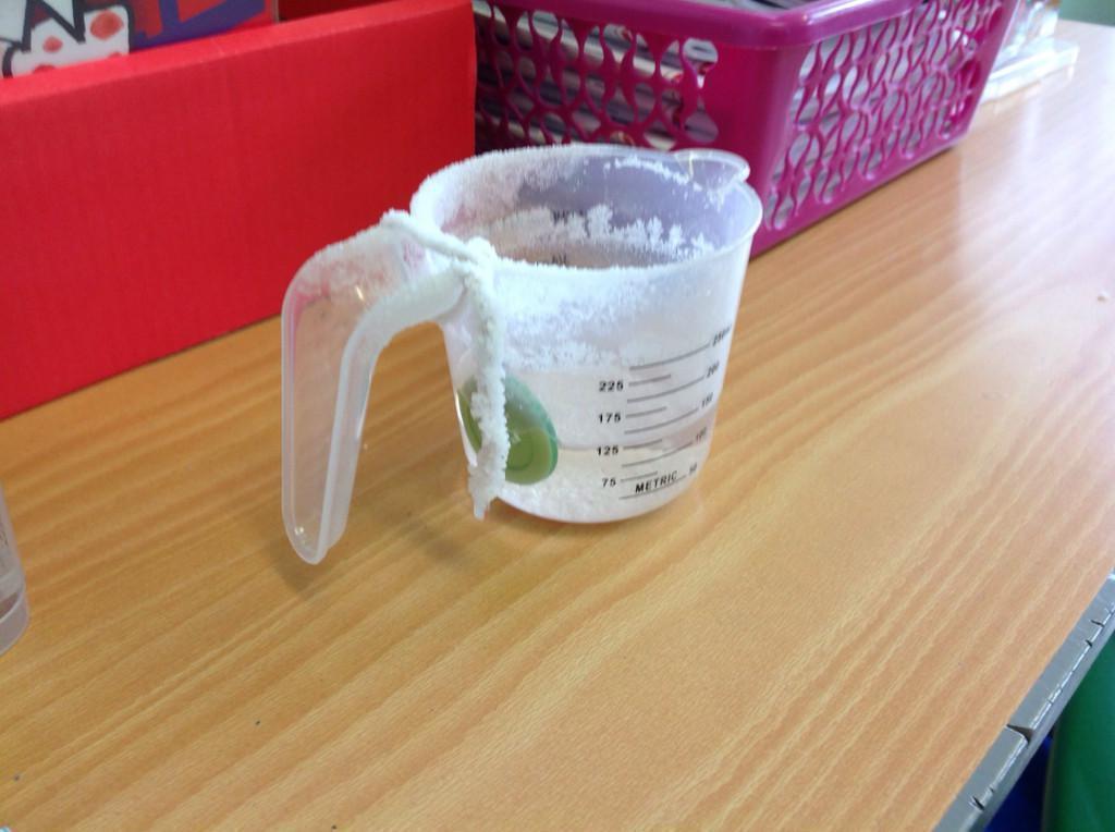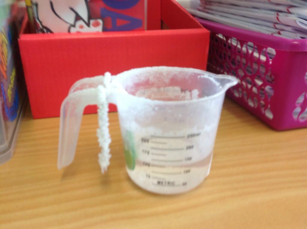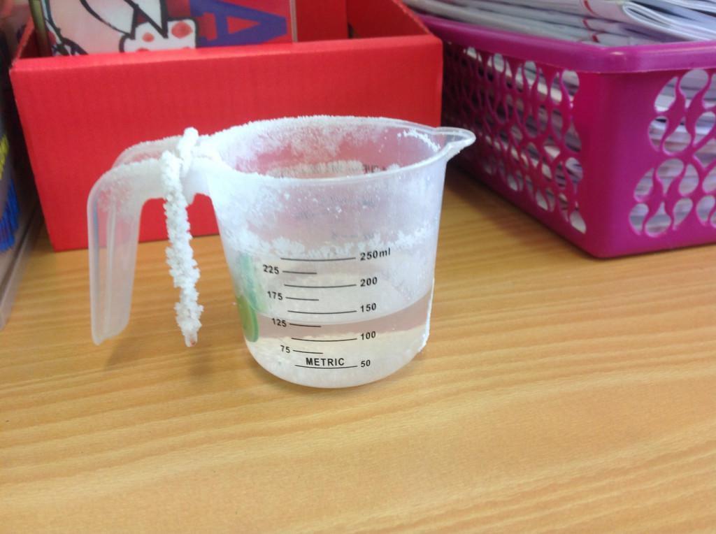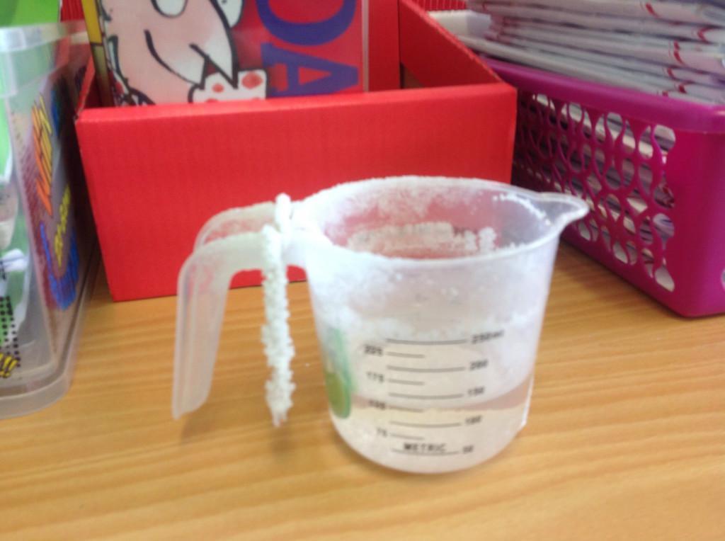 Year 5 made a saltwater solution by dissolving salt in warm water.  A button was hung in the jug and as the water evaporated the salt collected on the button and the string.  We learnt that this is a  reversible change.