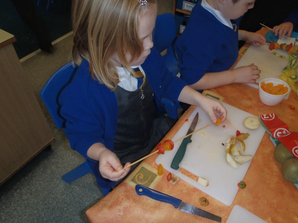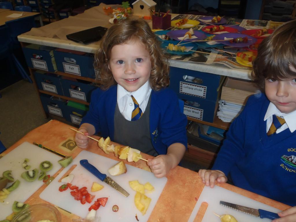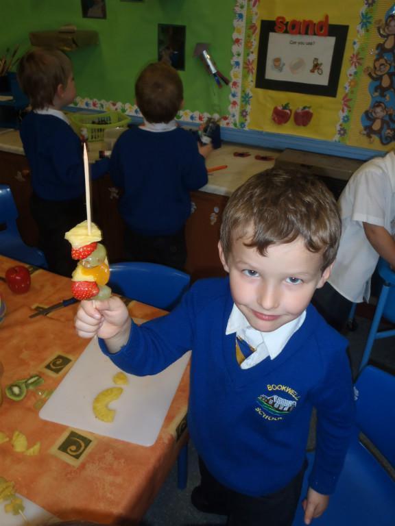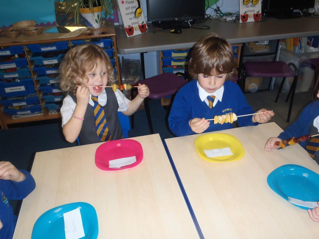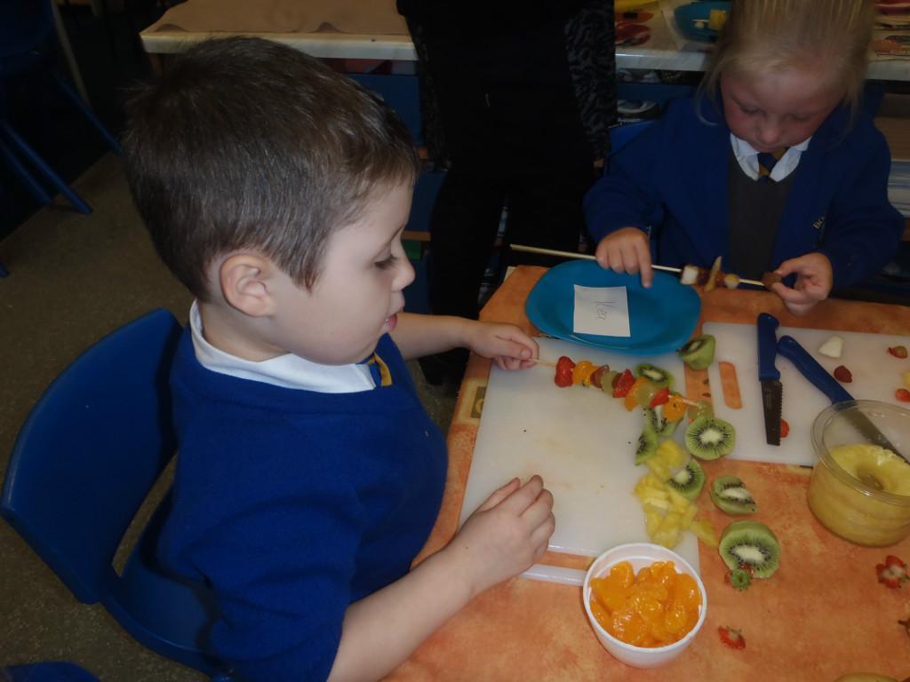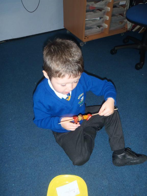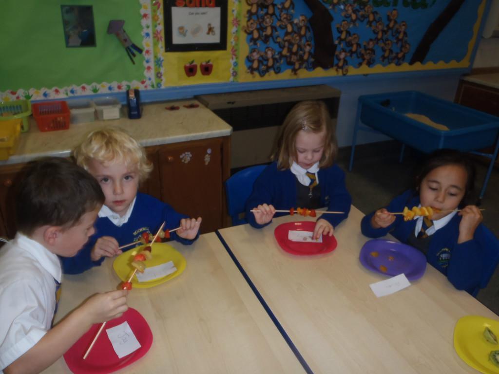 We made fruit kebabs this week. Some of us decided to make repeating patterns with our fruit. We really enjoyed eating them at the end of the day. Yum! Yum!