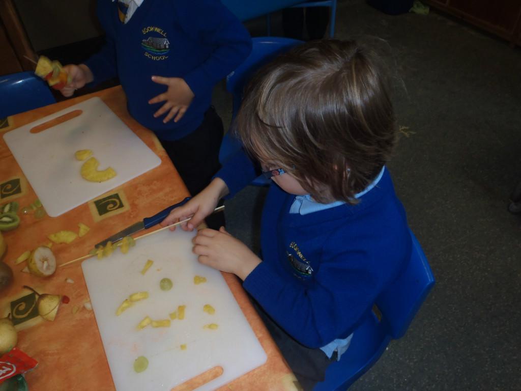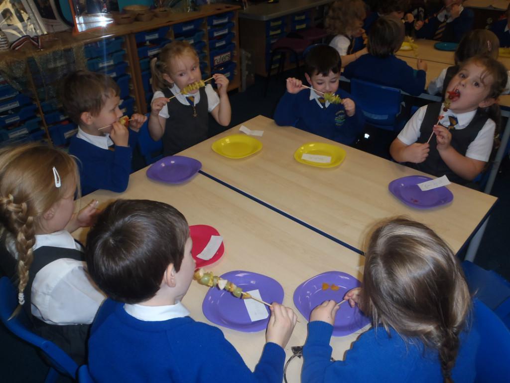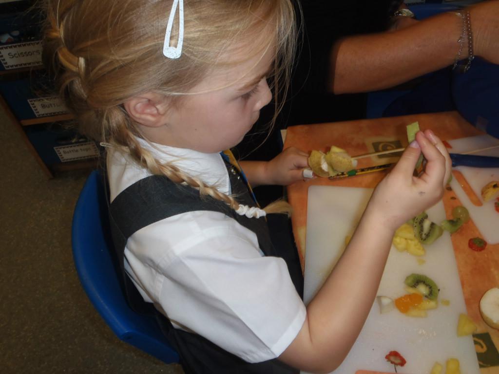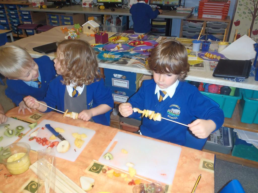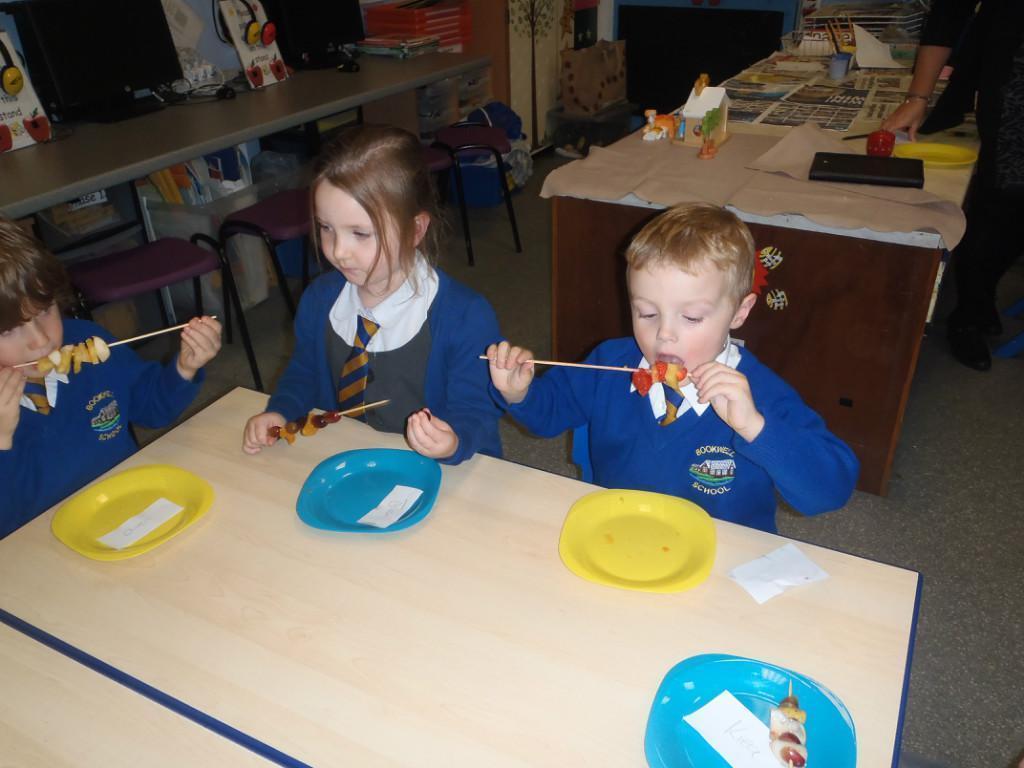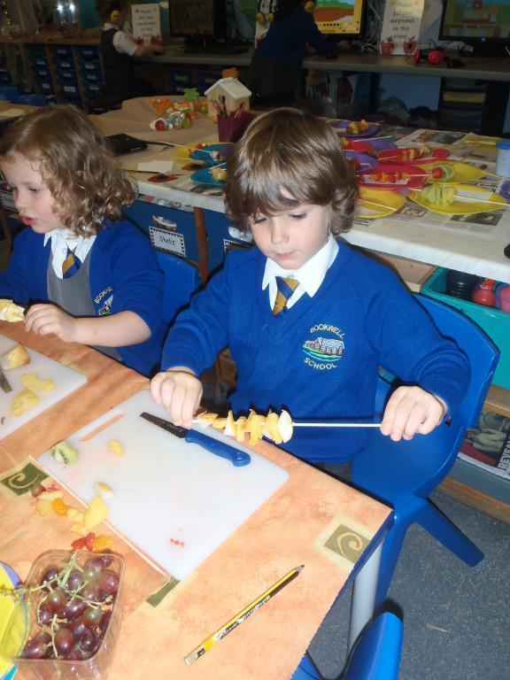We made fruit kebabs this week. Some of us decided to make repeating patterns with our fruit. We really enjoyed eating them at the end of the day. Yum! Yum!