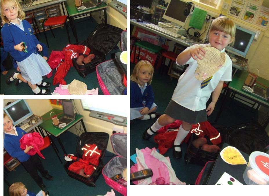 We made our own suitcases for sunny and rainy weather. We made suitable clothing to go inside our cases for the chosen type of weather.