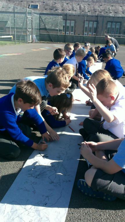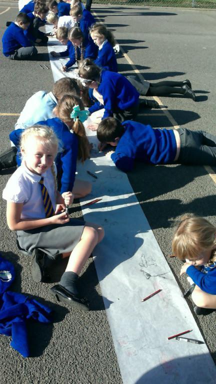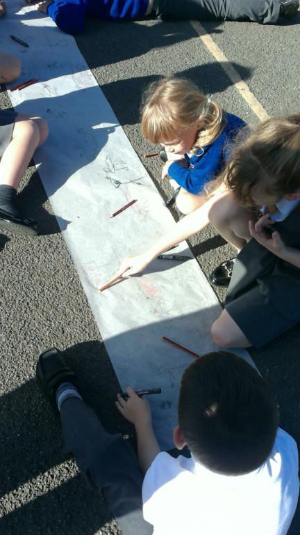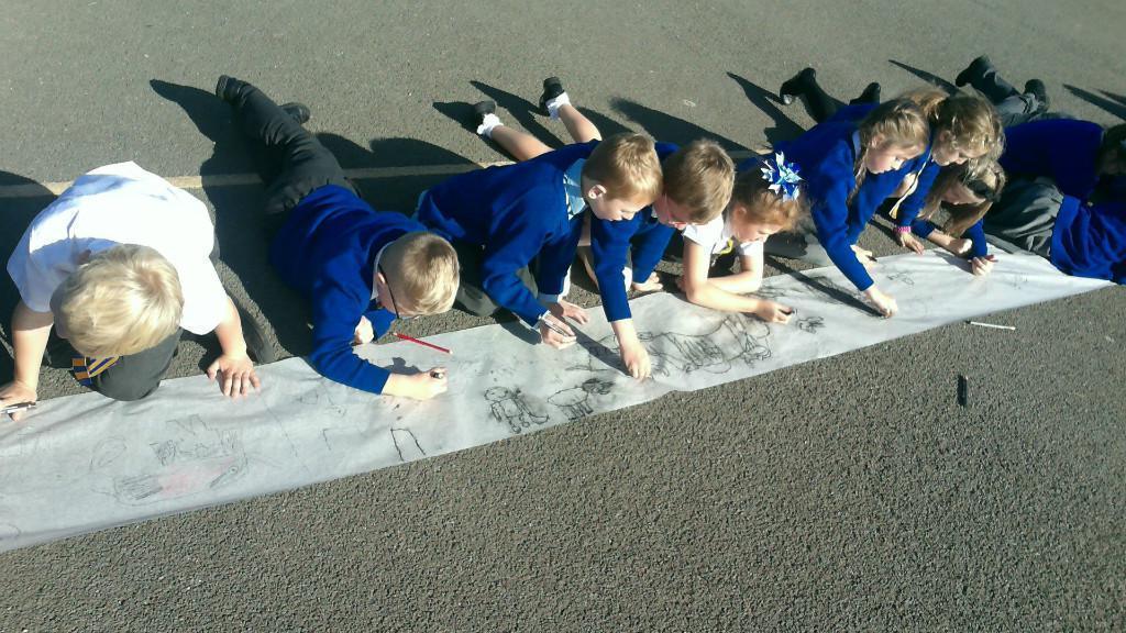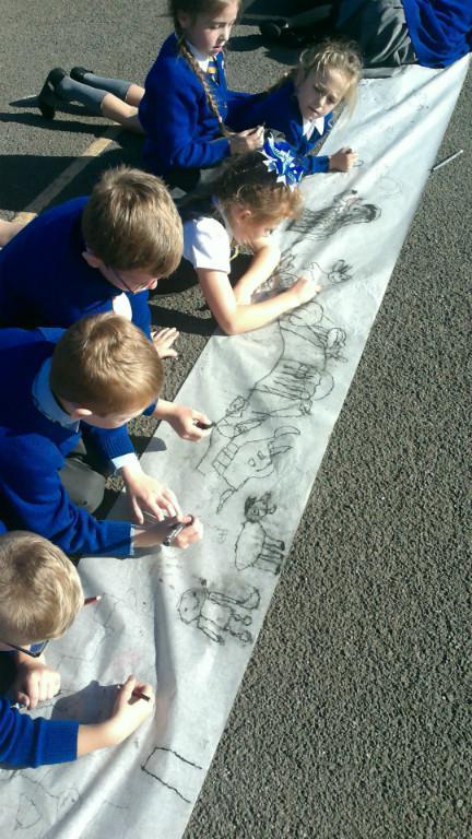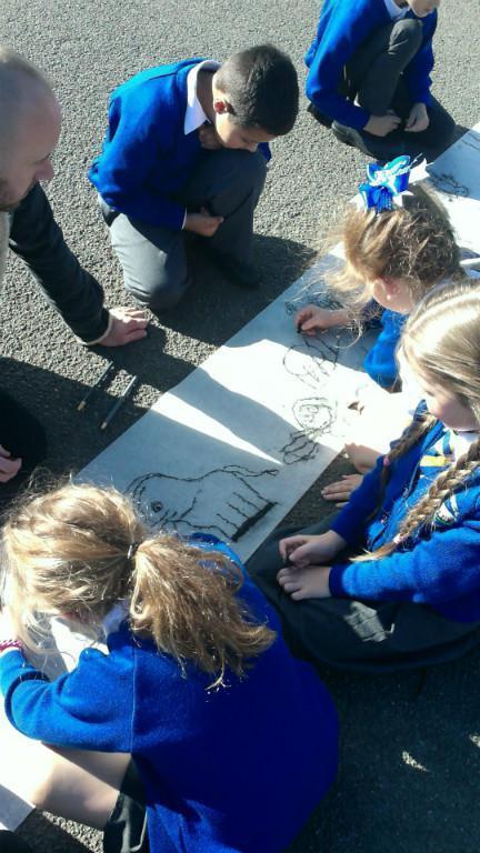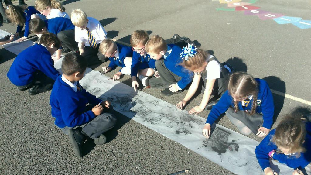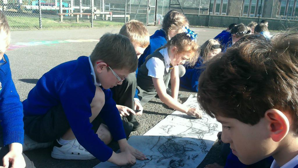 This week we have been learning about prehistoric art as part of our Stone Age topic. After looking at carvings and paintings in caves all over the world, we discovered that Stone Age people used art to tell stories about their victorious hunts. Often using anything they could find such as peices of flint, animal bones and berries to etch their adventures. To explore what this would be like, we went back to basics and created our own cave art mural using only graphite pencils in the playground! See if you can spot any animals we managed to hunt down.