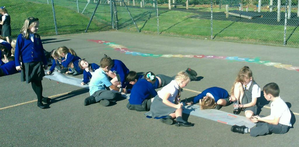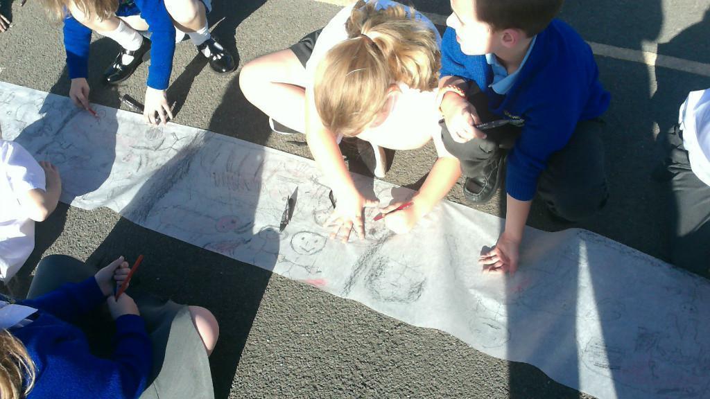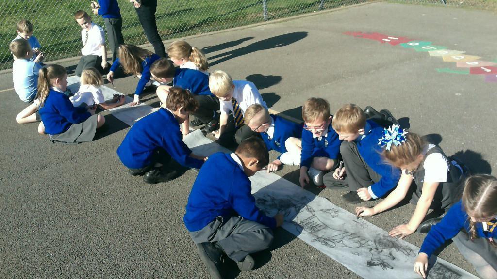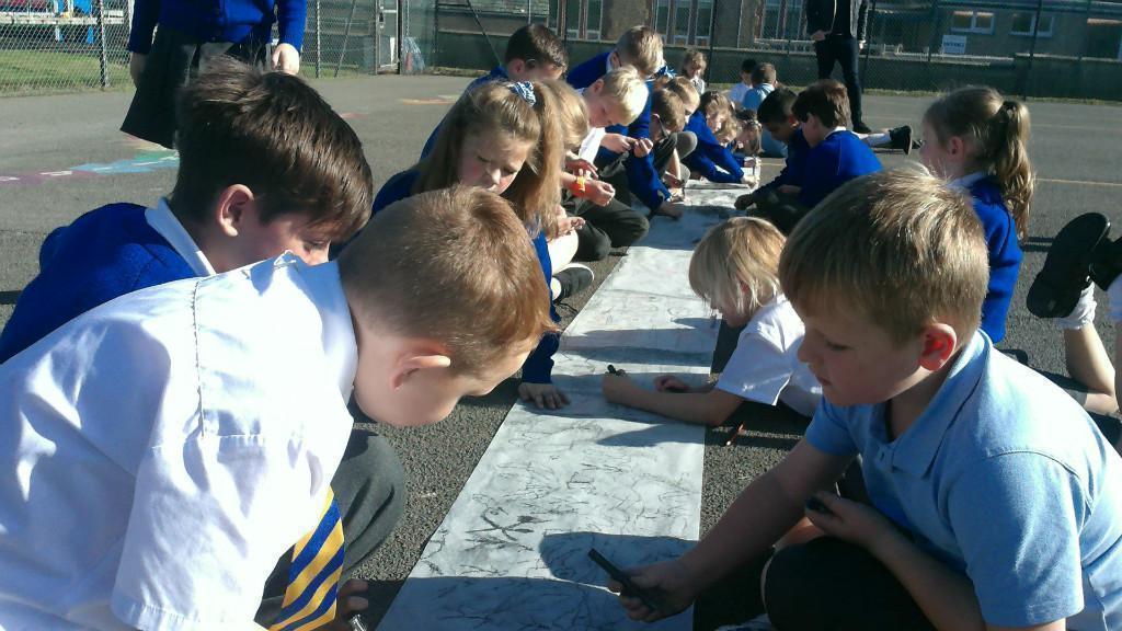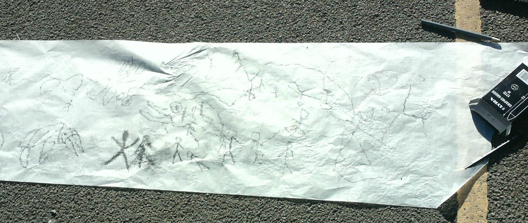 This week we have been learning about prehistoric art as part of our Stone Age topic. After looking at carvings and paintings in caves all over the world, we discovered that Stone Age people used art to tell stories about their victorious hunts. Often using anything they could find such as peices of flint, animal bones and berries to etch their adventures. To explore what this would be like, we went back to basics and created our own cave art mural using only graphite pencils in the playground! See if you can spot any animals we managed to hunt down.