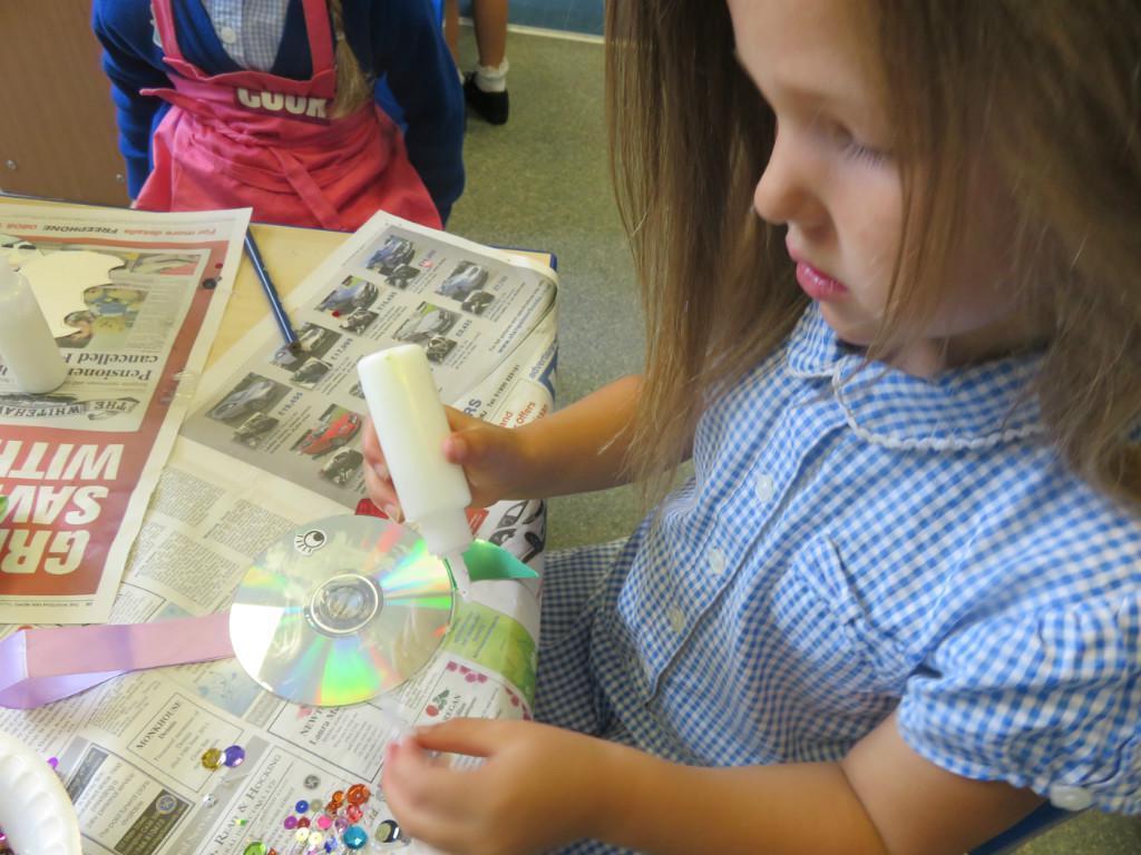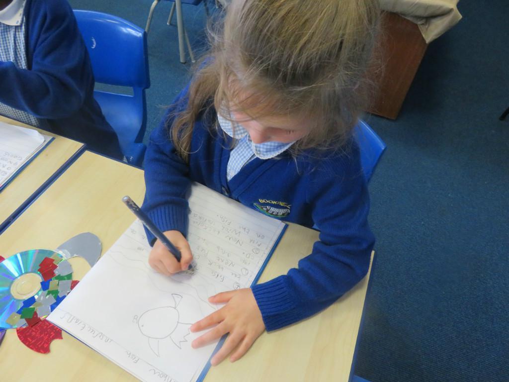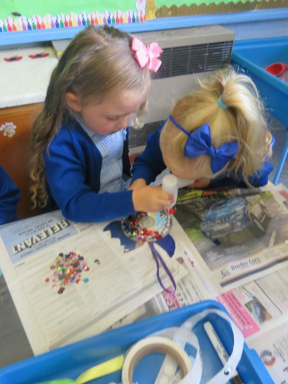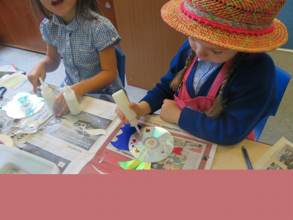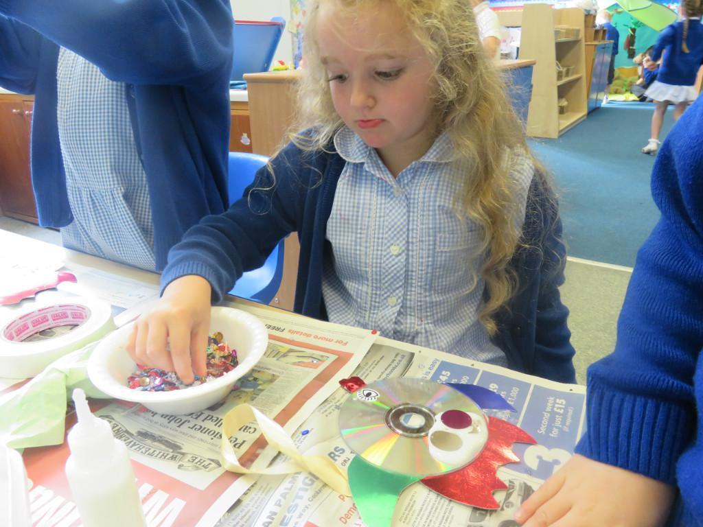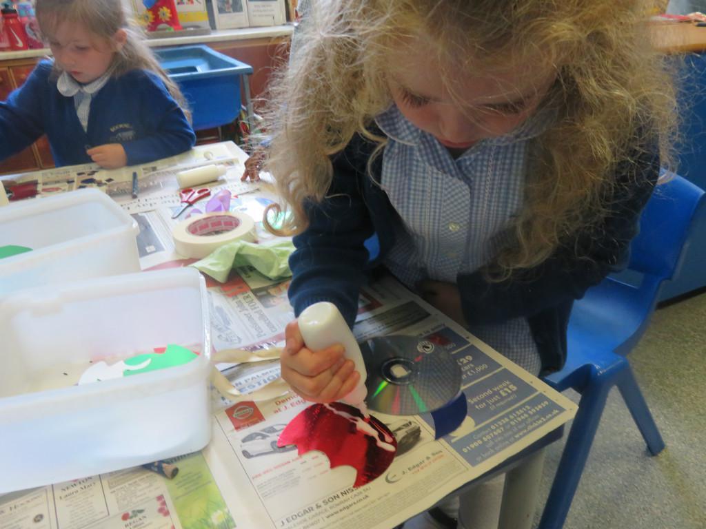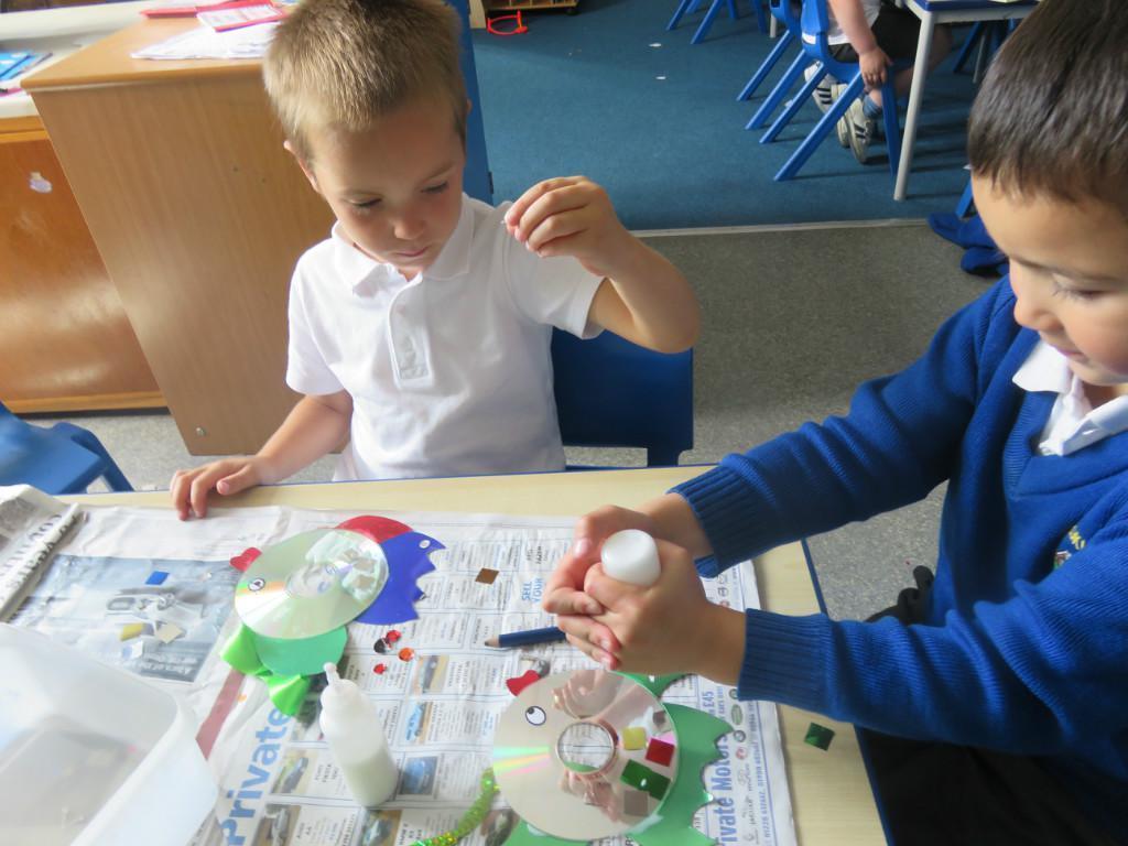 We have been really busy in class this week. We made rainbow fish using a cd, ribbon and lots of gems. We then had to do some instruction writing in our very special books. We tried really hard.