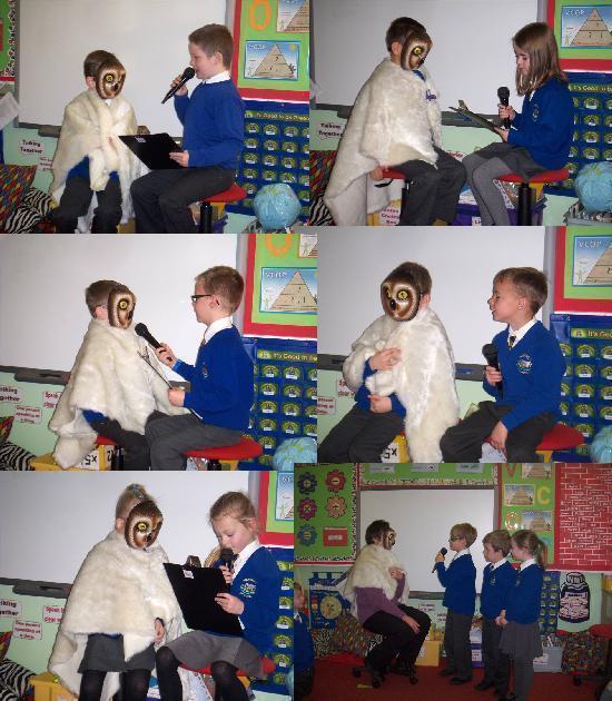 We thought of different questions to ask Plop, from our book,  the Owl who was Afraid of the Dark.  Then we took turns to interview him.  It was very  hot being dressed as an owl!!