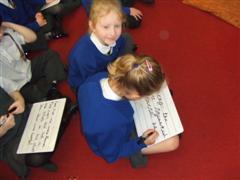 In Literacy we work together with partners to plan and write stories.  We are trying hard to think of good words.  Kaitlyn and Jeana used squawked in their story.