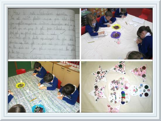 The children have been making Christmas decorations to be used on the Egremont Christmas Tree on Main Street. They had to write a Christmas wish on the back and then decorate with sequins and glitter. As we were learning about how to write instructions this week the children made their Chirstmas decoration and then wrote instructions to explain how to make the decoration. It was messy but lots of fun!