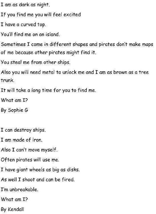 This term we have been learning lots of different facts about the life of pirates, learning about the life of Blackbeard and writing a message in a bottle from a marooned pirate. We have also been writing pirate riddles... can you guess what some of the children have been writing about in their riddles?