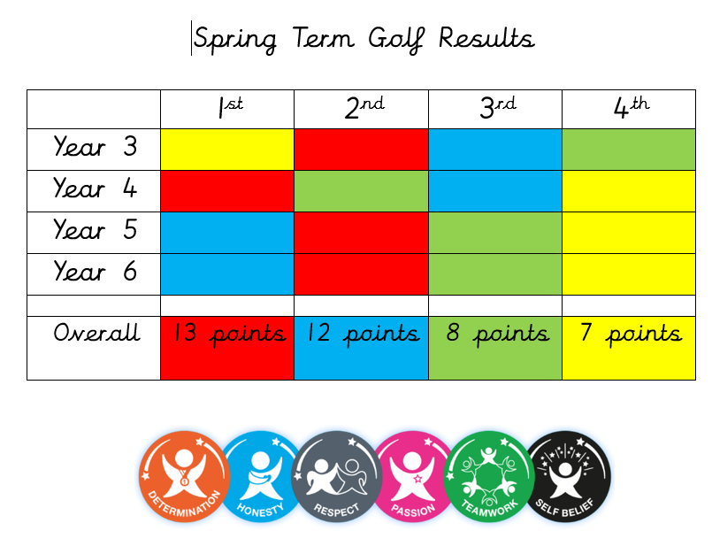 In Spring term our sports day teams battled it out at tri golf.  The children competed in a variety of activities putting their newly learnt skills in to practice and aiming to get their best score.  This terms winners were RED team: