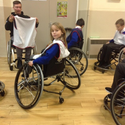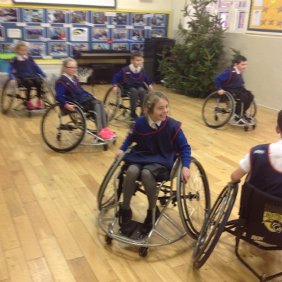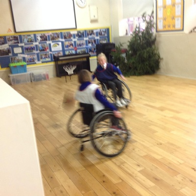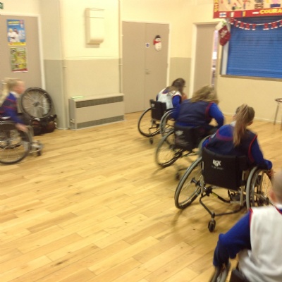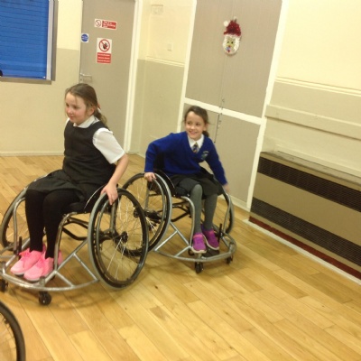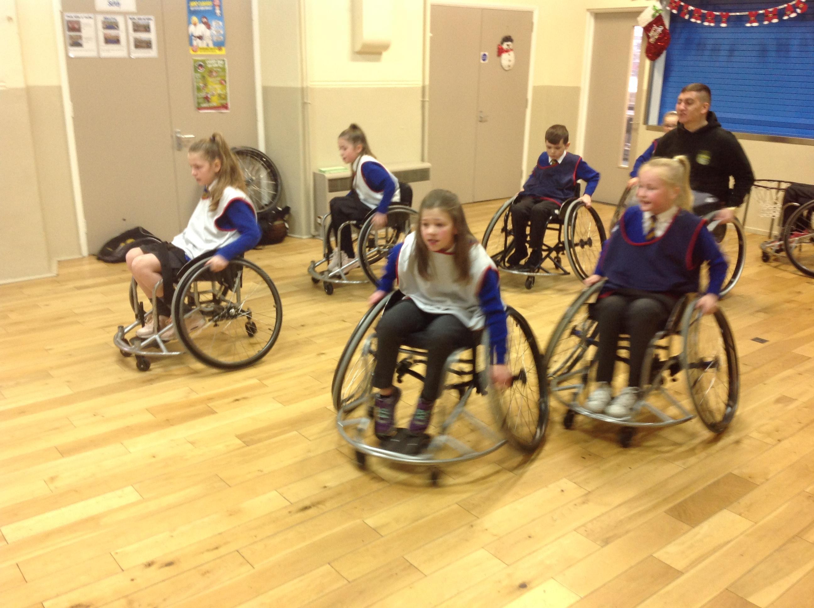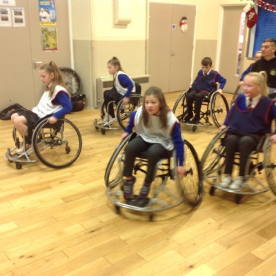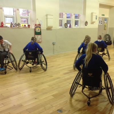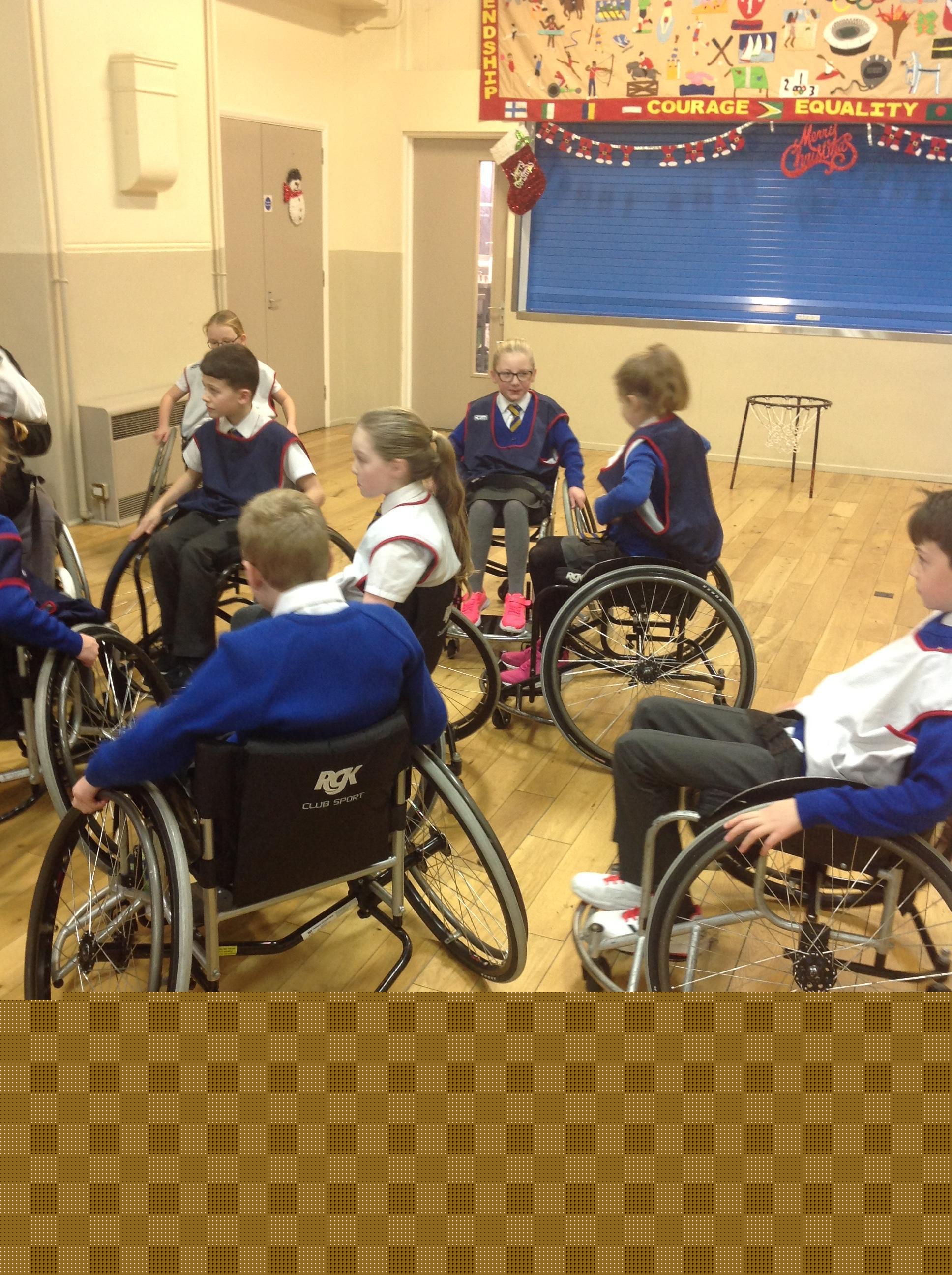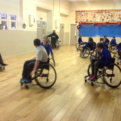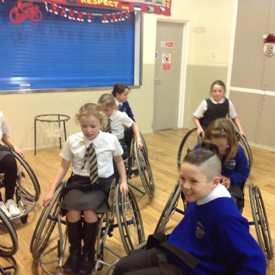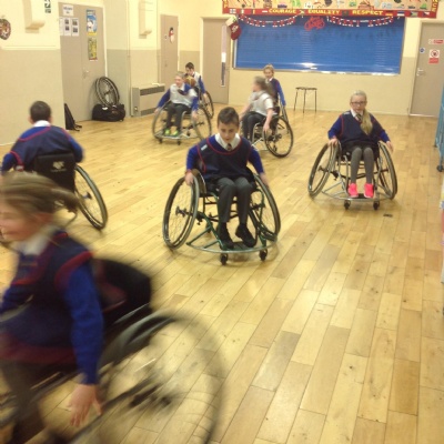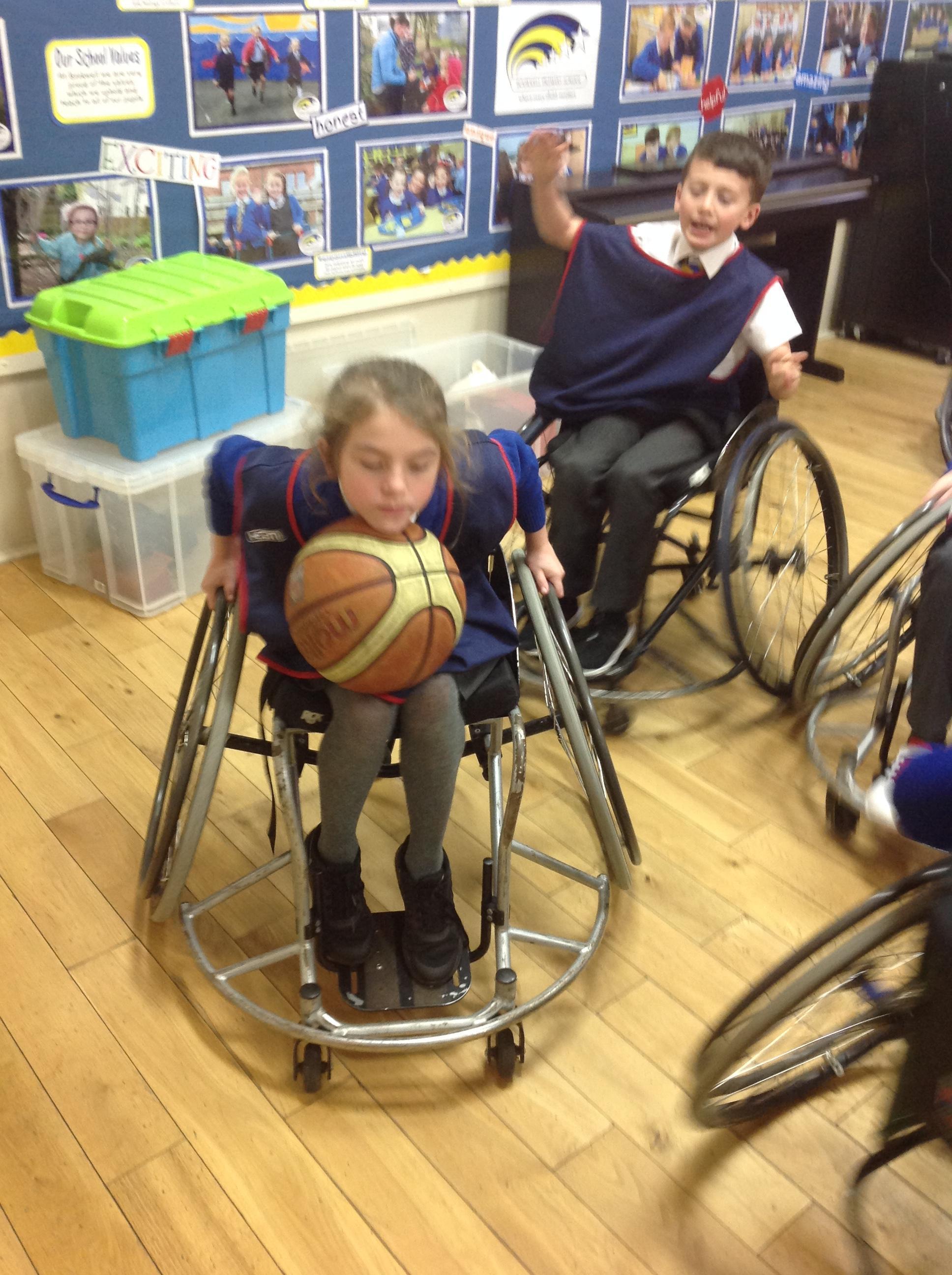 We were inspired and enthused by Nat Pattinson who introduced us all to wheelchair basketball.  He told us how he had given up on life, when he was 16, after an accident and with his bone condition led to him being left in a wheelchair.  However his mum forced him out of the house to try wheelchair basketball which he said he hated to begin with.  It wasn't long before his mum's perseverance paid off and Nat started to enjoy the sport even if he wasn't any good at it.  Before long his training started to pay off and he is now competing at an international level and is a world champion.  He is certainly very passionate about his sport.  One aspect he likes is the fact that is able bodied friends can play it too. We think he demonstrates the School Games values. Key Stage 2 enjoyed trying it out - don't worry Nat will be back to let Key Stage 1 try it out in June.