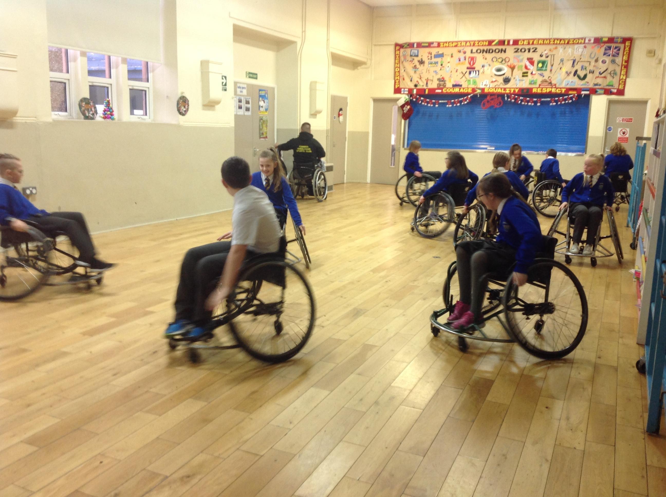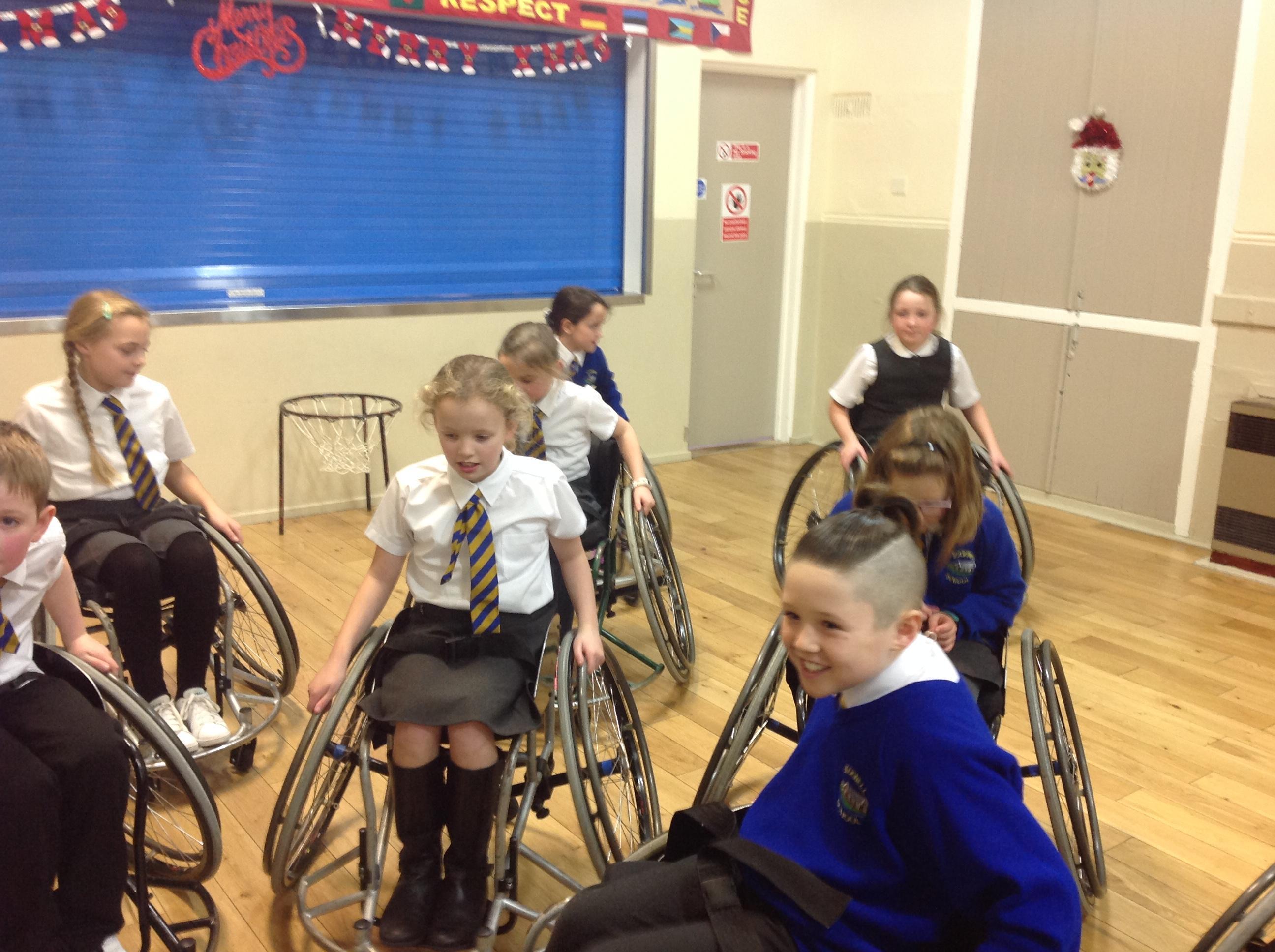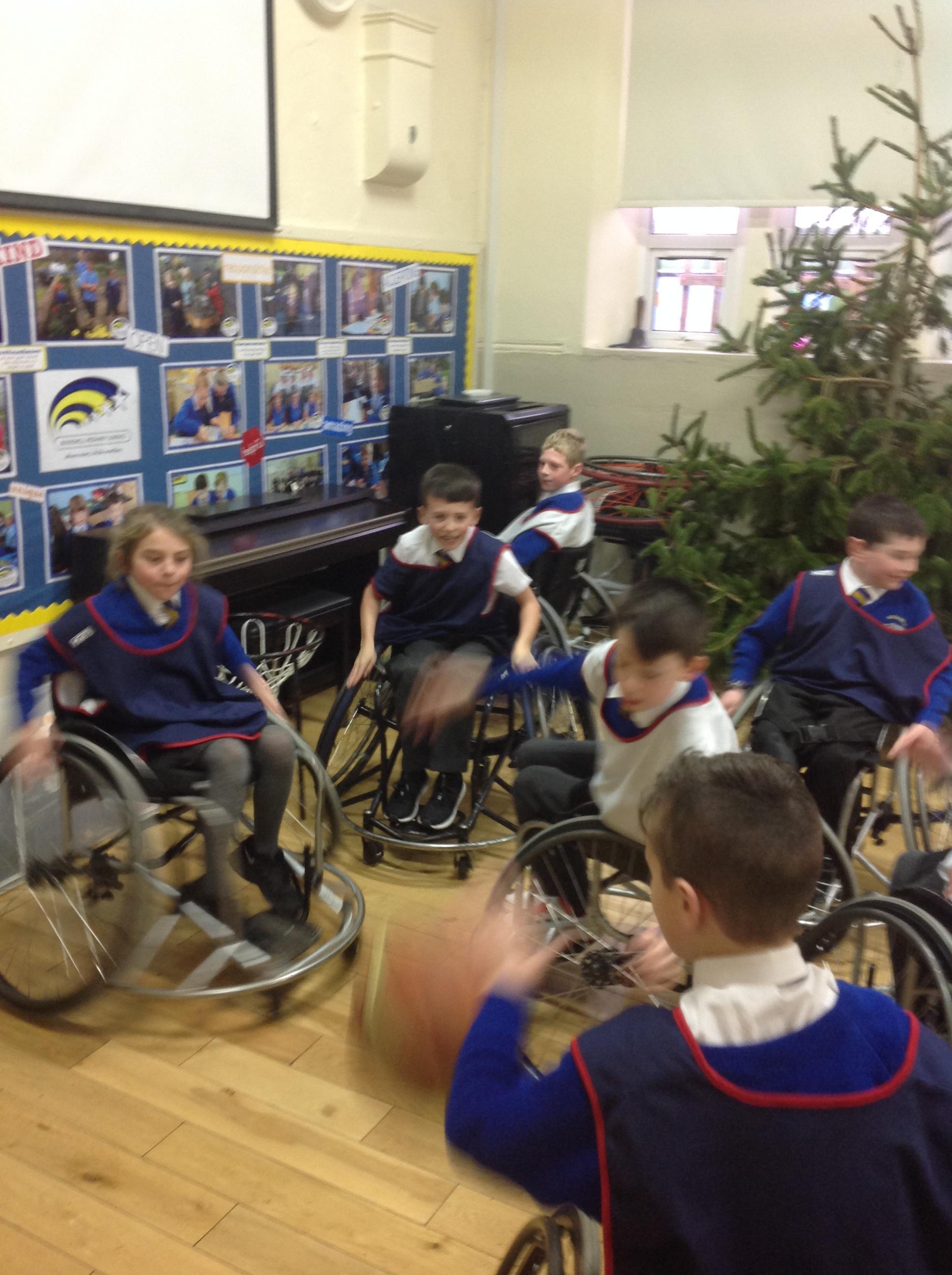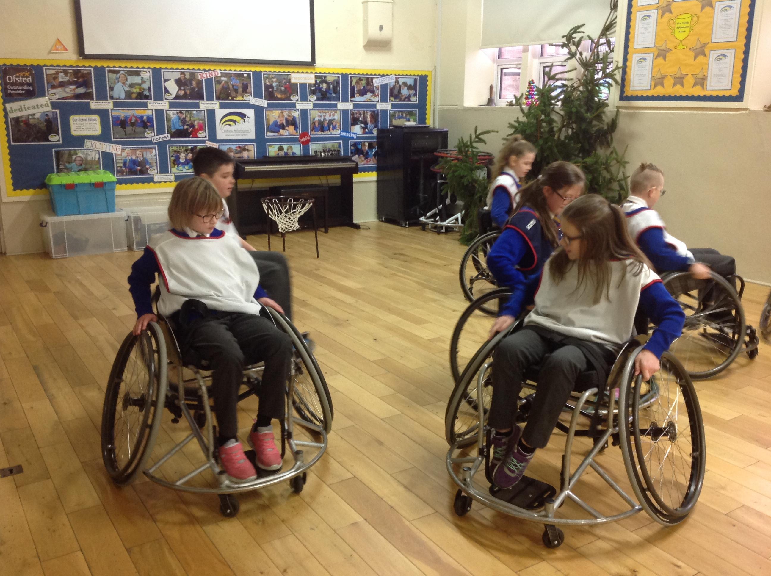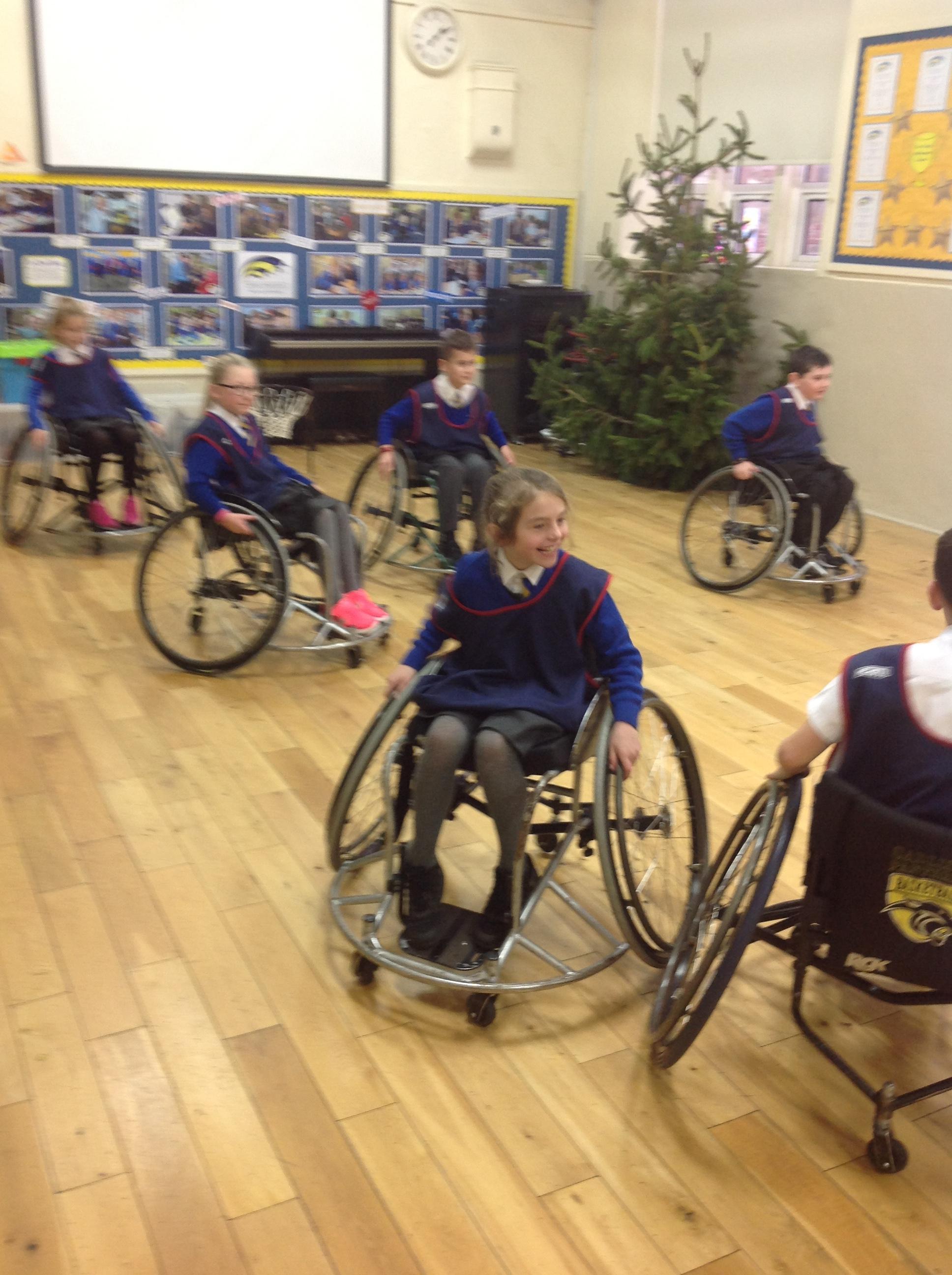 We were inspired and enthused by Nat Pattinson who introduced us all to wheelchair basketball.  He told us how he had given up on life, when he was 16, after an accident and with his bone condition led to him being left in a wheelchair.  However his mum forced him out of the house to try wheelchair basketball which he said he hated to begin with.  It wasn't long before his mum's perseverance paid off and Nat started to enjoy the sport even if he wasn't any good at it.  Before long his training started to pay off and he is now competing at an international level and is a world champion.  He is certainly very passionate about his sport.  One aspect he likes is the fact that is able bodied friends can play it too. We think he demonstrates the School Games values. Key Stage 2 enjoyed trying it out - don't worry Nat will be back to let Key Stage 1 try it out in June.