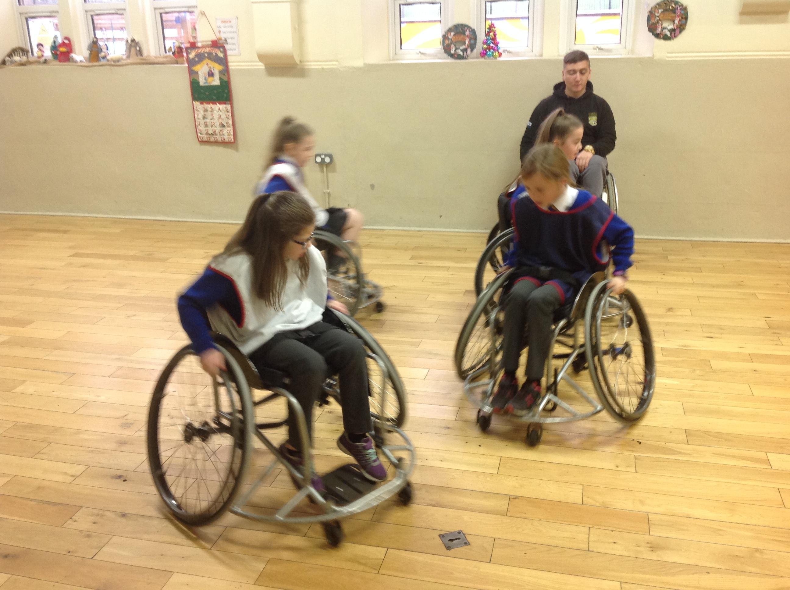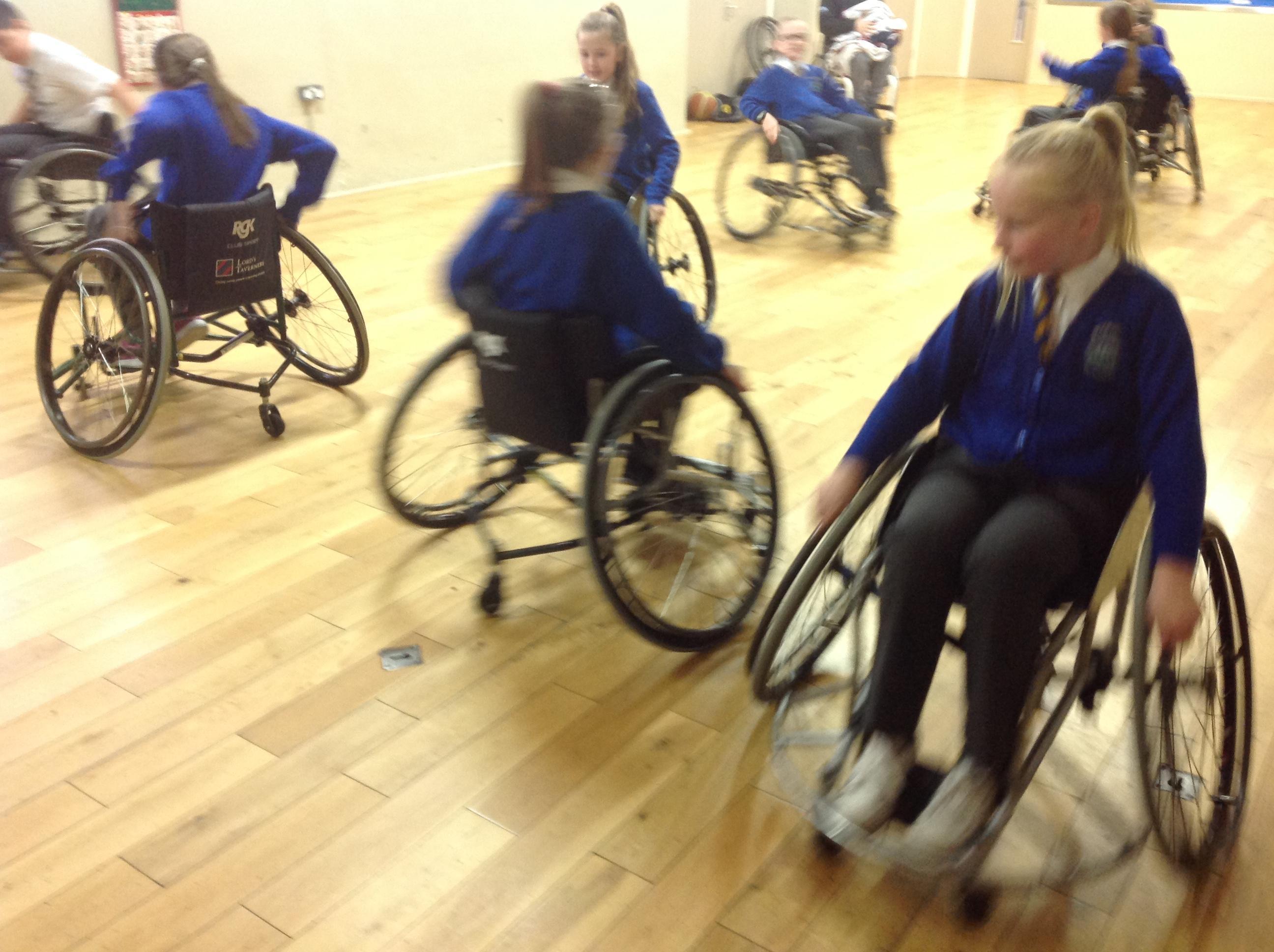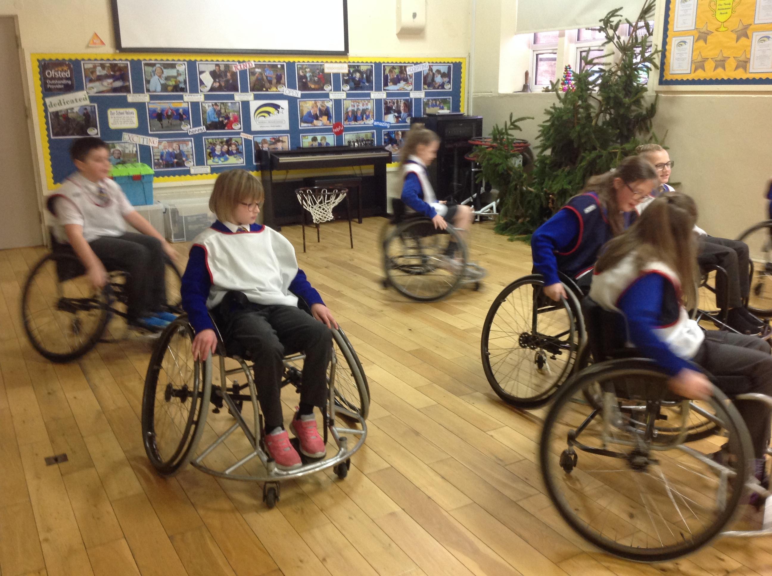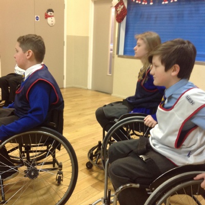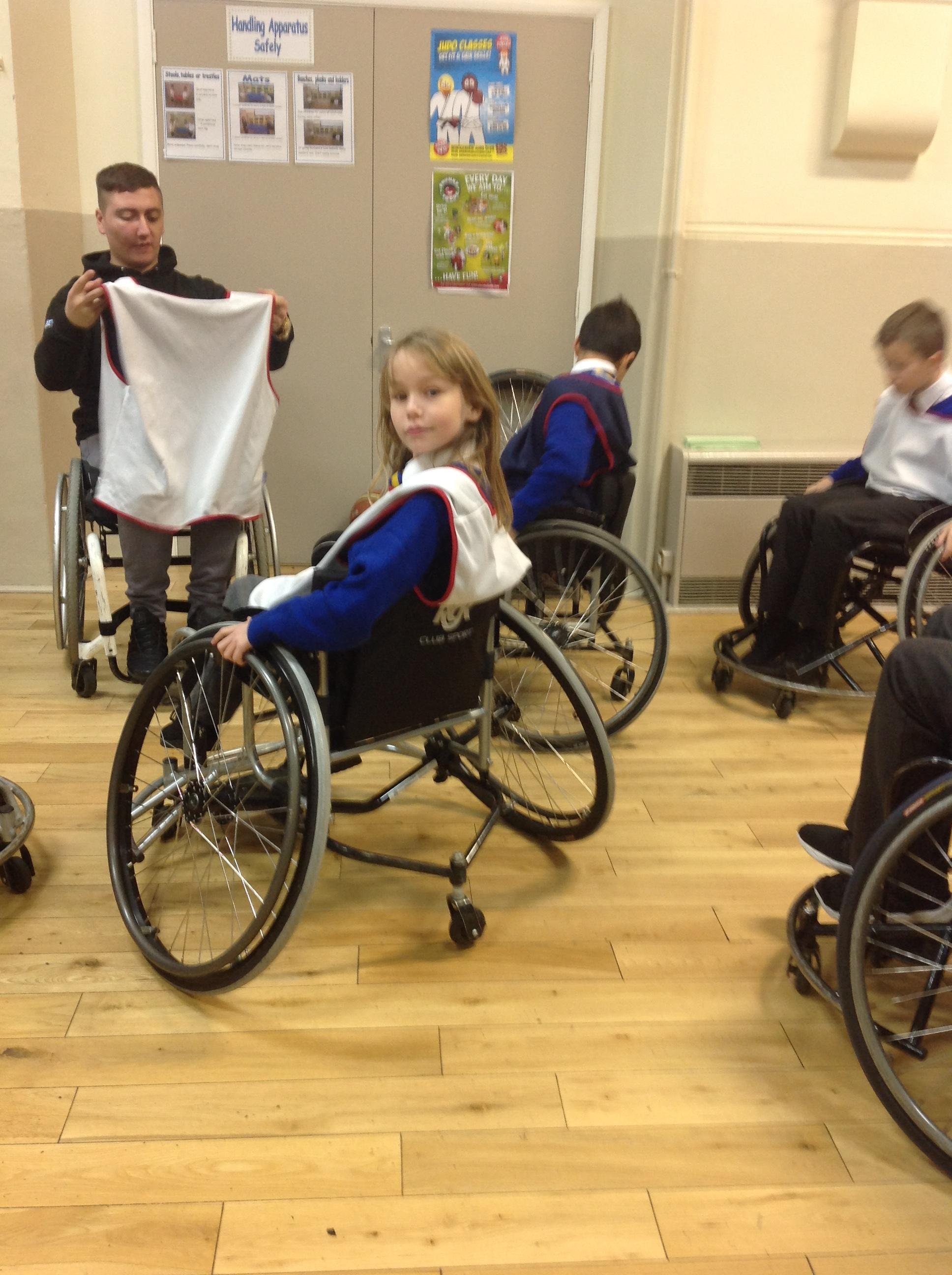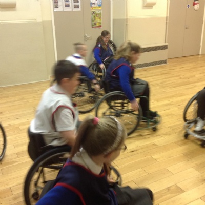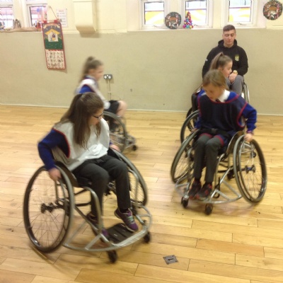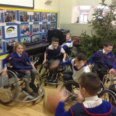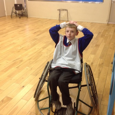 We were inspired and enthused by Nat Pattinson who introduced us all to wheelchair basketball.  He told us how he had given up on life, when he was 16, after an accident and with his bone condition led to him being left in a wheelchair.  However his mum forced him out of the house to try wheelchair basketball which he said he hated to begin with.  It wasn't long before his mum's perseverance paid off and Nat started to enjoy the sport even if he wasn't any good at it.  Before long his training started to pay off and he is now competing at an international level and is a world champion.  He is certainly very passionate about his sport.  One aspect he likes is the fact that is able bodied friends can play it too. We think he demonstrates the School Games values. Key Stage 2 enjoyed trying it out - don't worry Nat will be back to let Key Stage 1 try it out in June.