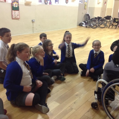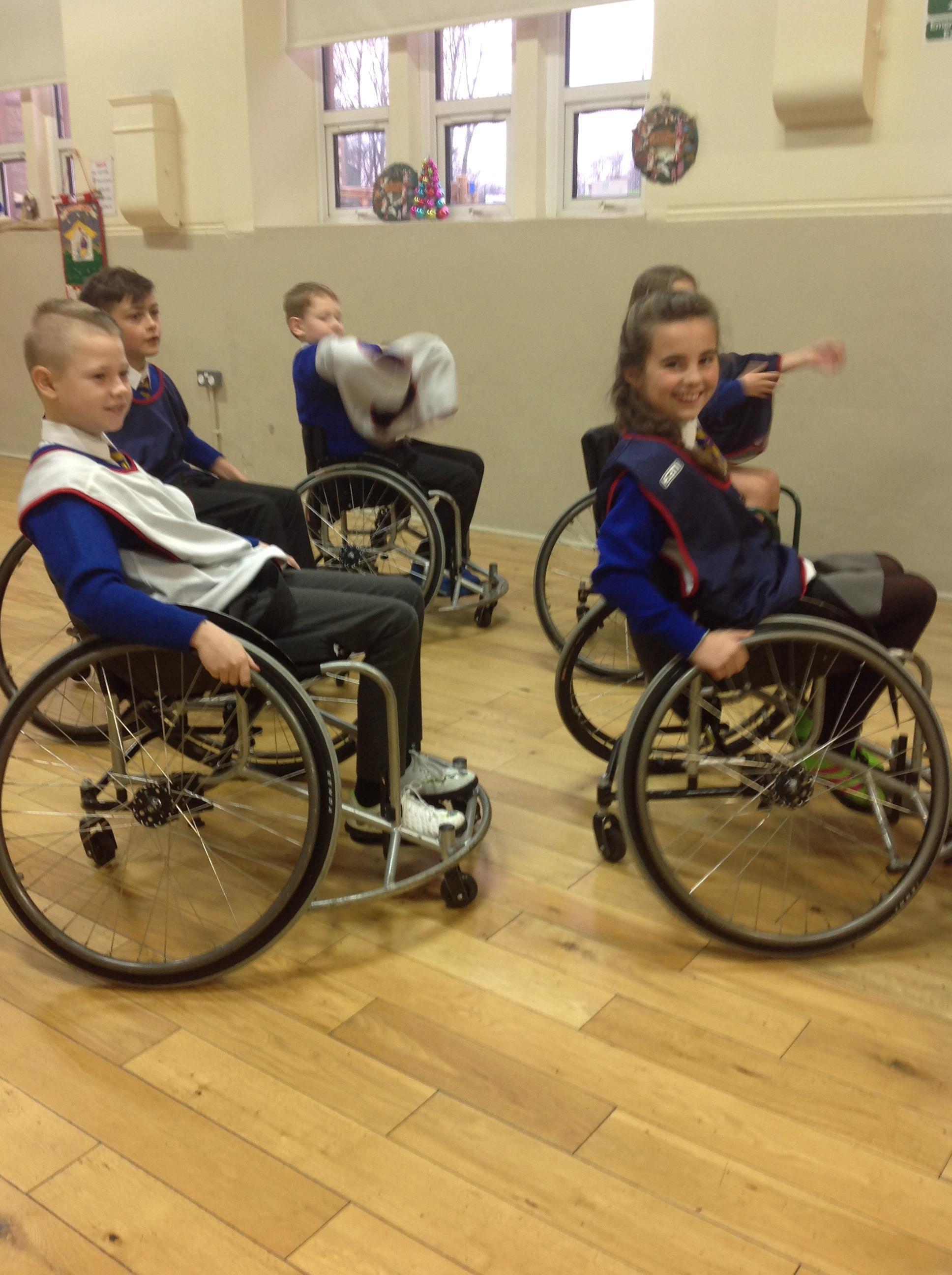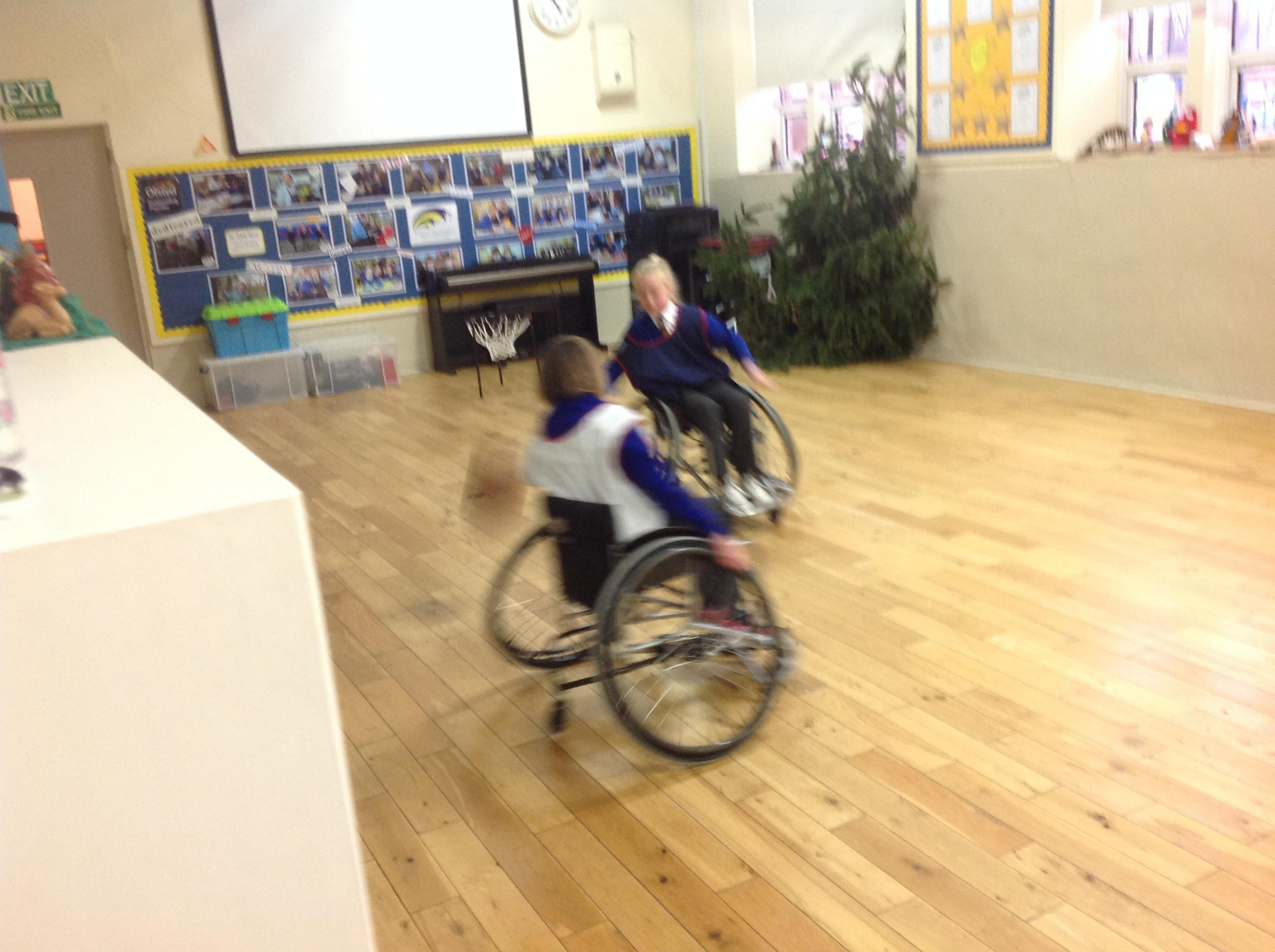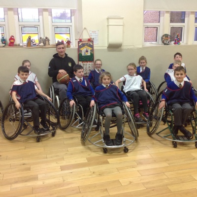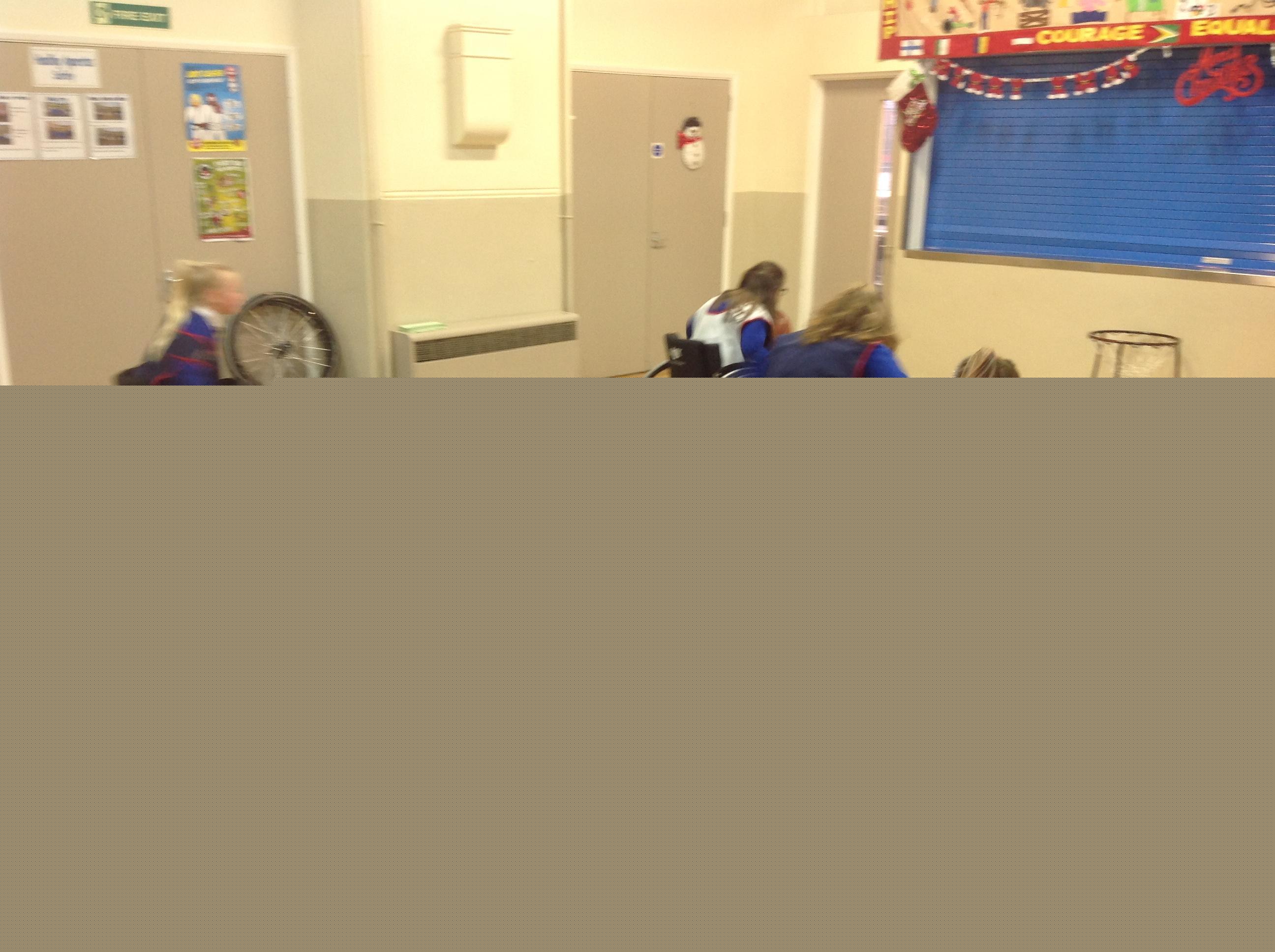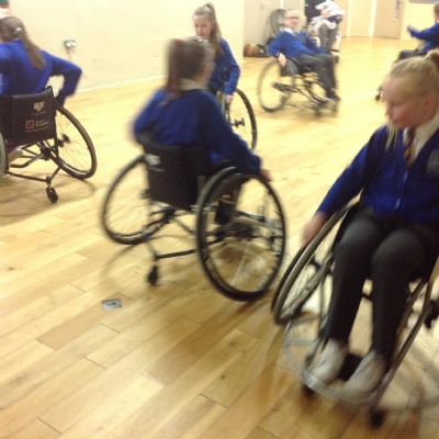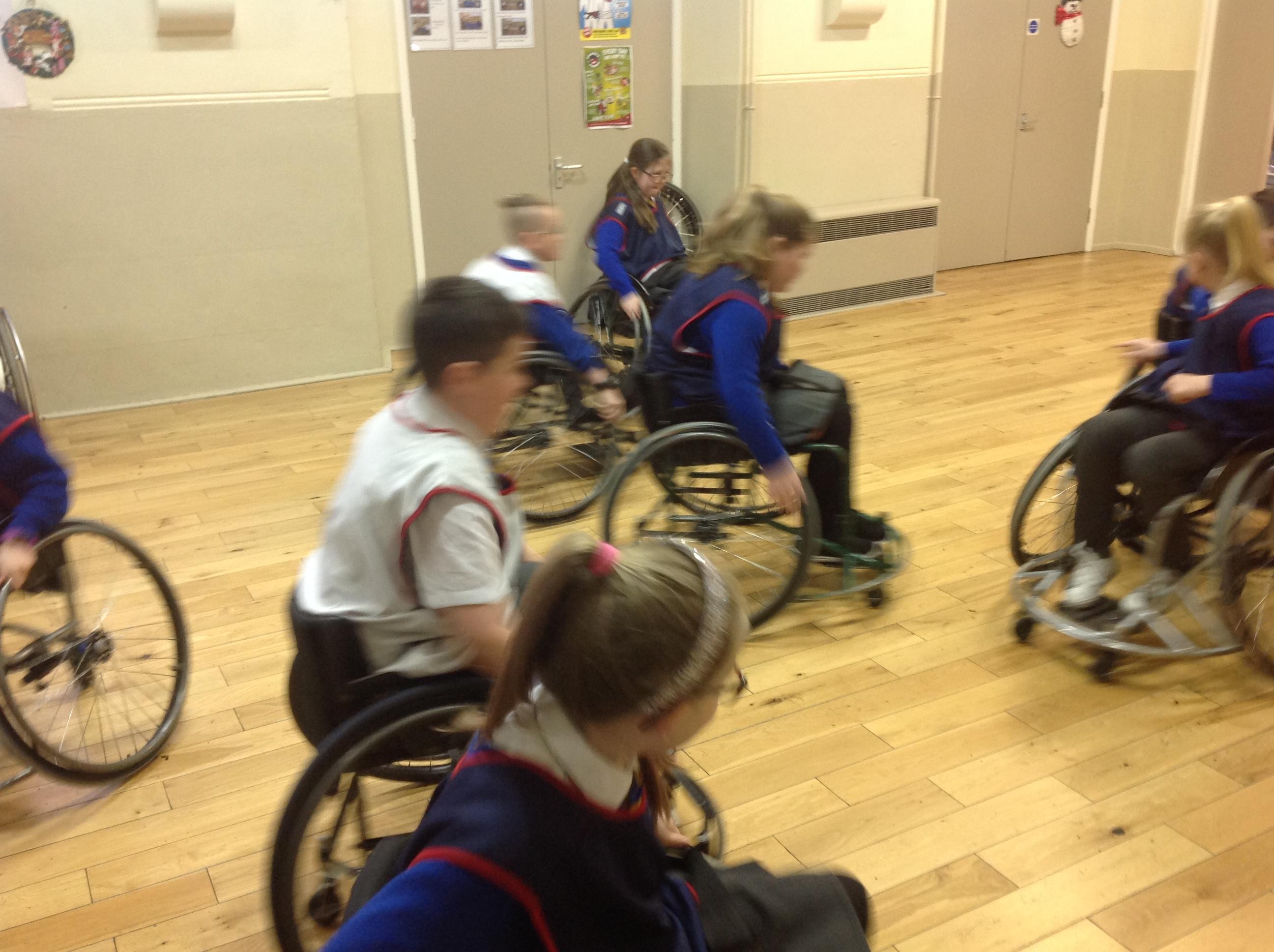 We were inspired and enthused by Nat Pattinson who introduced us all to wheelchair basketball.  He told us how he had given up on life, when he was 16, after an accident and with his bone condition led to him being left in a wheelchair.  However his mum forced him out of the house to try wheelchair basketball which he said he hated to begin with.  It wasn't long before his mum's perseverance paid off and Nat started to enjoy the sport even if he wasn't any good at it.  Before long his training started to pay off and he is now competing at an international level and is a world champion.  He is certainly very passionate about his sport.  One aspect he likes is the fact that is able bodied friends can play it too. We think he demonstrates the School Games values. Key Stage 2 enjoyed trying it out - don't worry Nat will be back to let Key Stage 1 try it out in June.