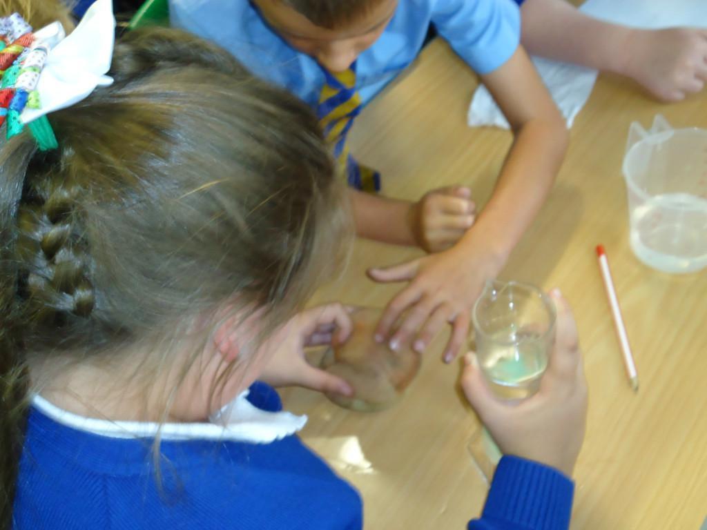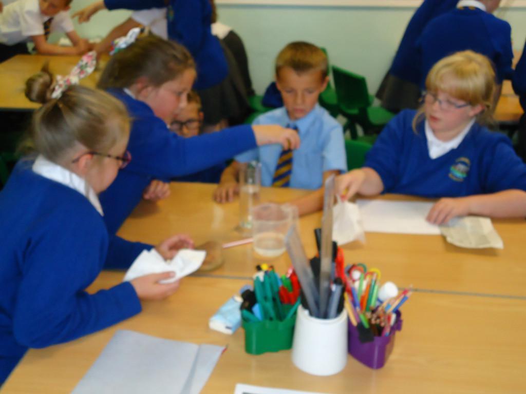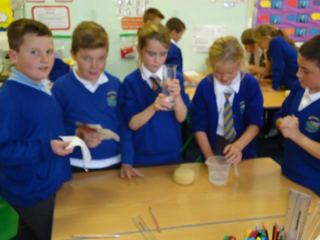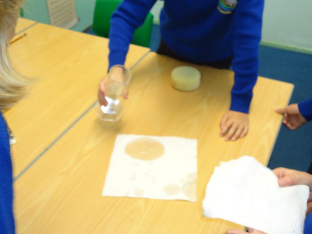 As part of our Materials topic in Science, the children completed an experiment on how absorbent certain materials are.  The children tested Sponge, Kitchen cloth and Kitchen roll.  The children found out that the sponge absorbed the most water.  The children really enjoyed this experiment.
