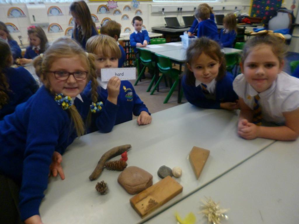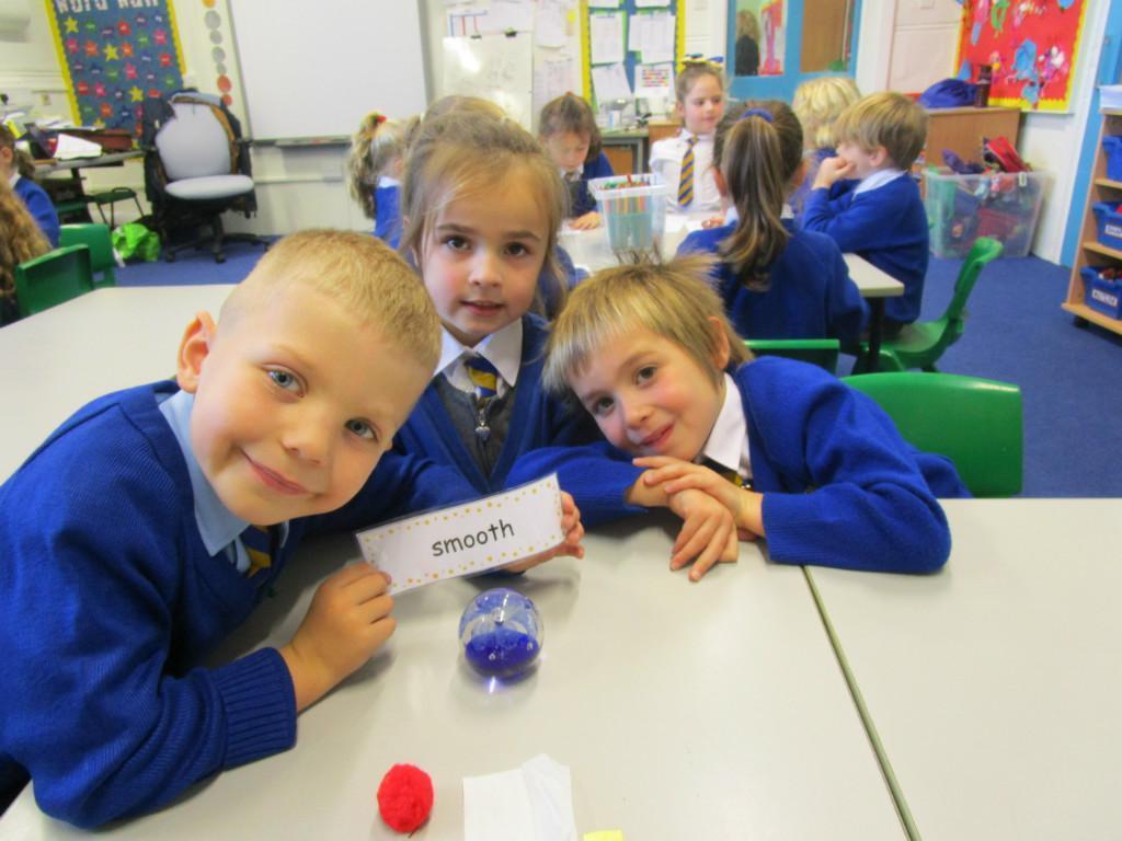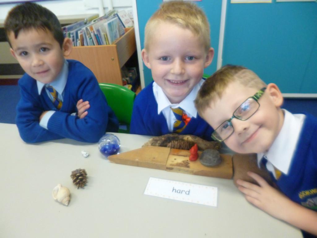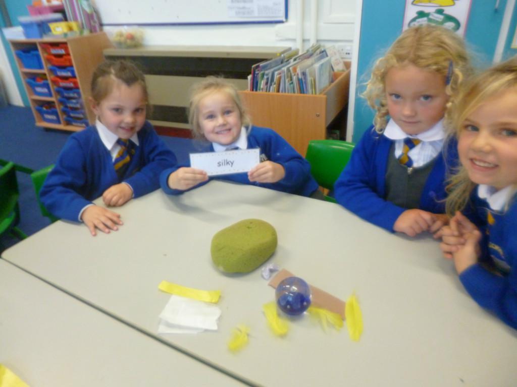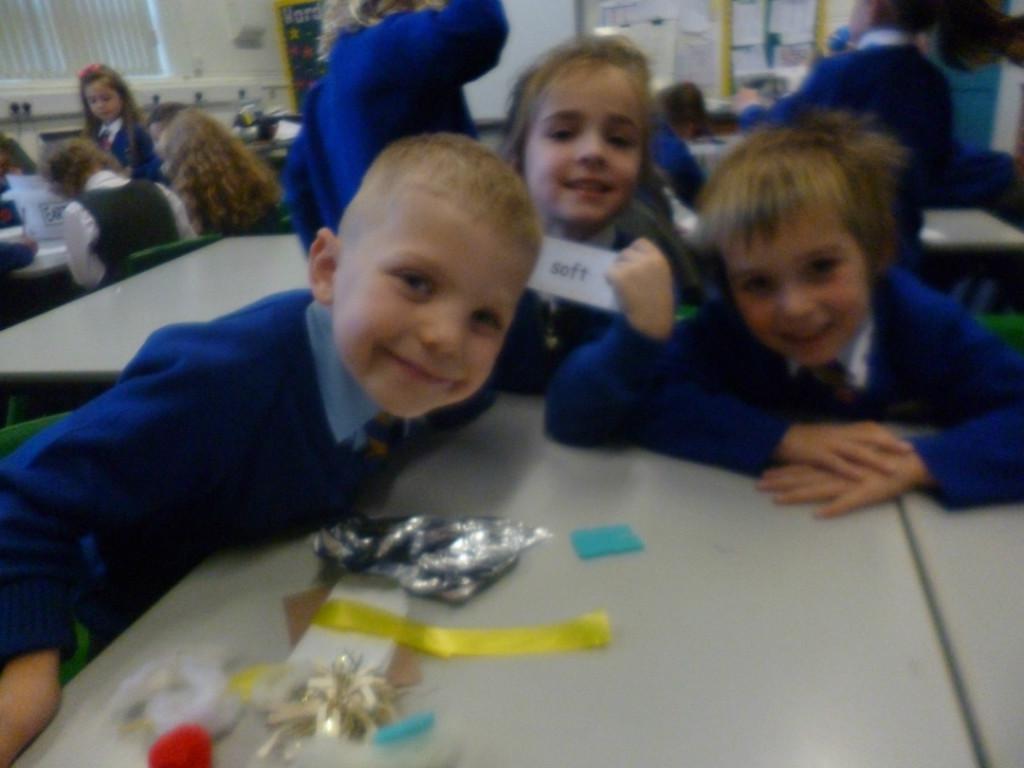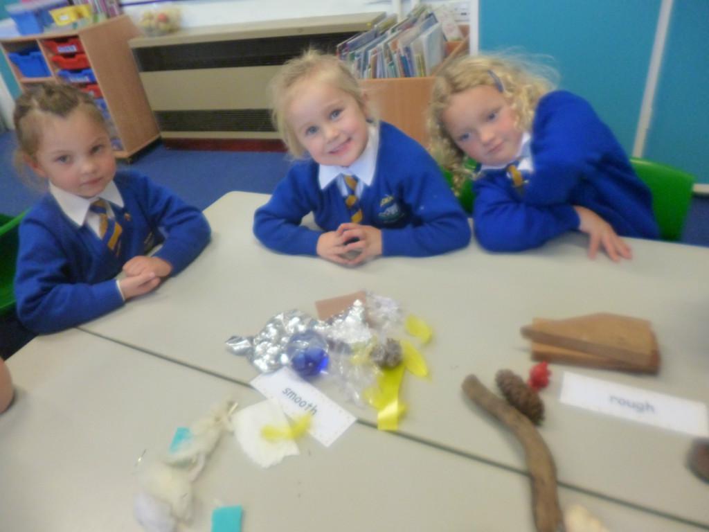 To finish off our Senses topic in science the children have been testing their sense of touch. First they had to guess the object that was in the box by touch alone. Then they had to think of words to describe the different materials on their tables. After this the children had to sort the materials into different groups according to how the materials felt - rough, smooth, hard, fluffy etc. The children chose their own groups to sort the materials into.