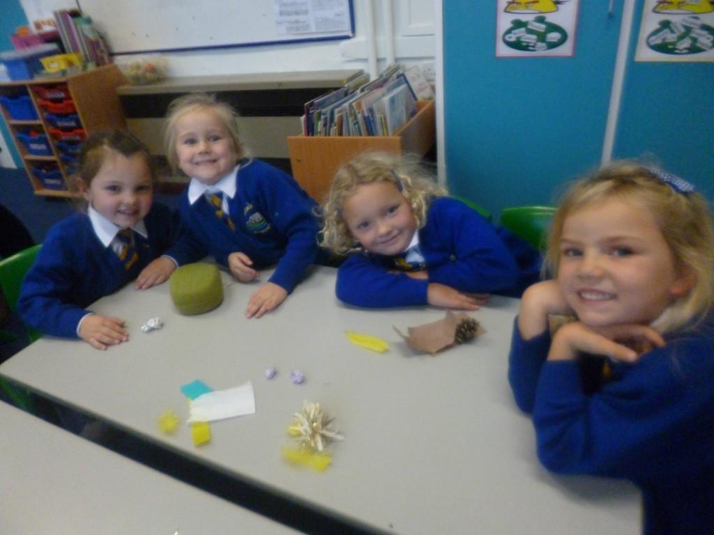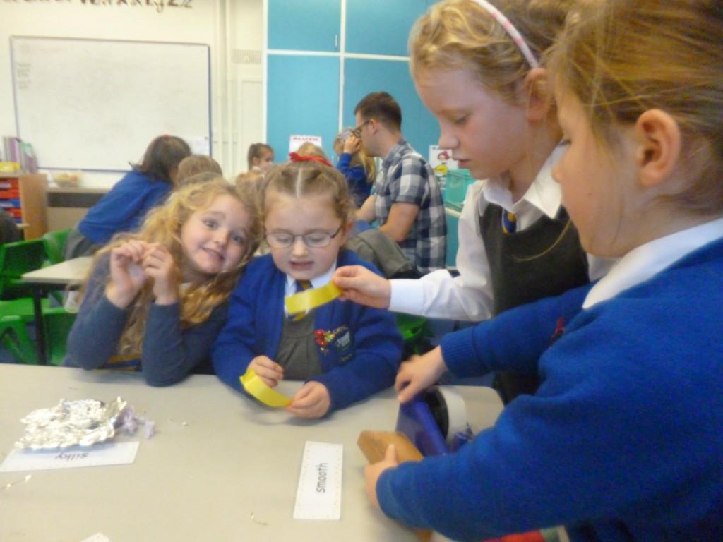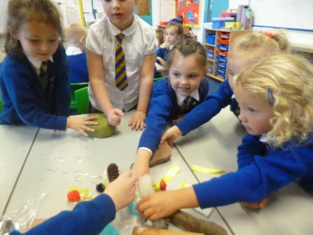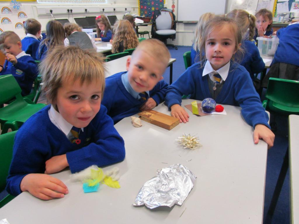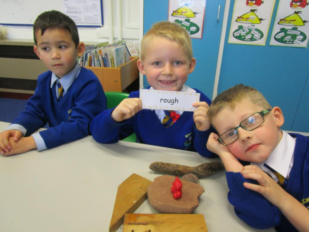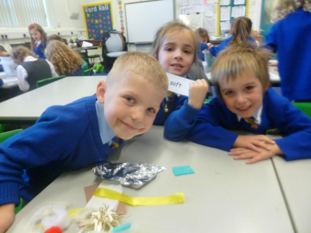 To finish off our Senses topic in science the children have been testing their sense of touch. First they had to guess the object that was in the box by touch alone. Then they had to think of words to describe the different materials on their tables. After this the children had to sort the materials into different groups according to how the materials felt - rough, smooth, hard, fluffy etc. The children chose their own groups to sort the materials into.