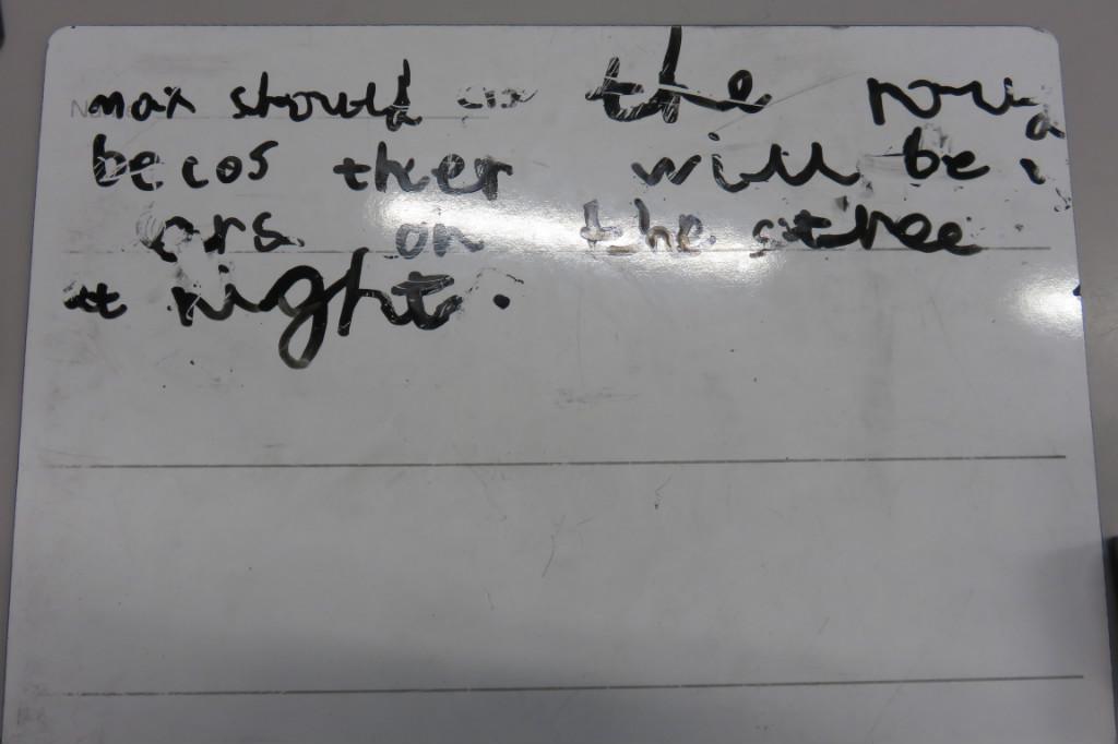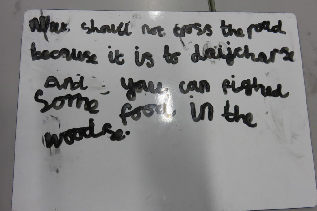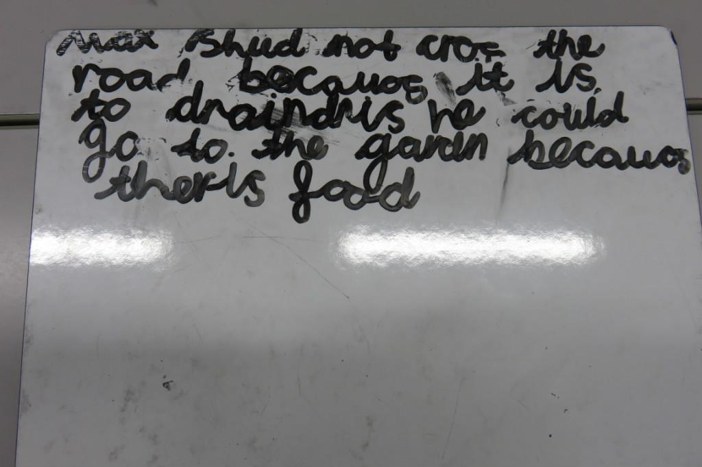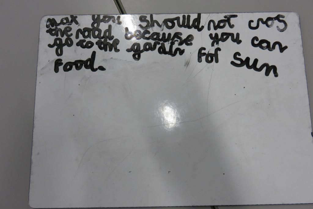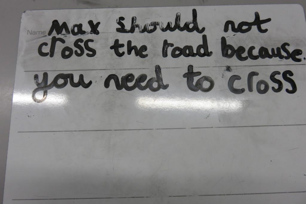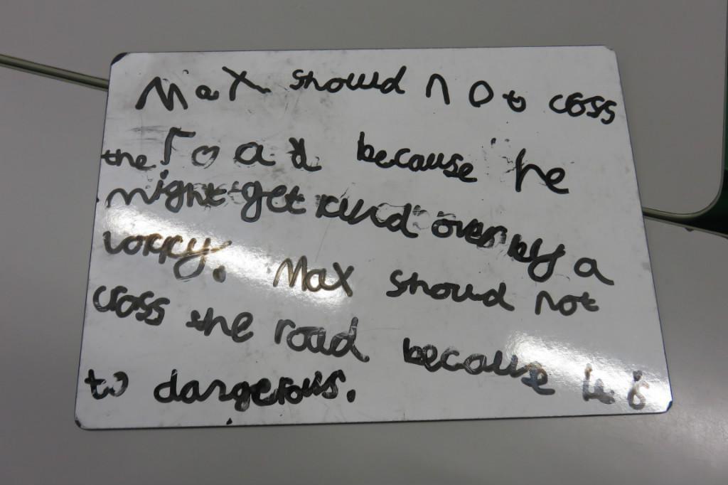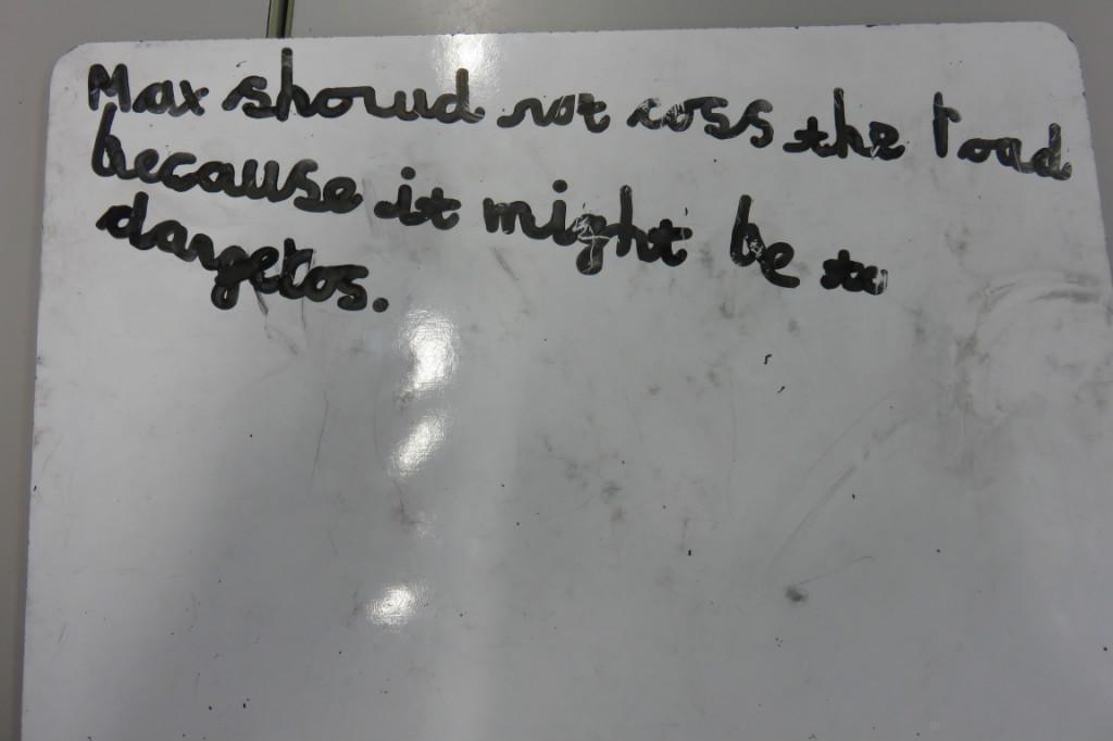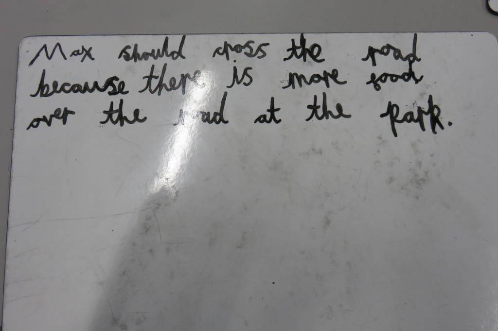 In class we have been reading 'The Hodgeheg' by Dick King Smith. The children had to think of reasons why Max should or should not cross the road. 'Max' decided that he should not cross the road because he was scared and he would miss his parents.