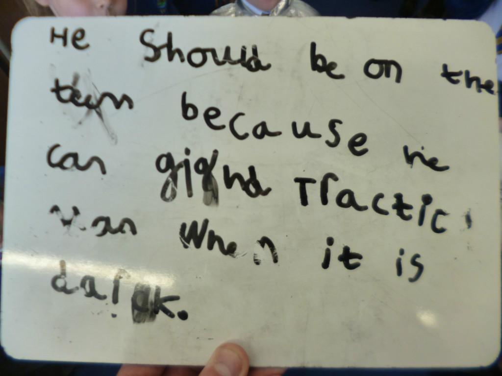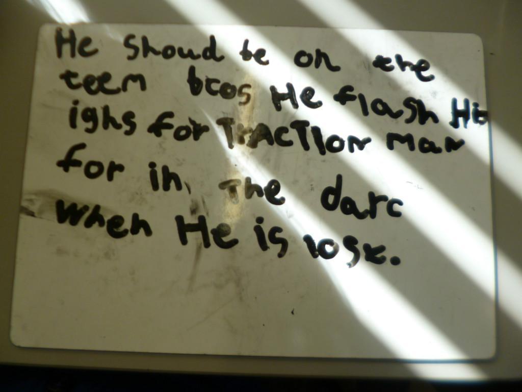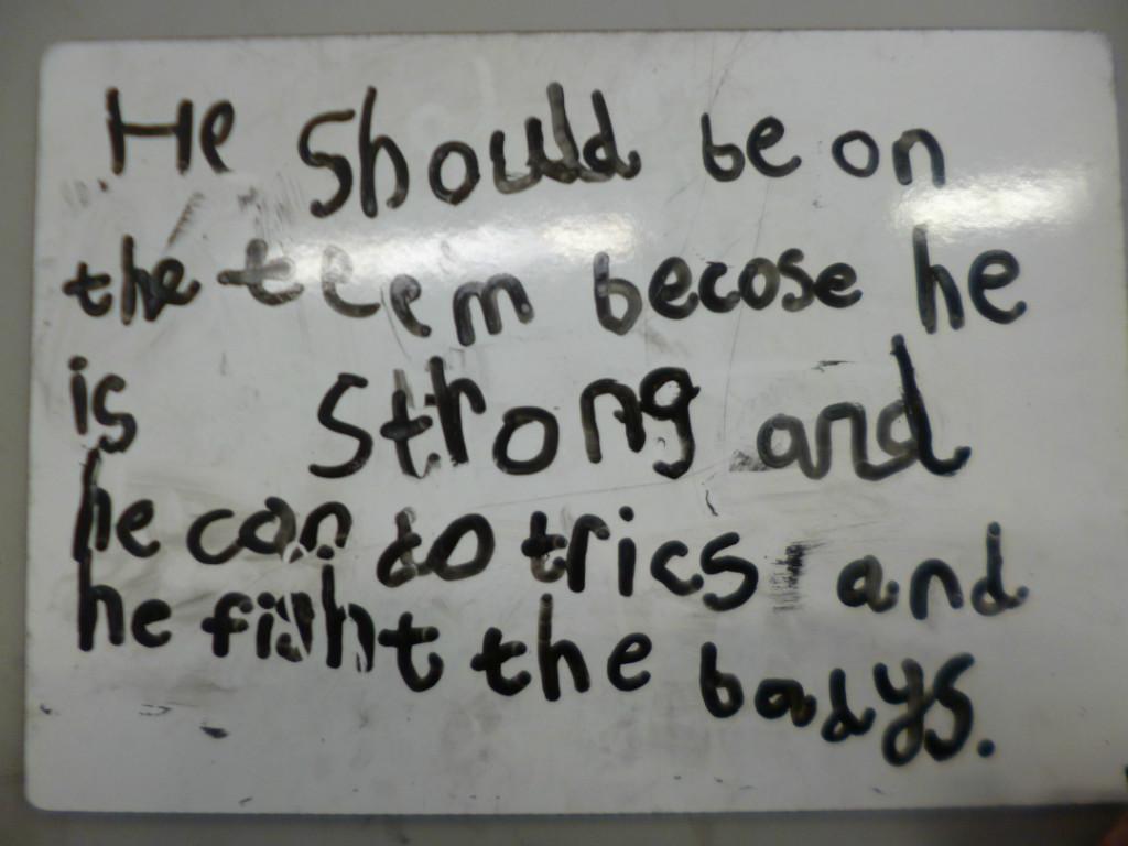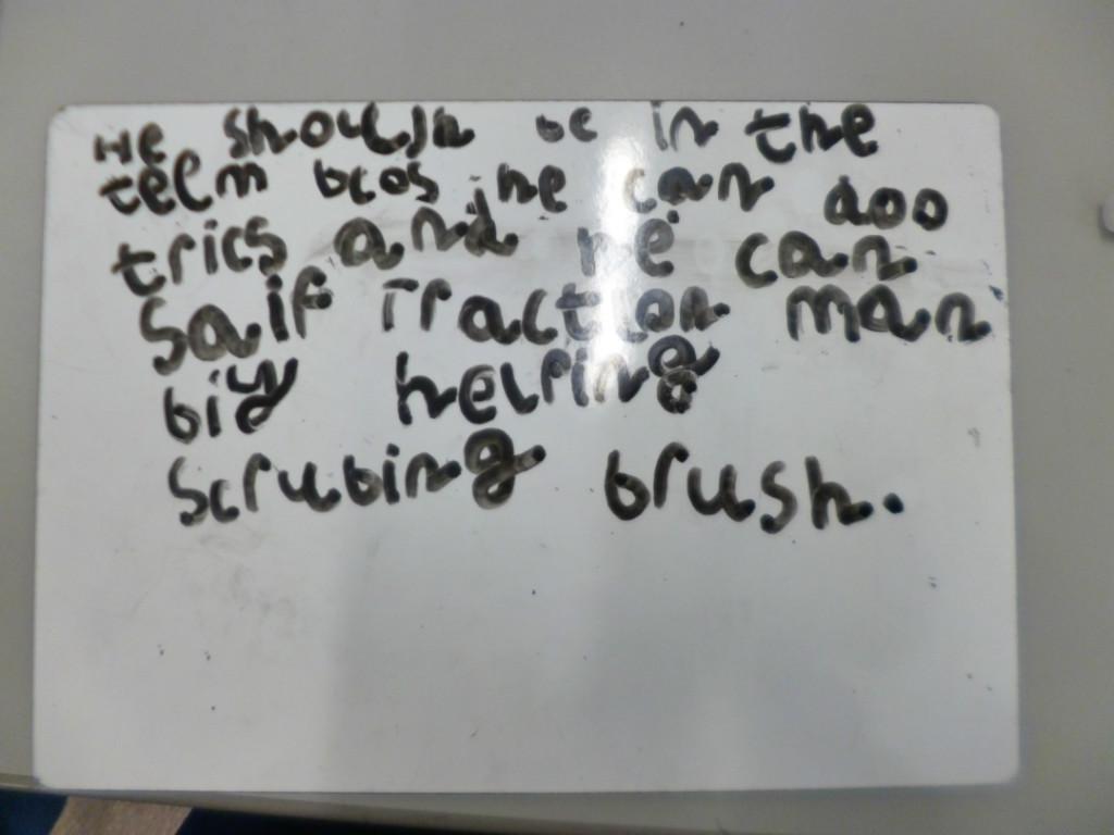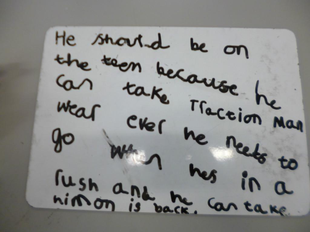 In pairs the children had to explain why they think Turbo Dog should or should not join Traction Man’s team. To do so they had to think of events from the story to inform their opinion. Then the children took part in a ‘Decision Alley’ activity where they had to explain their reasons to ’Traction Man’. In the end ’Traction Man’ decided that he would not let Turbo Dog join his team because he was too noisy and would spoil his adventures.