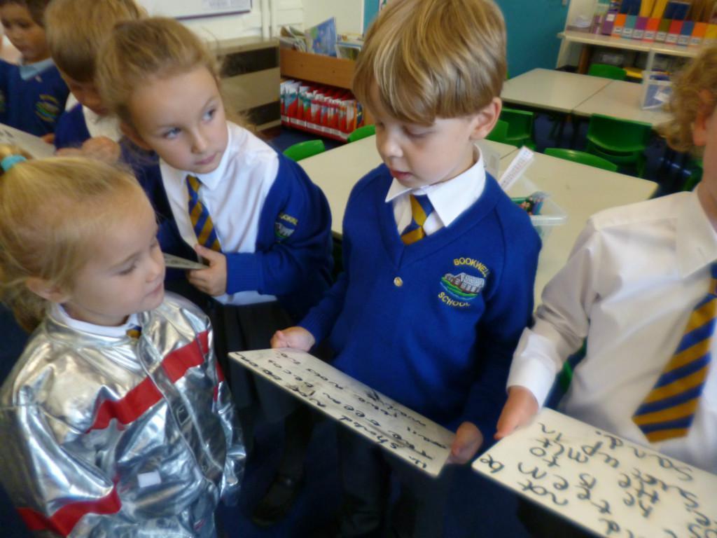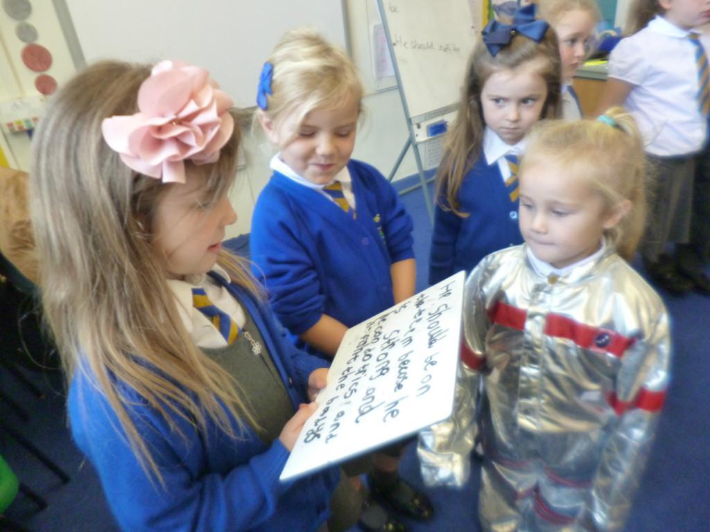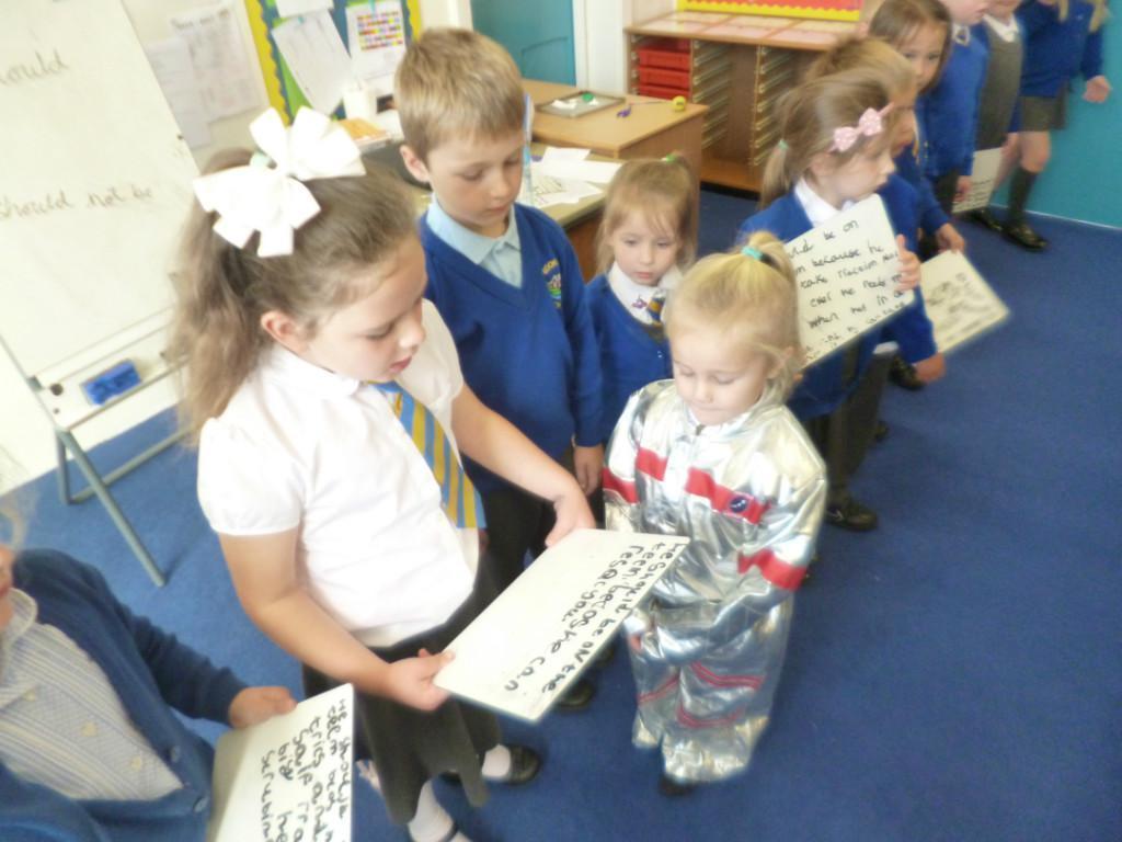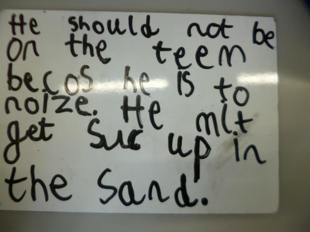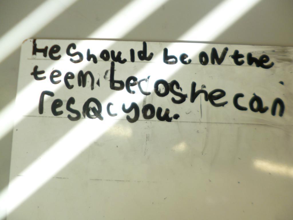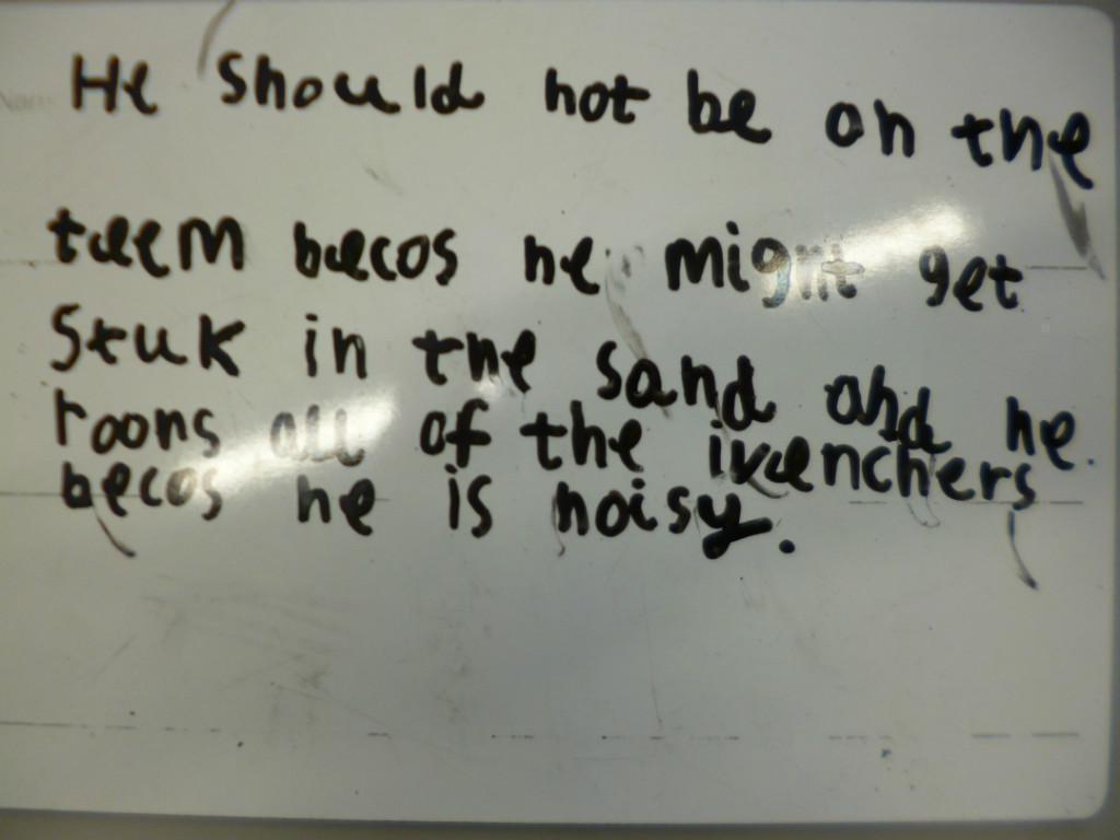 In pairs the children had to explain why they think Turbo Dog should or should not join Traction Man’s team. To do so they had to think of events from the story to inform their opinion. Then the children took part in a ‘Decision Alley’ activity where they had to explain their reasons to ’Traction Man’. In the end ’Traction Man’ decided that he would not let Turbo Dog join his team because he was too noisy and would spoil his adventures.