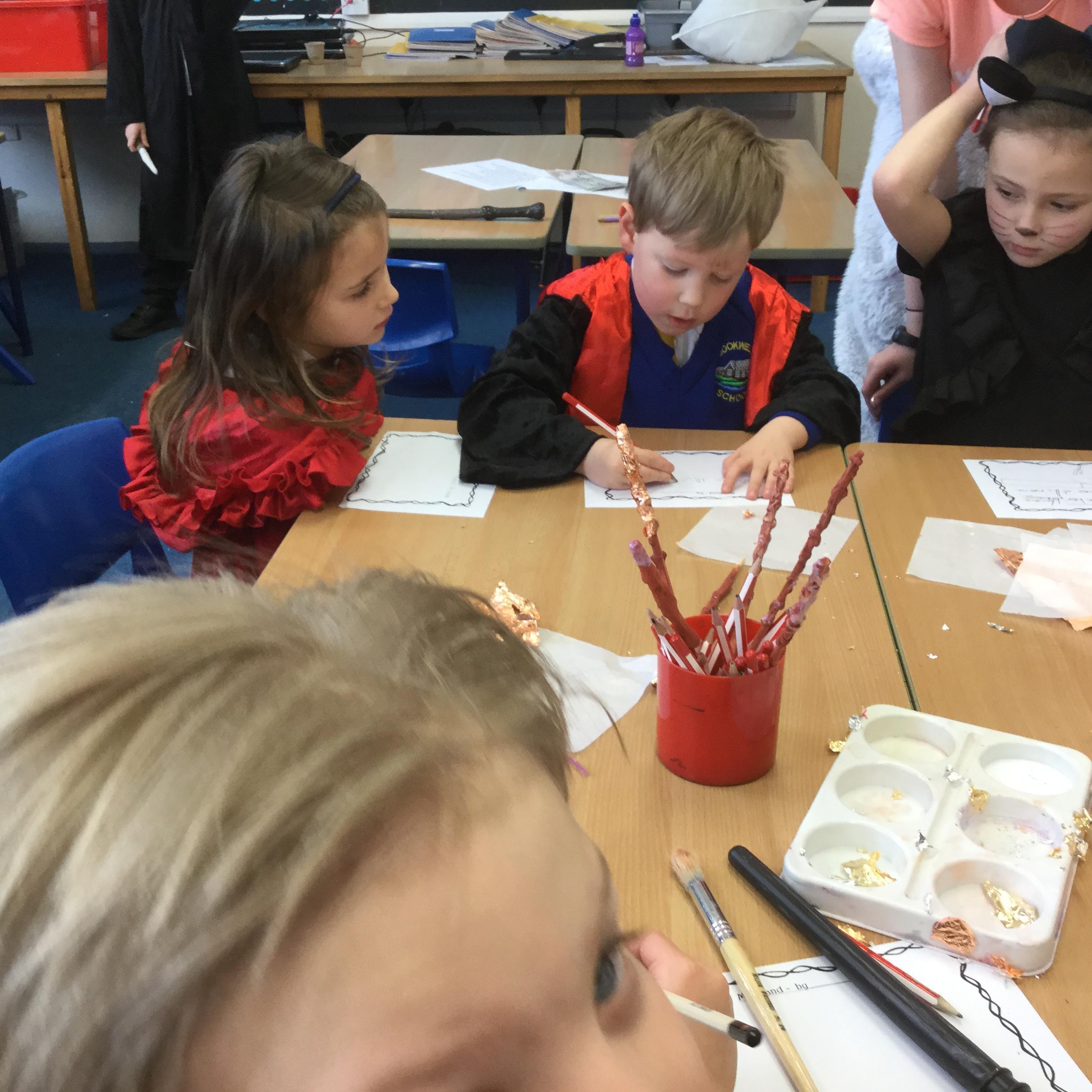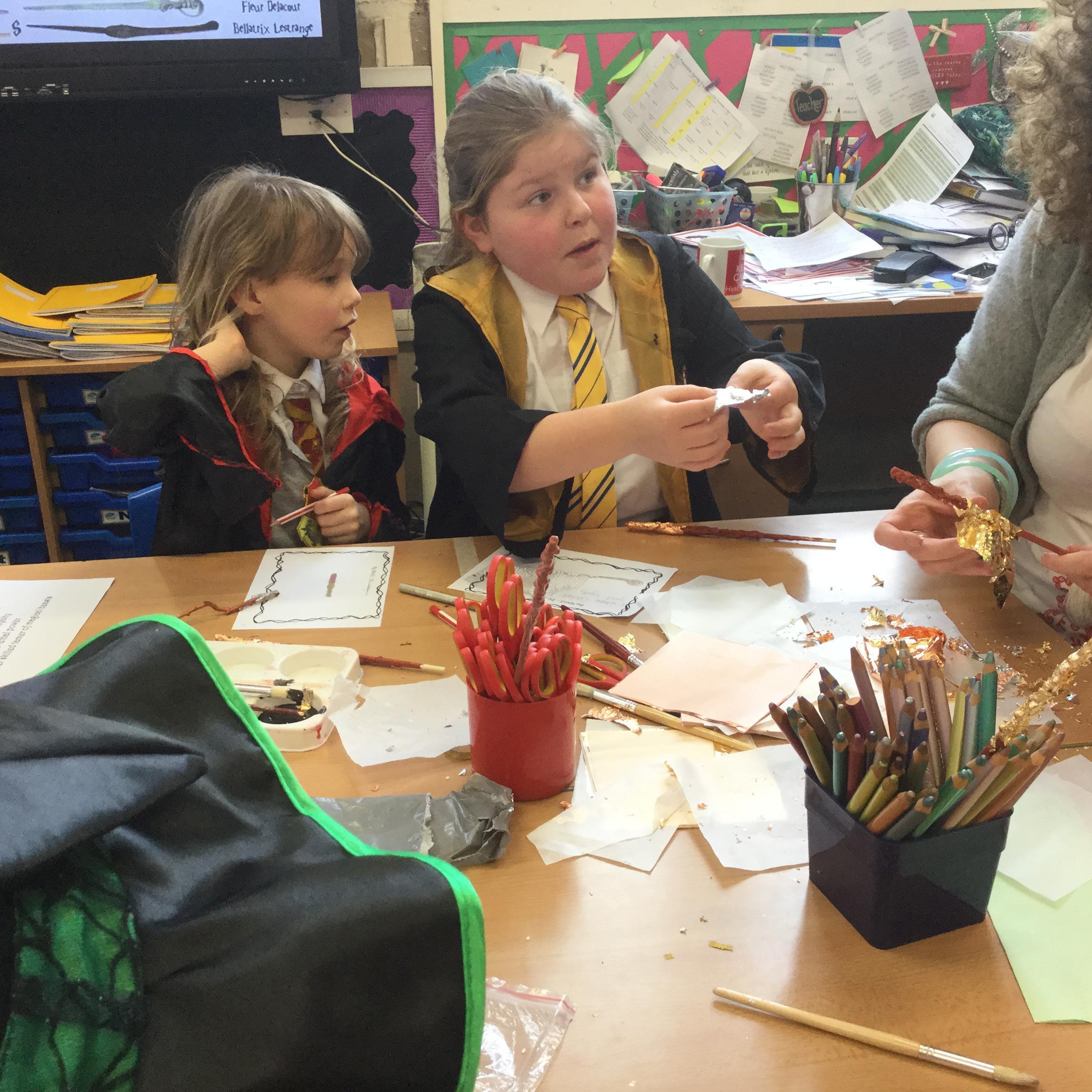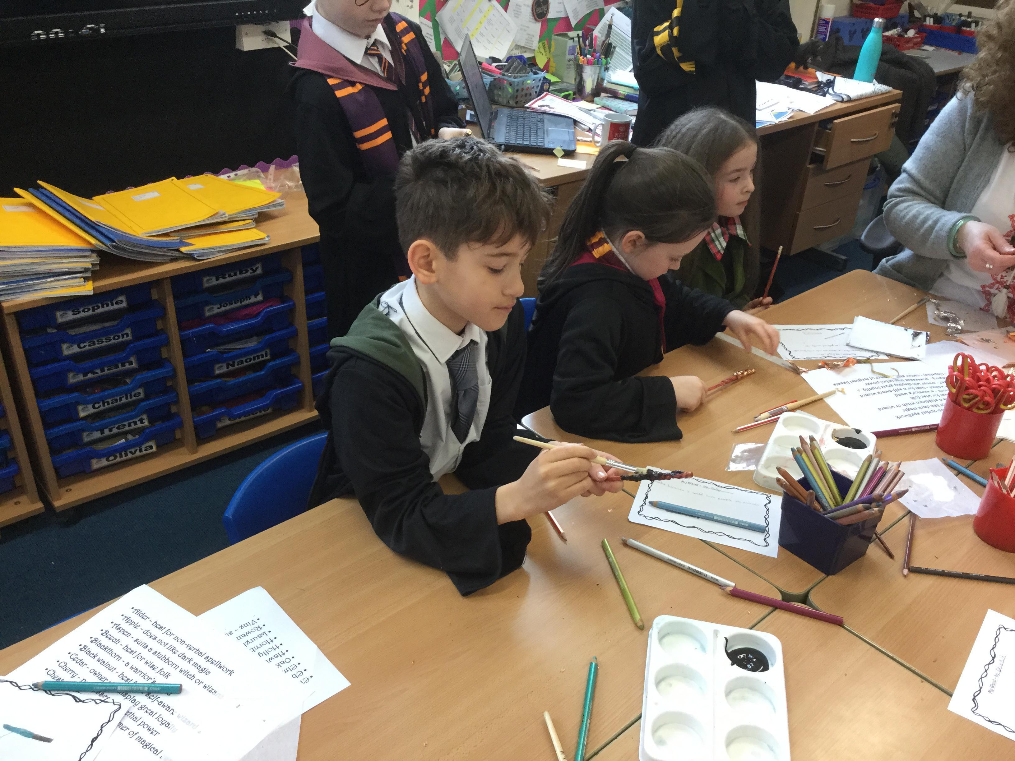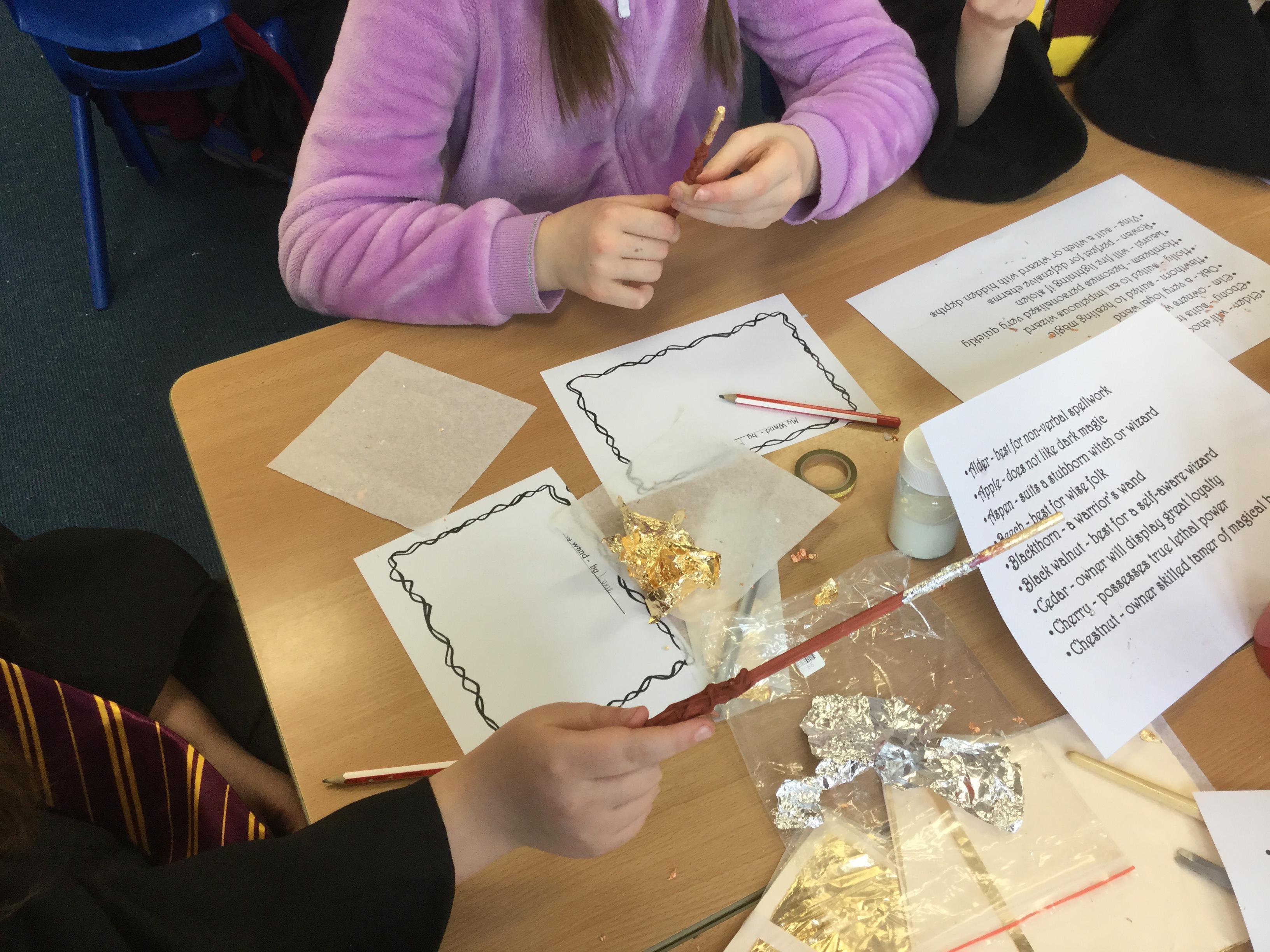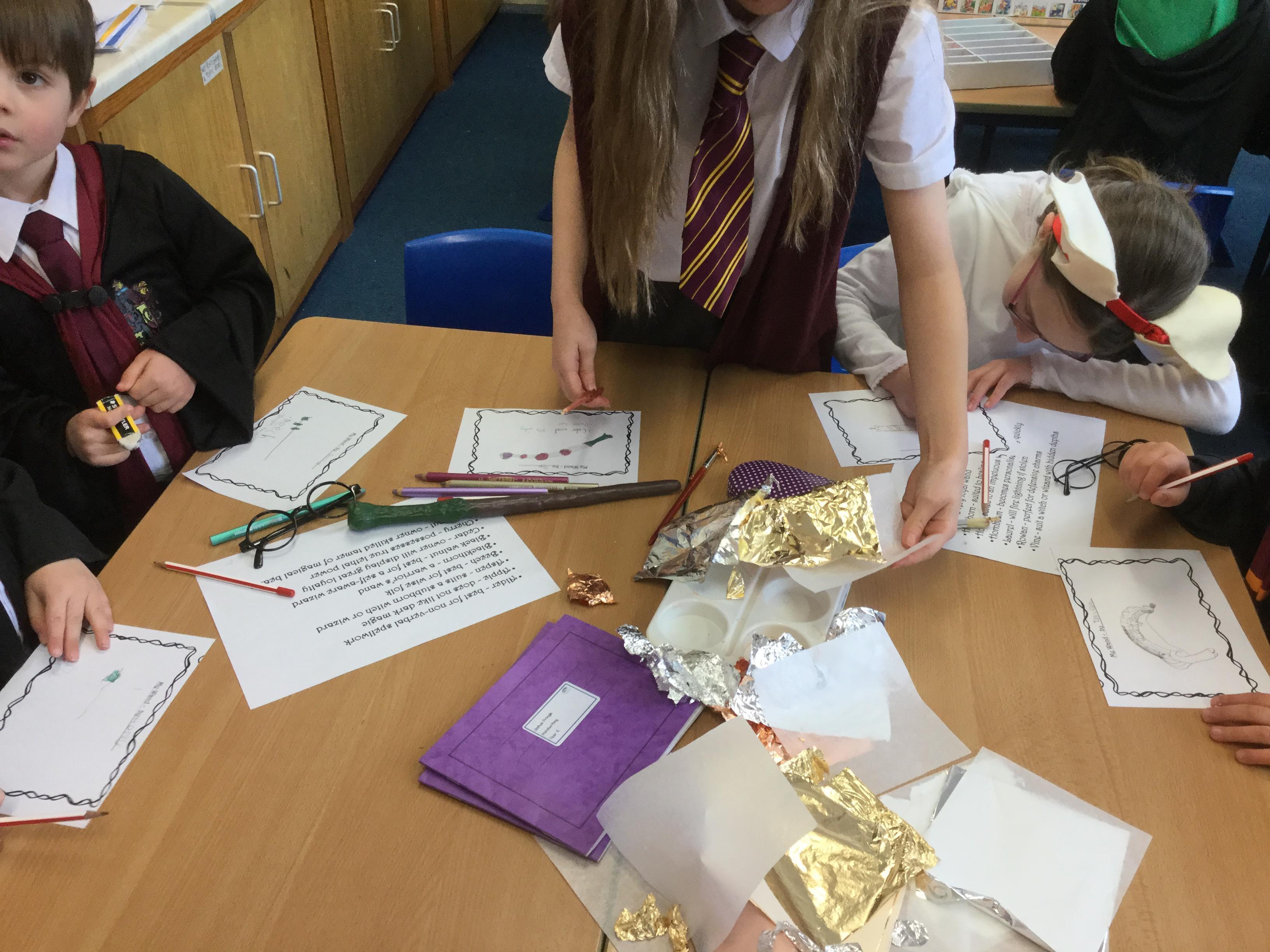 The children who came to Year 4 learned about wand making. They discovered how the wood they were made from and the core that was inside were special to each wizard and then designed their own wand. We decorated them with real gold and silver, paint, glitter, beads etc and made them look like Ollivander had made them himself!