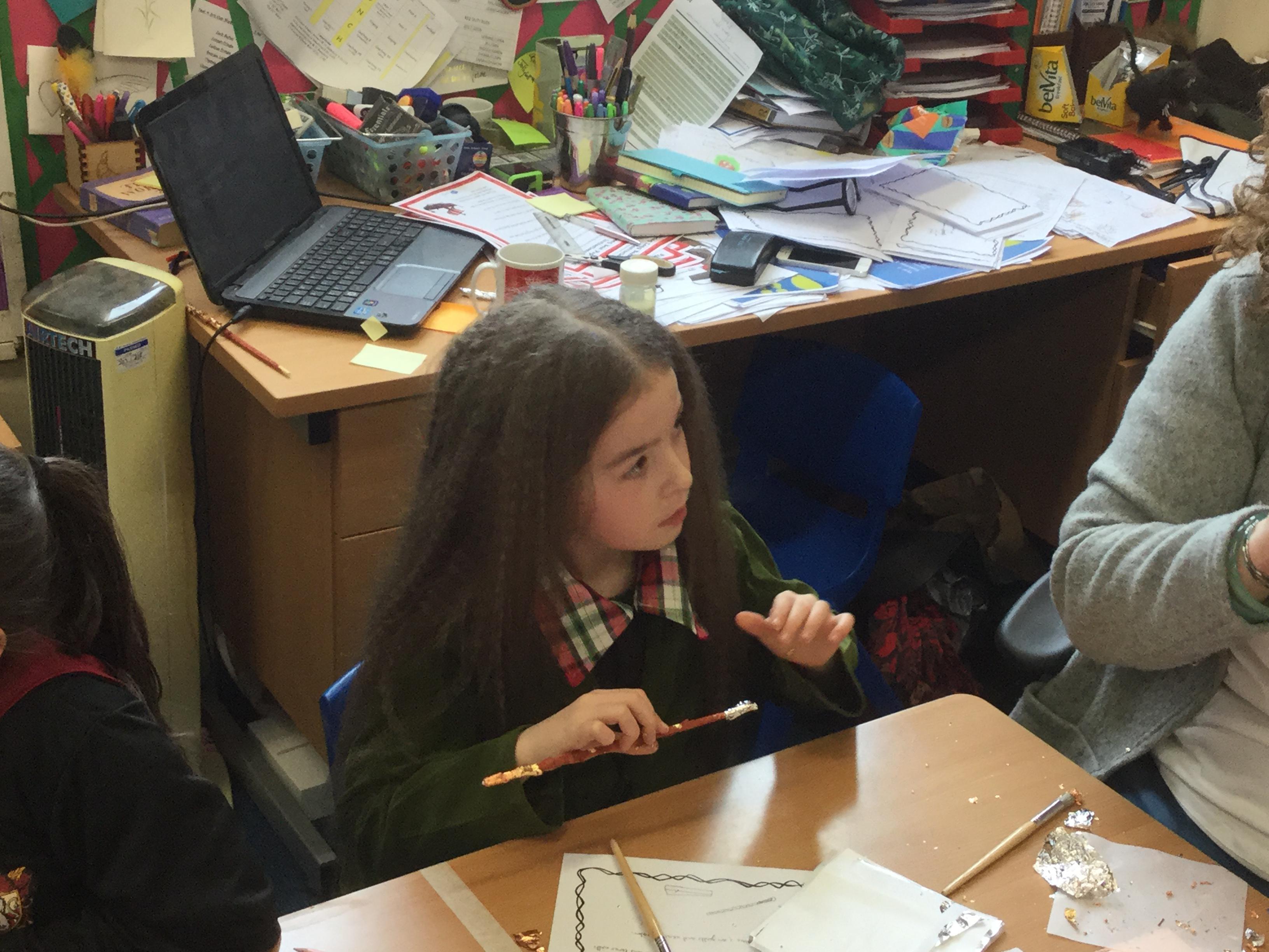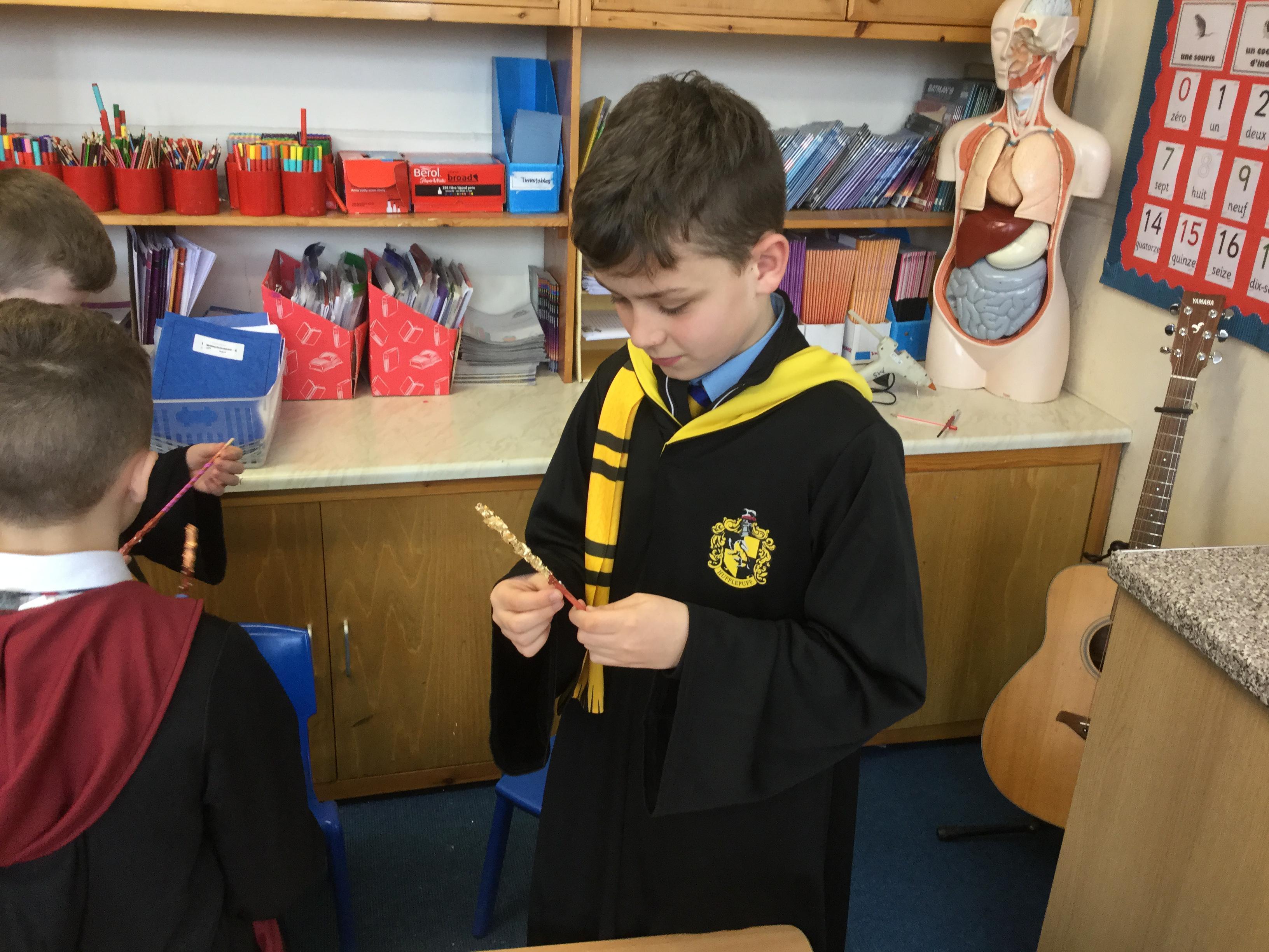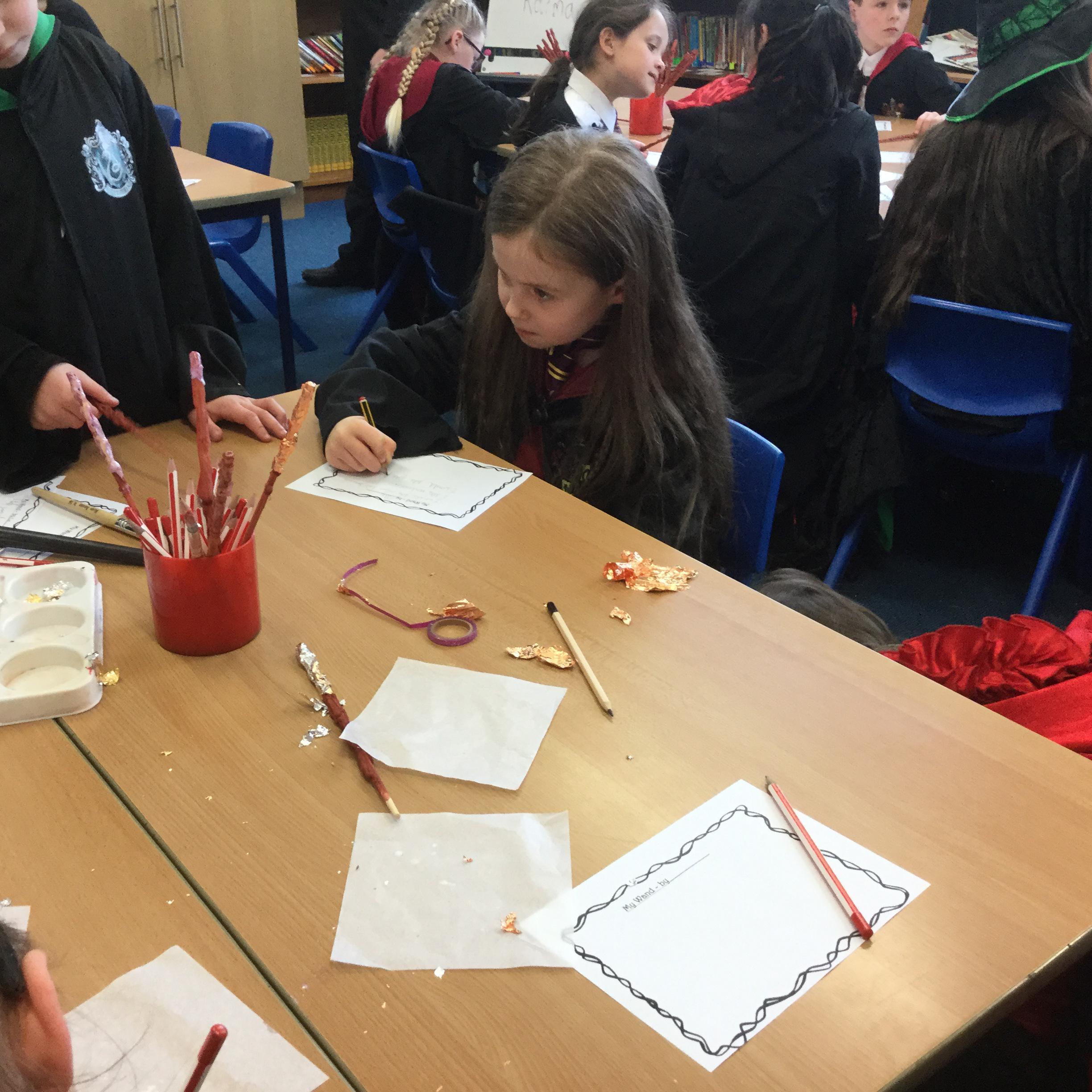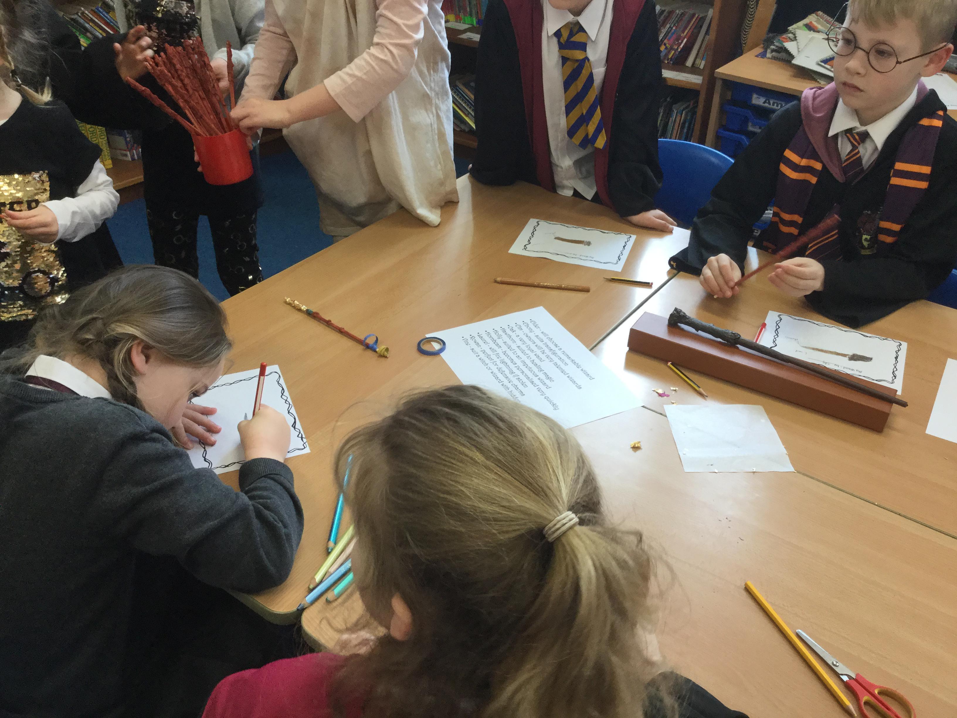 The children who came to Year 4 learned about wand making. They discovered how the wood they were made from and the core that was inside were special to each wizard and then designed their own wand. We decorated them with real gold and silver, paint, glitter, beads etc and made them look like Ollivander had made them himself!