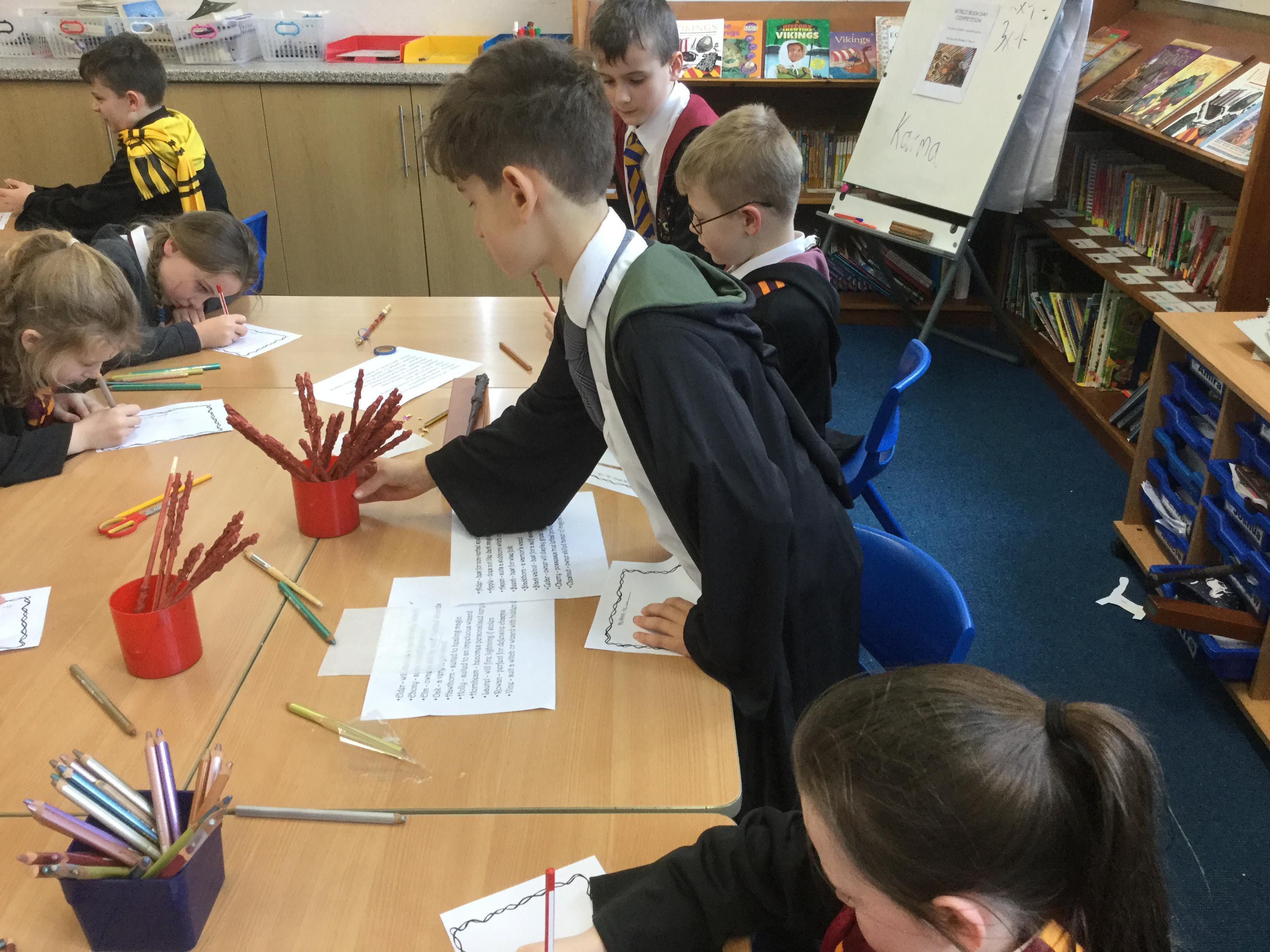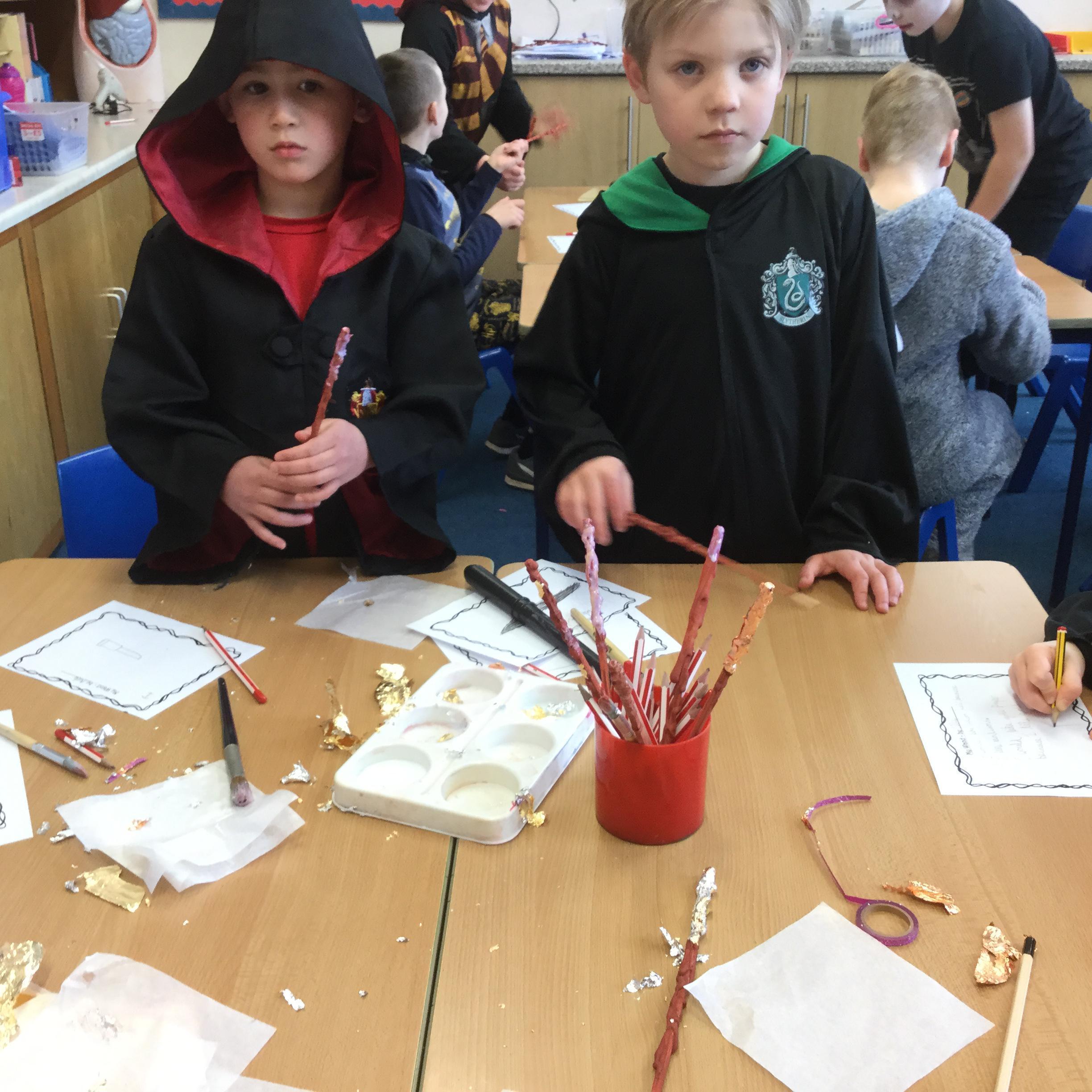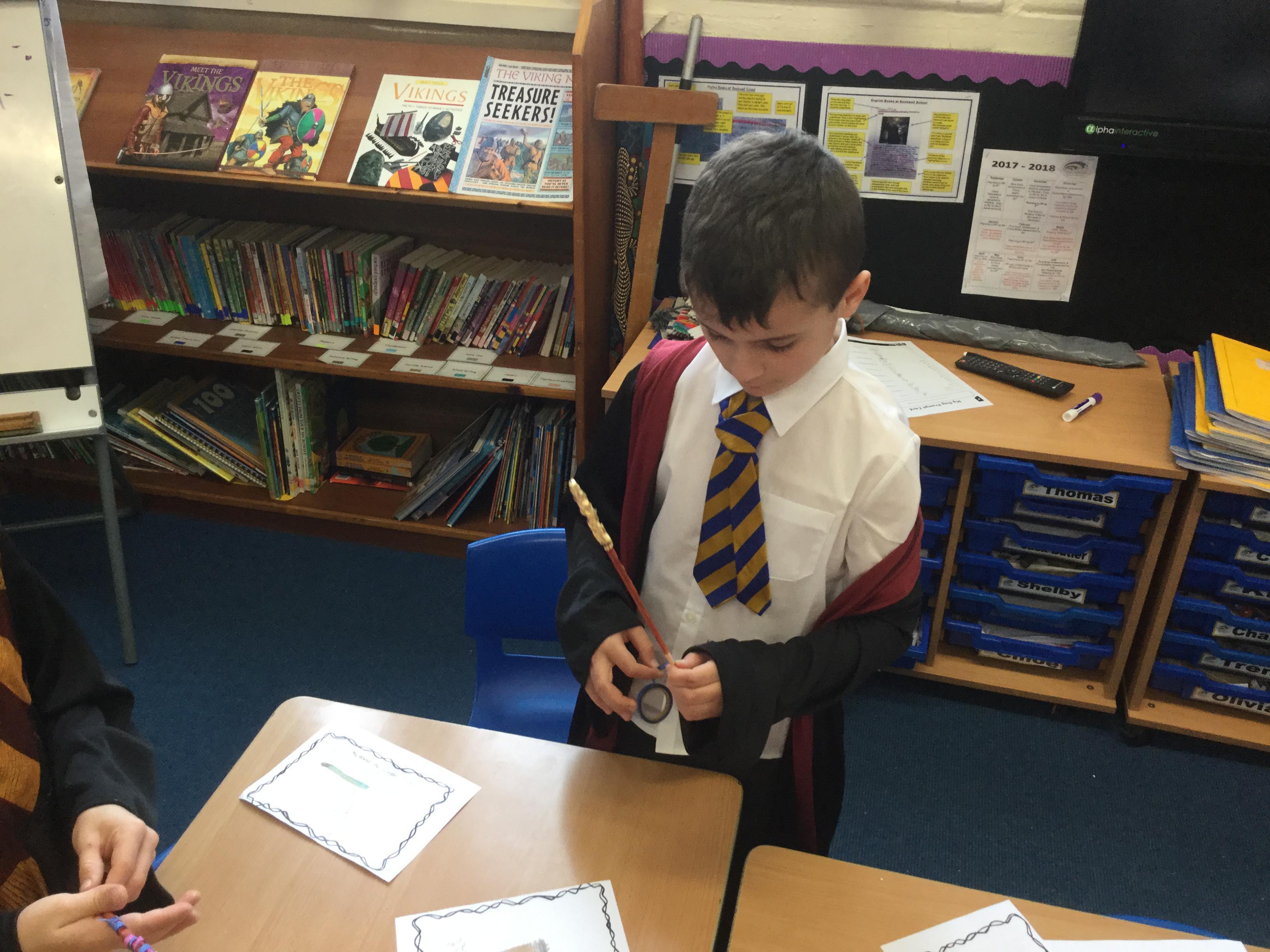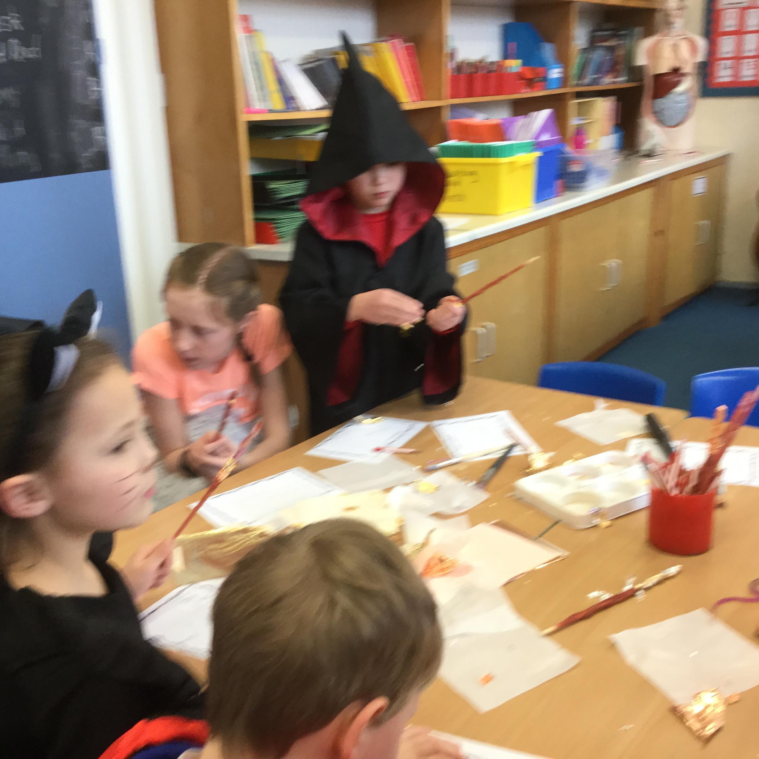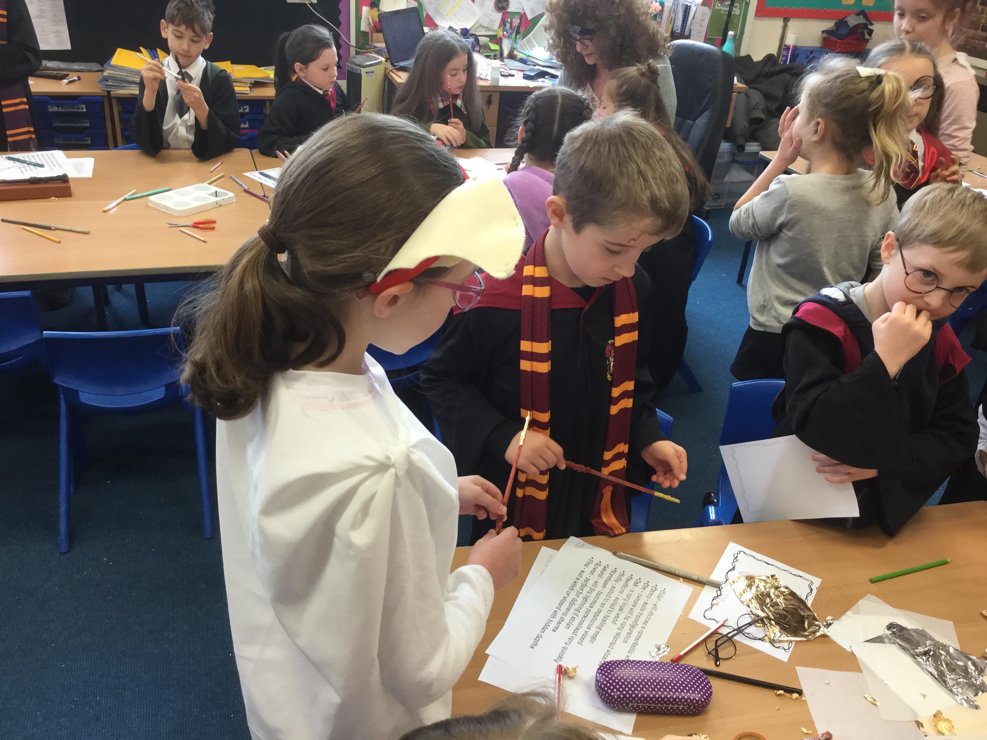 The children who came to Year 4 learned about wand making. They discovered how the wood they were made from and the core that was inside were special to each wizard and then designed their own wand. We decorated them with real gold and silver, paint, glitter, beads etc and made them look like Ollivander had made them himself!