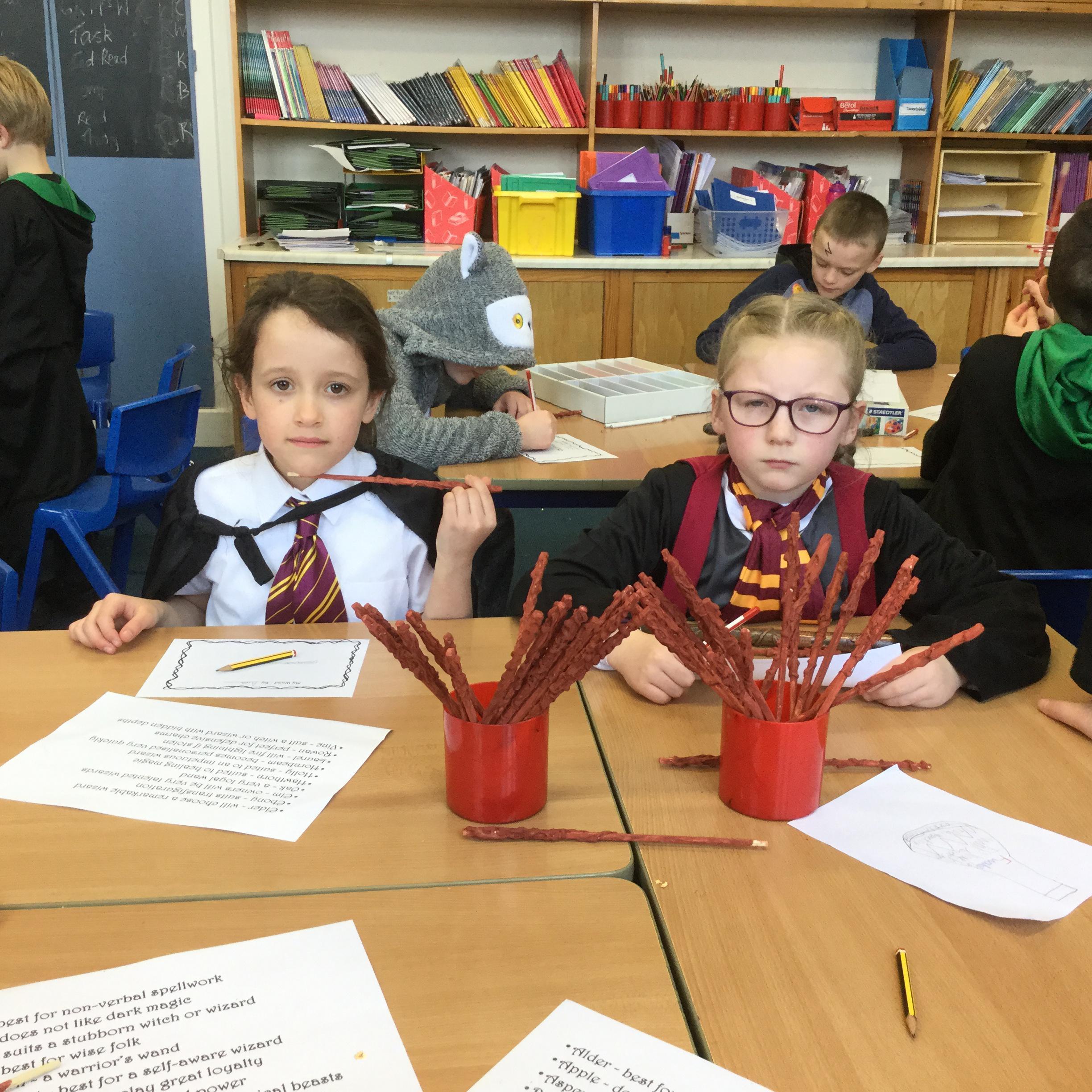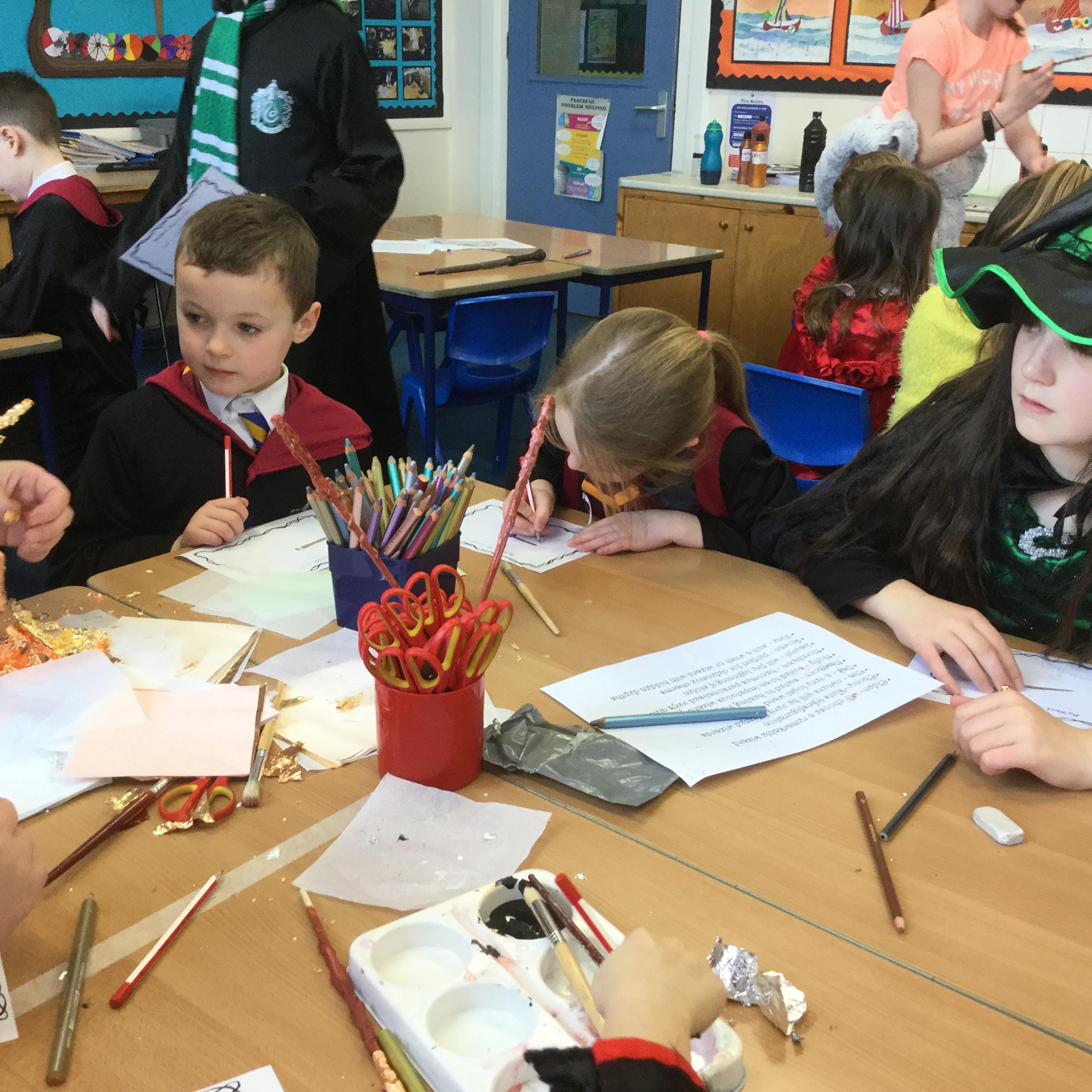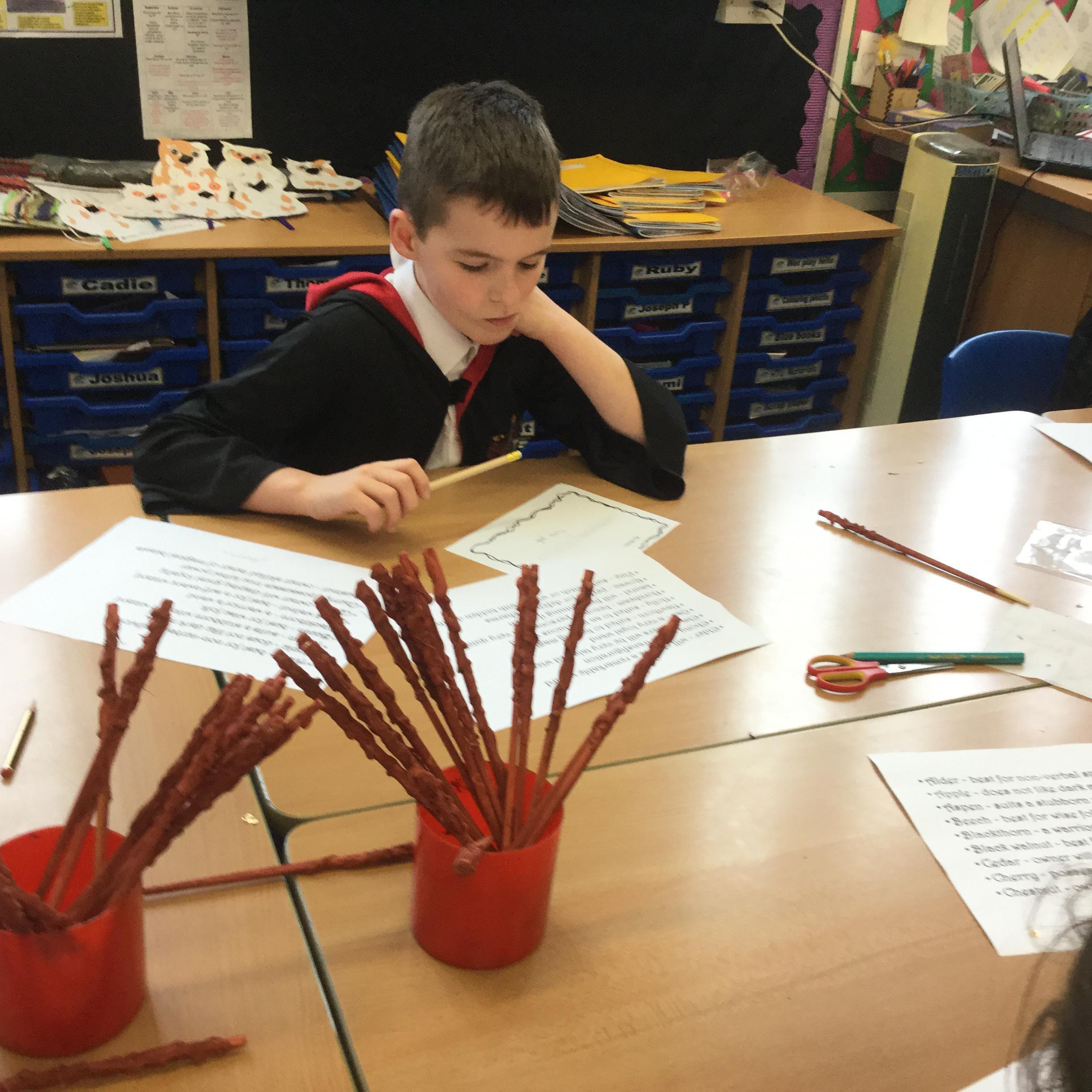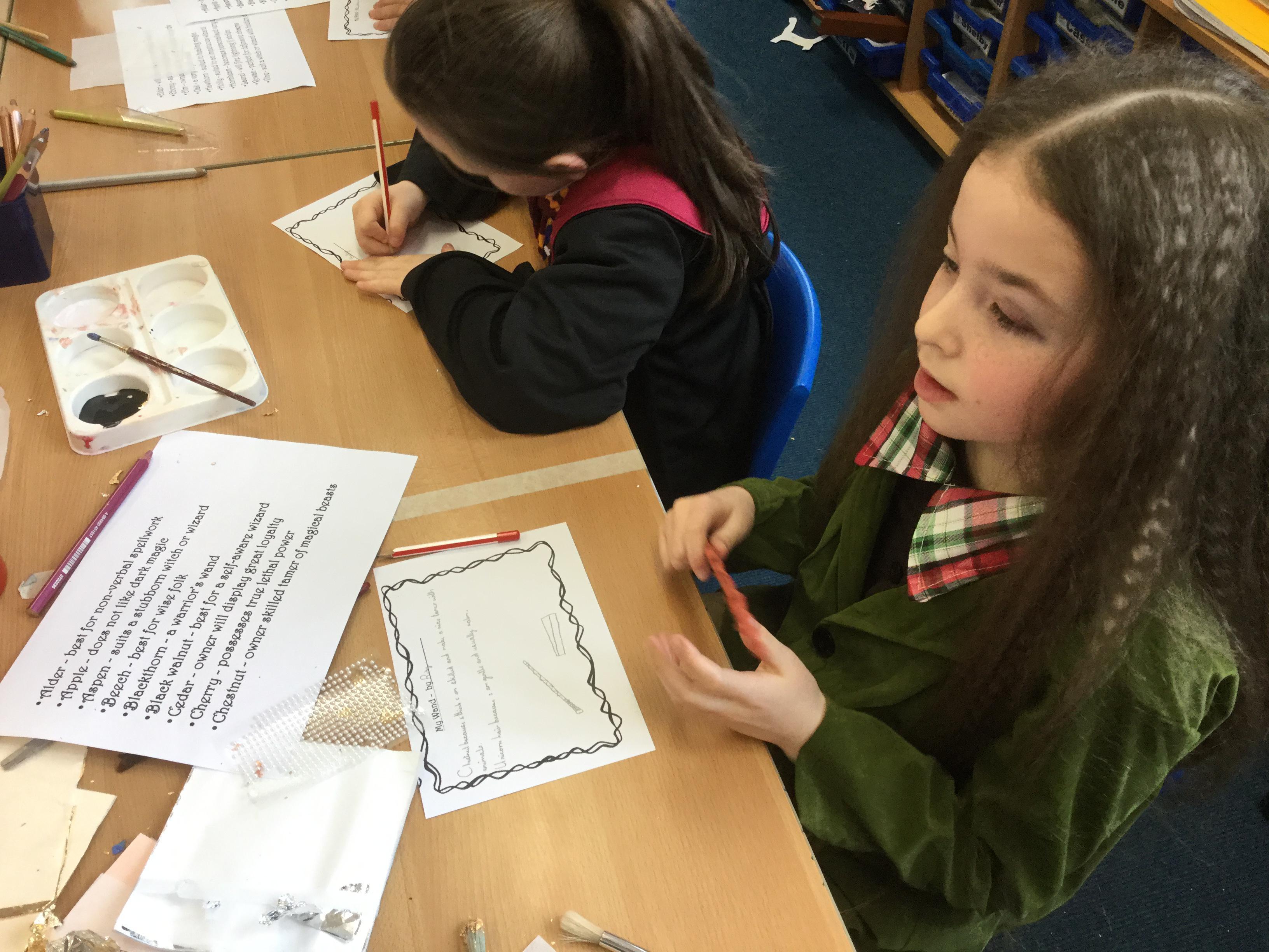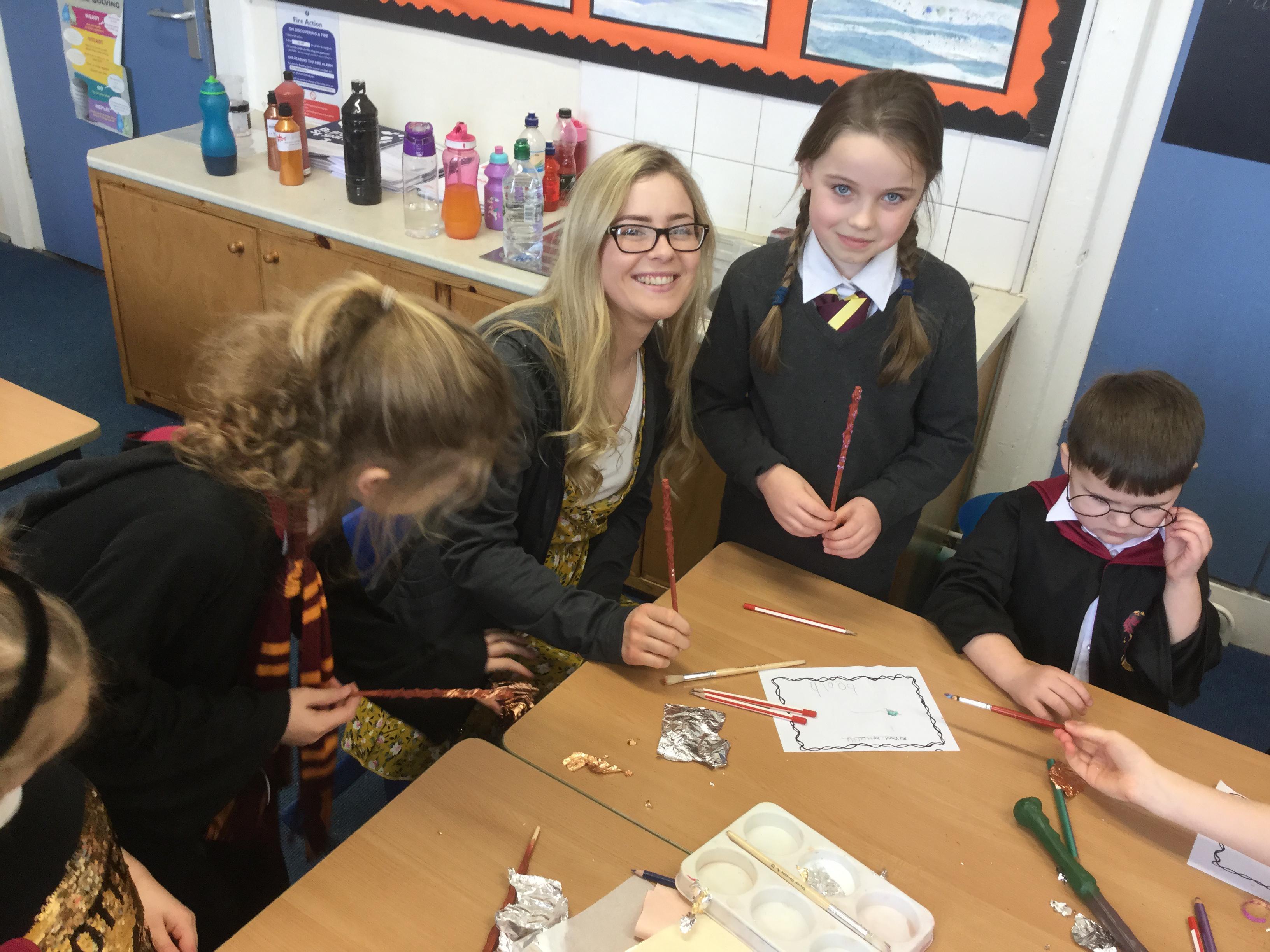 The children who came to Year 4 learned about wand making. They discovered how the wood they were made from and the core that was inside were special to each wizard and then designed their own wand. We decorated them with real gold and silver, paint, glitter, beads etc and made them look like Ollivander had made them himself!