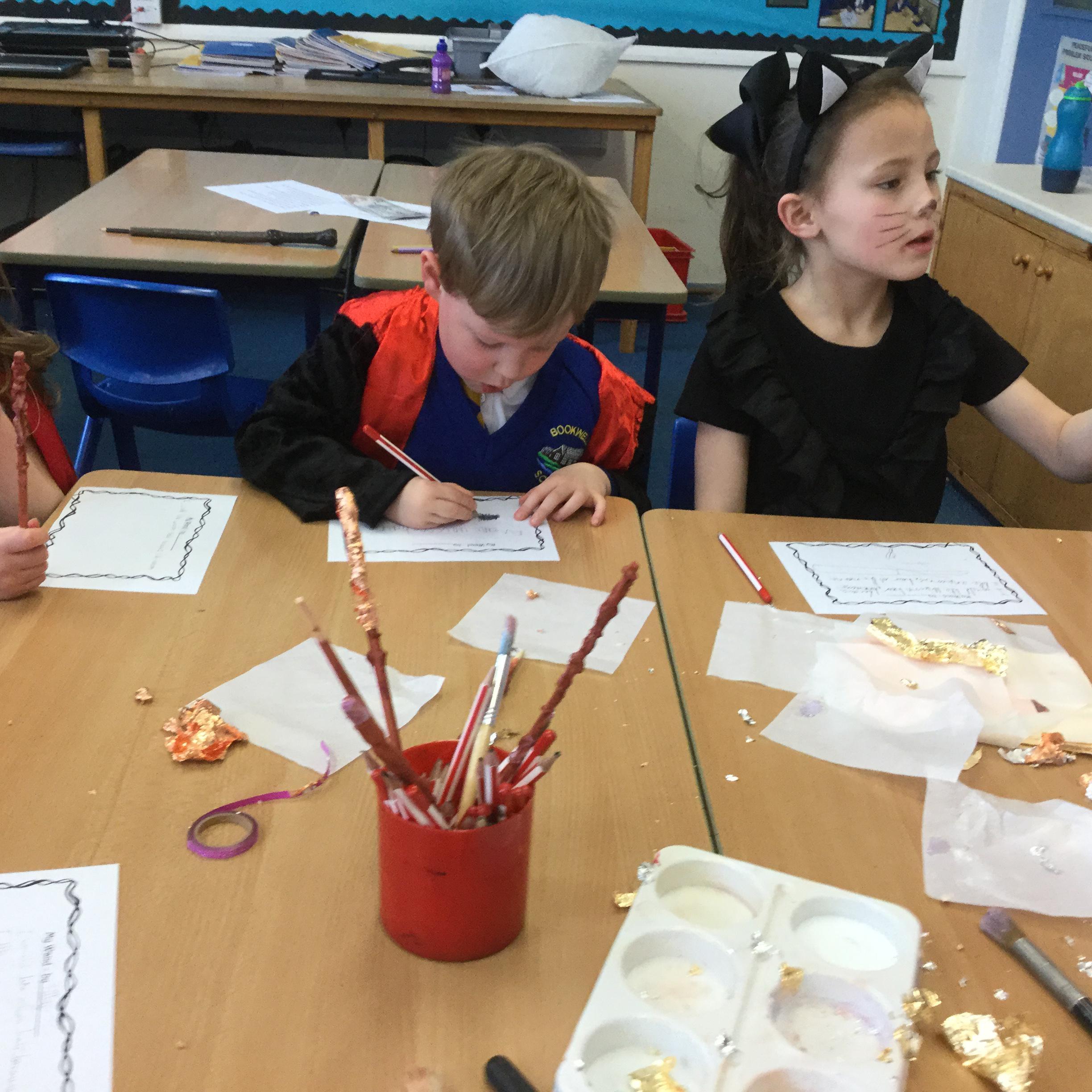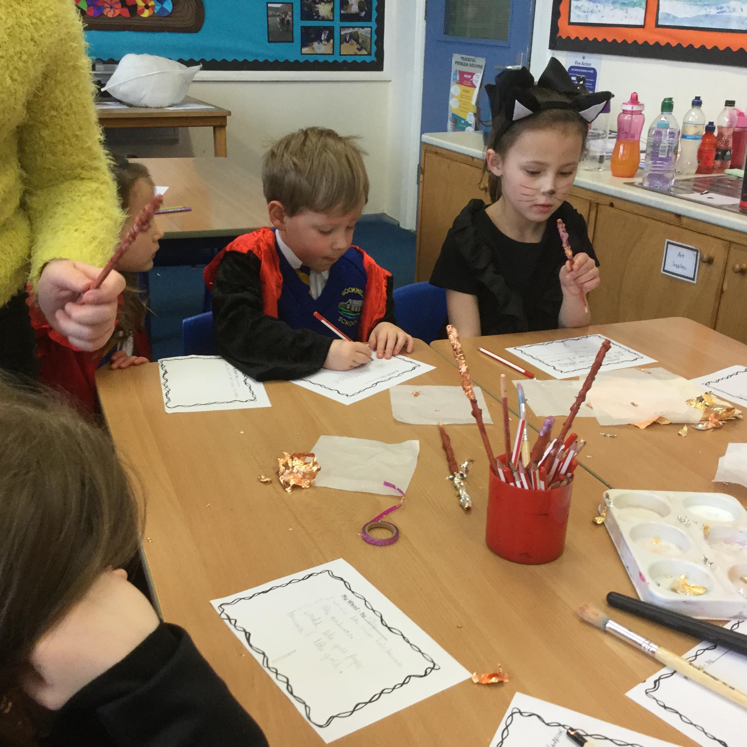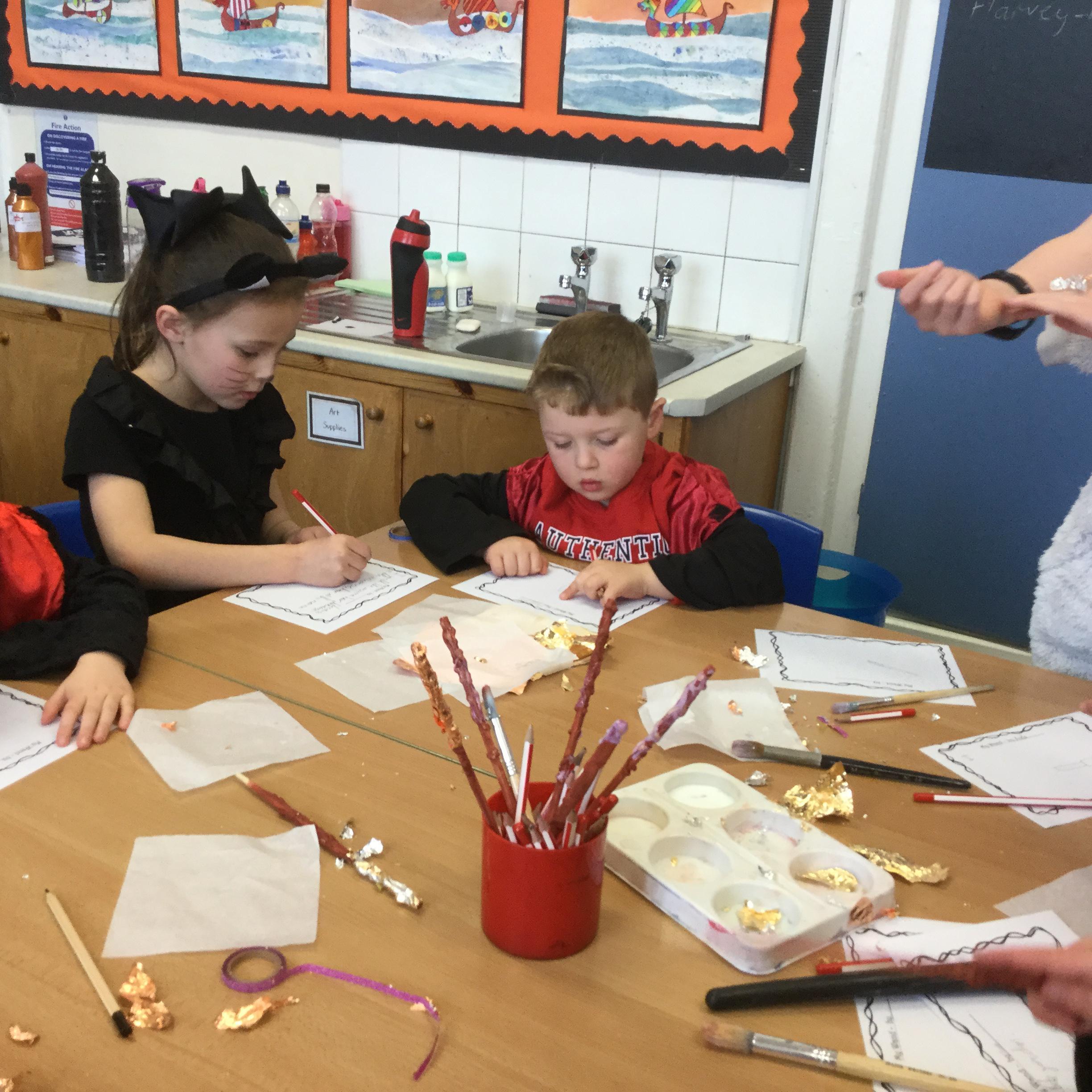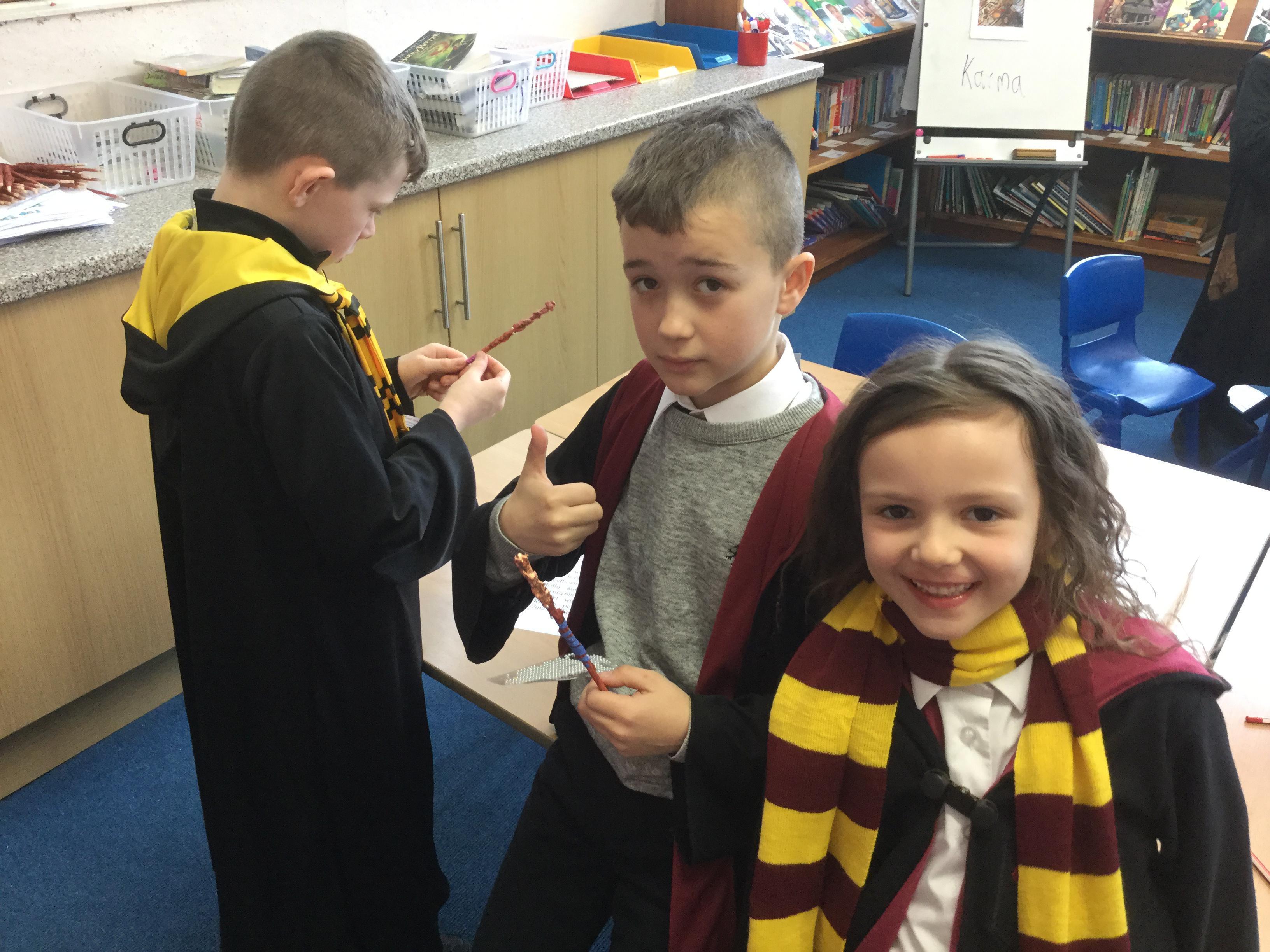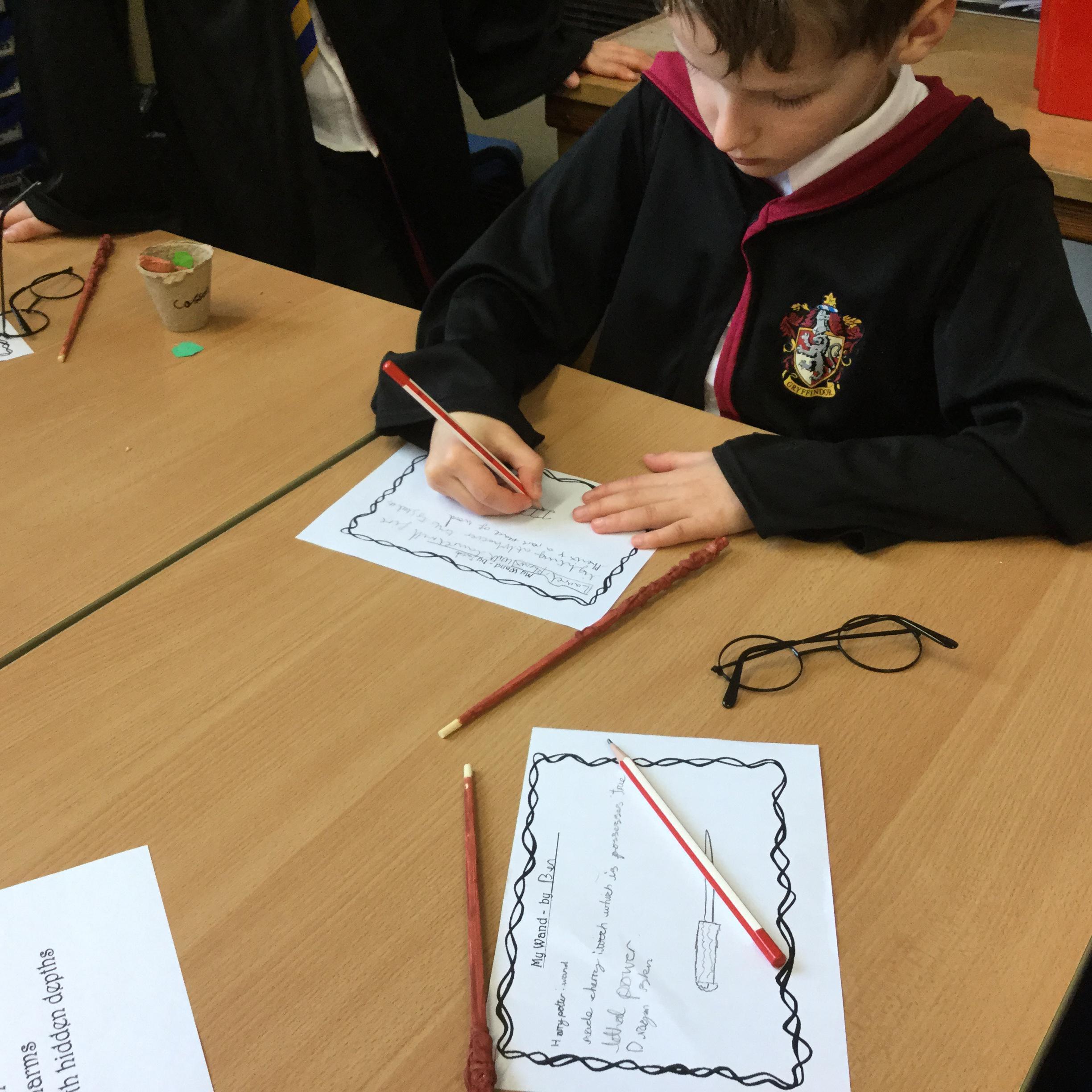 The children who came to Year 4 learned about wand making. They discovered how the wood they were made from and the core that was inside were special to each wizard and then designed their own wand. We decorated them with real gold and silver, paint, glitter, beads etc and made them look like Ollivander had made them himself!