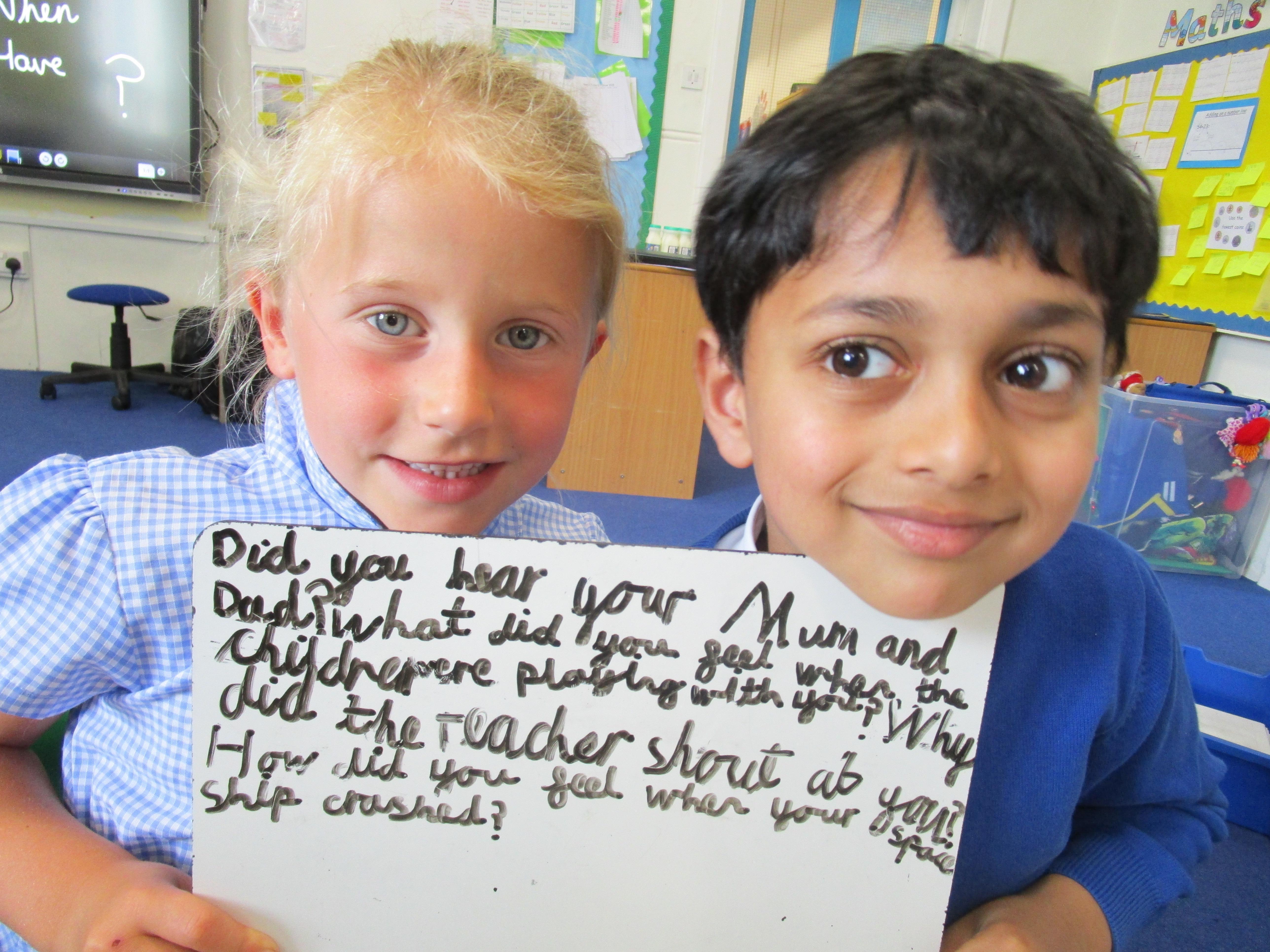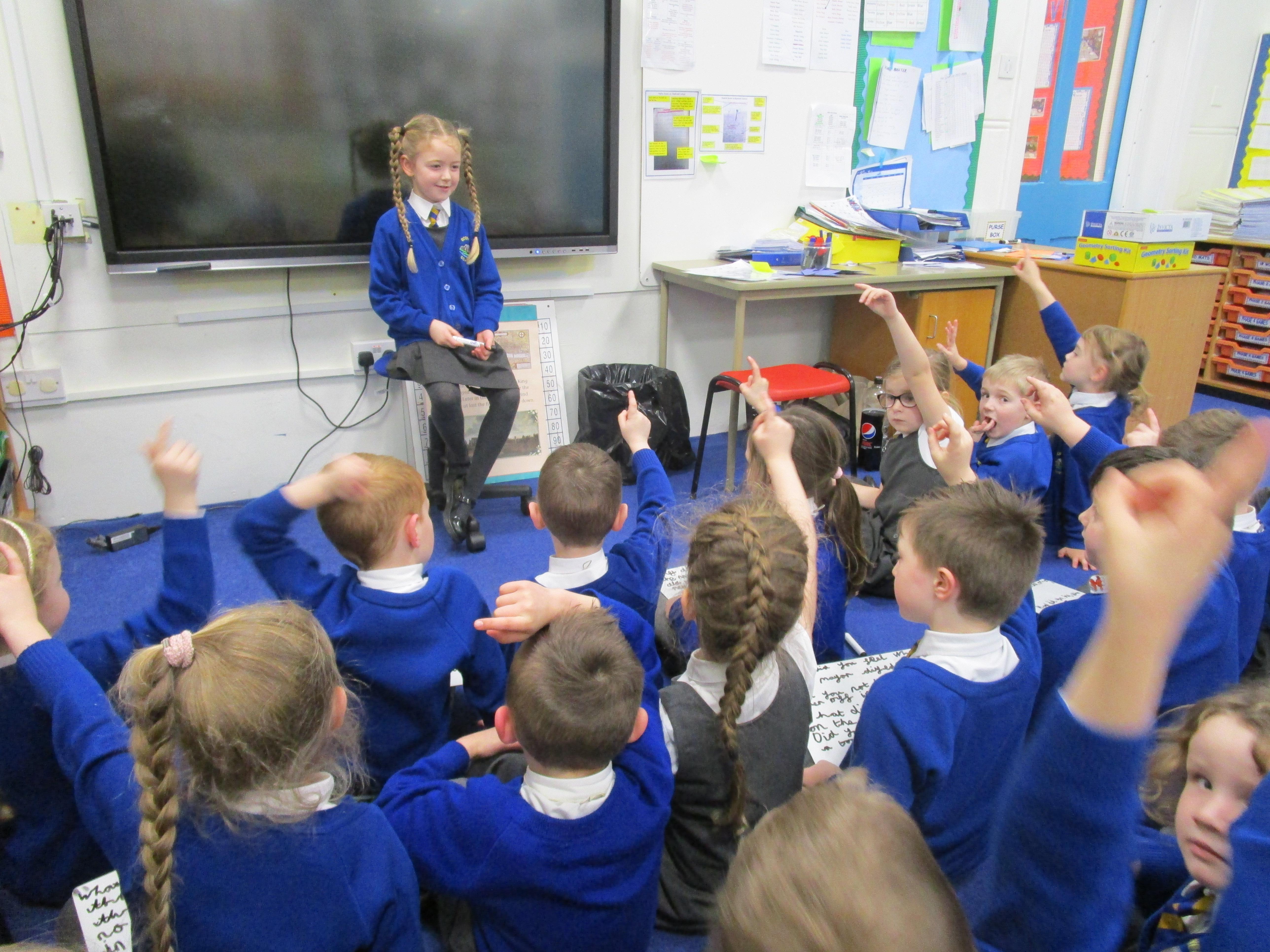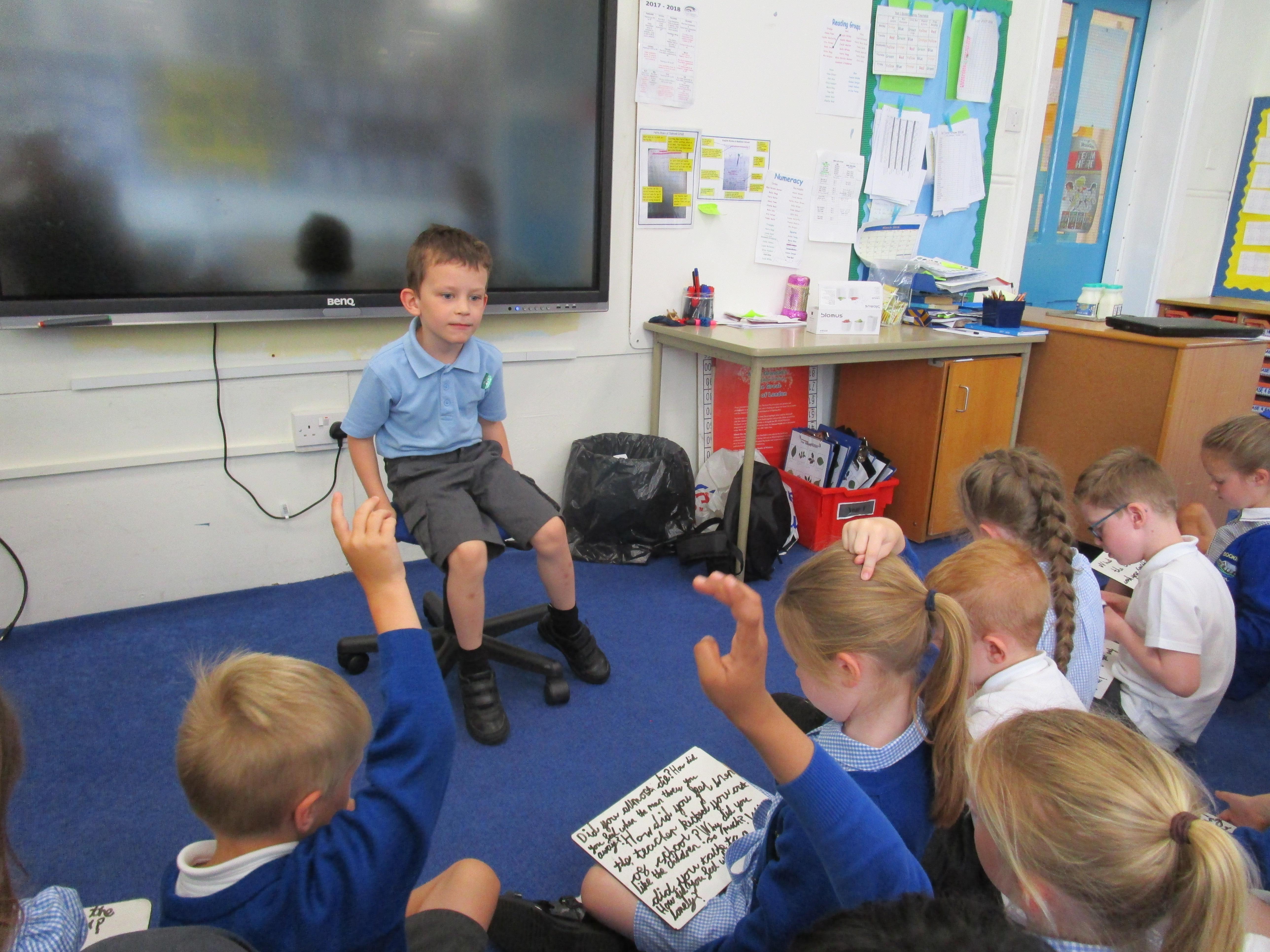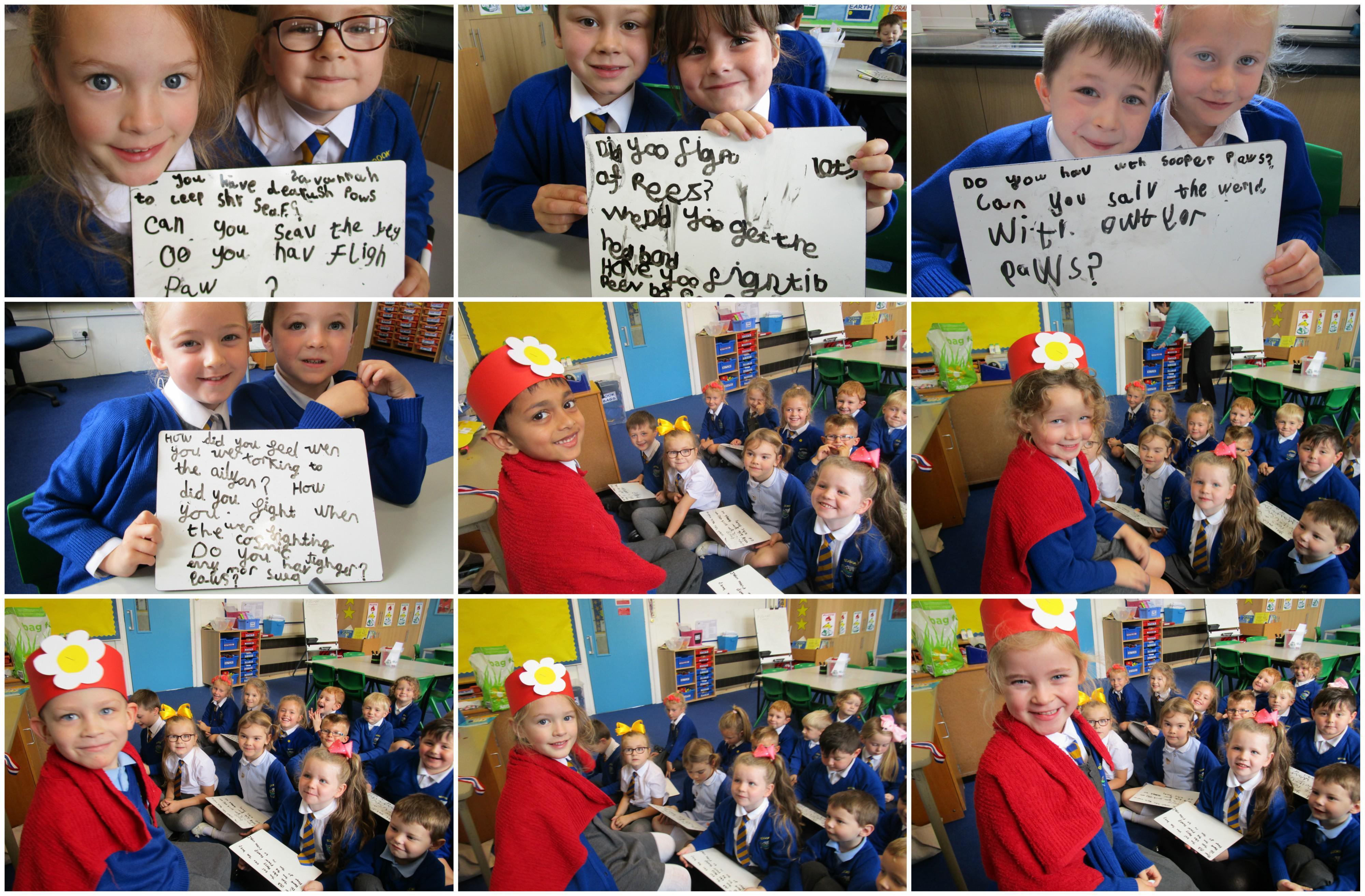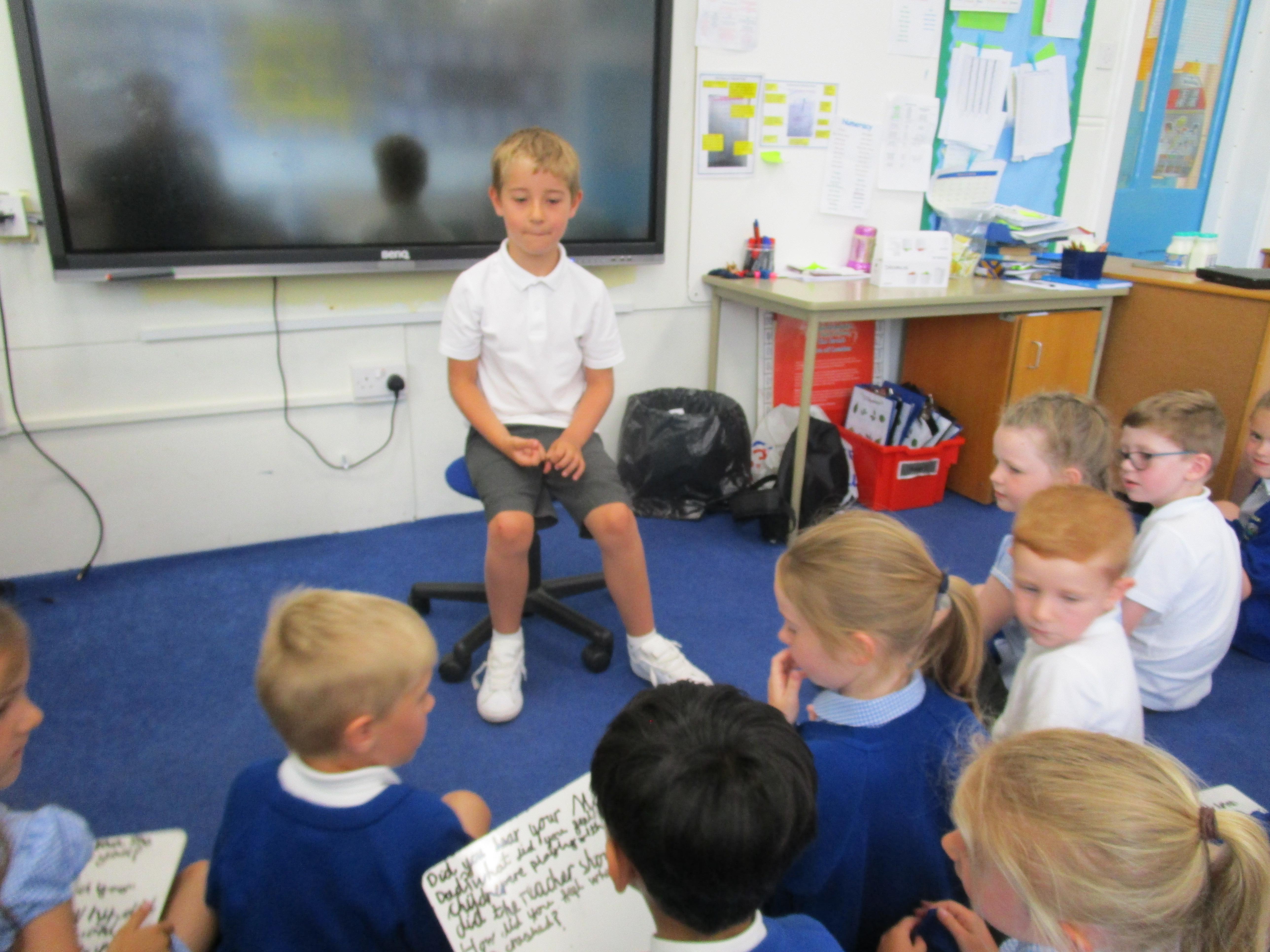 Today in class we have been reading ‘Super Daisy And the Peril of Planet Pea’. In pairs the children had to write questions that they would like to ask Super Daisy. Then some of the children sat in the hot seat and answered the questions in role as Super Daisy.