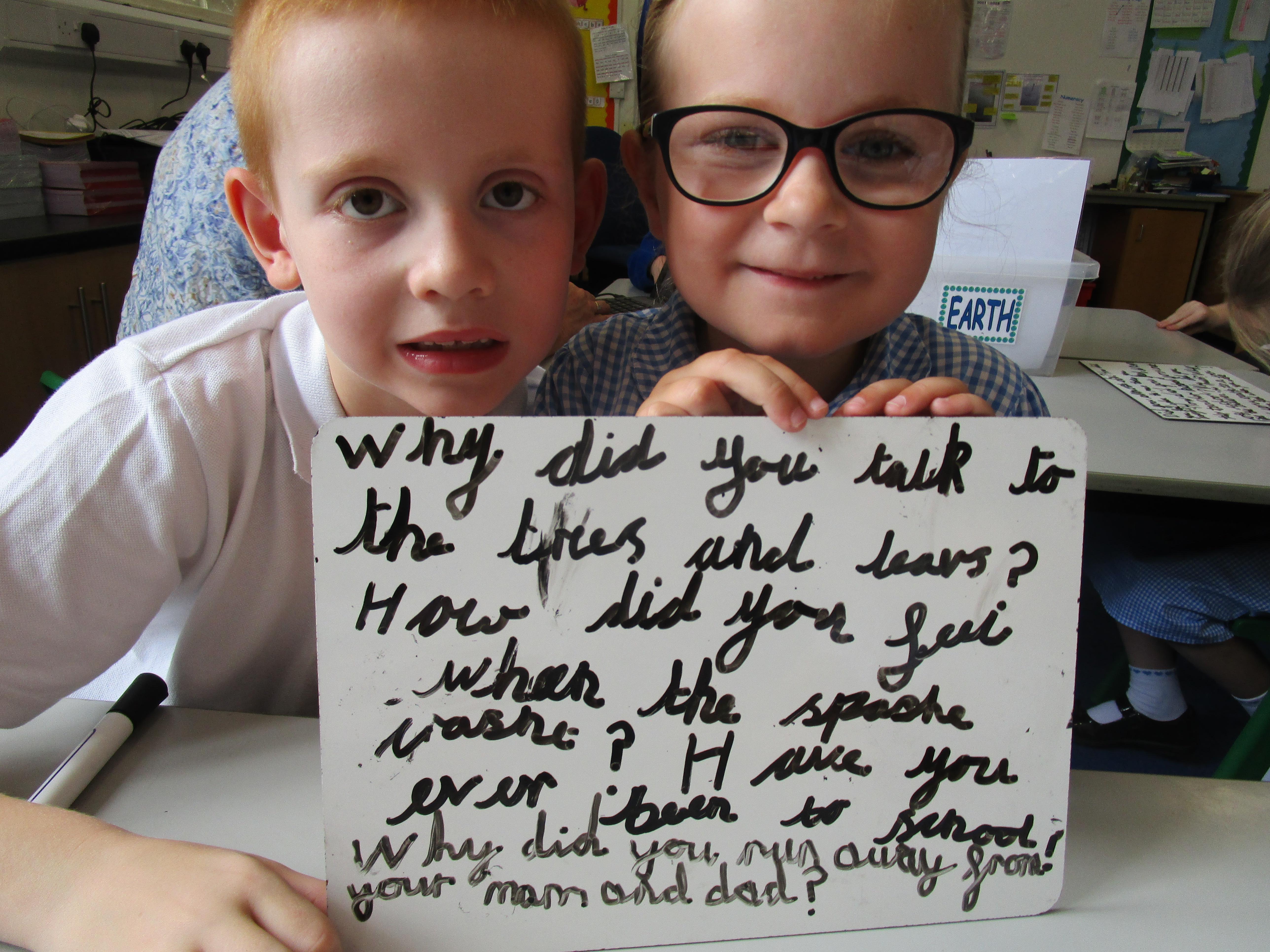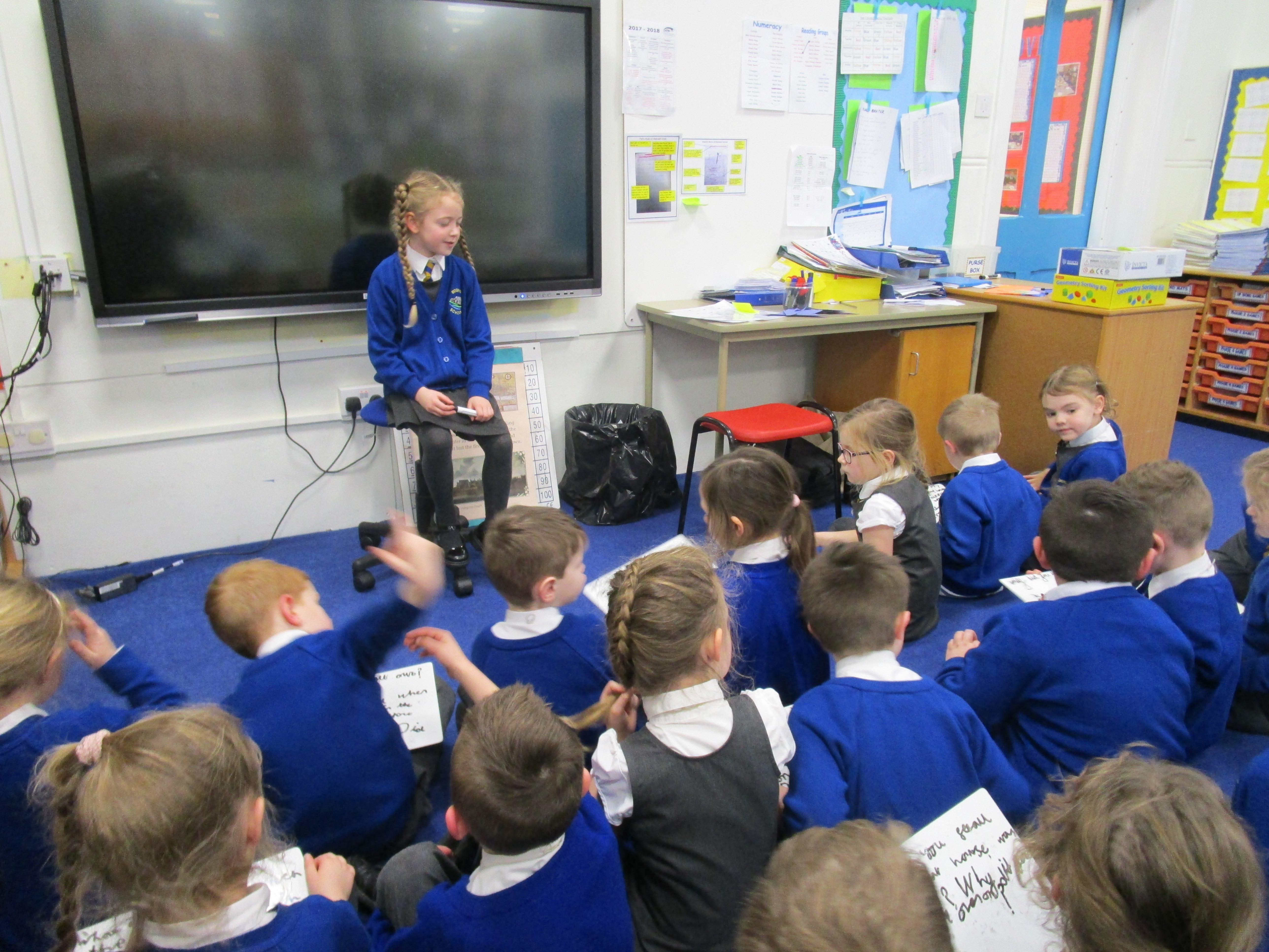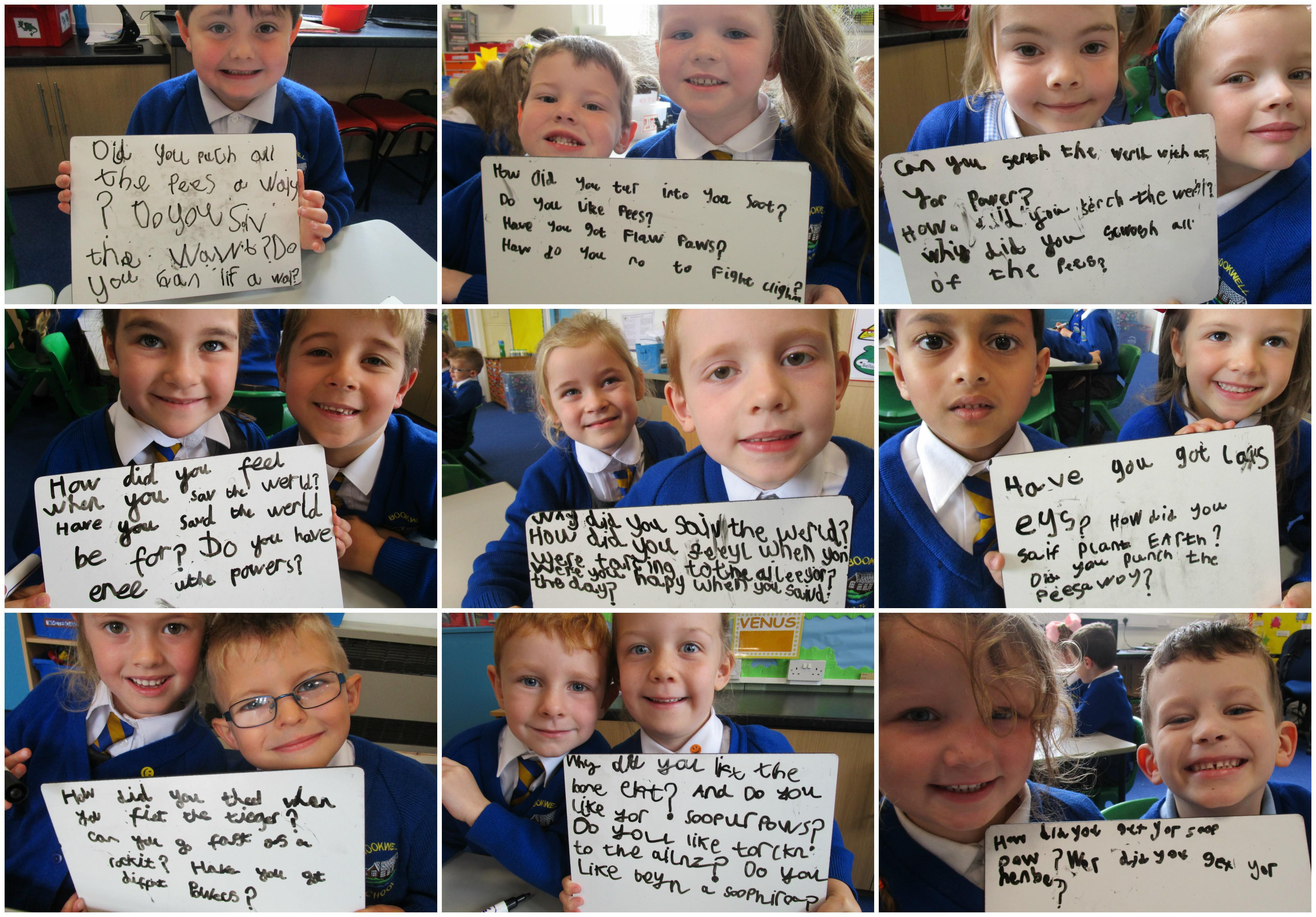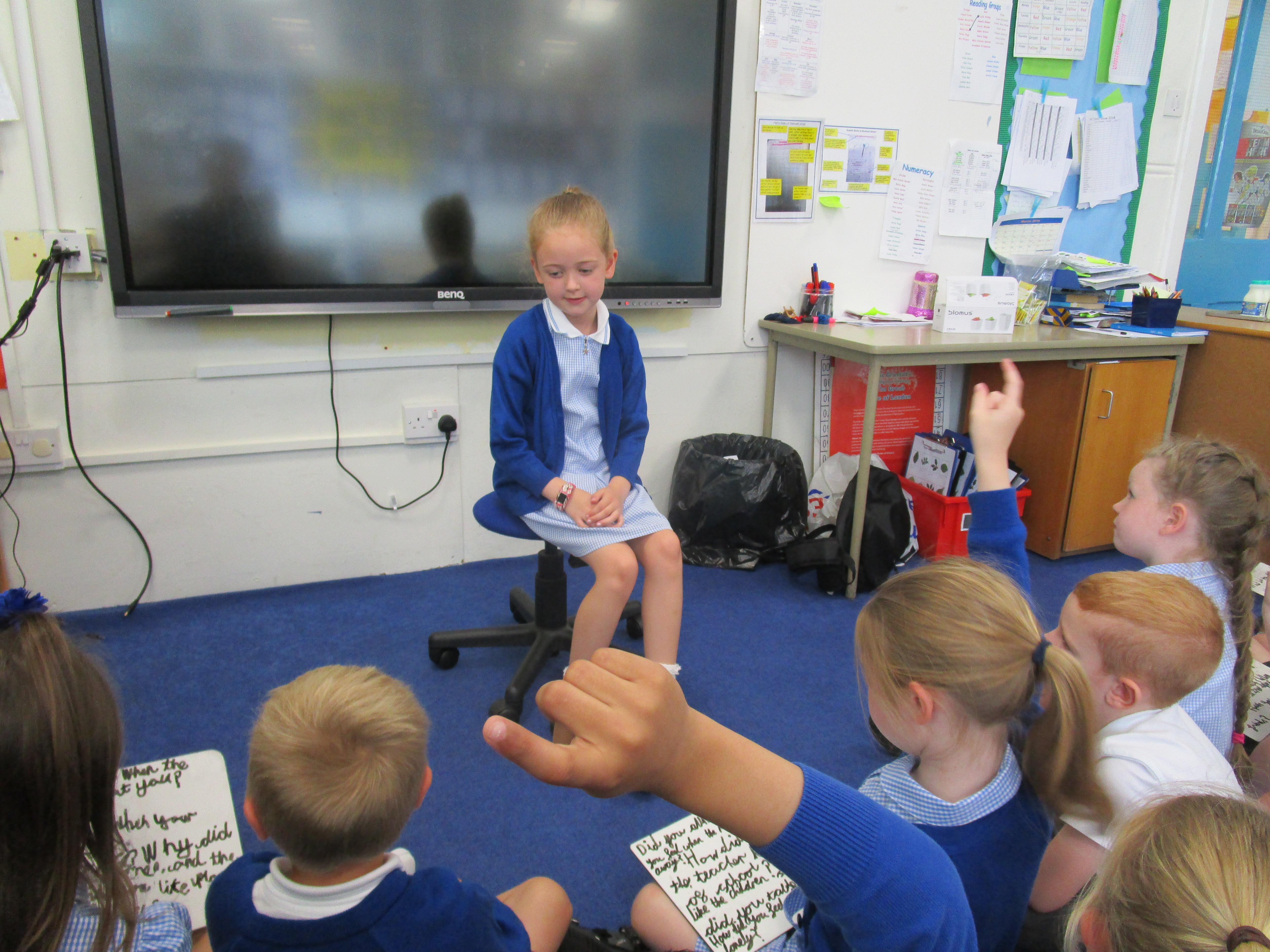 Today in class we have been reading ‘Super Daisy And the Peril of Planet Pea’. In pairs the children had to write questions that they would like to ask Super Daisy. Then some of the children sat in the hot seat and answered the questions in role as Super Daisy.