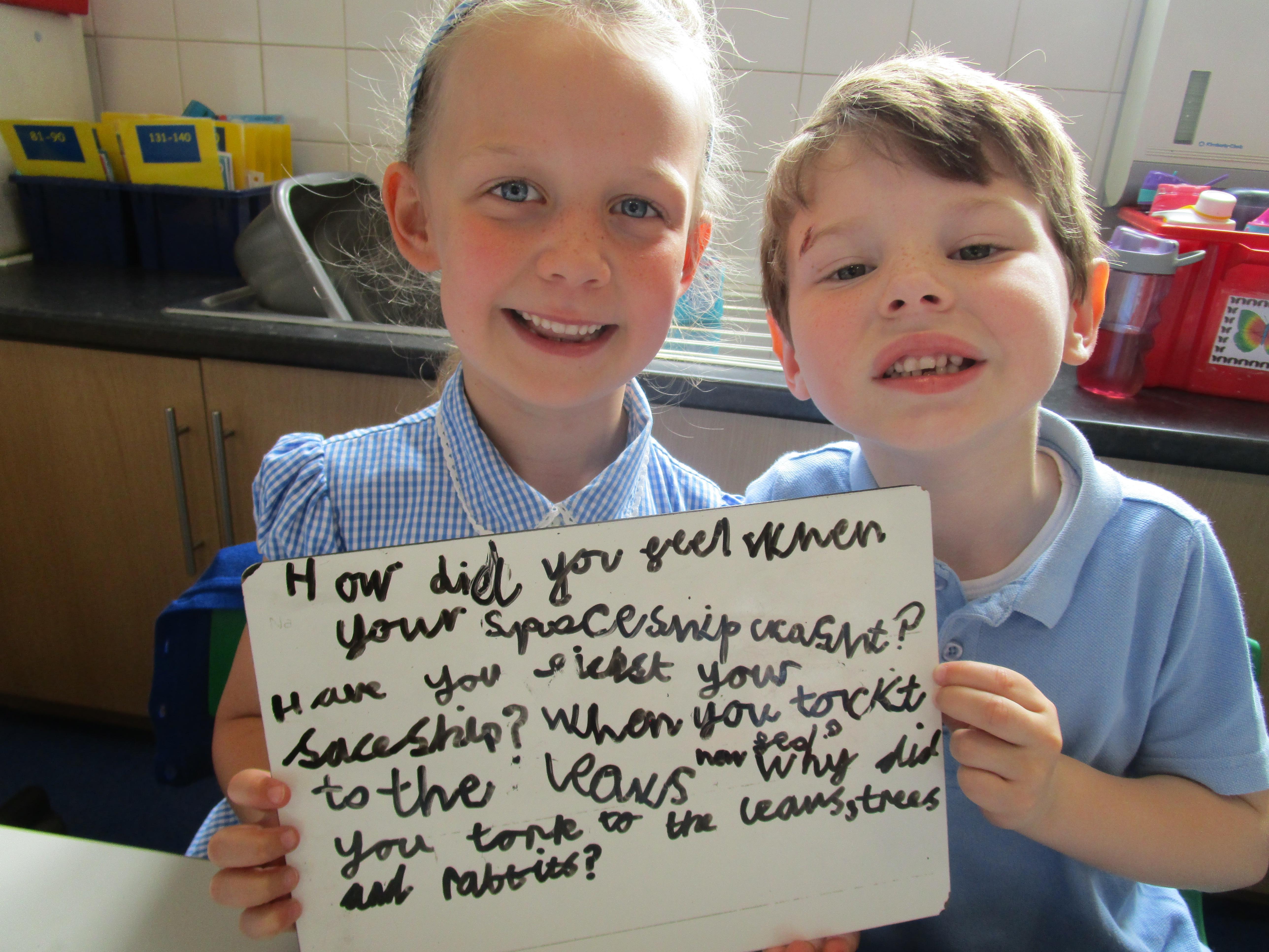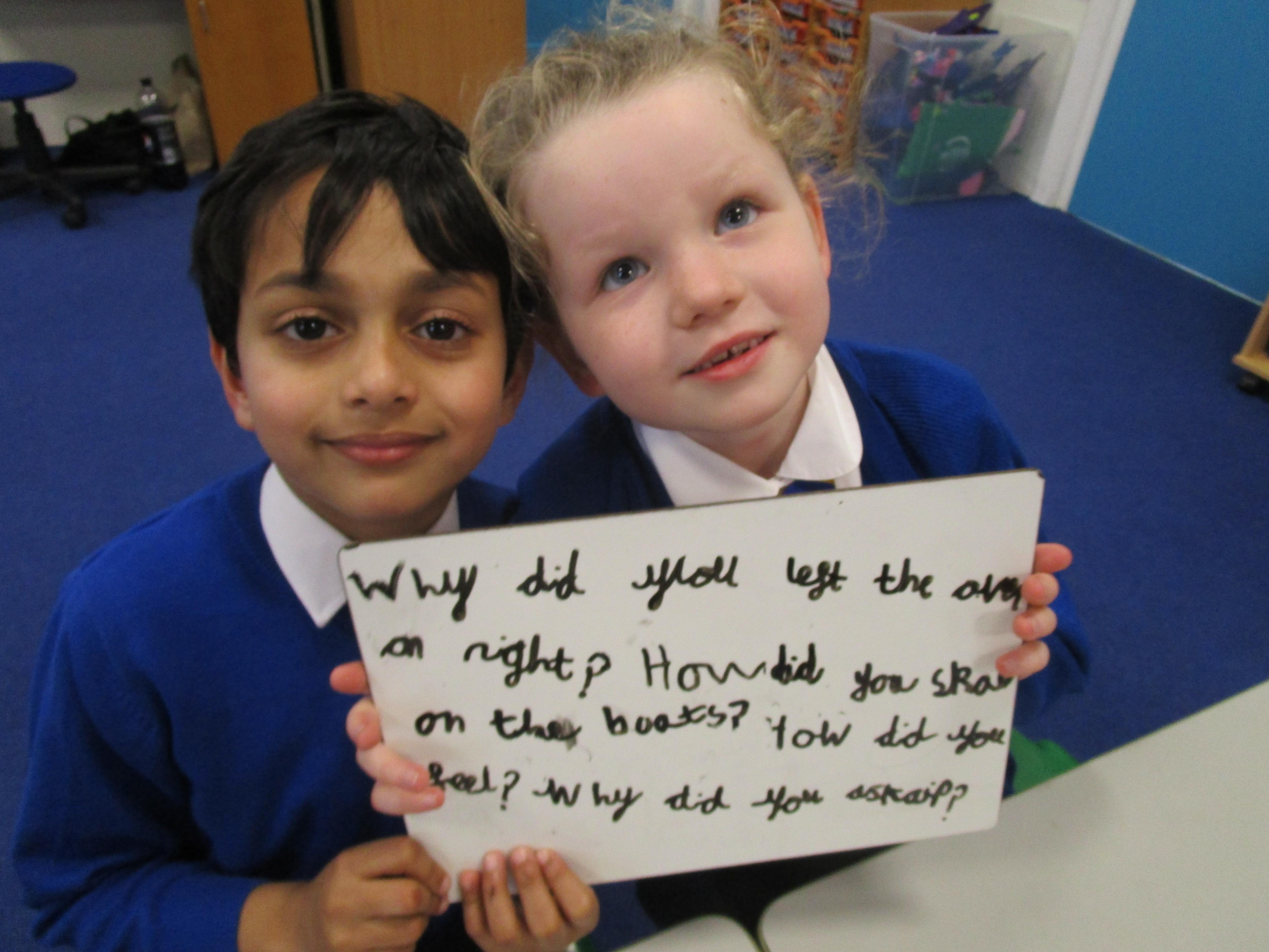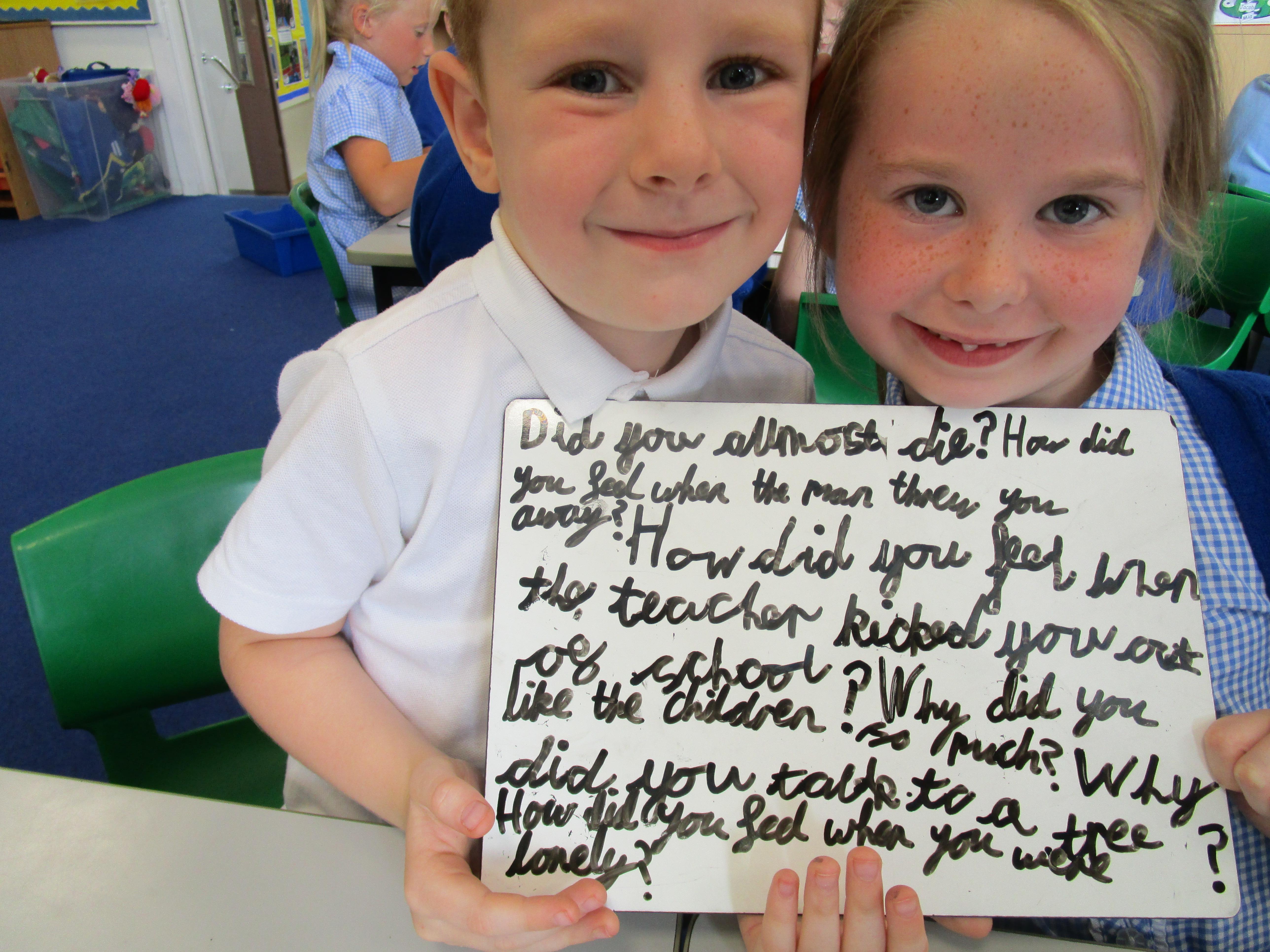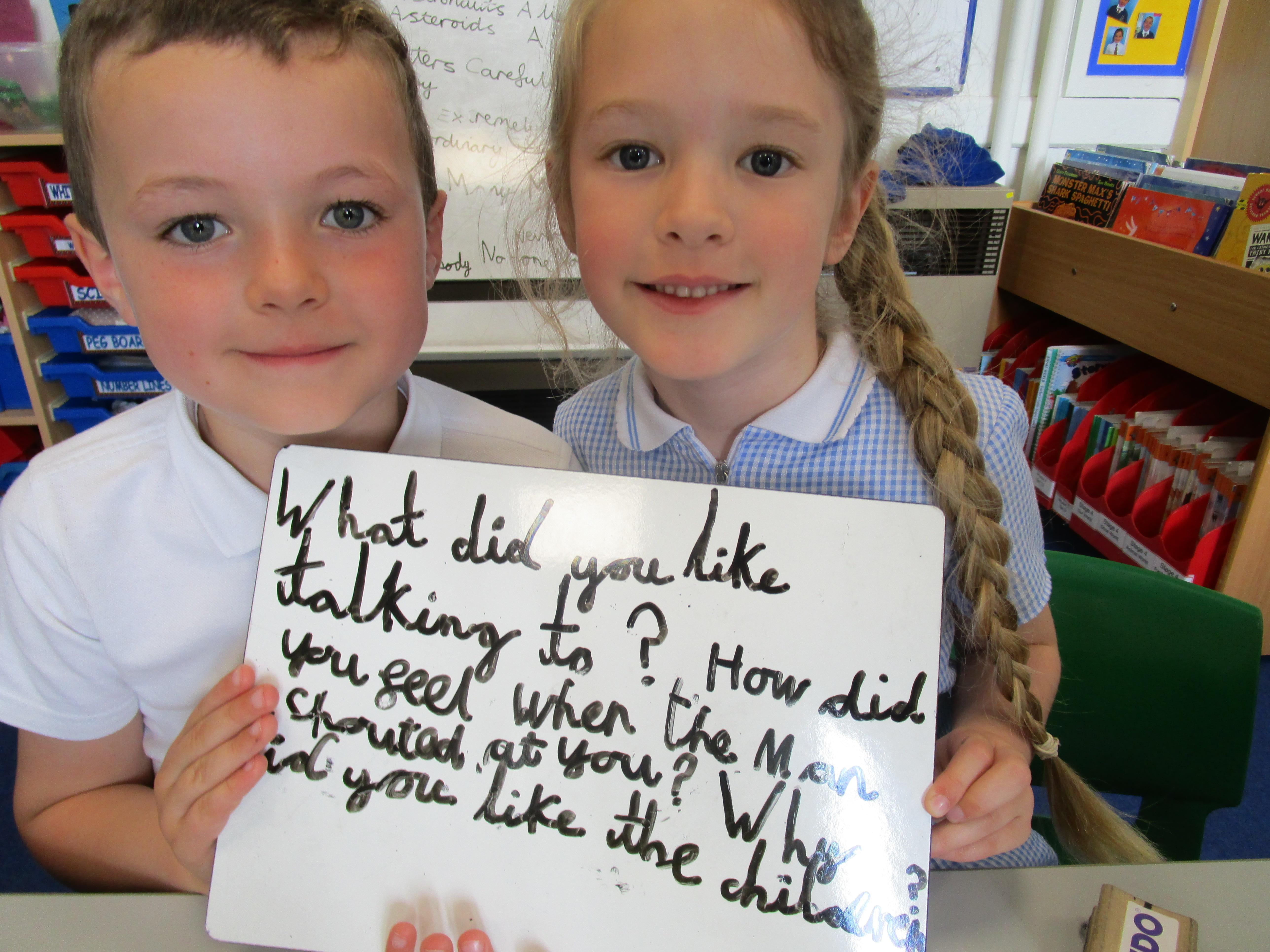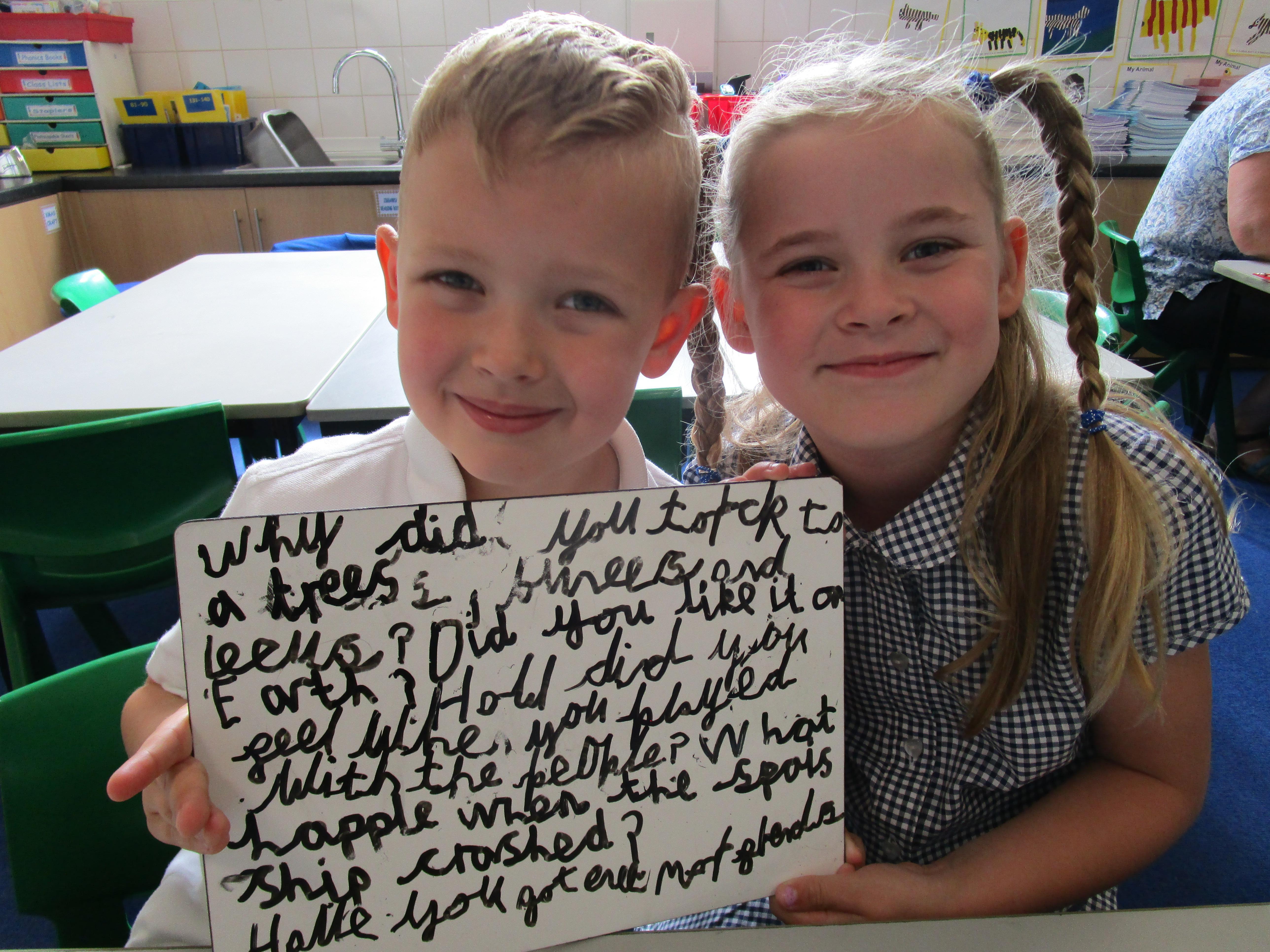 Today in class we have been reading ‘Super Daisy And the Peril of Planet Pea’. In pairs the children had to write questions that they would like to ask Super Daisy. Then some of the children sat in the hot seat and answered the questions in role as Super Daisy.