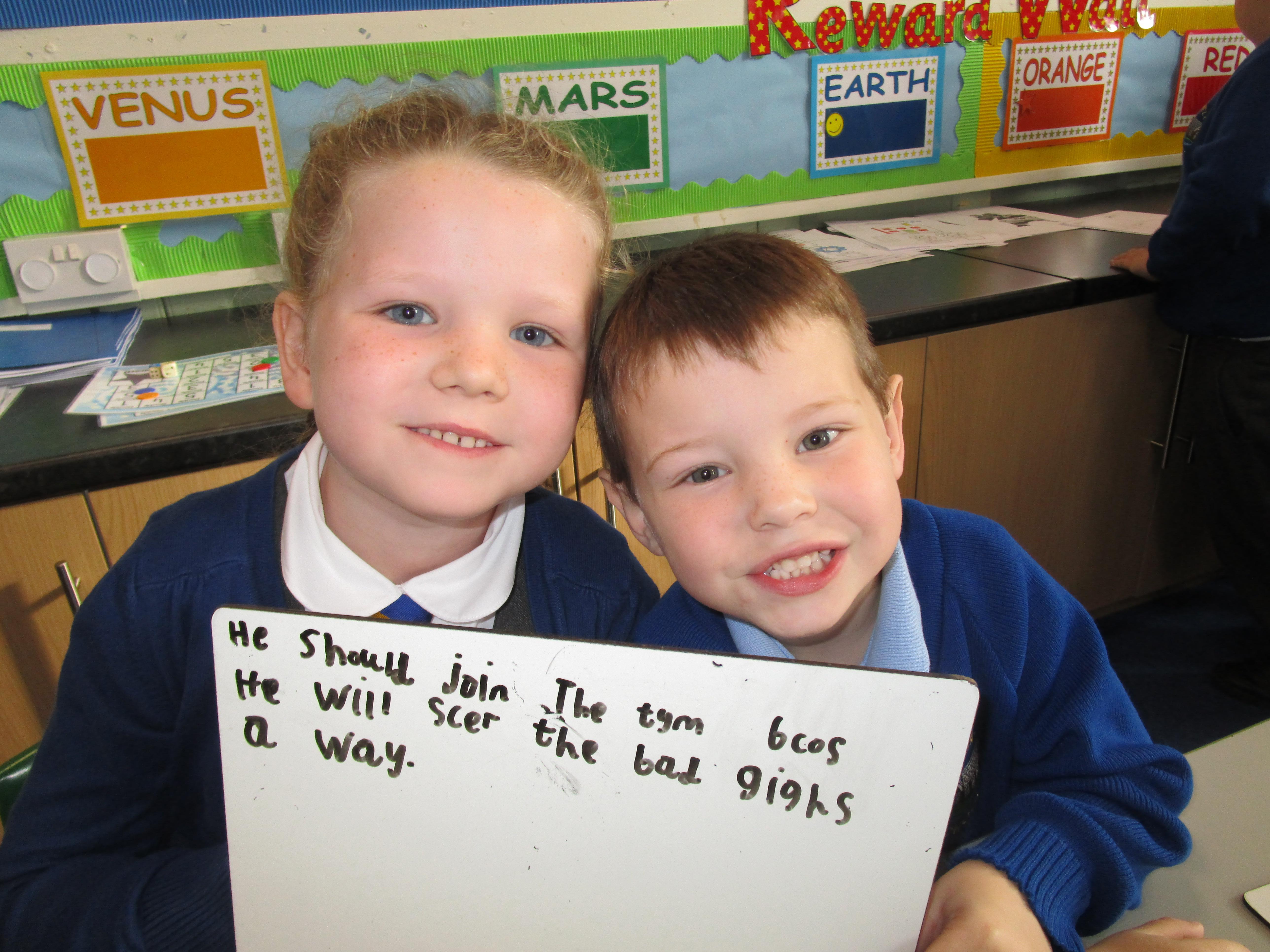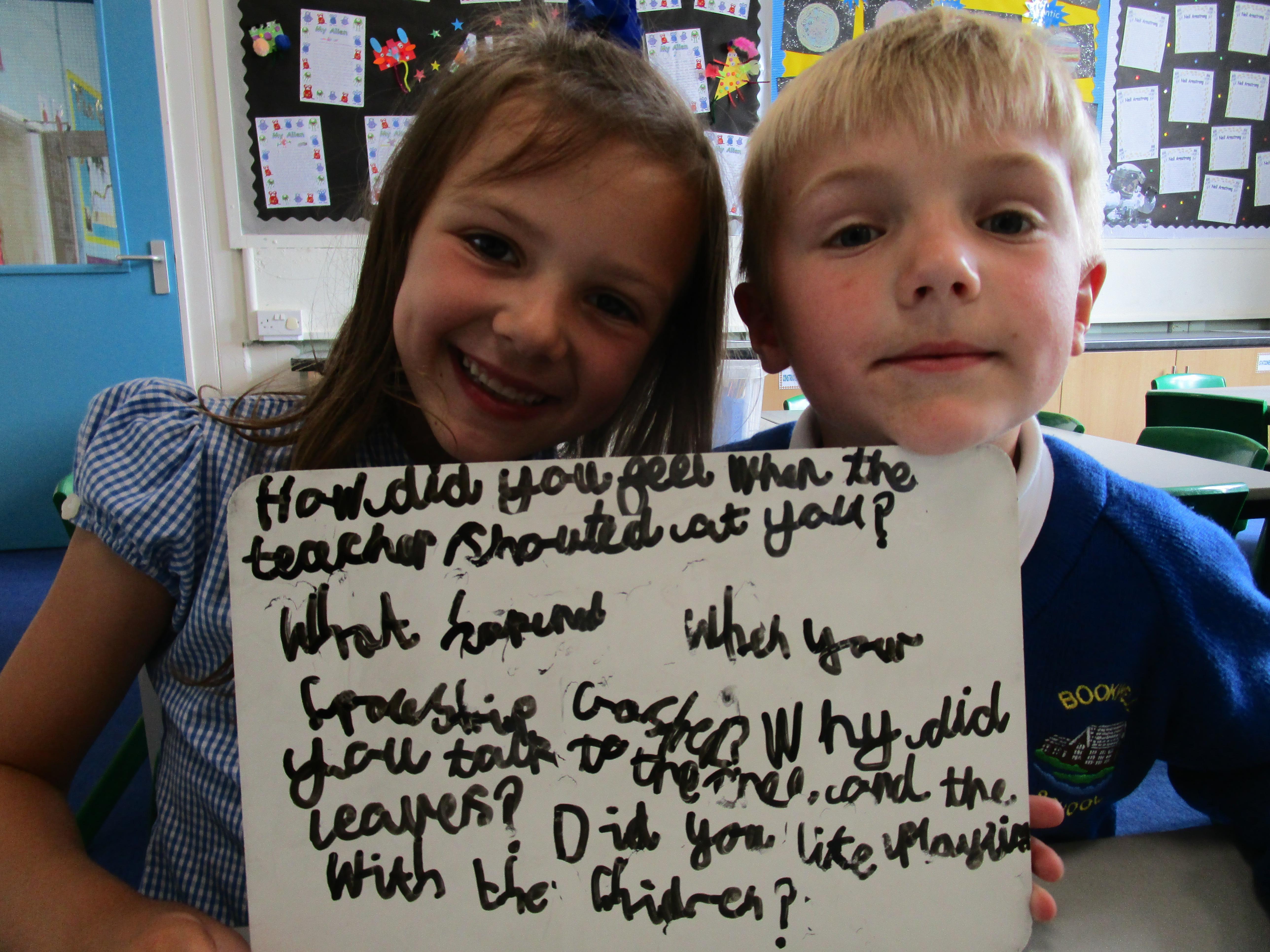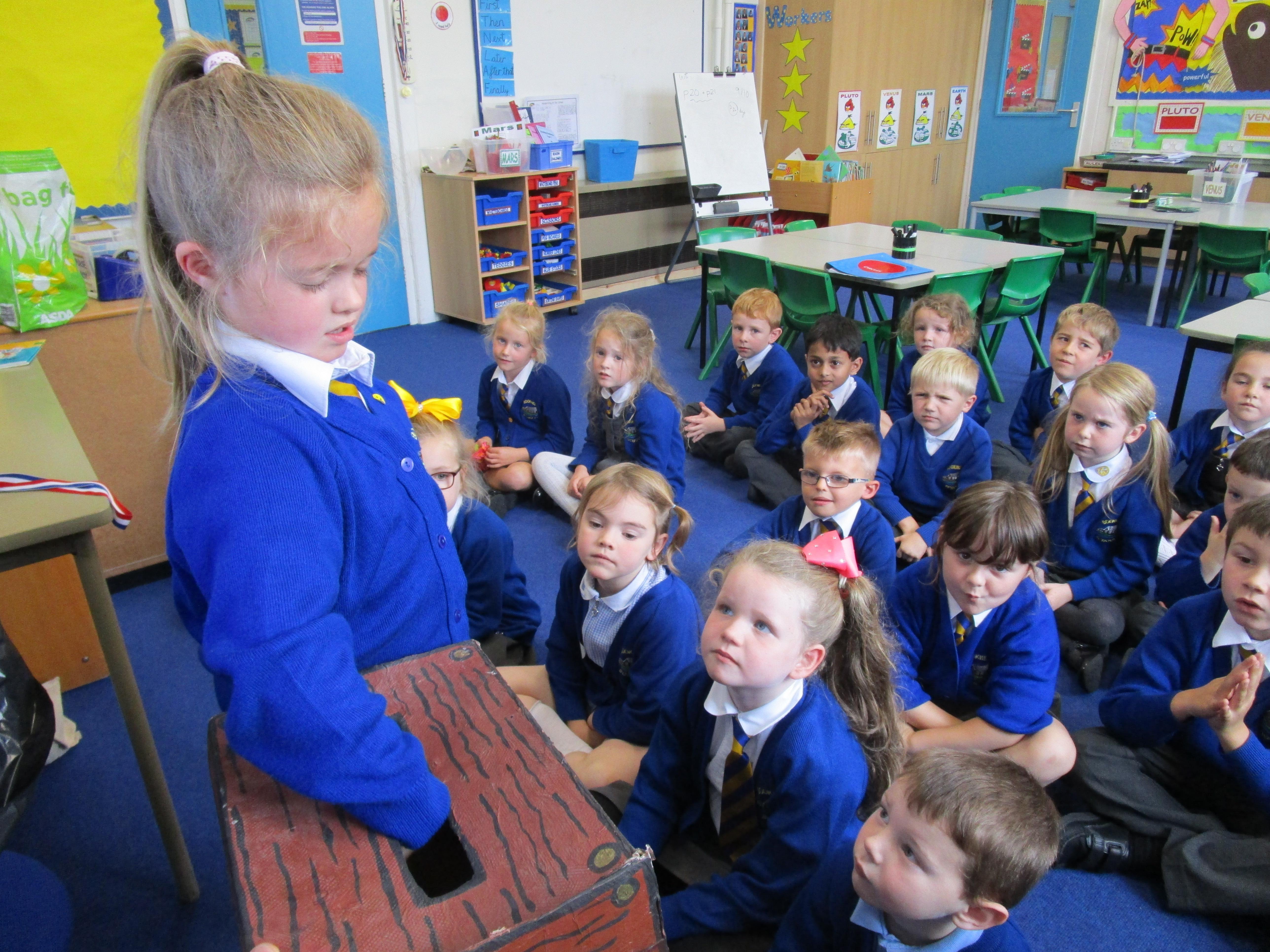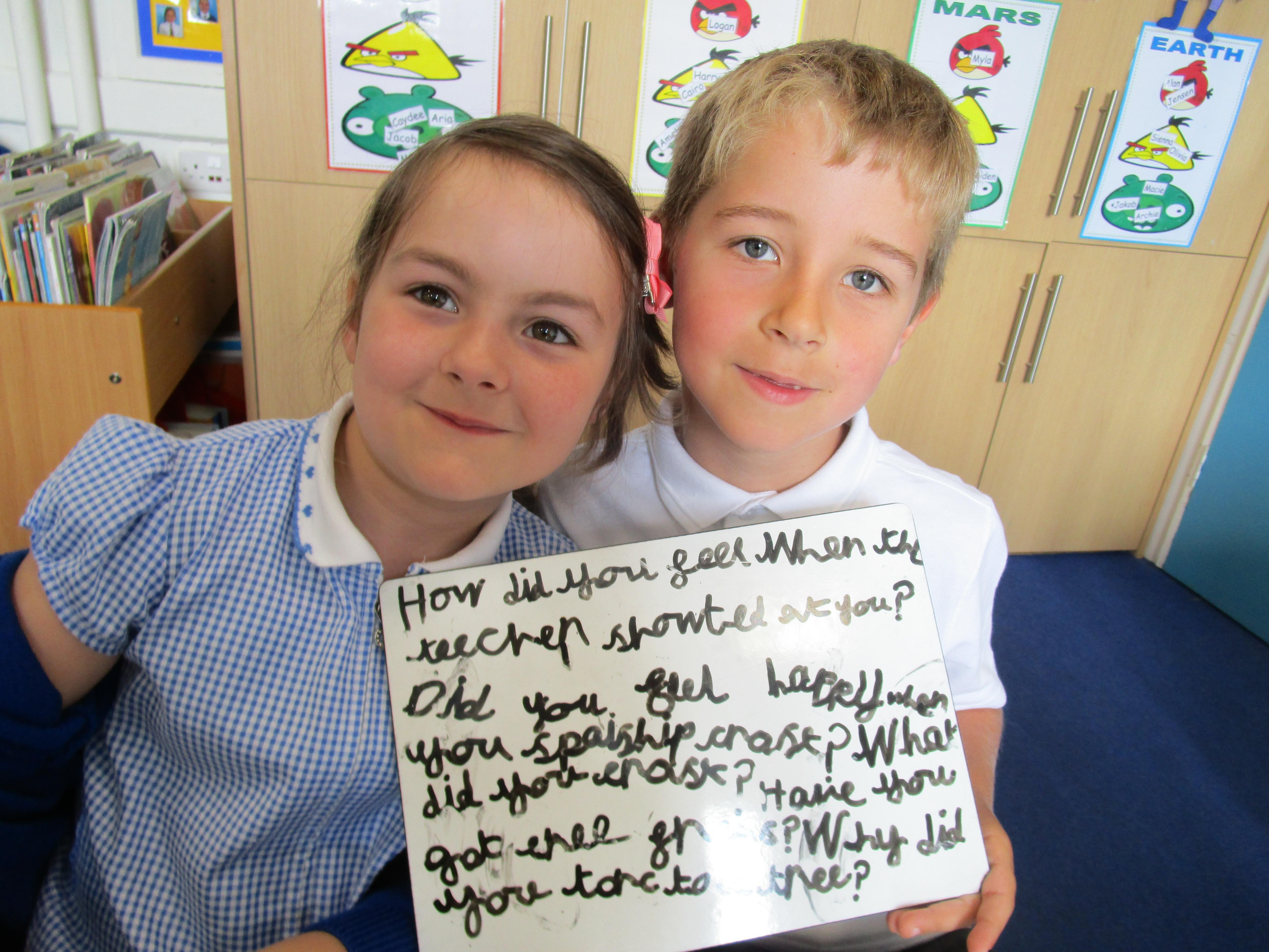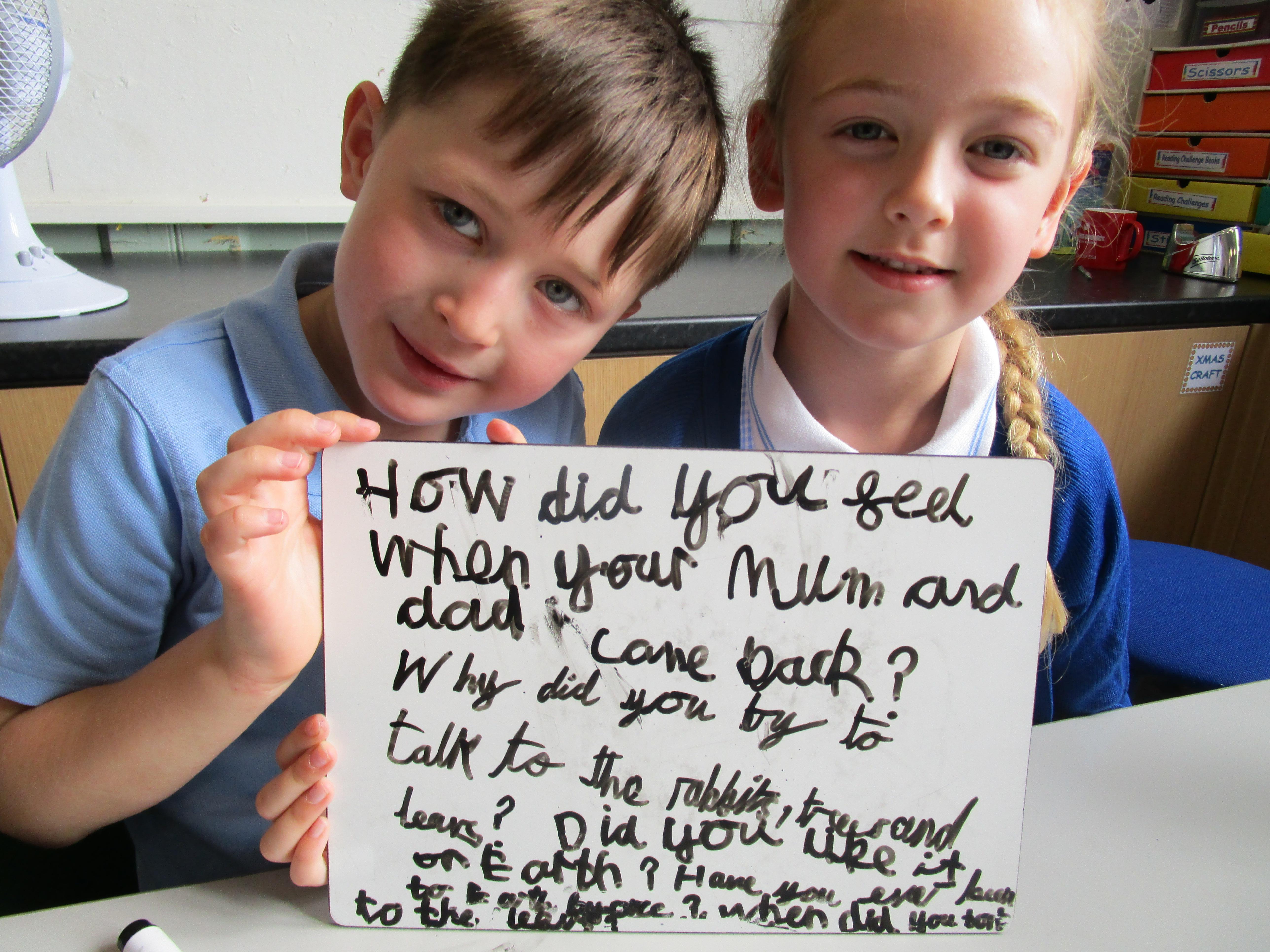 Today in class we have been reading ‘Super Daisy And the Peril of Planet Pea’. In pairs the children had to write questions that they would like to ask Super Daisy. Then some of the children sat in the hot seat and answered the questions in role as Super Daisy.