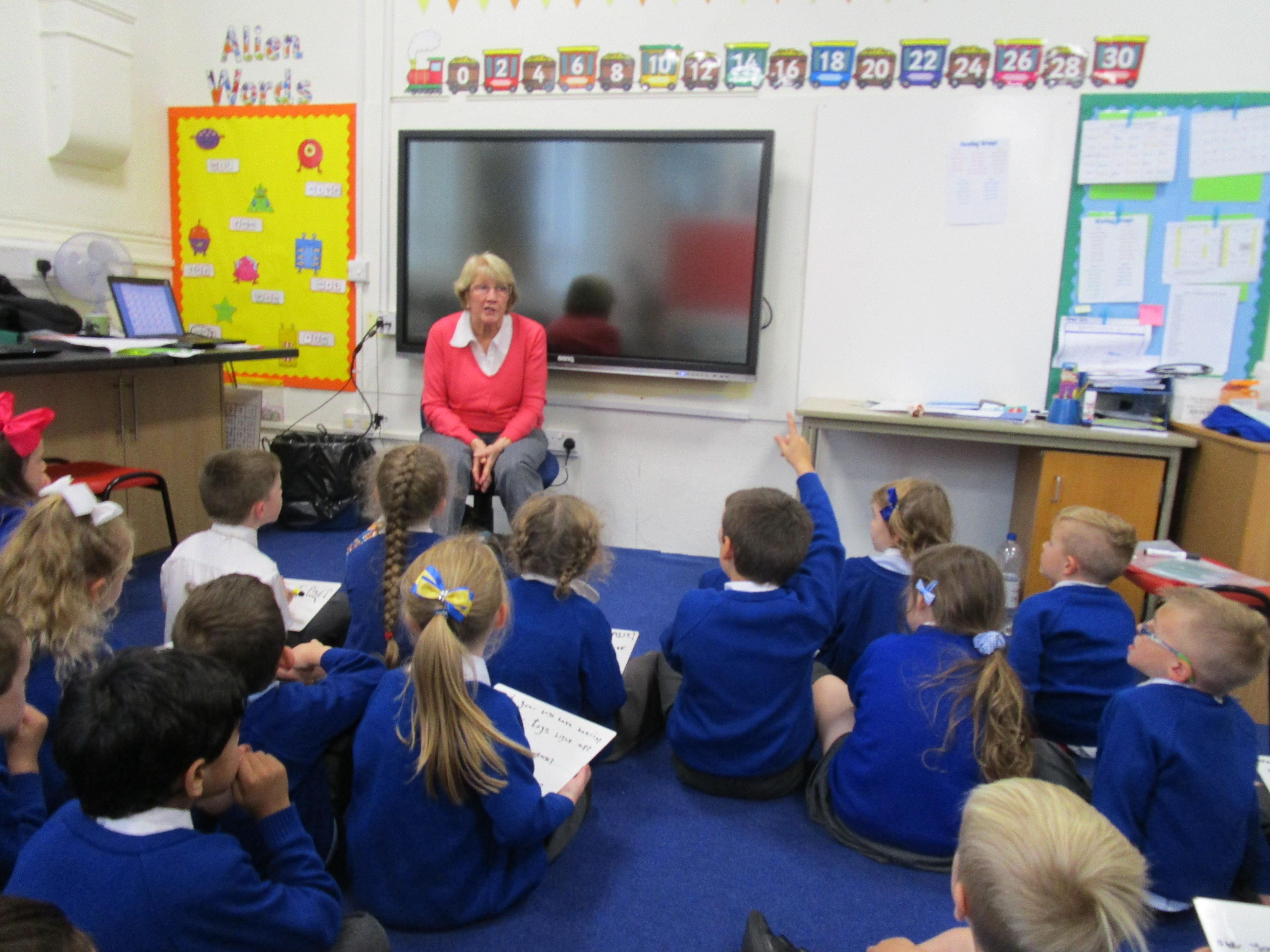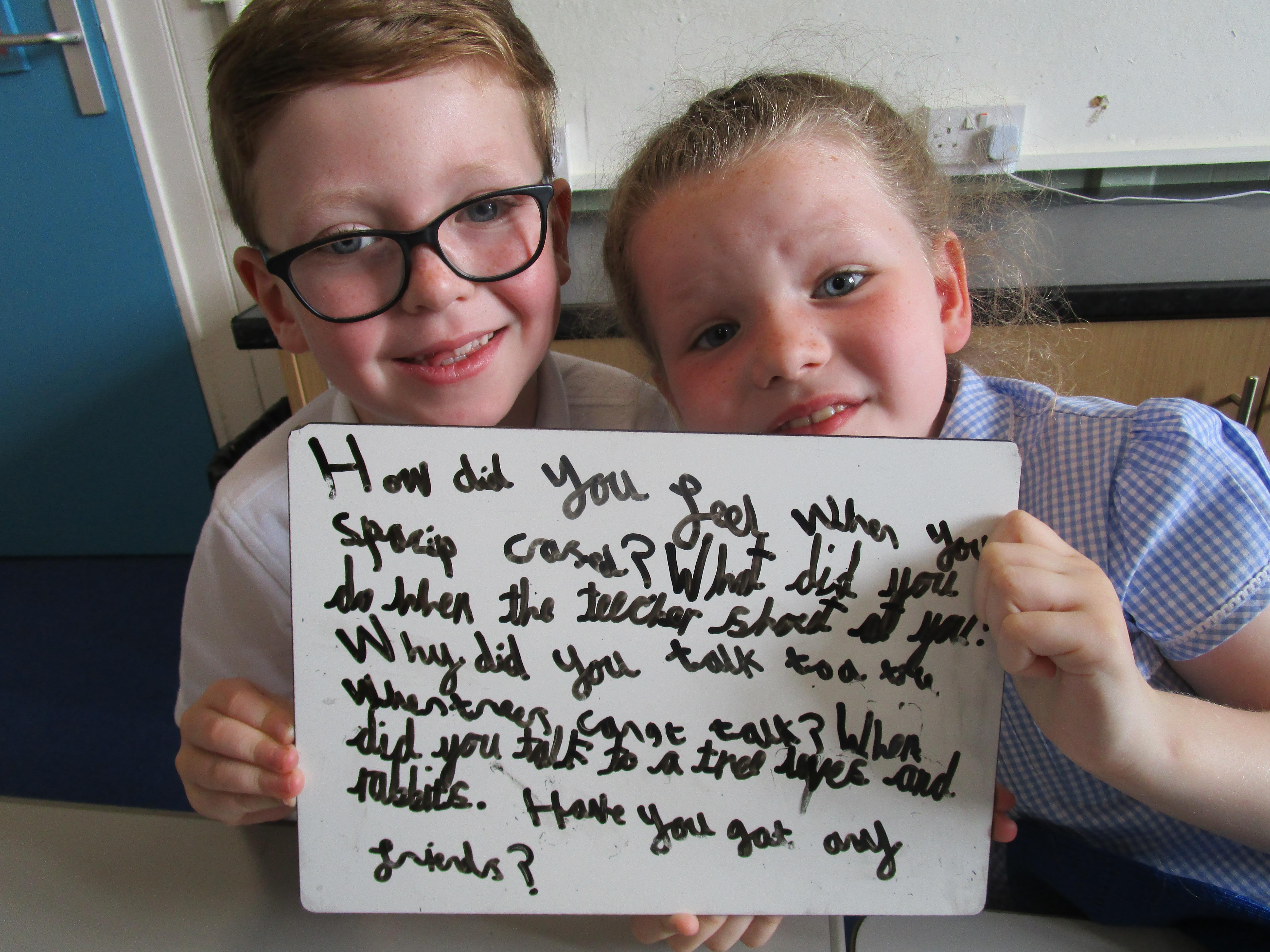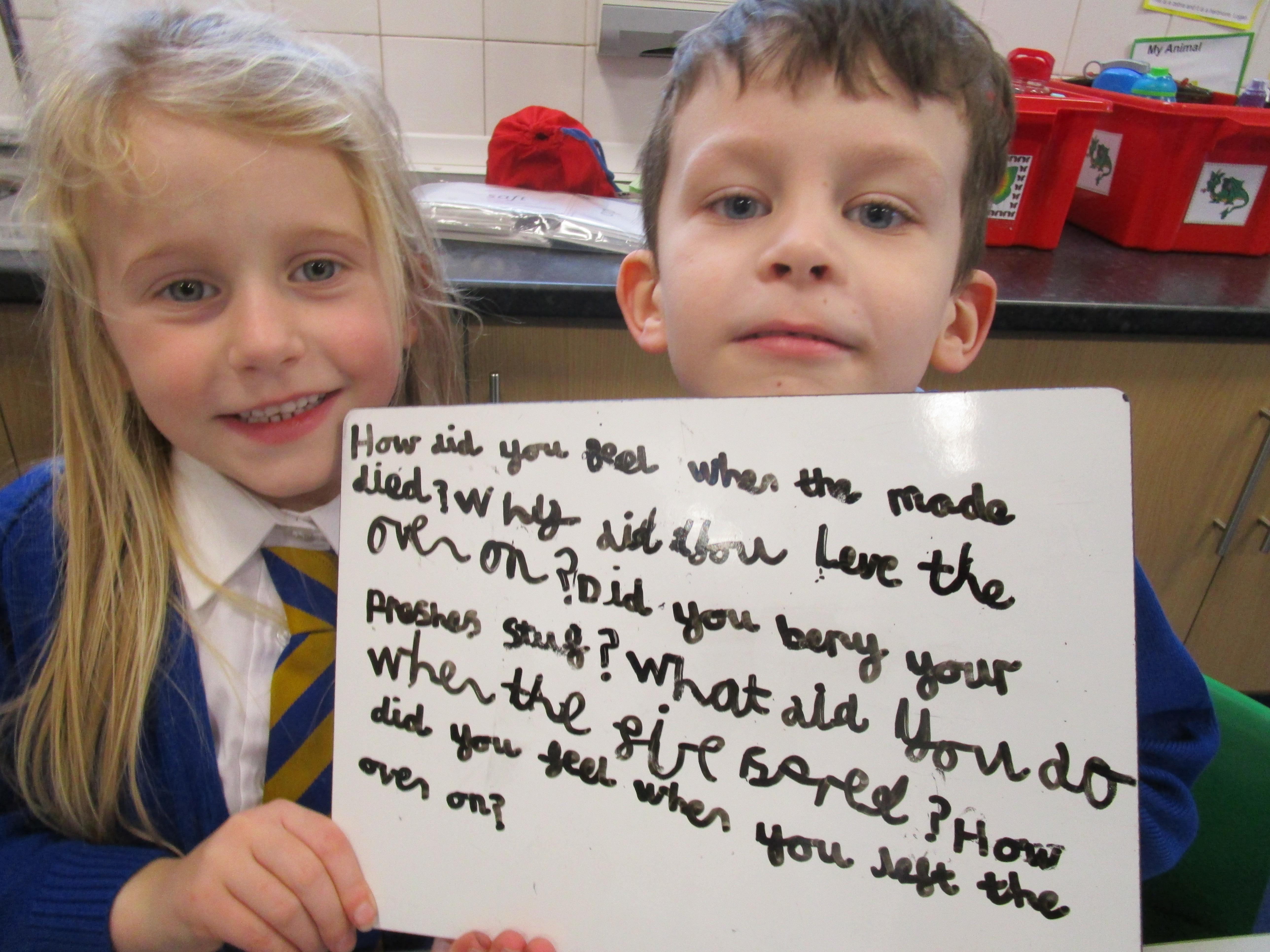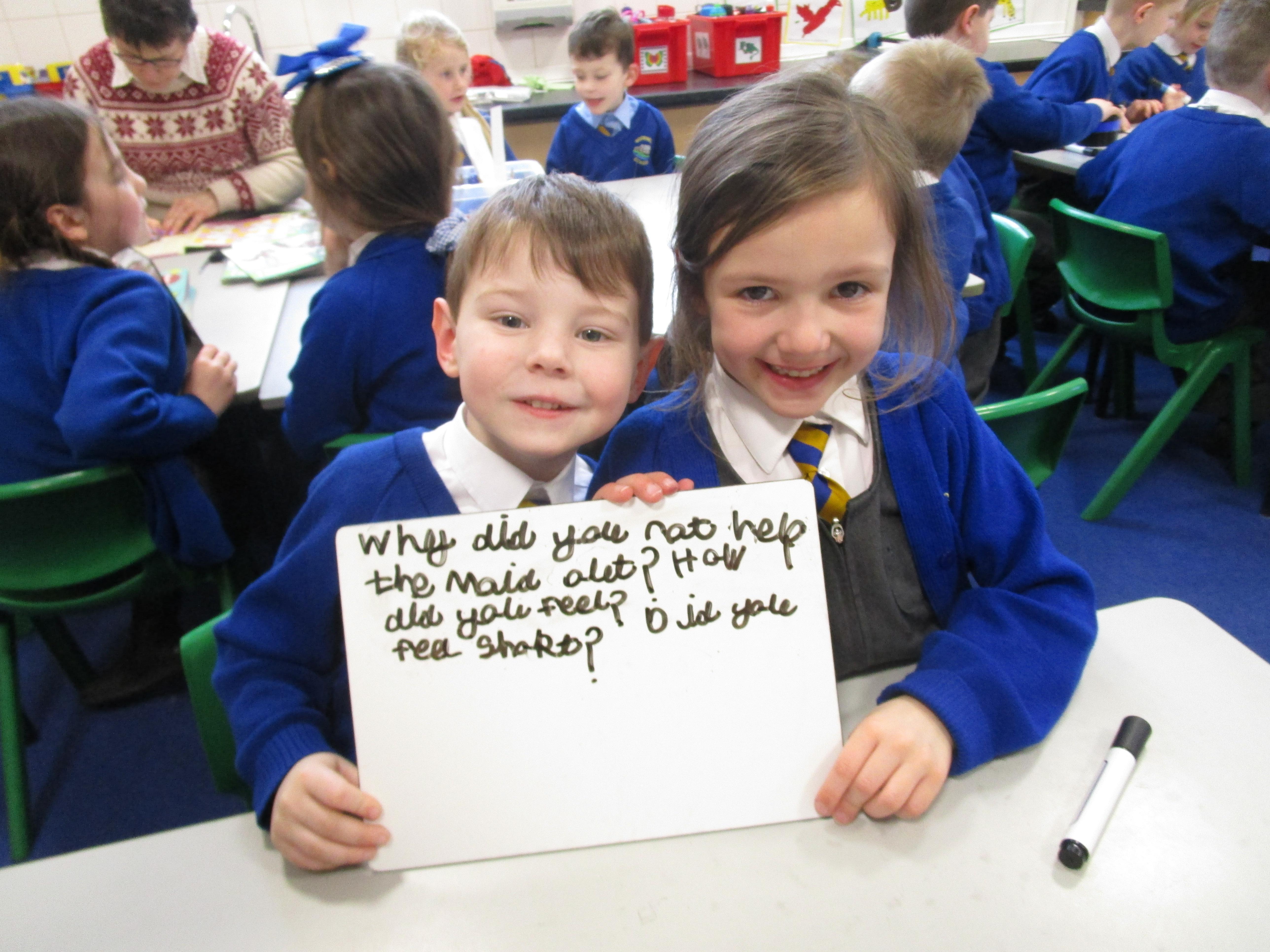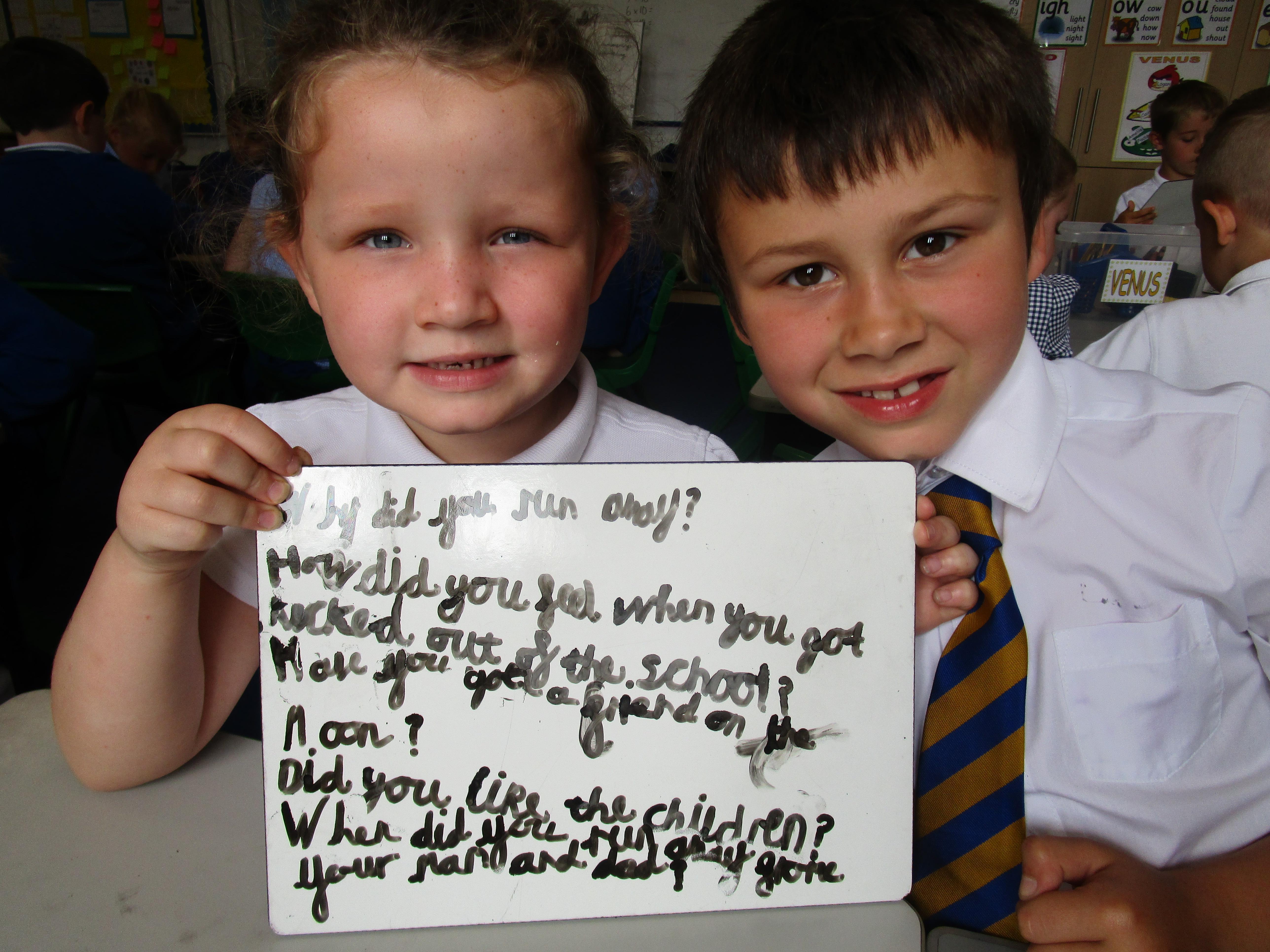 Today in class we have been reading ‘Super Daisy And the Peril of Planet Pea’. In pairs the children had to write questions that they would like to ask Super Daisy. Then some of the children sat in the hot seat and answered the questions in role as Super Daisy.