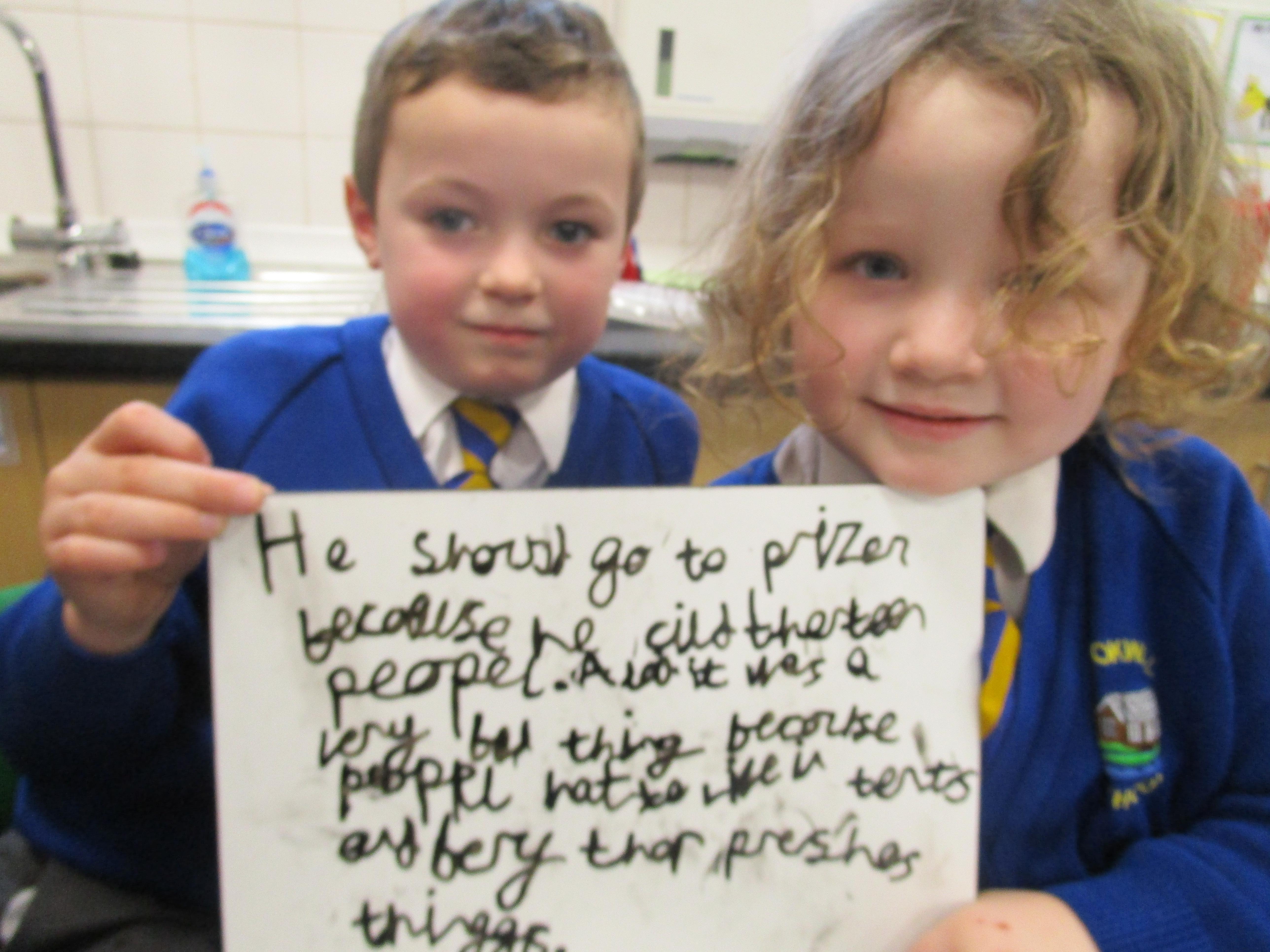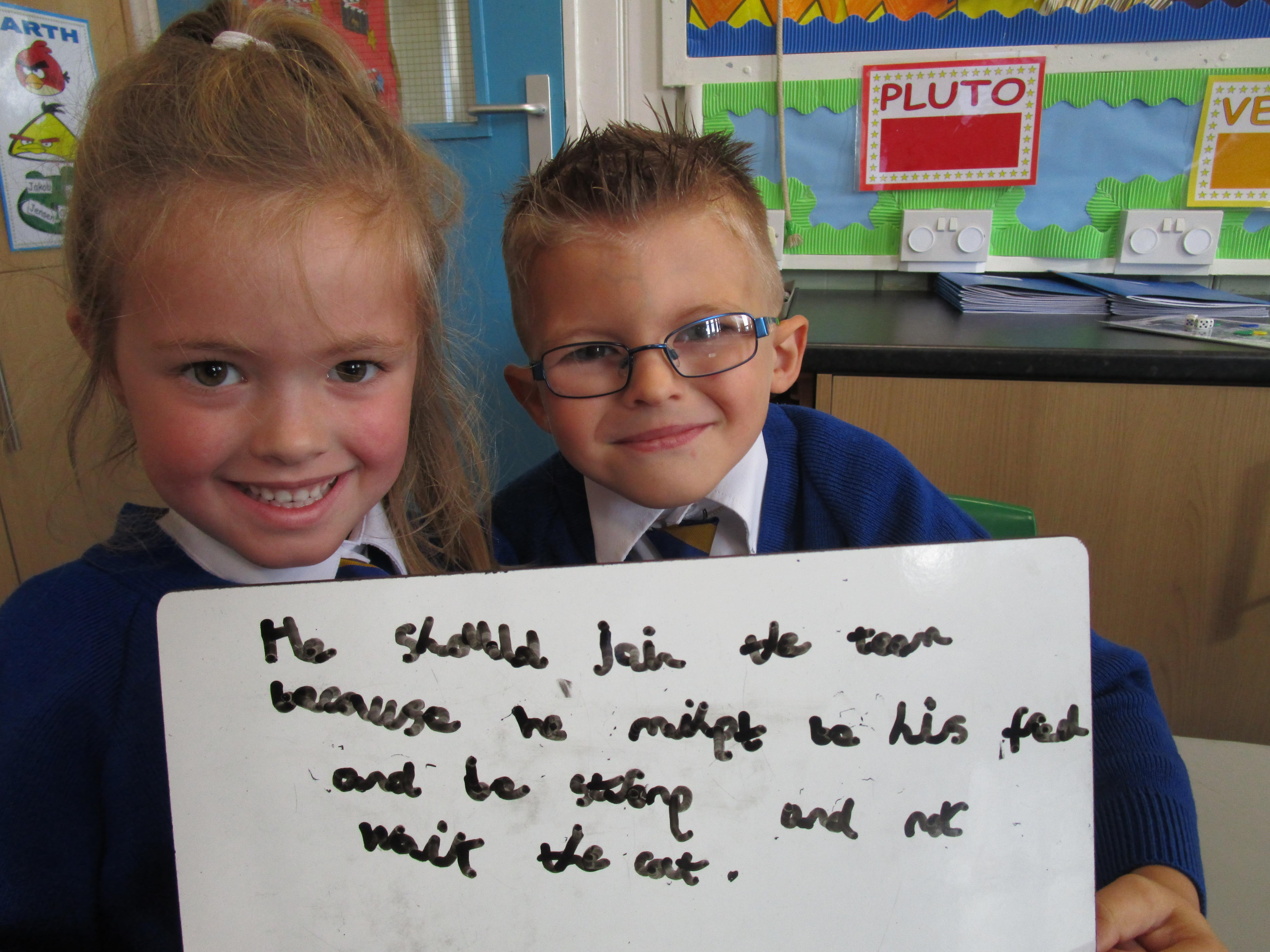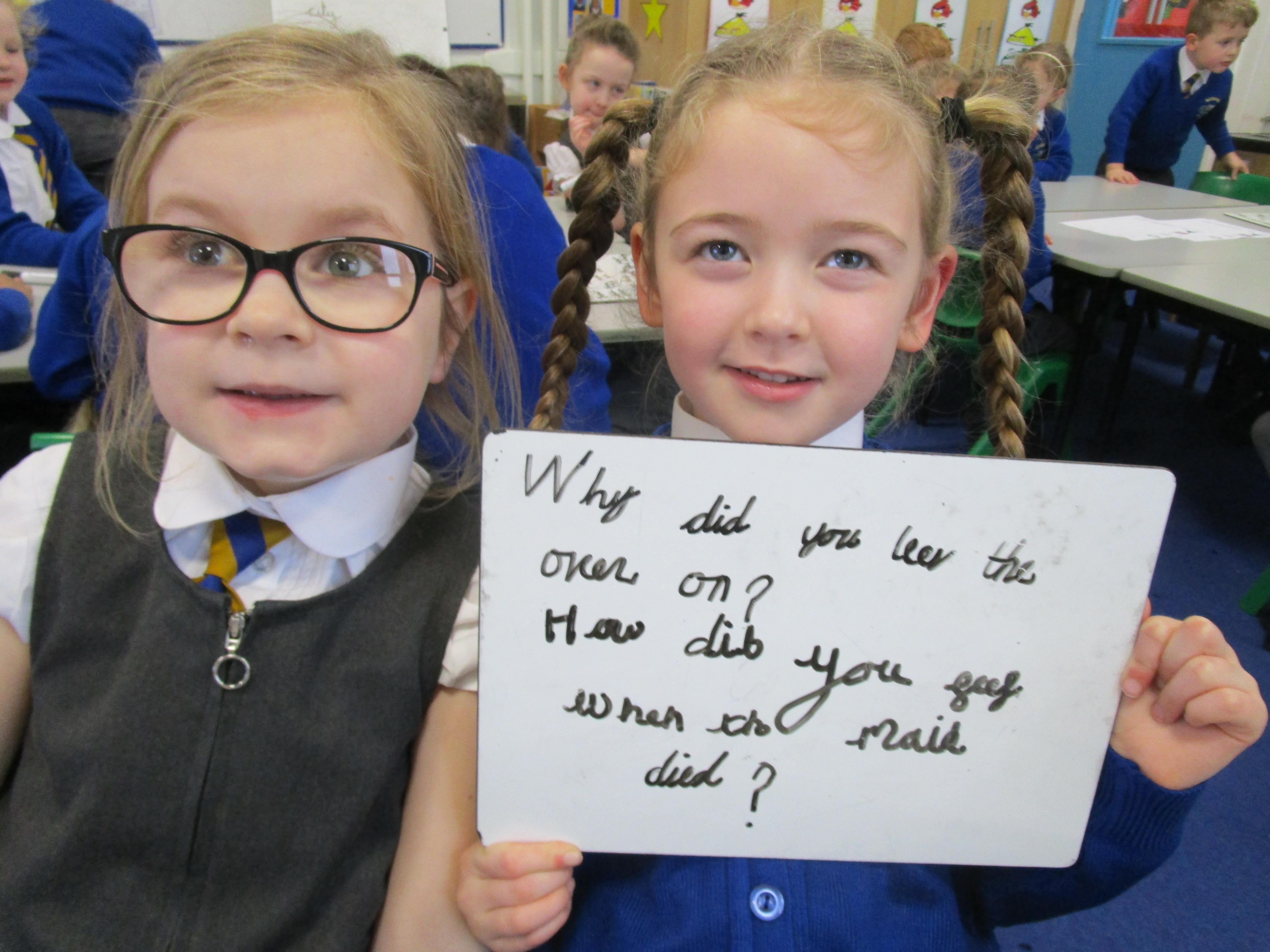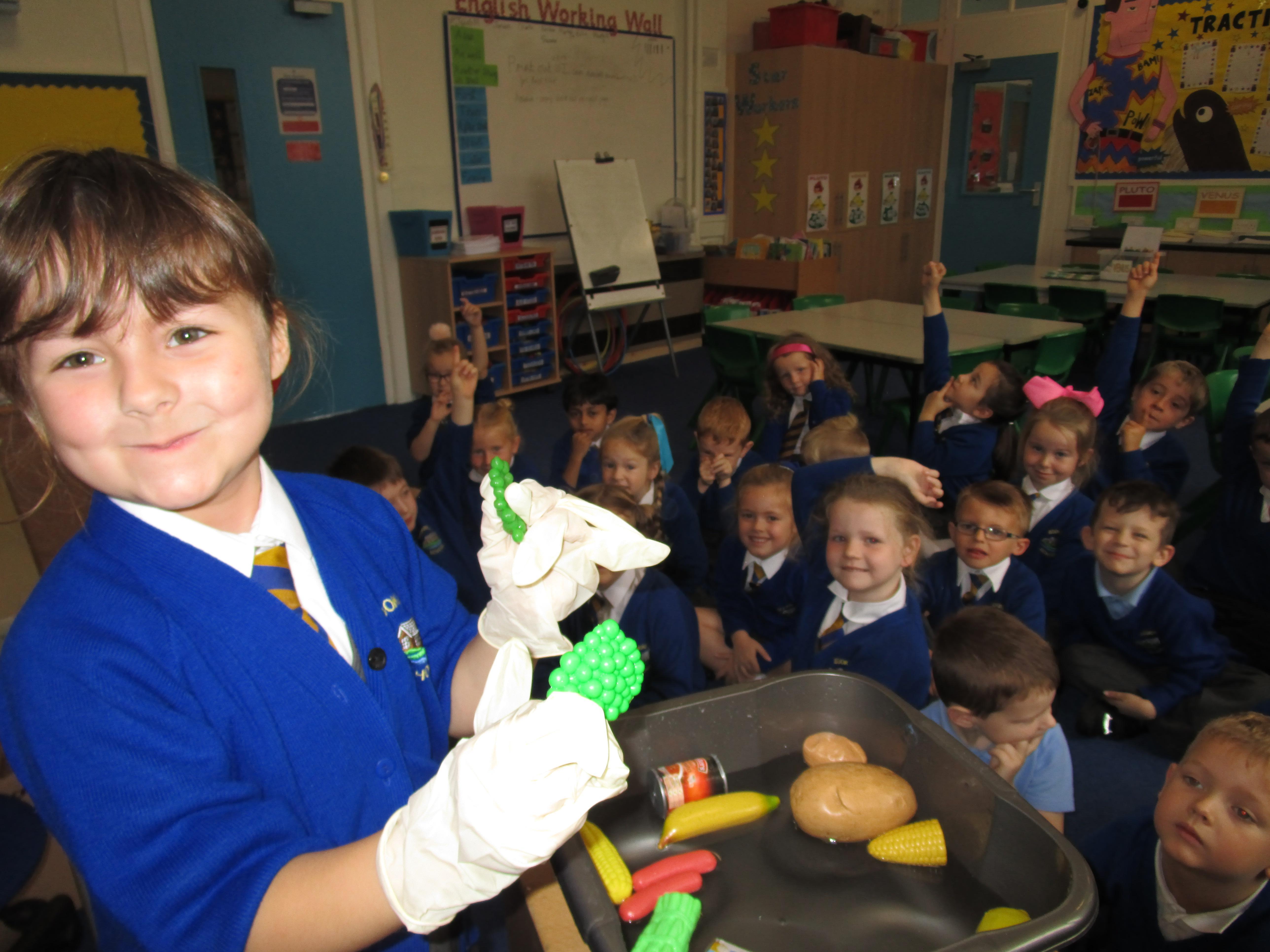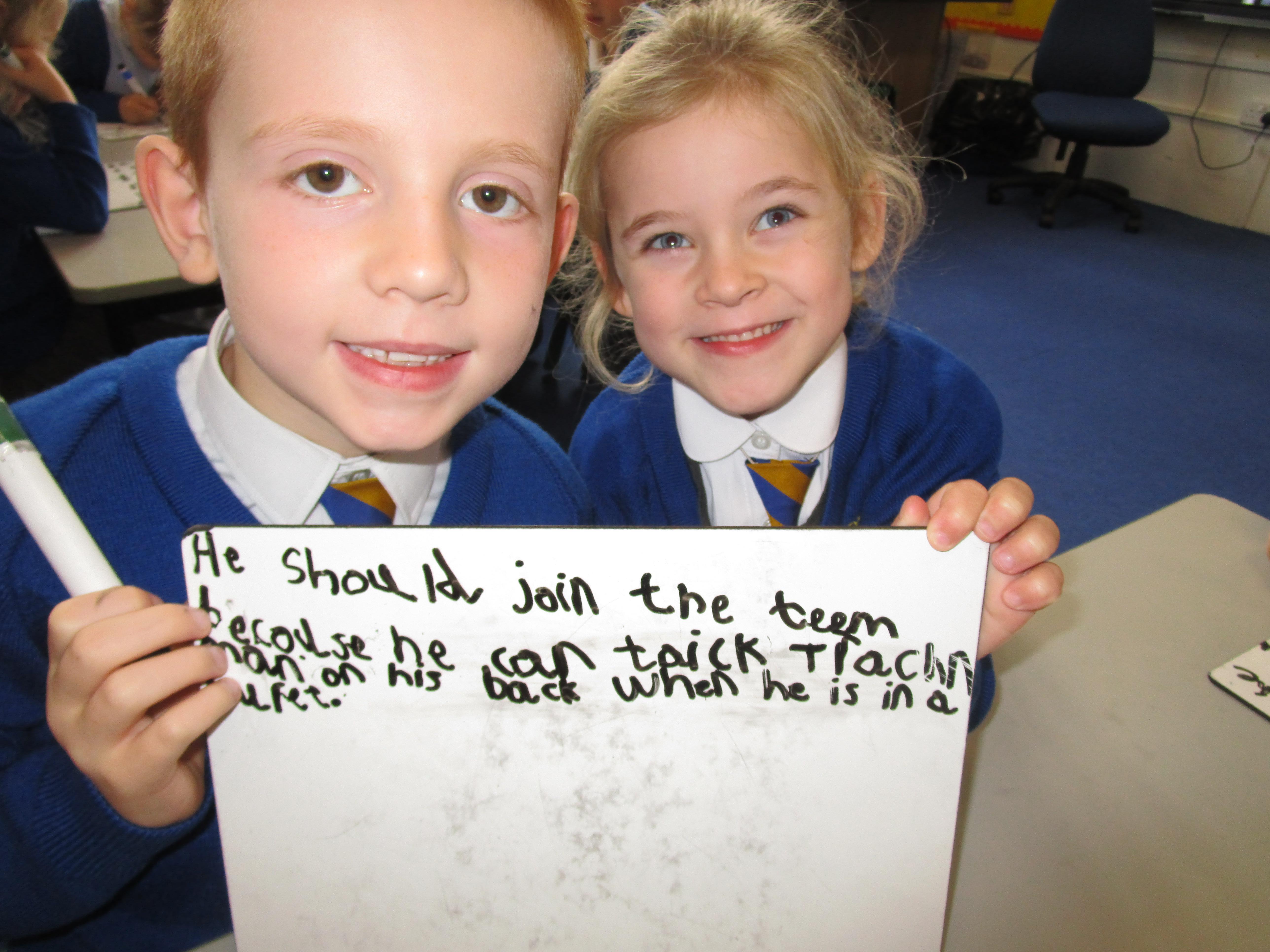 Today in class we have been reading ‘Super Daisy And the Peril of Planet Pea’. In pairs the children had to write questions that they would like to ask Super Daisy. Then some of the children sat in the hot seat and answered the questions in role as Super Daisy.