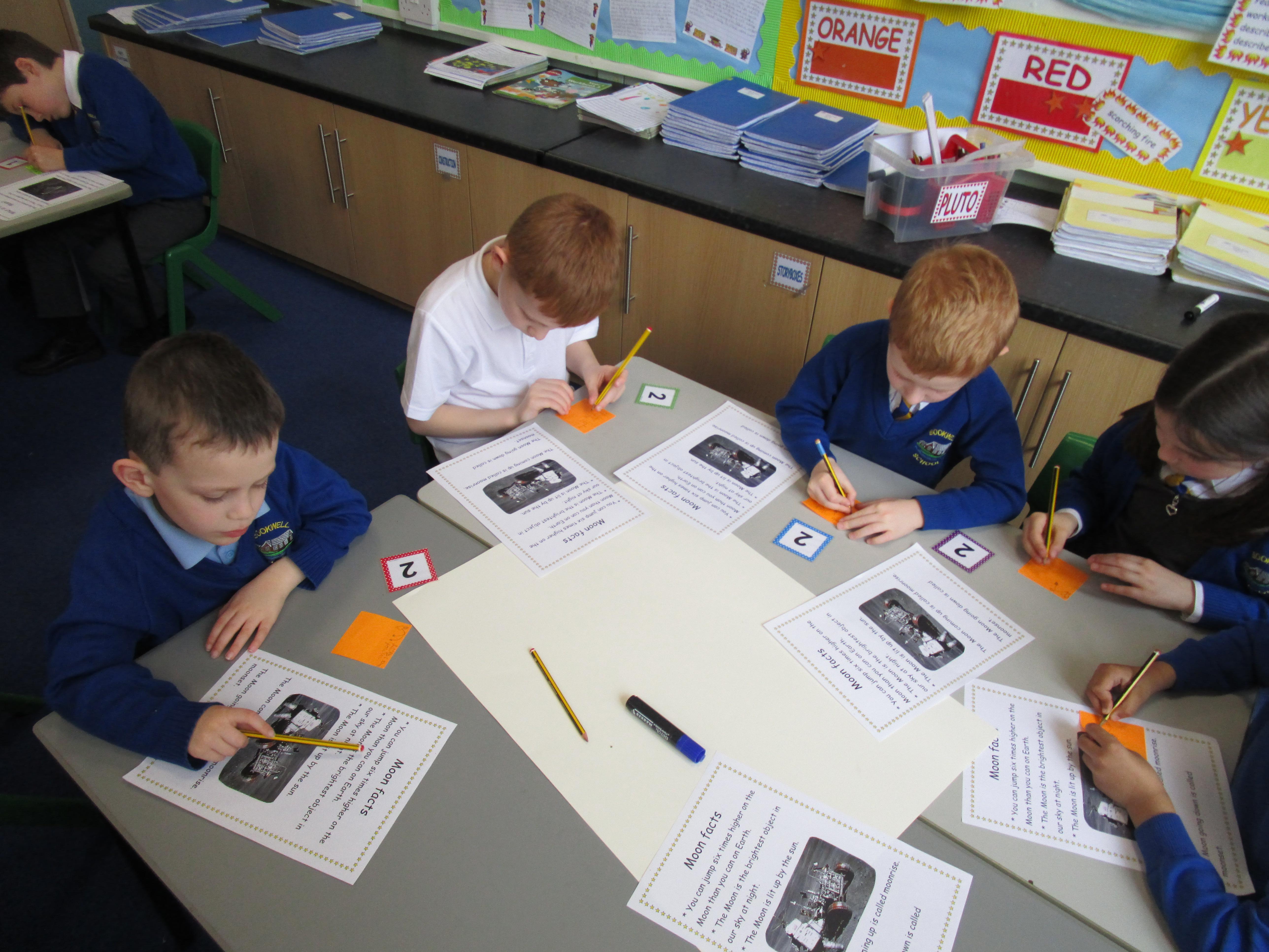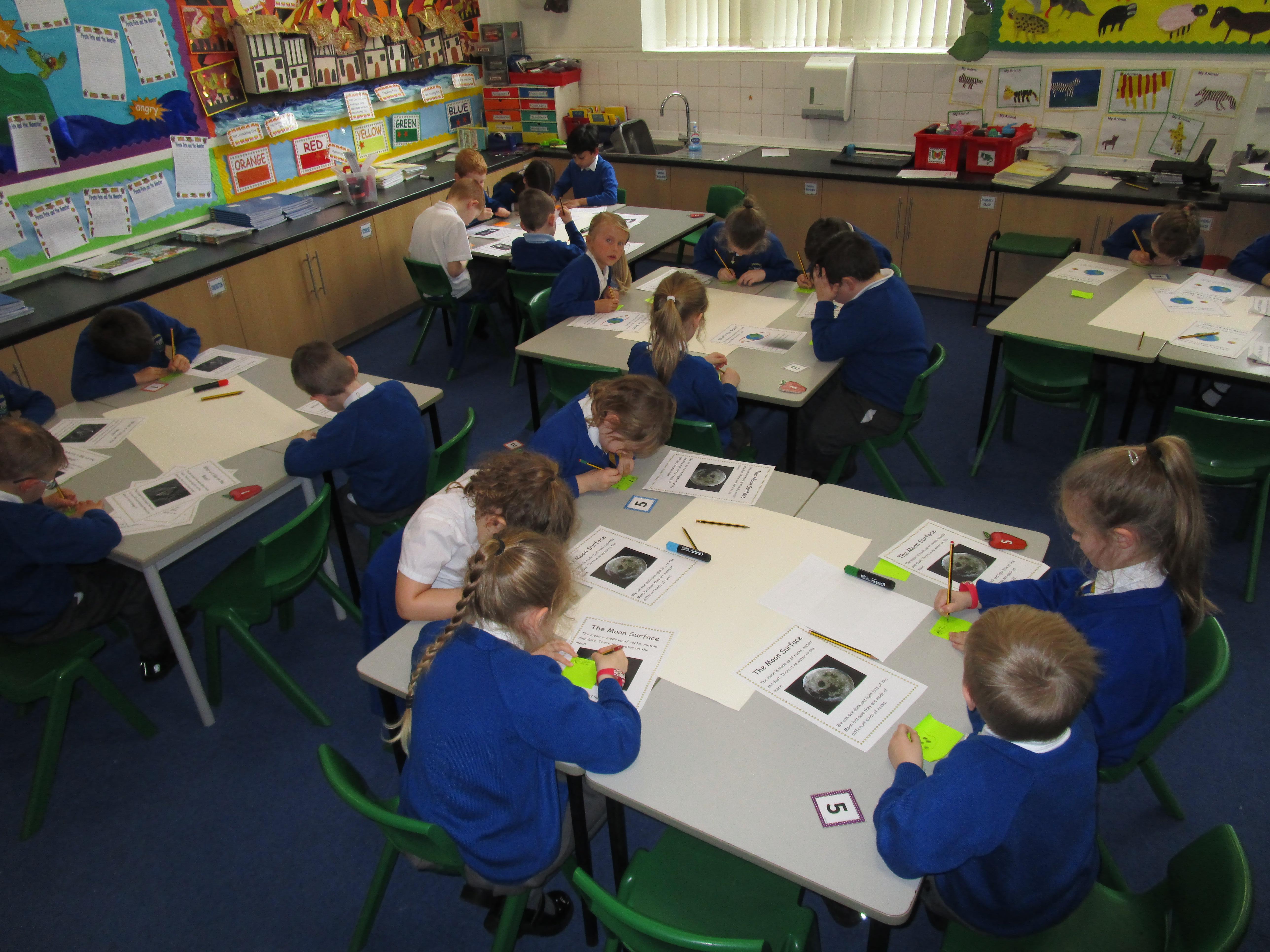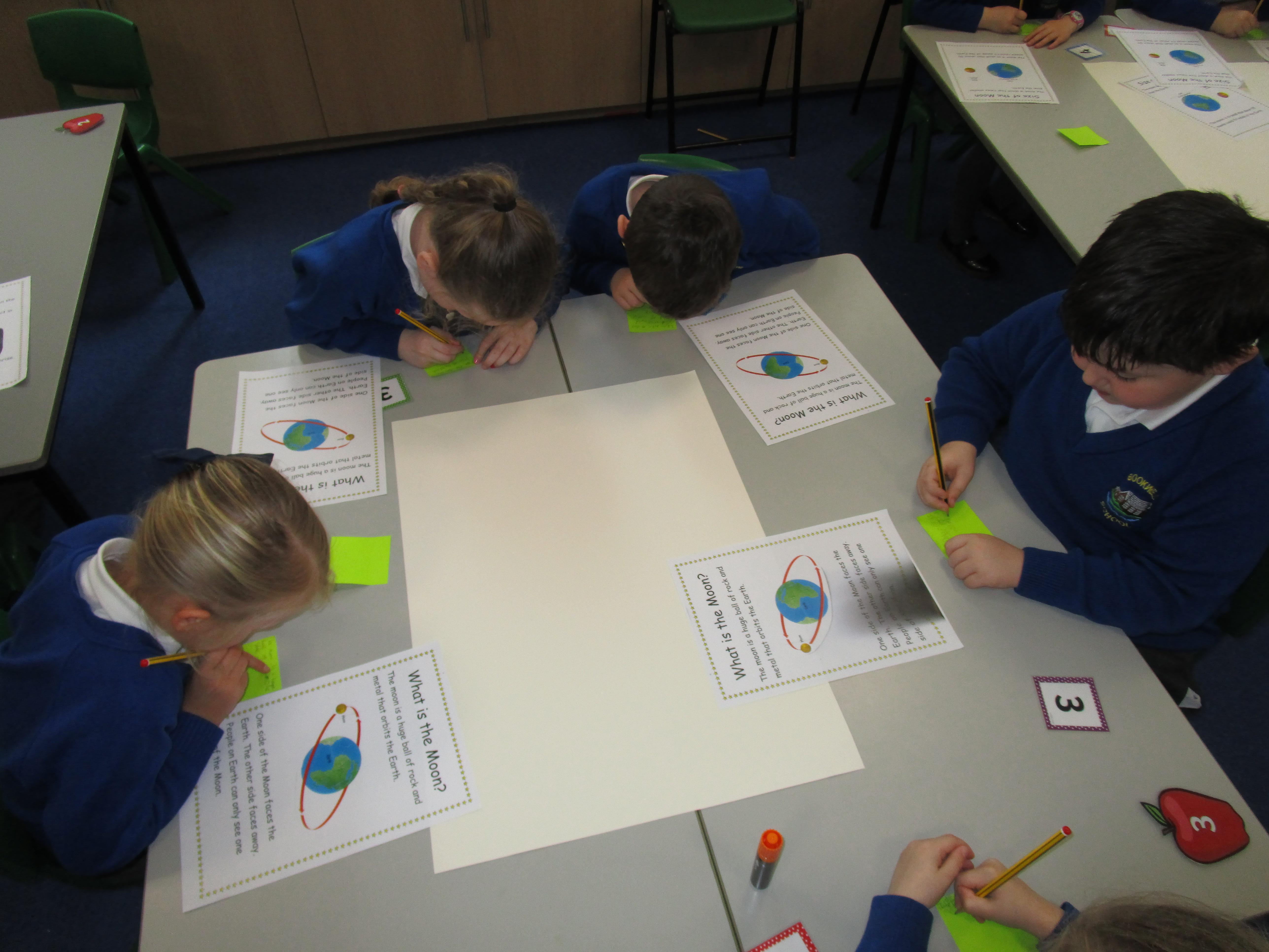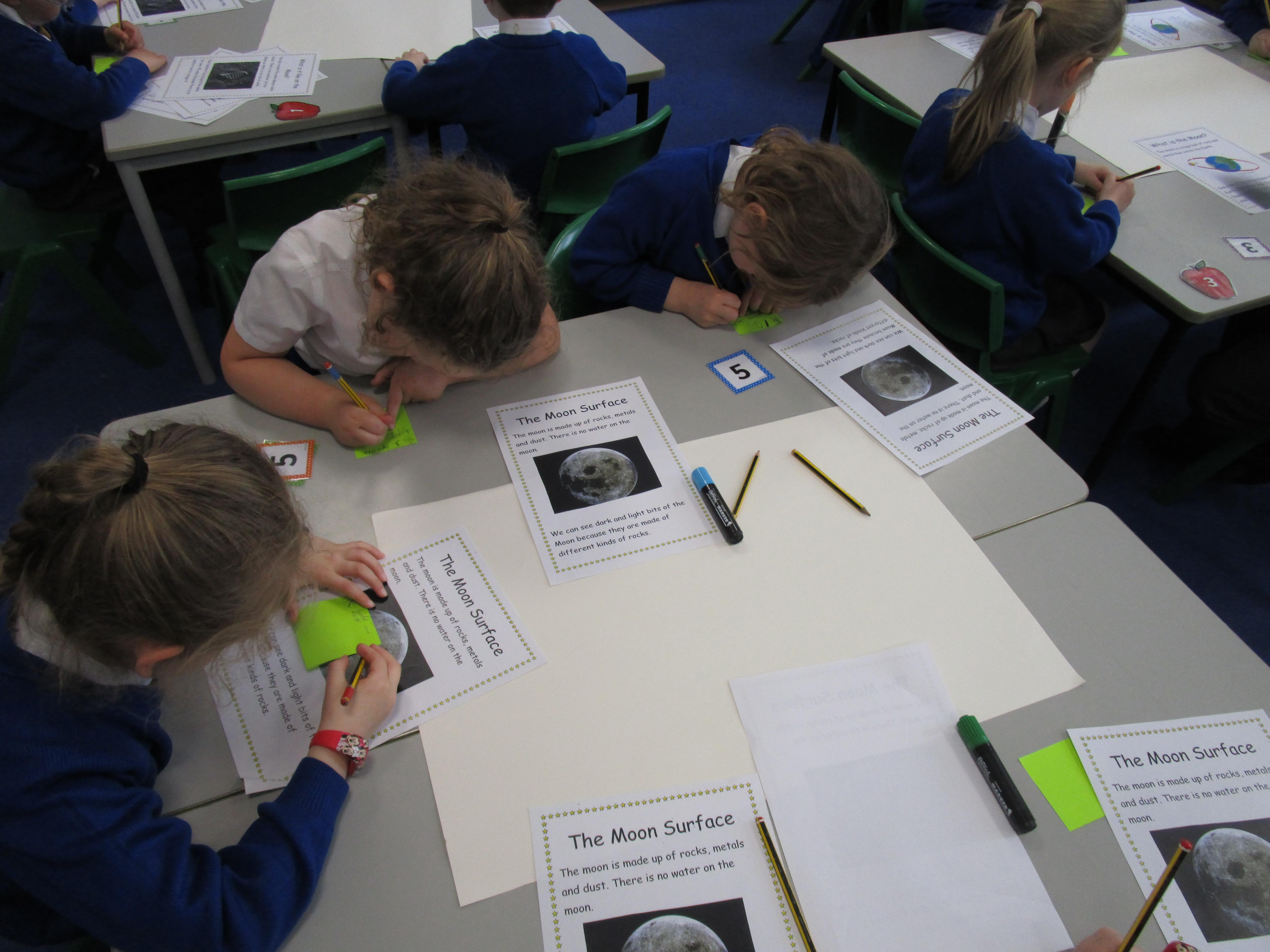 Today the children have been doing a jigsaw activity to learn new facts about the Moon. First they had to research the facts on research tables and then when they returned to their home table they had to share what they had learned with others in their group. Then the children had to design a poster sharing what they had learnt and they had to present their poster to the rest of the class.