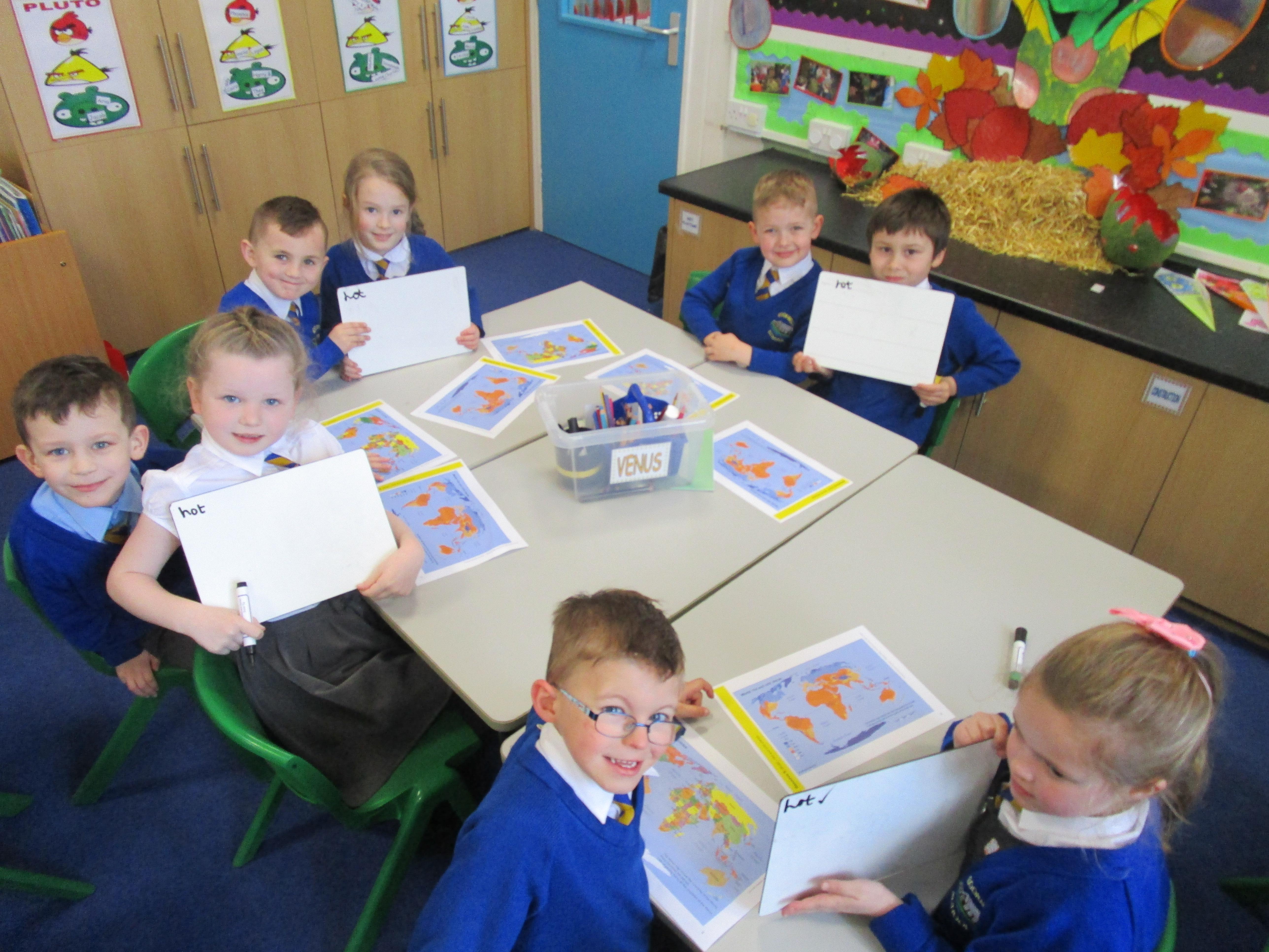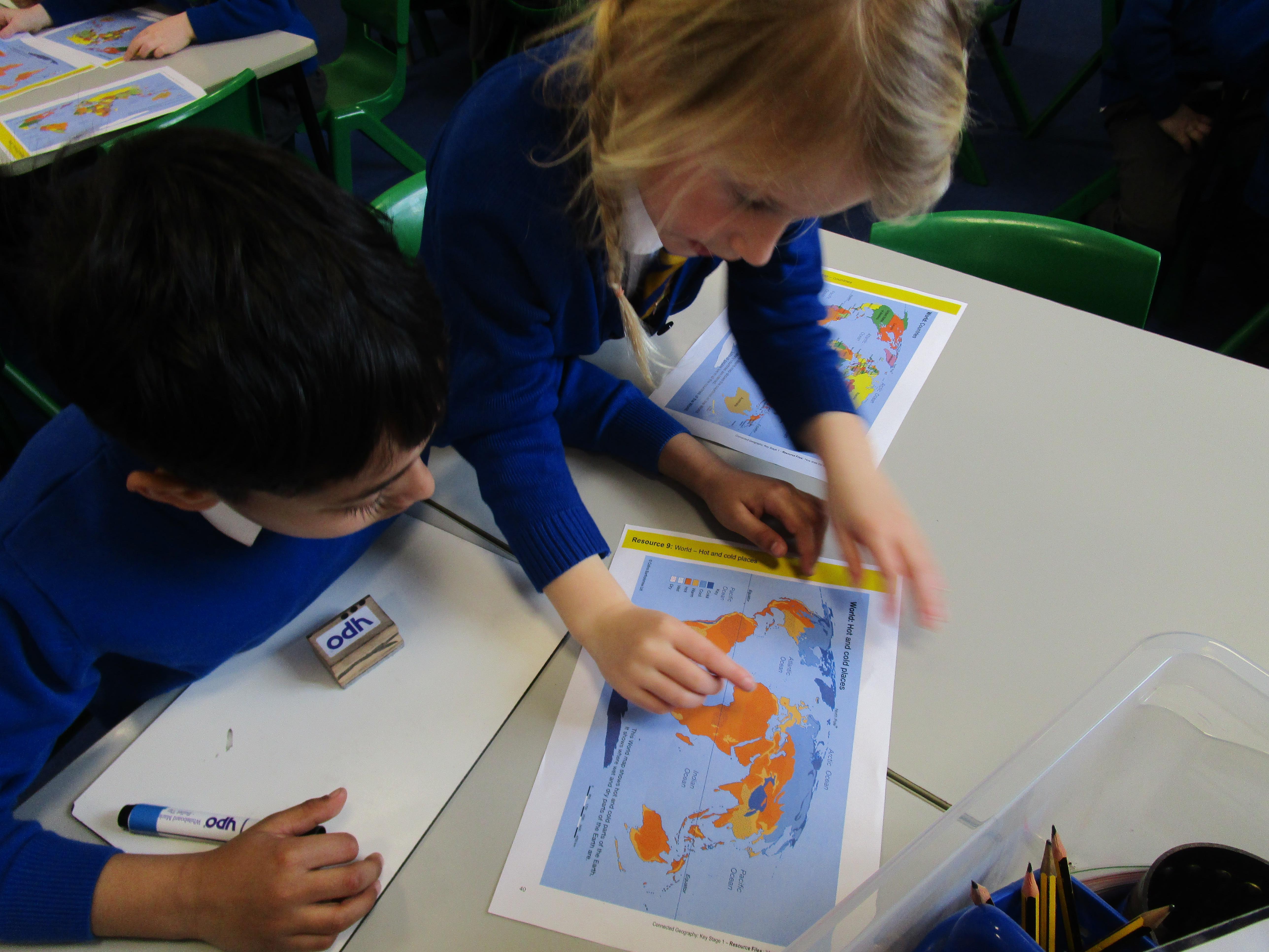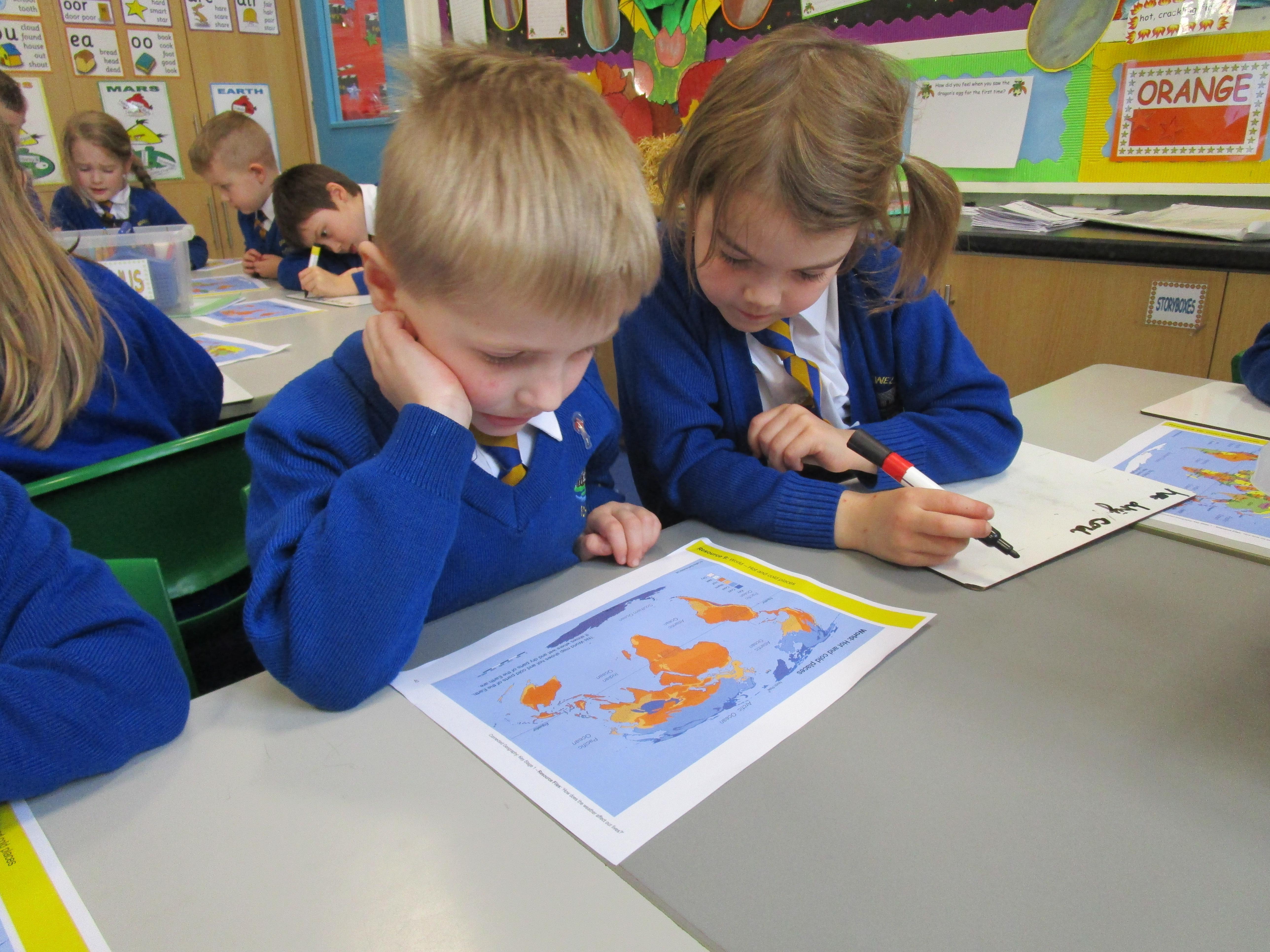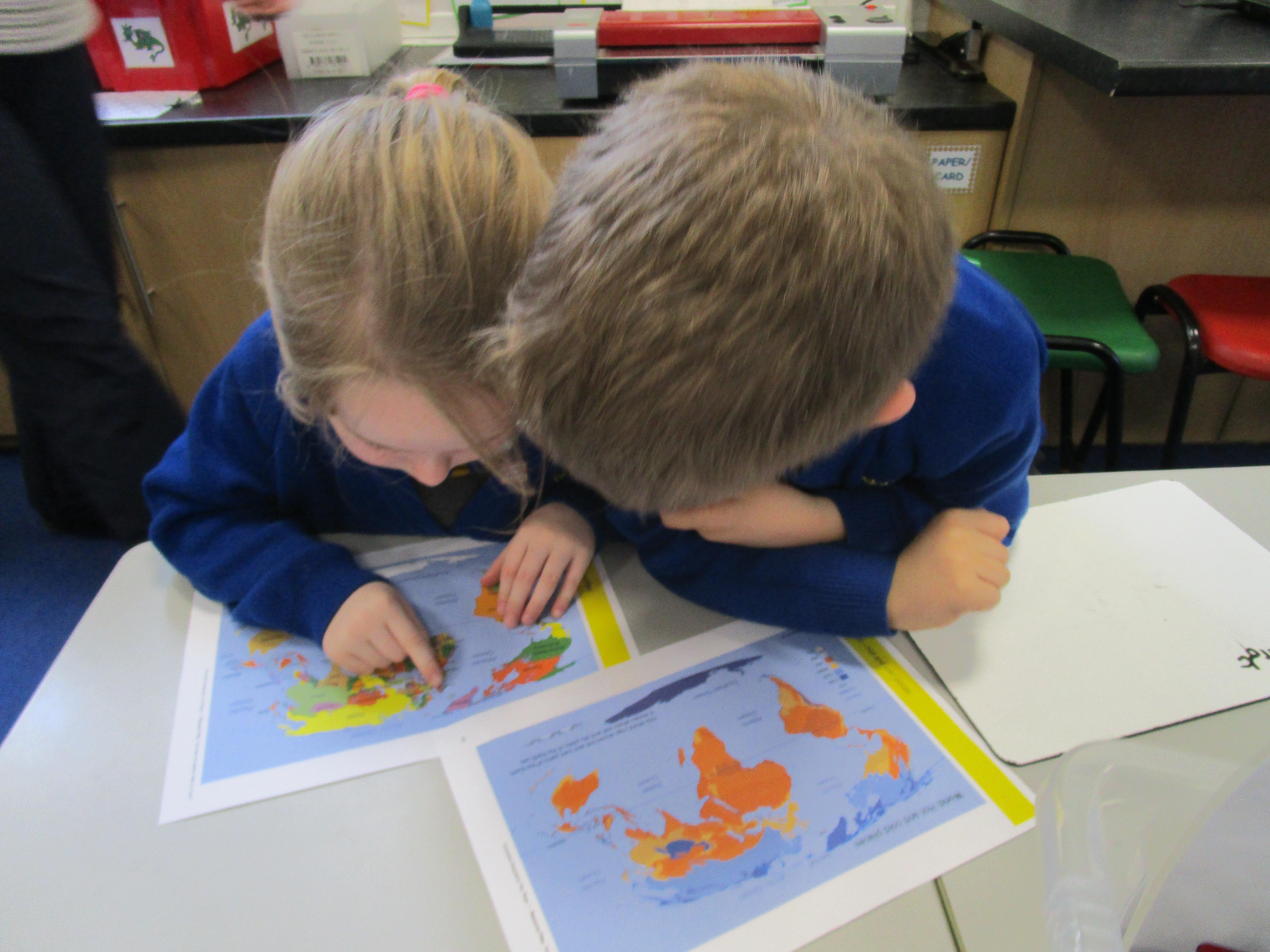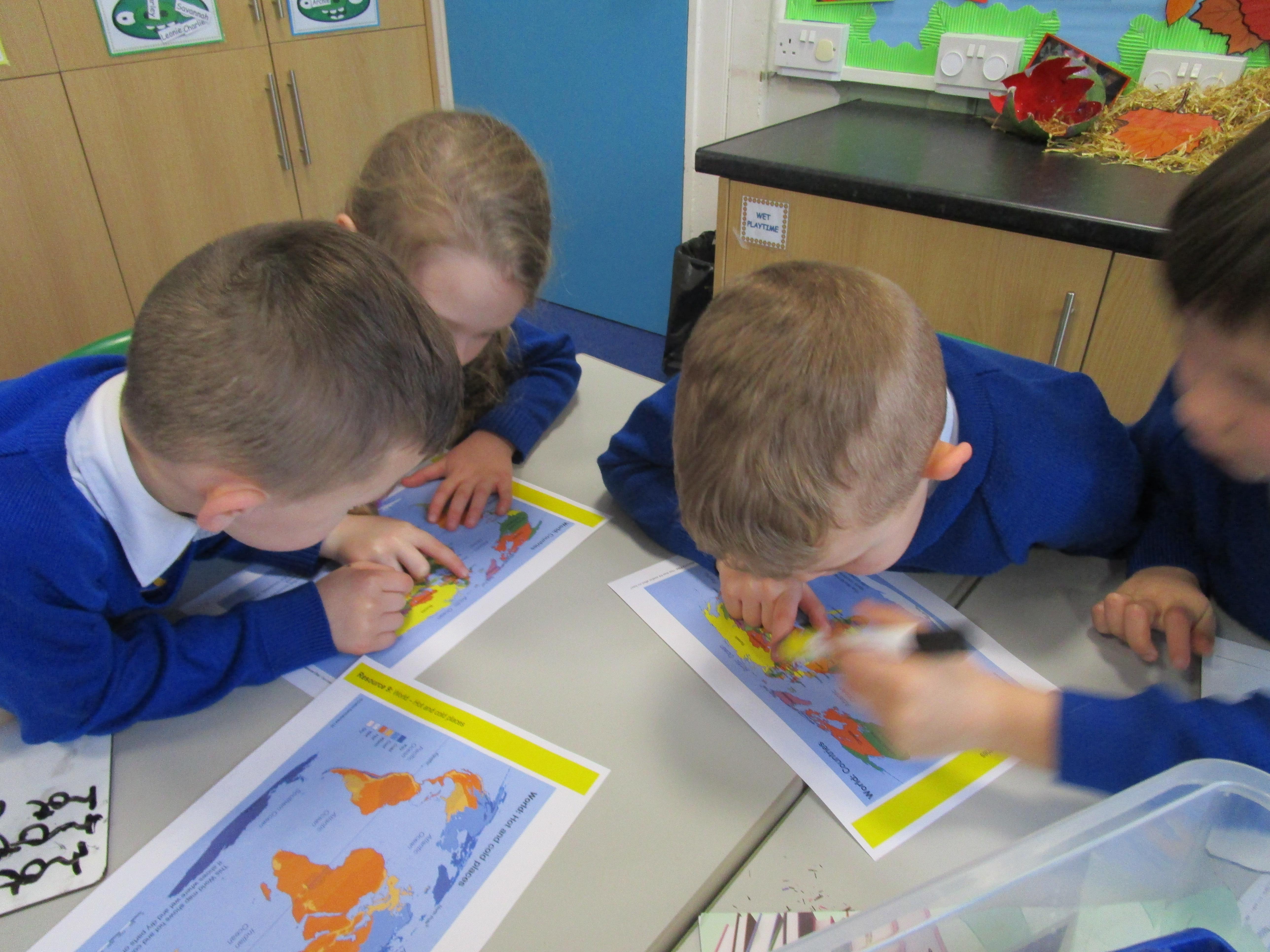 Today the children have been learning about the equator and that the countries that are closest to it are generally warmer and those that are further away are colder. The children had to find the countries on the map and then read the key on another map to work out its weather conditions.