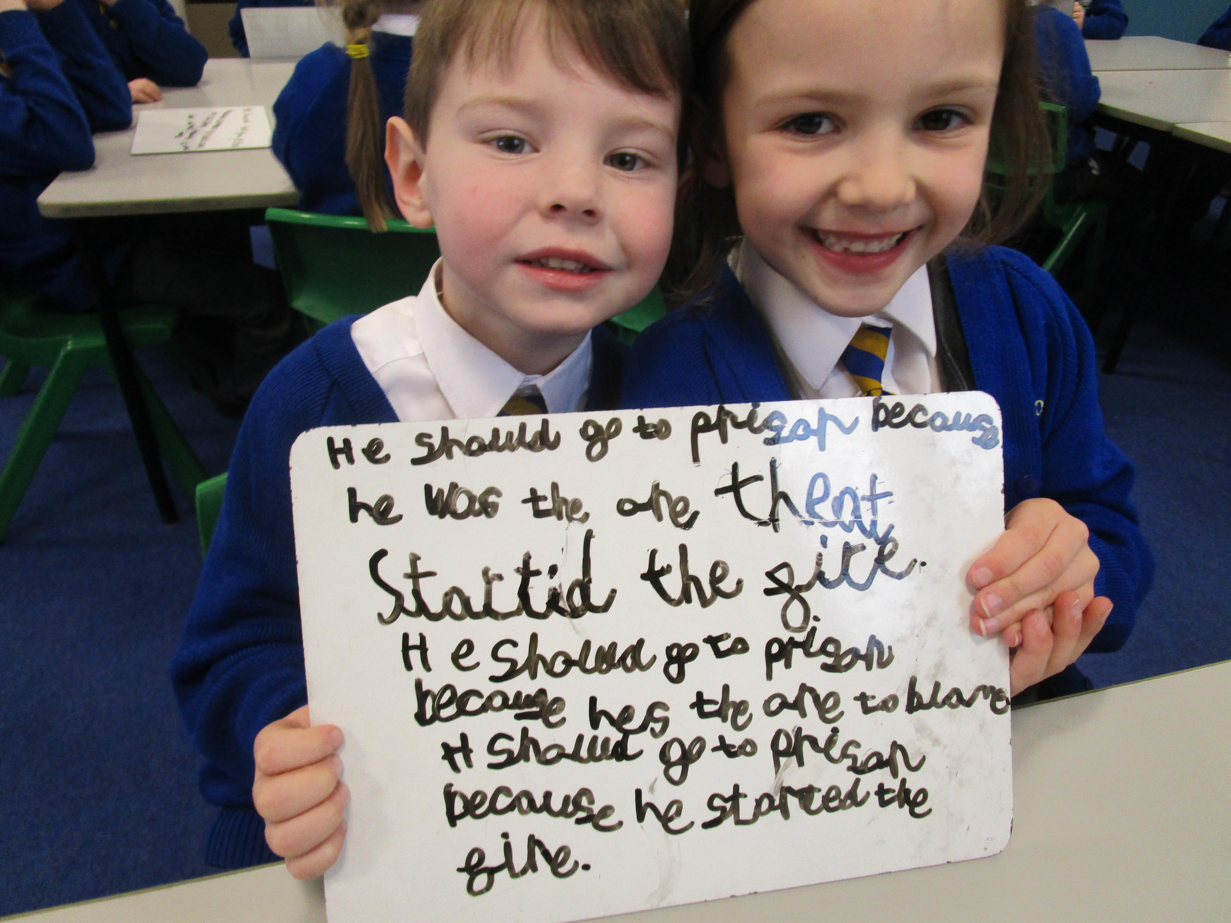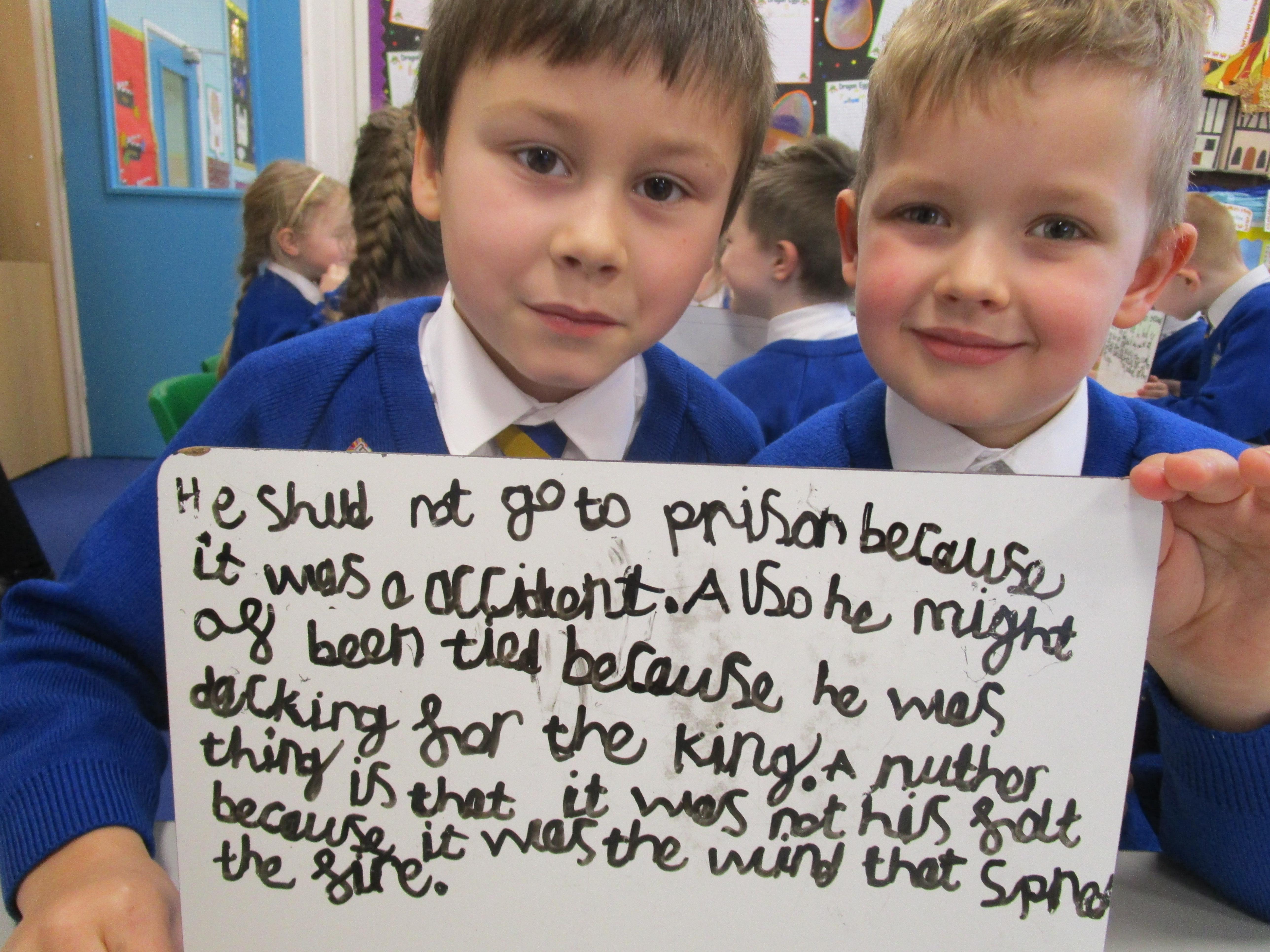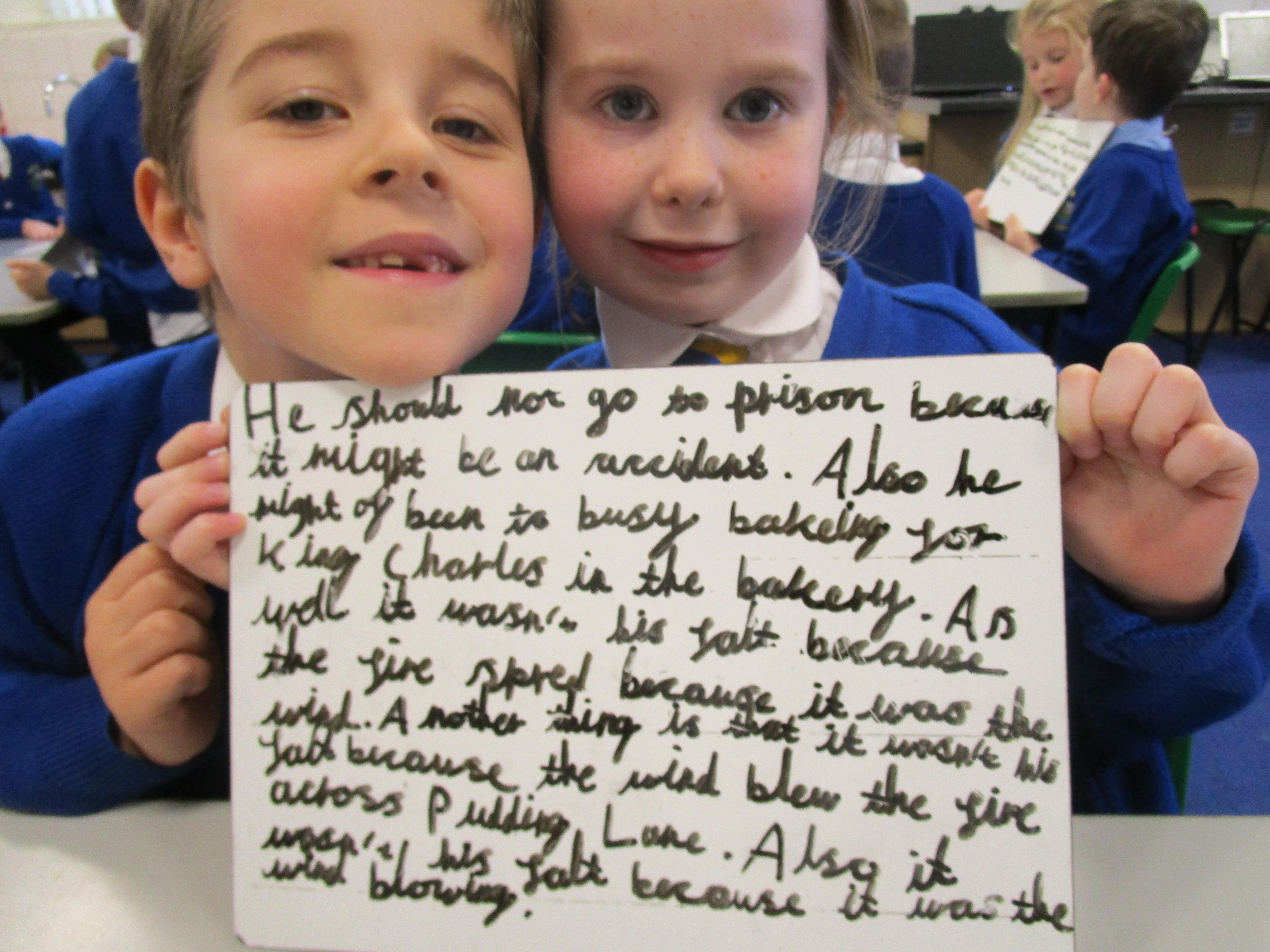 Today in class we completed our Great Fire of London topic. First the children had to think of questions to ask Thomas Farriner and then they had to write opposing arguments for why he should or should not have gone to prison. The children decided that he should go to prison because he started the fire and he did not help his maid escape to safety.