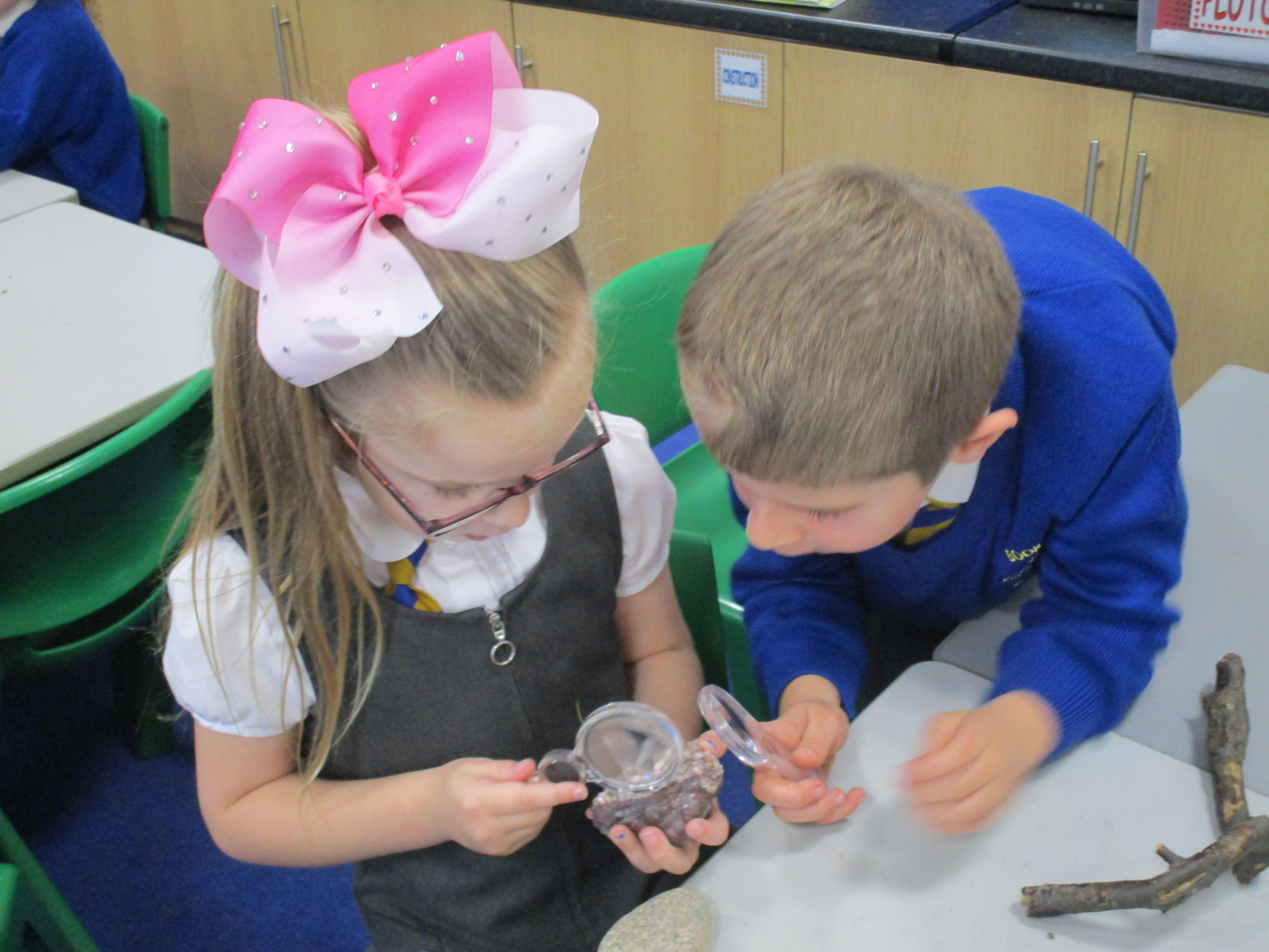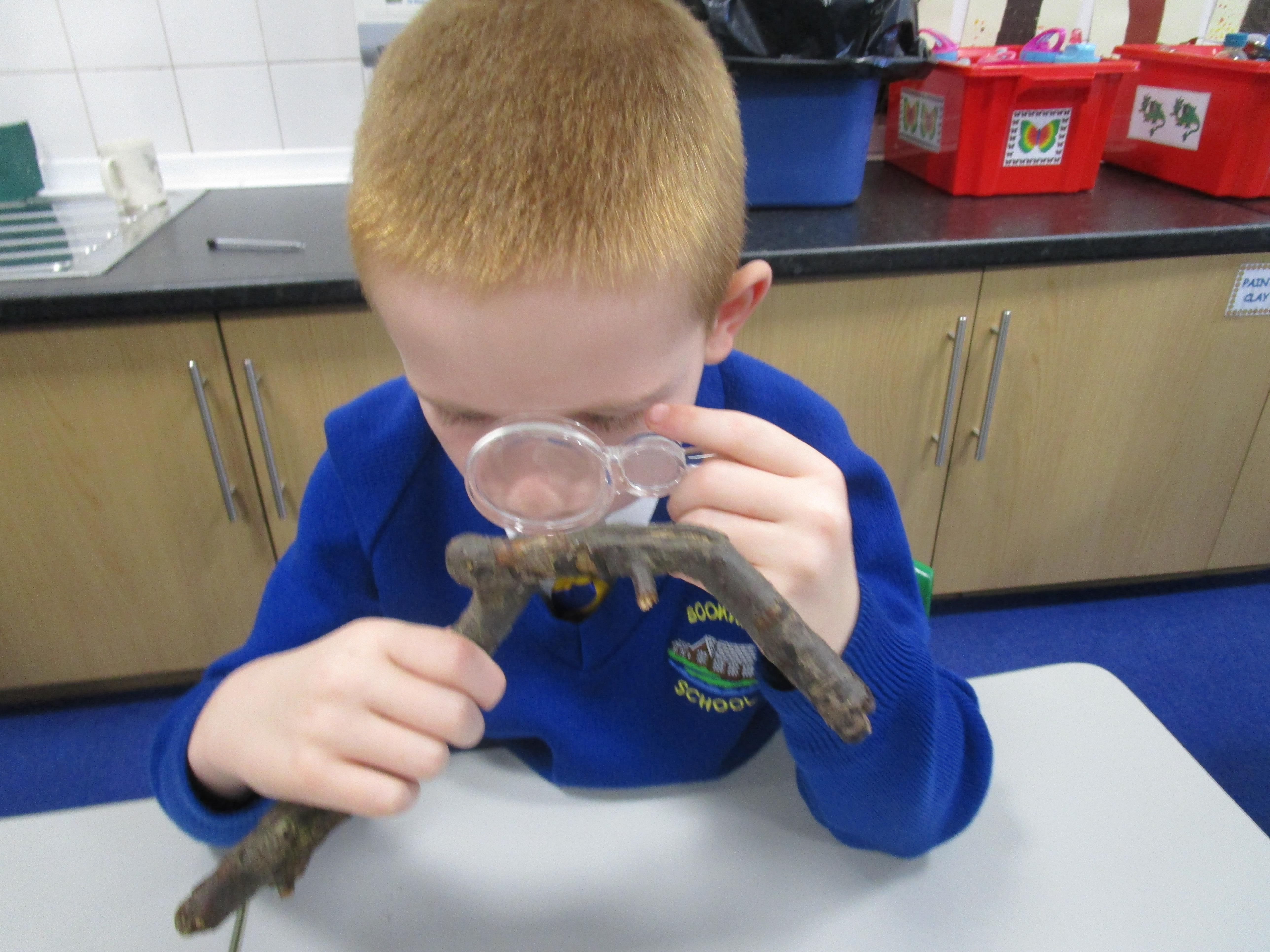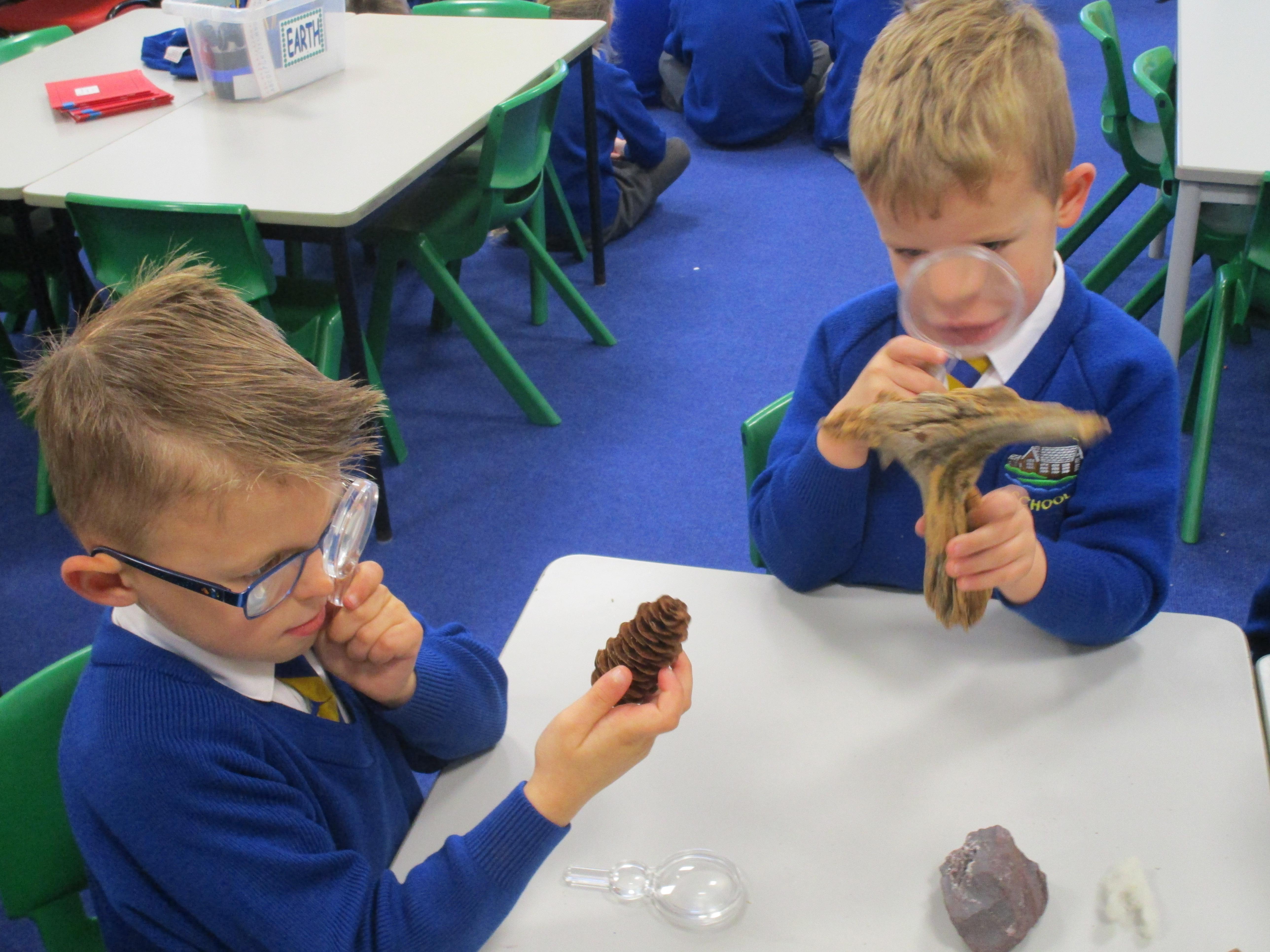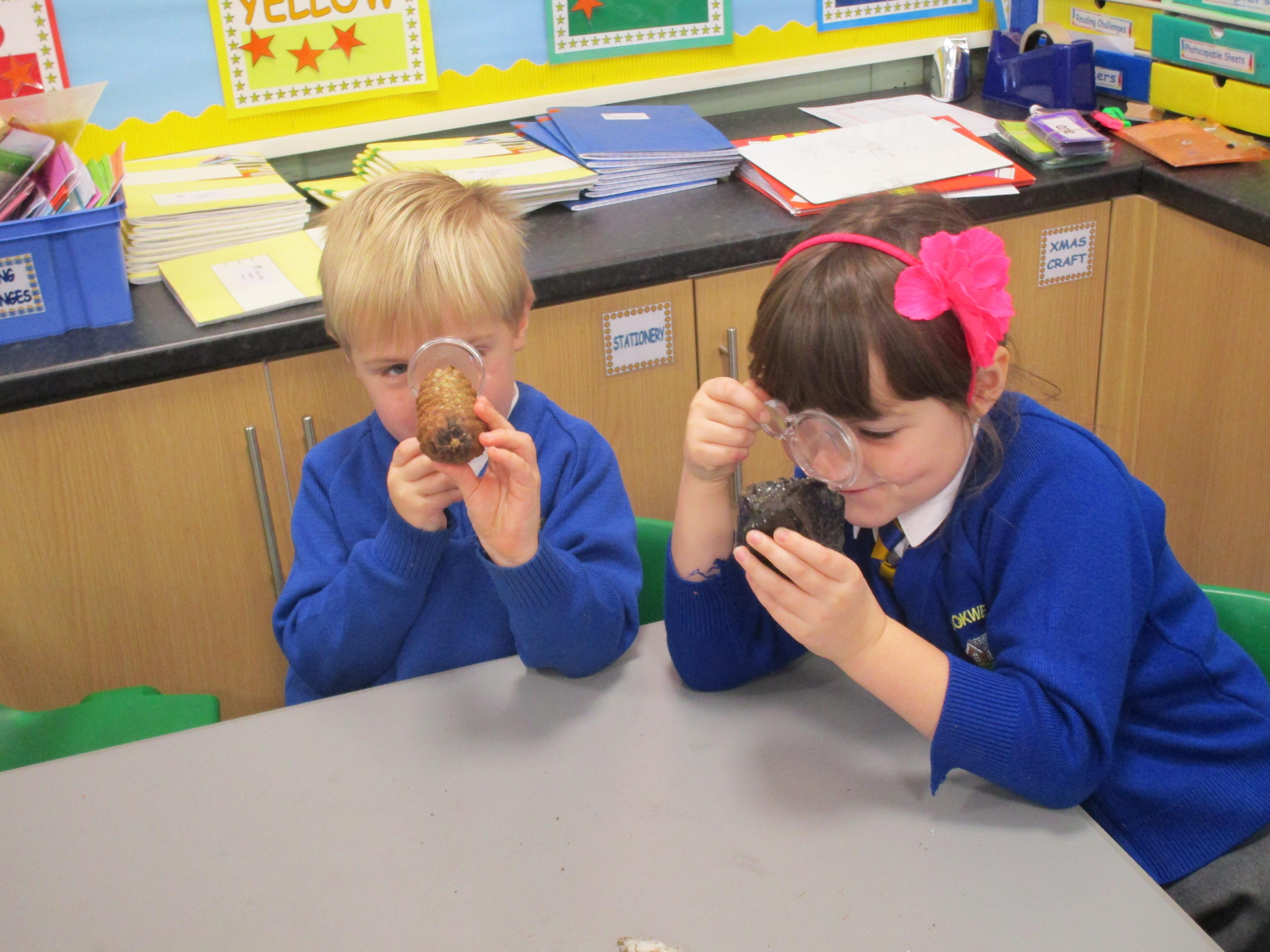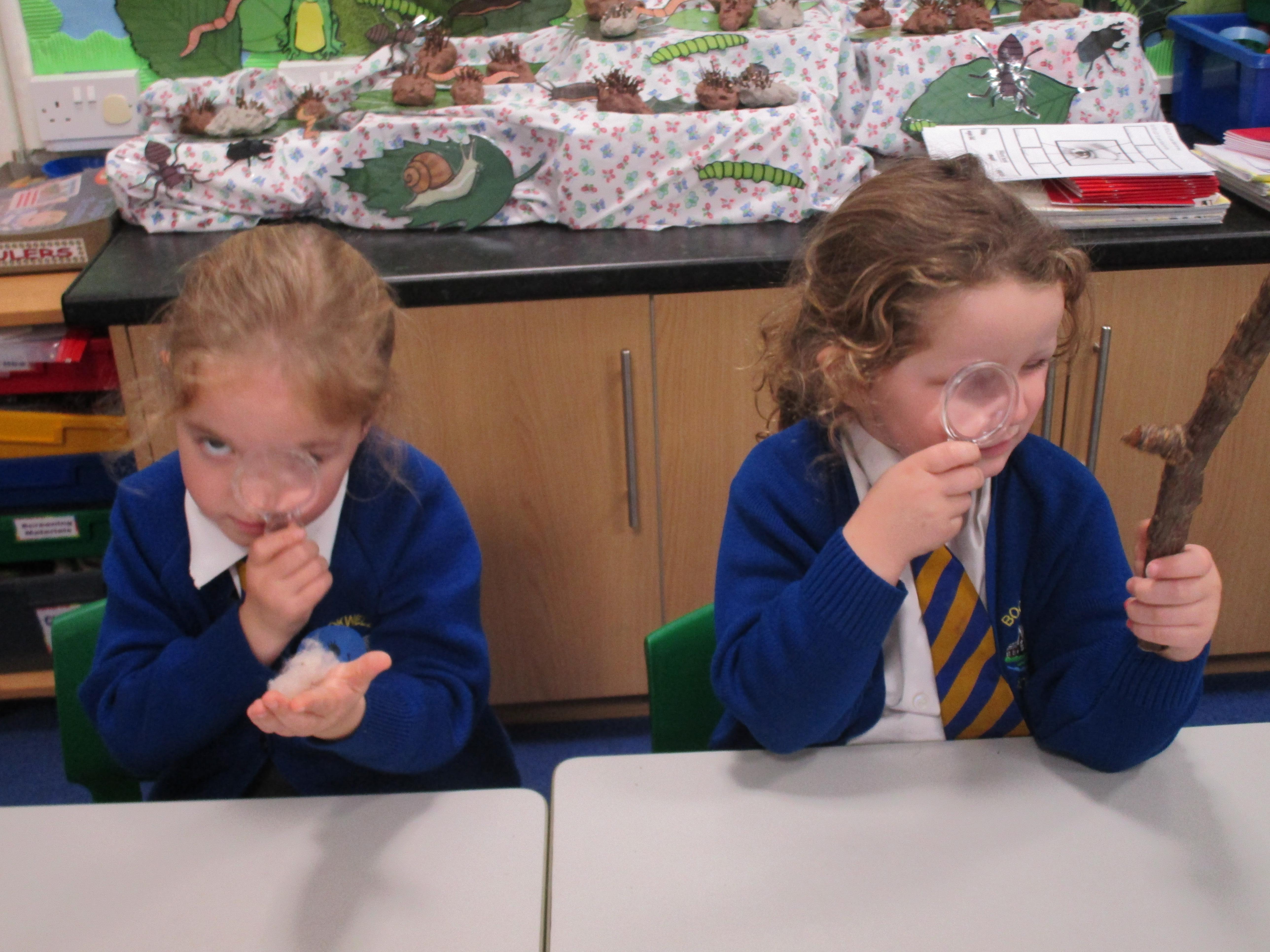 The children have been investigating how magnifying glasses can affect how well they can see things.