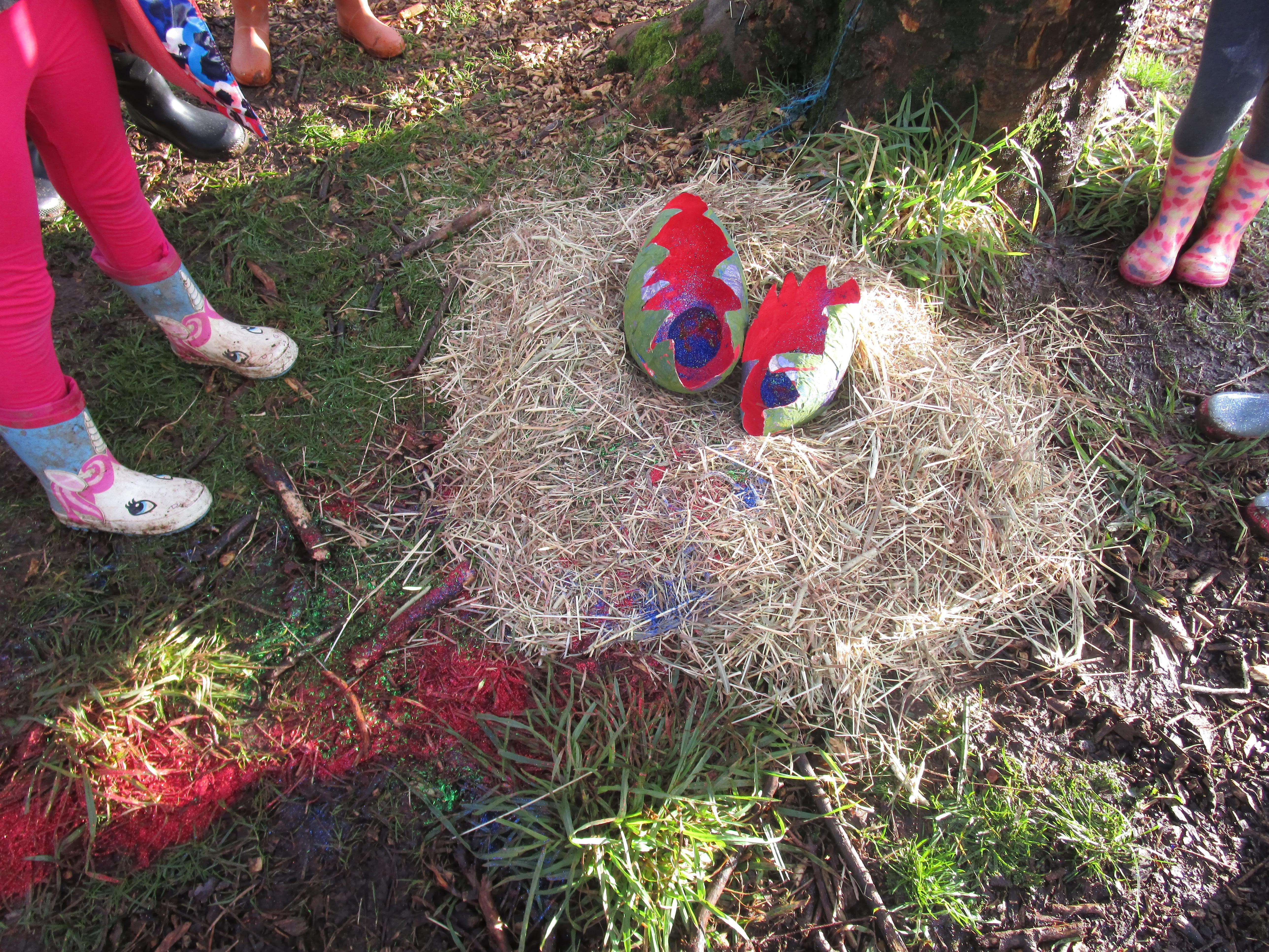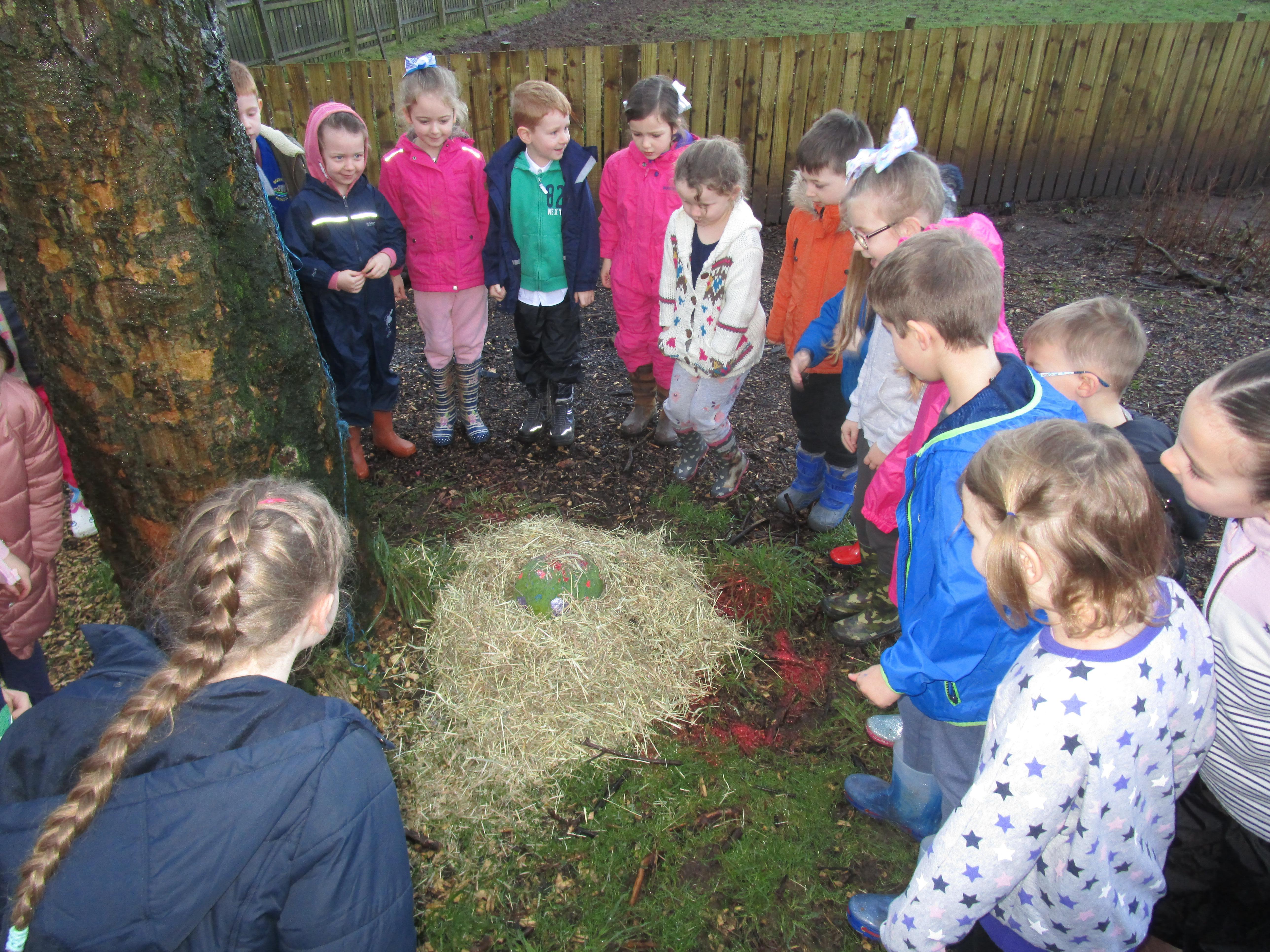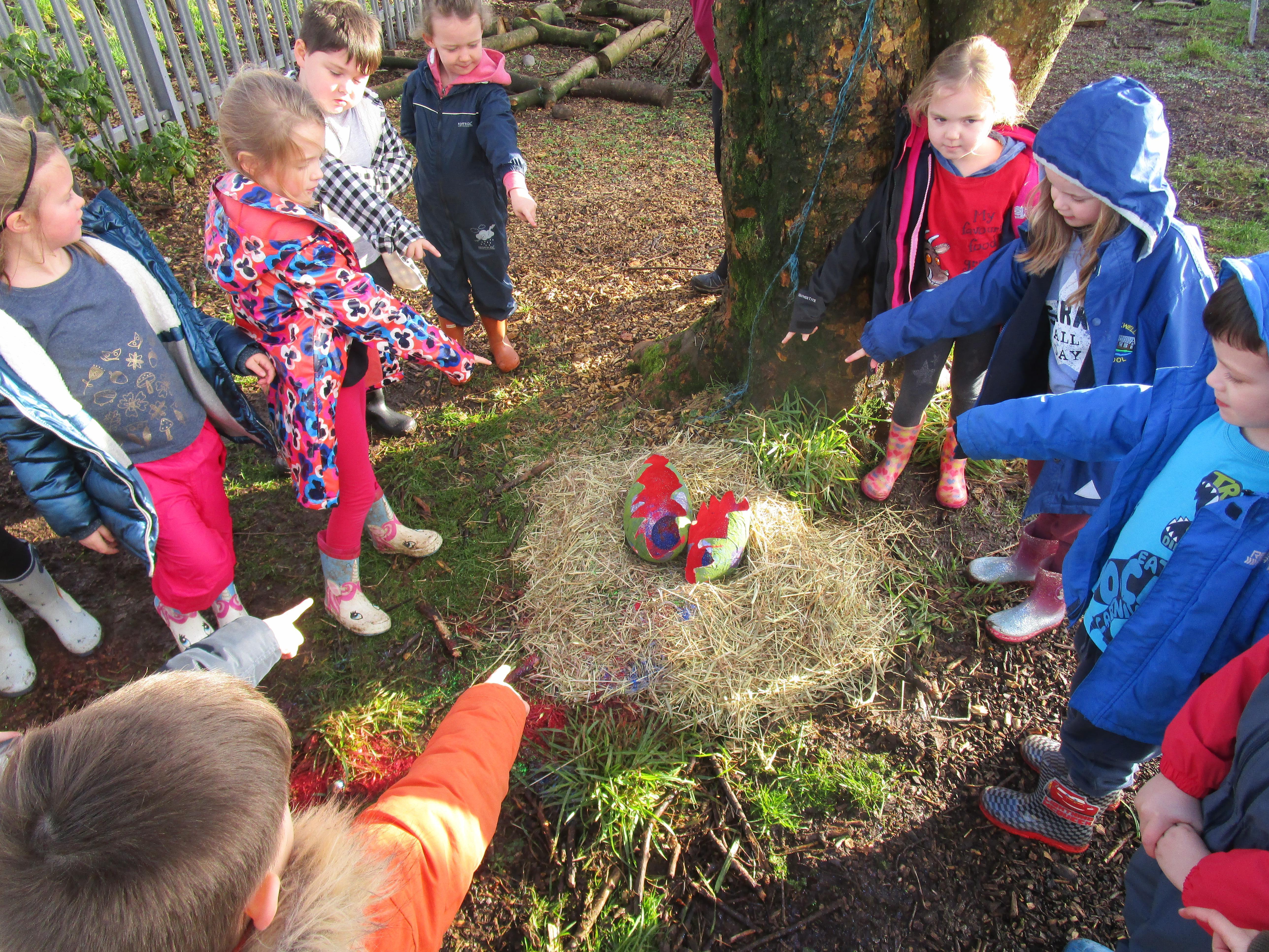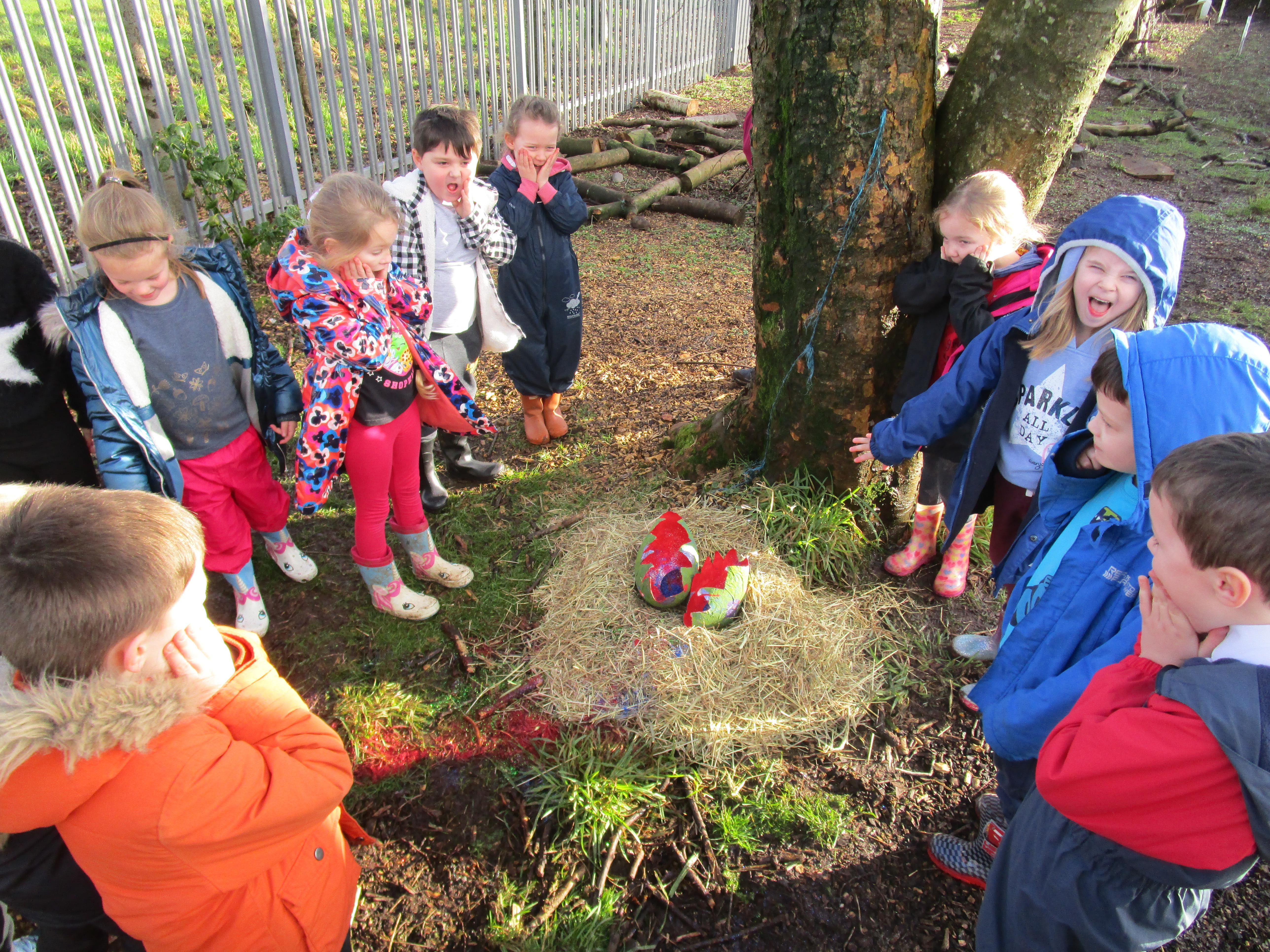 Today we went to the forest area to go on a bug hunt but when we got there we were surprised to find a colourful and spotty egg in a nest! The nest even had burnt straw in it so the children guessed that it must be a dragon's egg. We listened to the egg and could hear scratching noises inside and the children even found some dragon footprints!