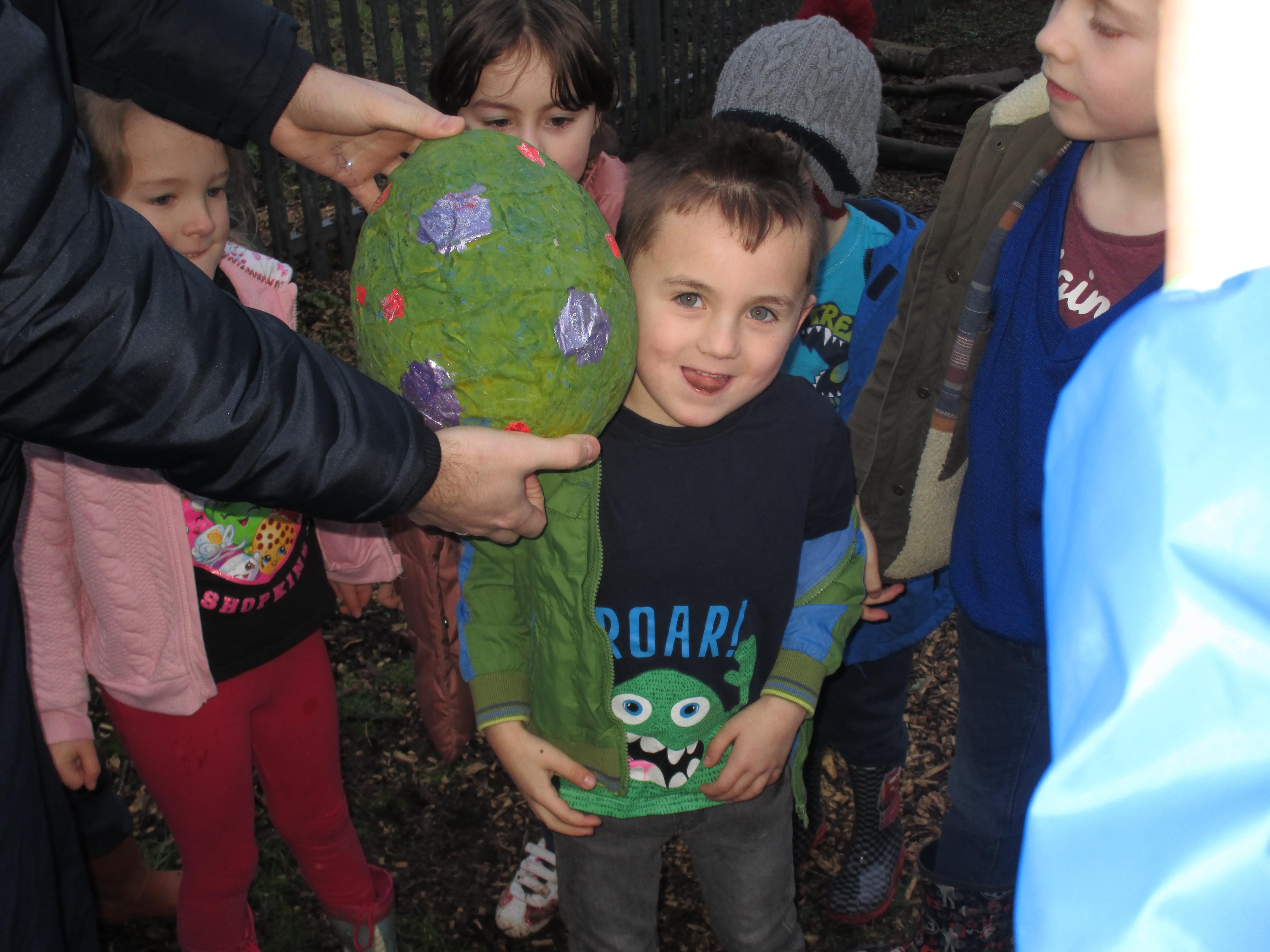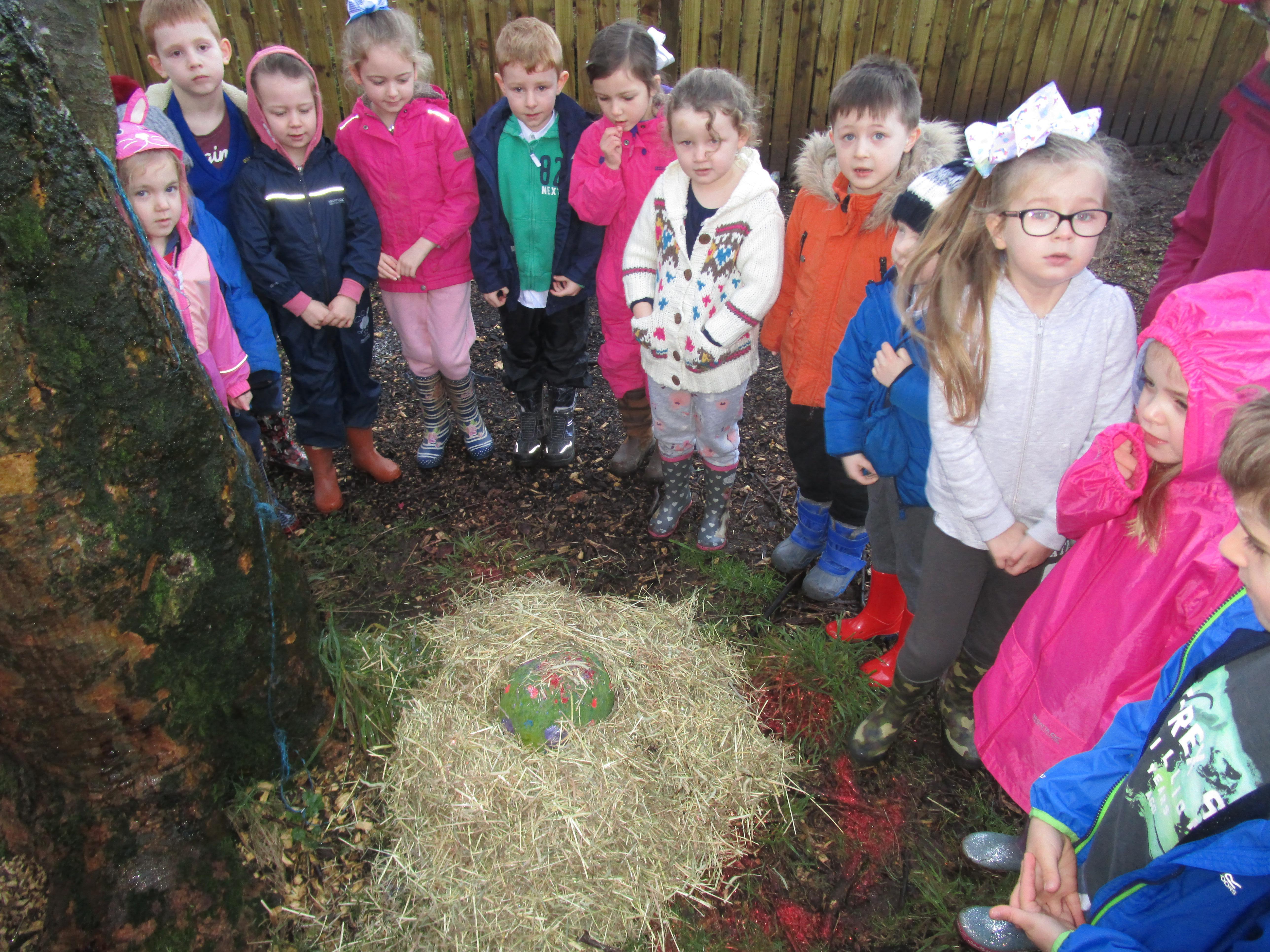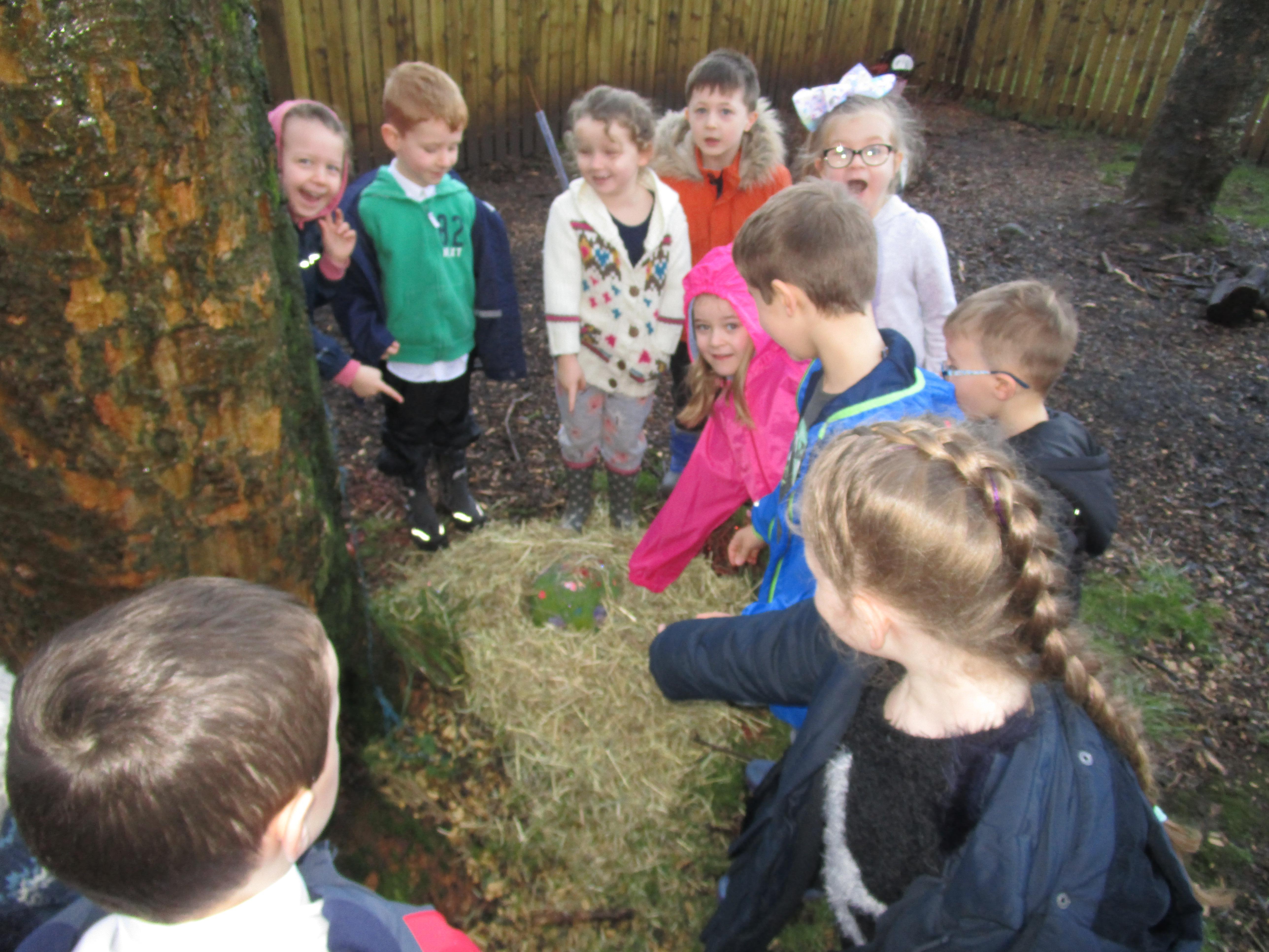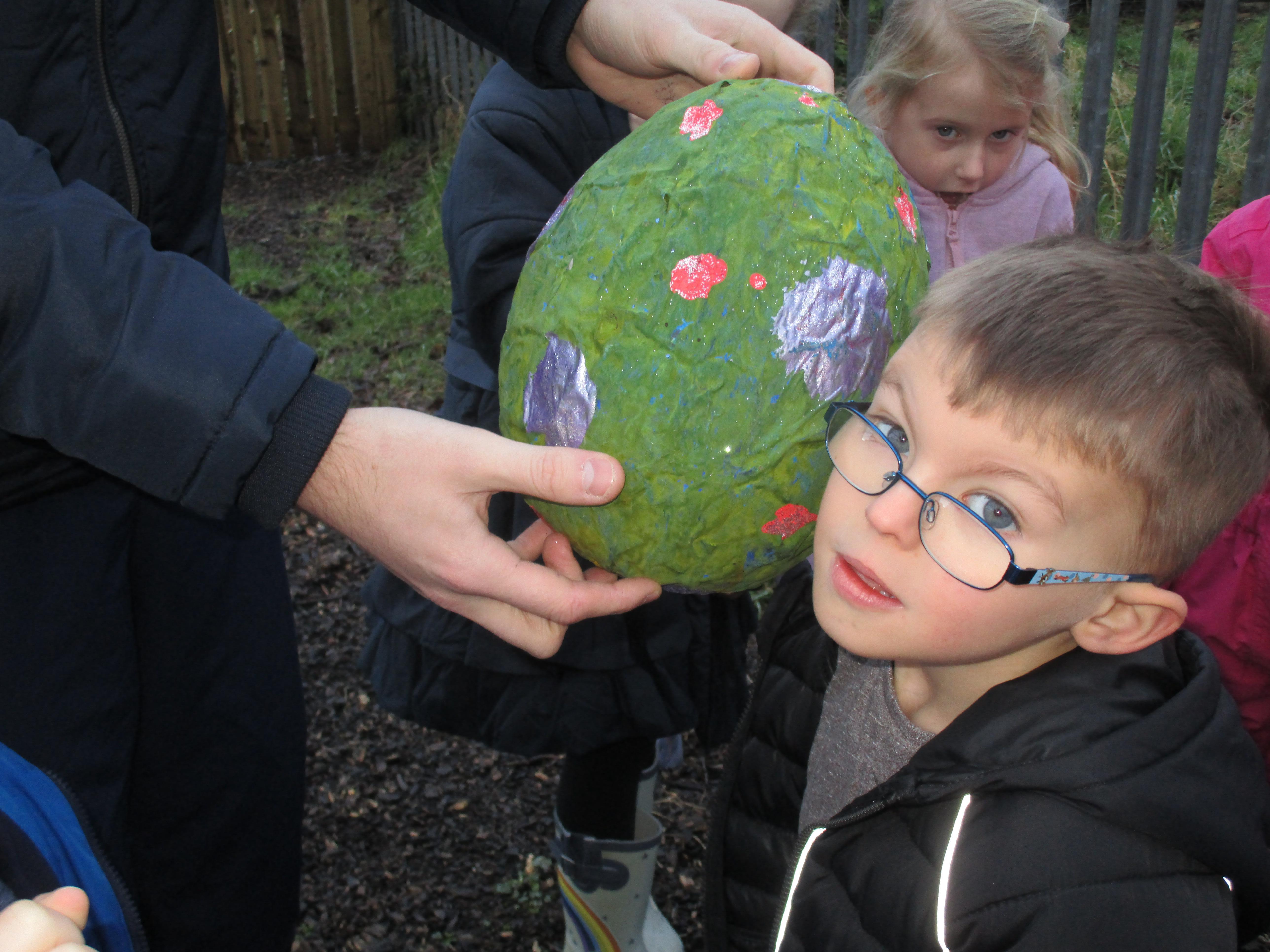 Today we went to the forest area to go on a bug hunt but when we got there we were surprised to find a colourful and spotty egg in a nest! The nest even had burnt straw in it so the children guessed that it must be a dragon's egg. We listened to the egg and could hear scratching noises inside and the children even found some dragon footprints!