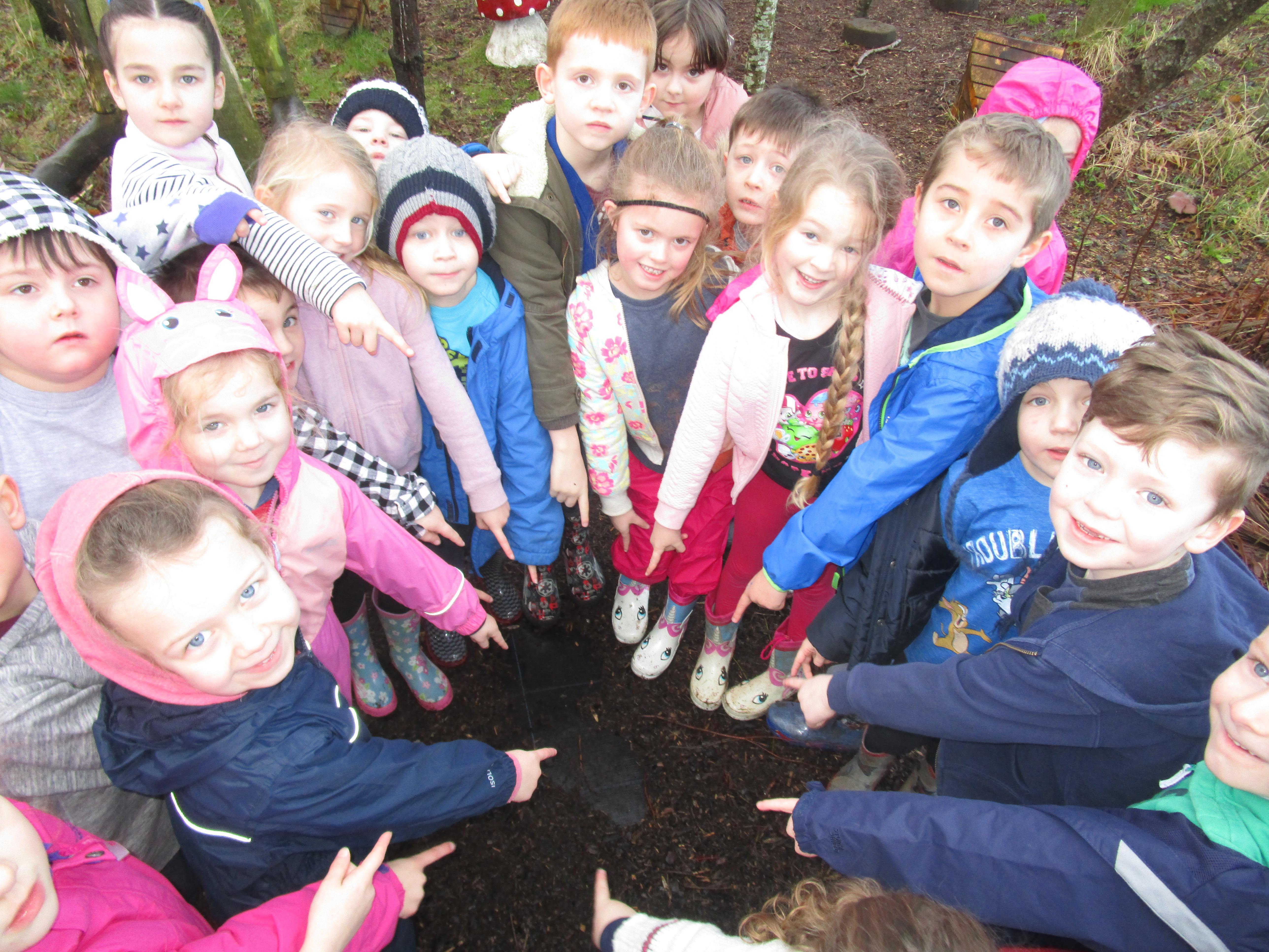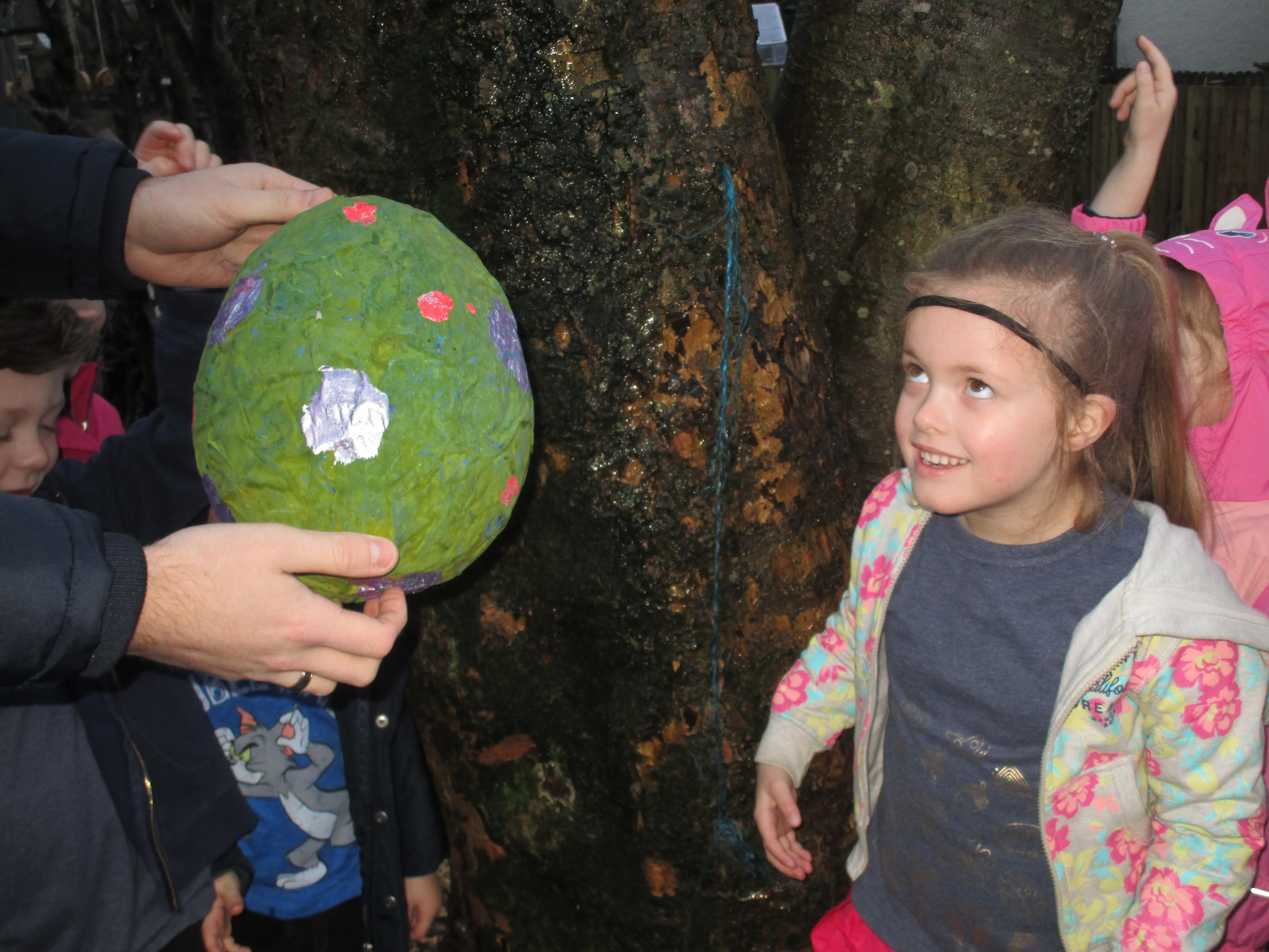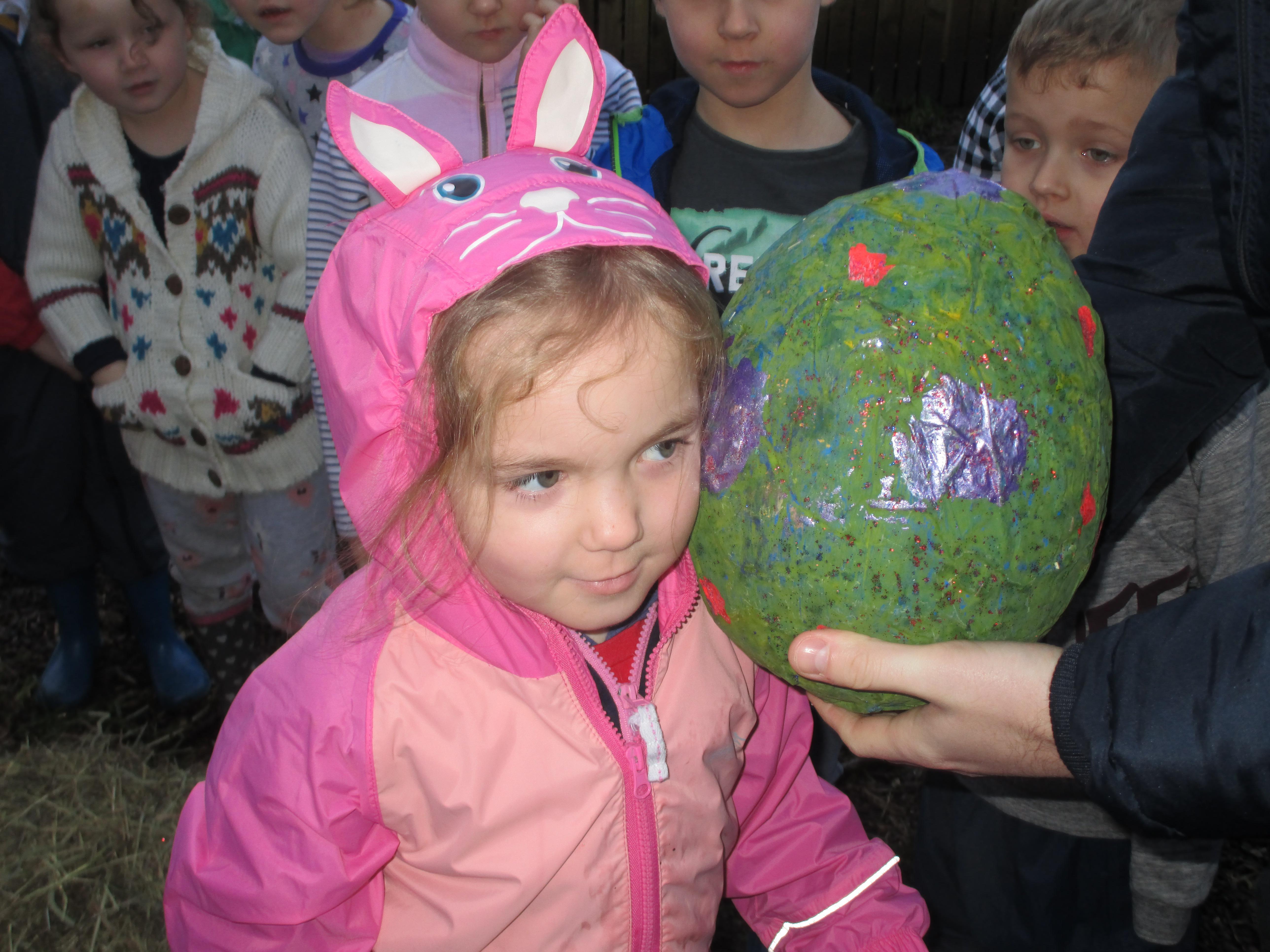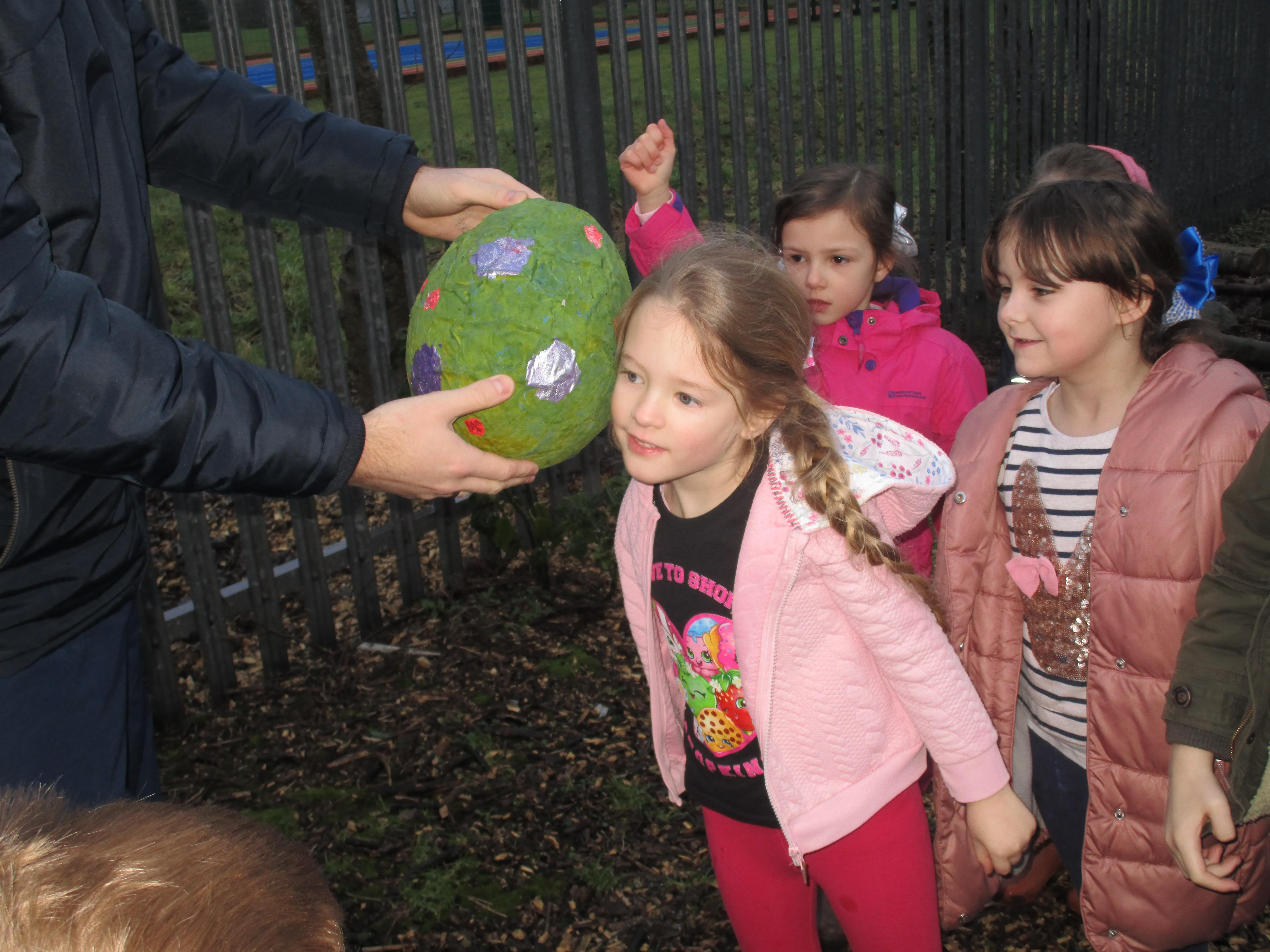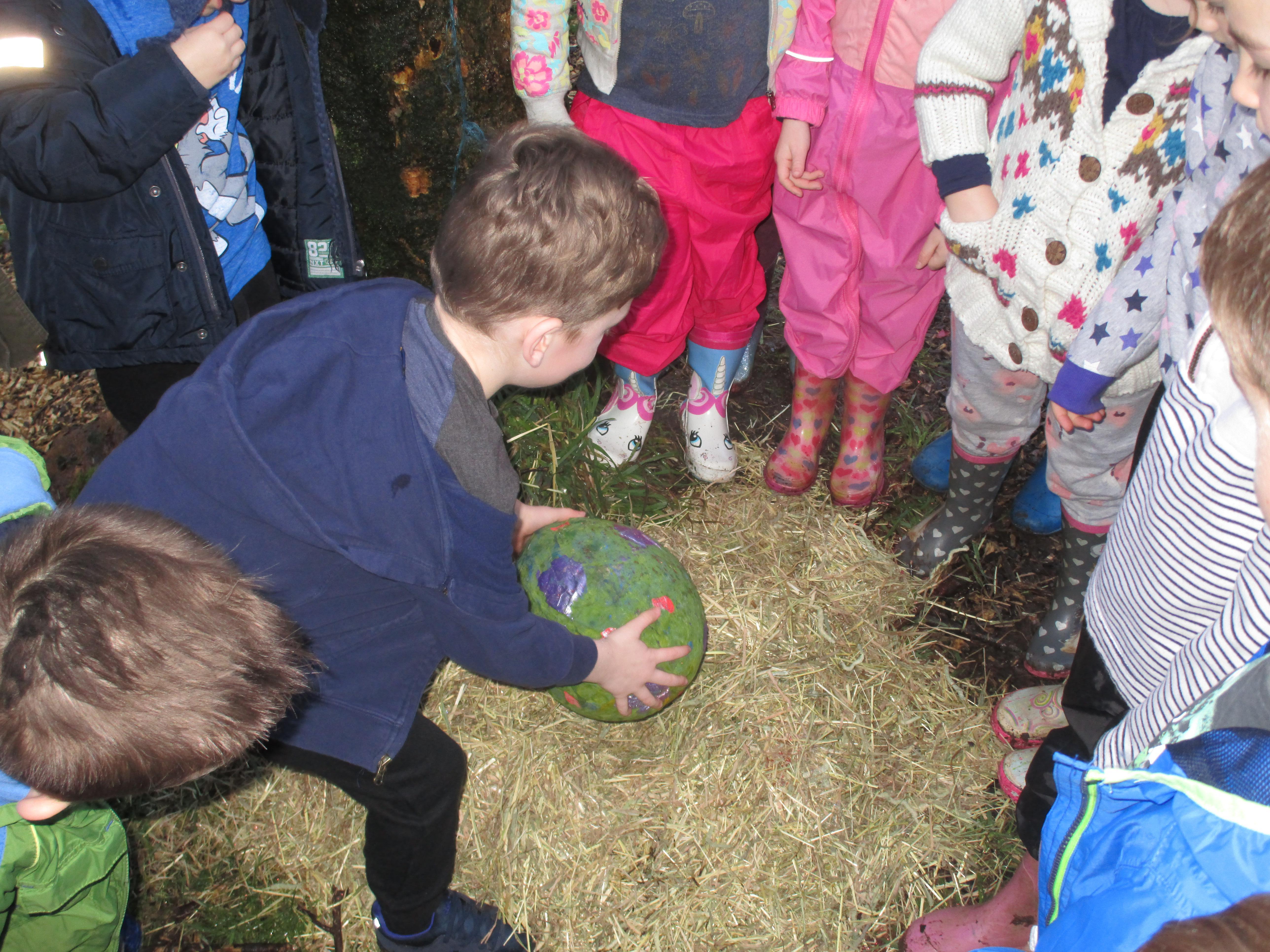 Today we went to the forest area to go on a bug hunt but when we got there we were surprised to find a colourful and spotty egg in a nest! The nest even had burnt straw in it so the children guessed that it must be a dragon's egg. We listened to the egg and could hear scratching noises inside and the children even found some dragon footprints!
