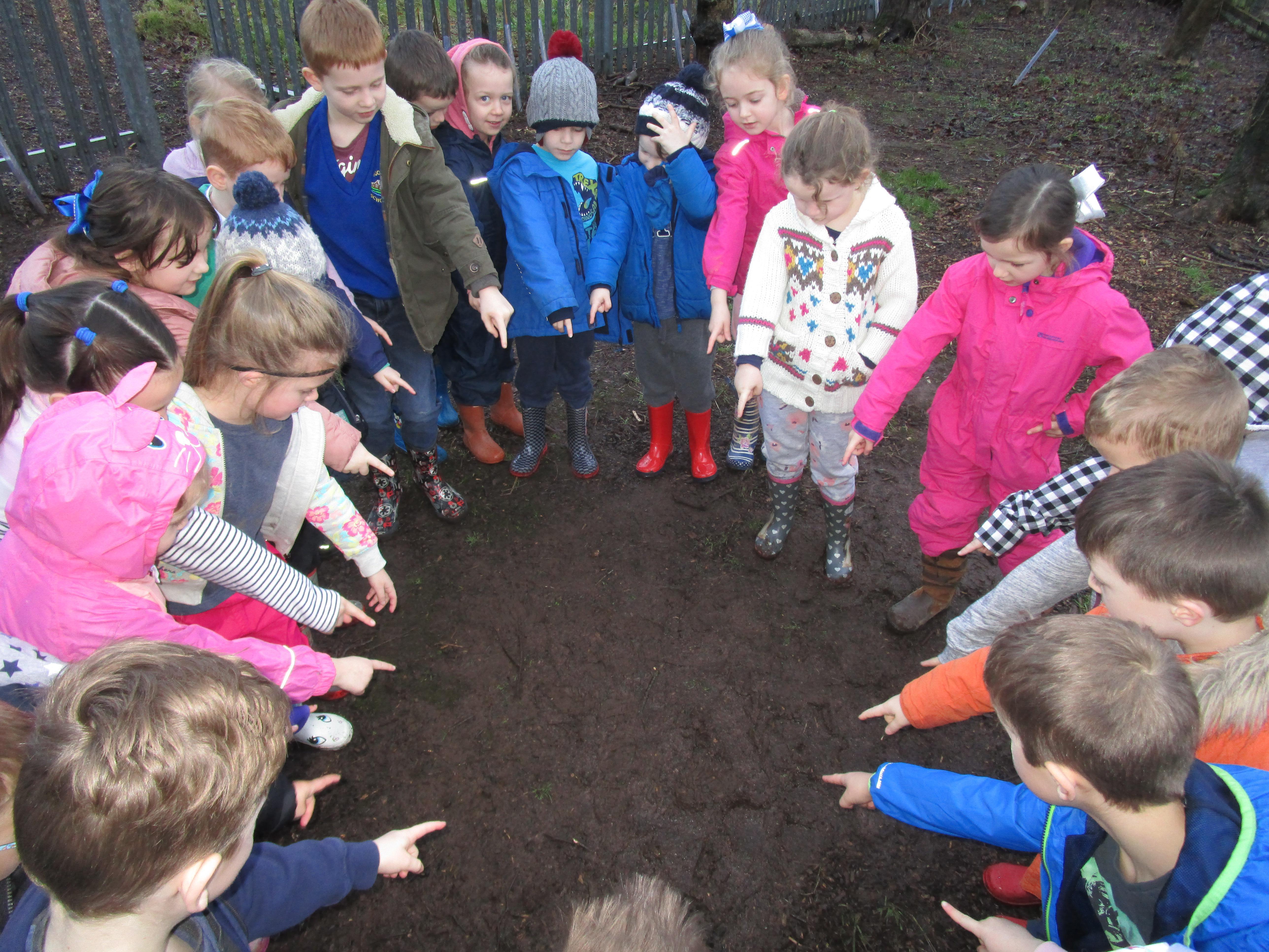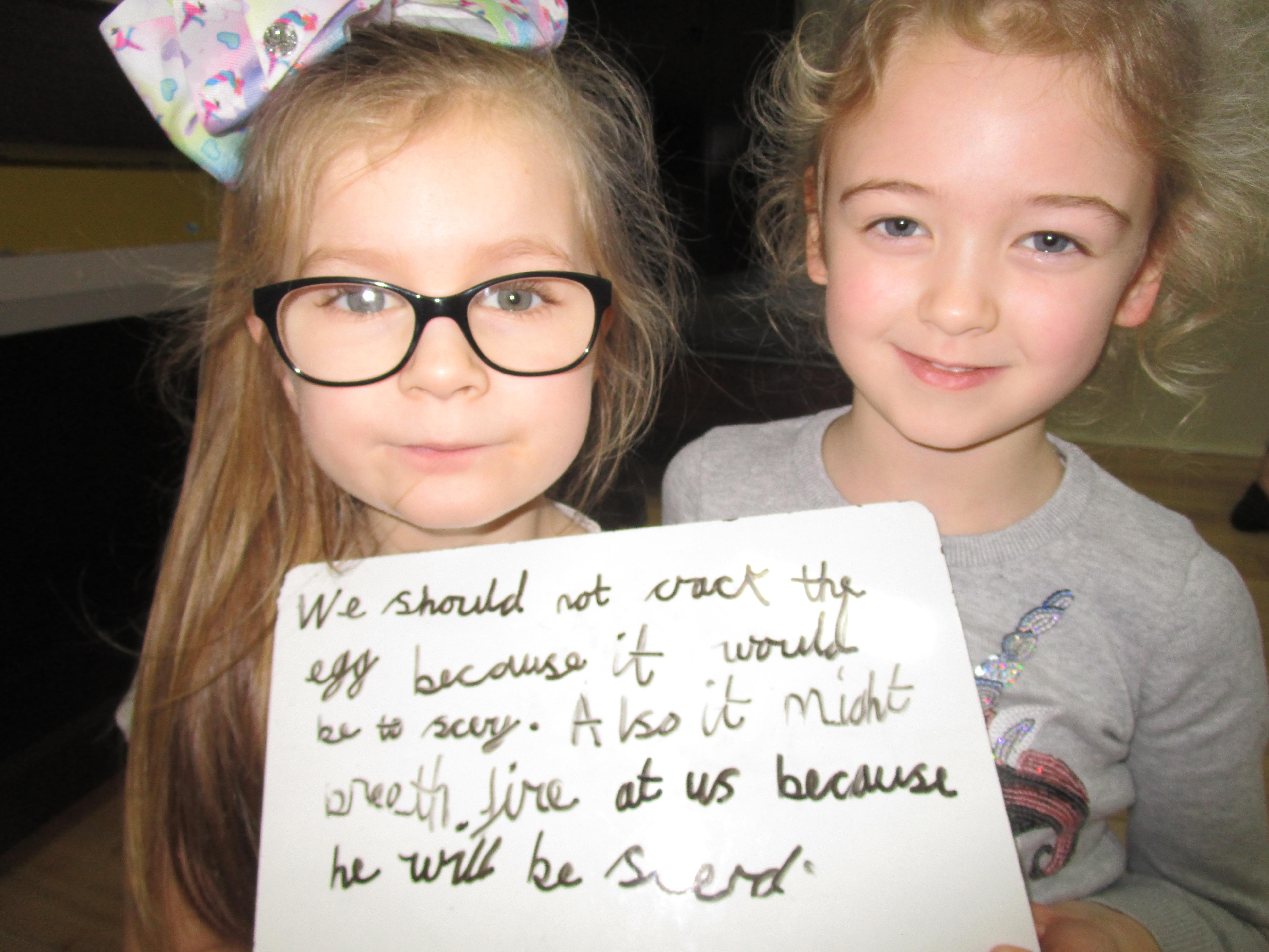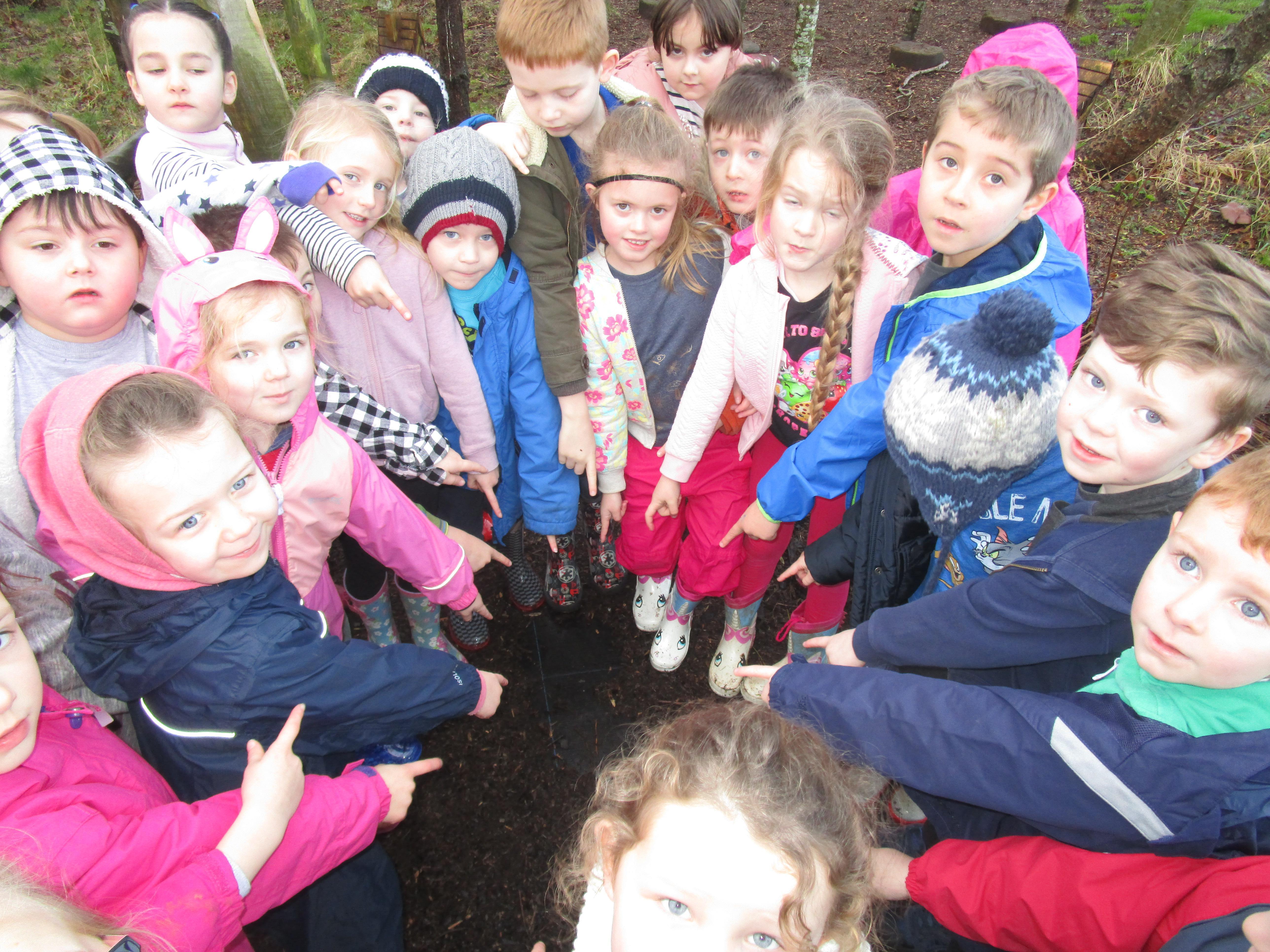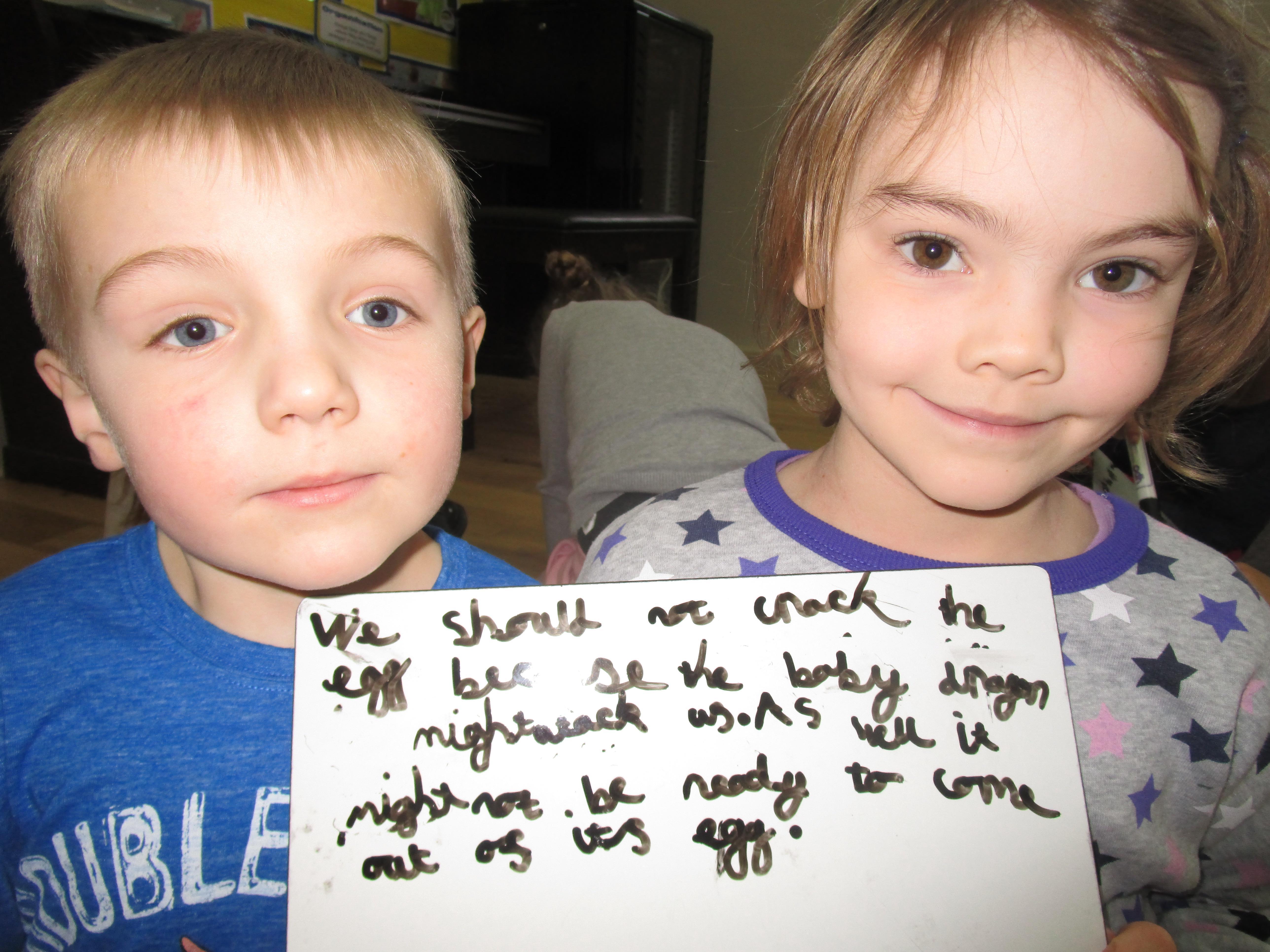Today we went to the forest area to go on a bug hunt but when we got there we were surprised to find a colourful and spotty egg in a nest! The nest even had burnt straw in it so the children guessed that it must be a dragon's egg. We listened to the egg and could hear scratching noises inside and the children even found some dragon footprints!
