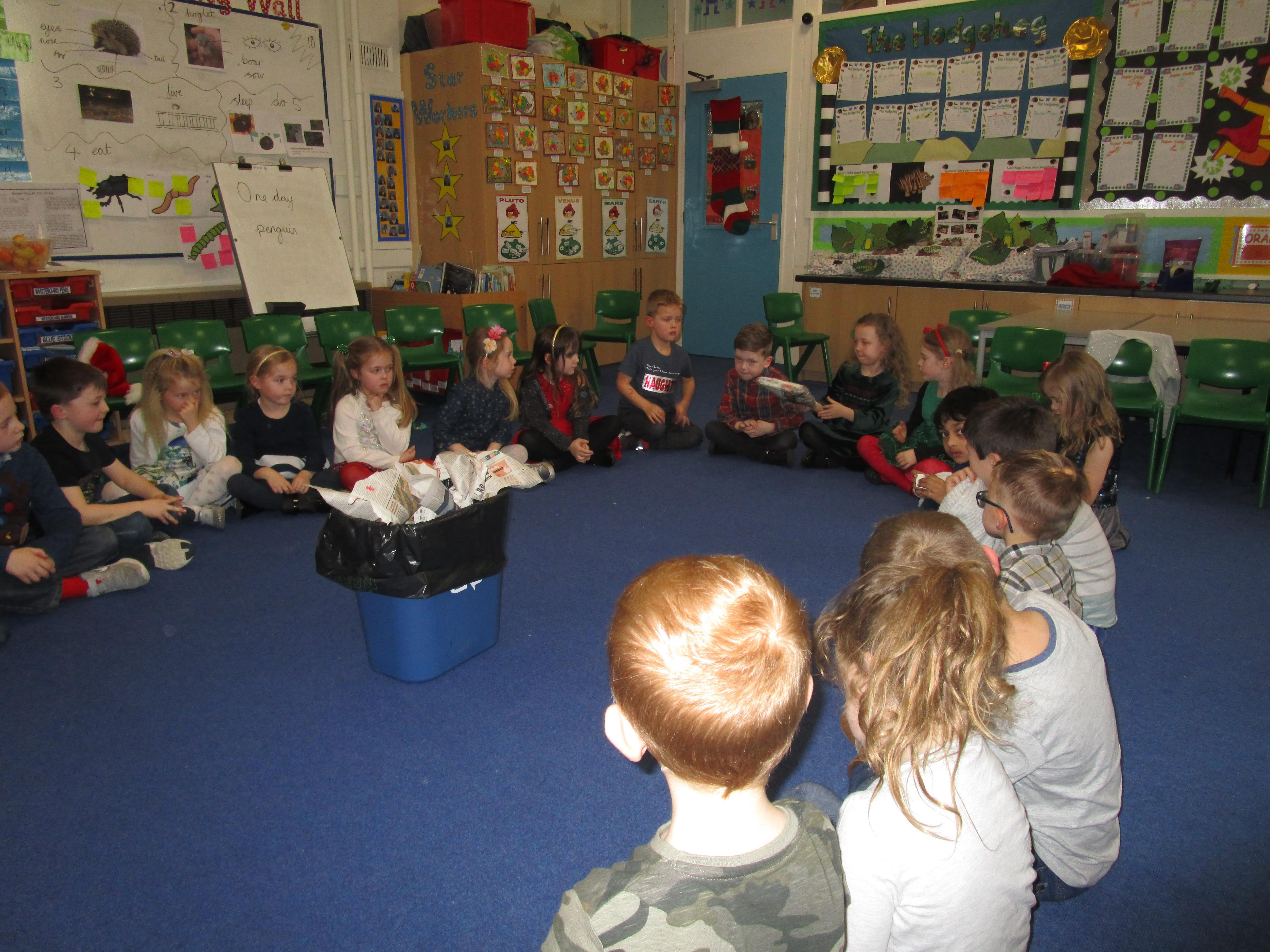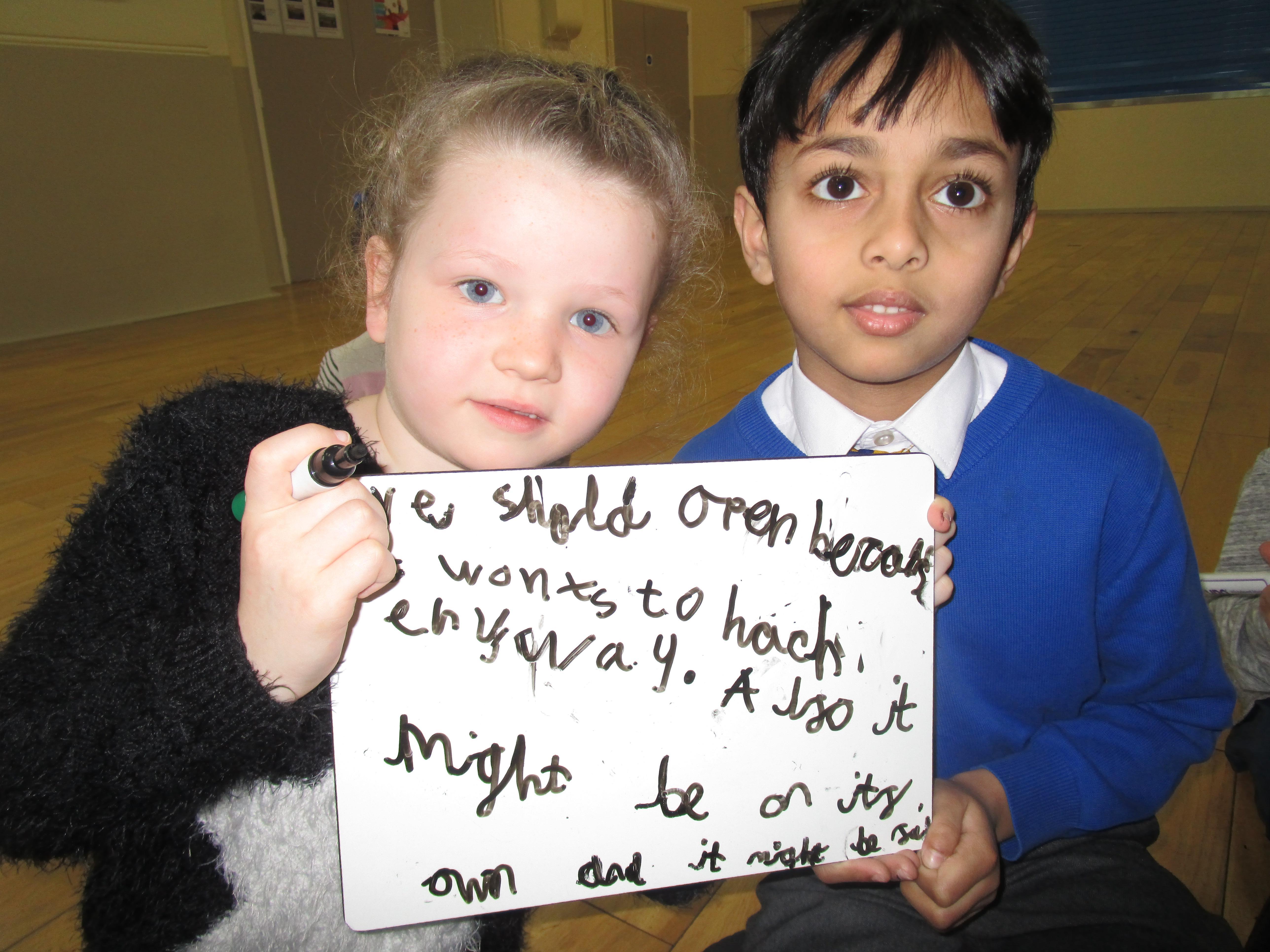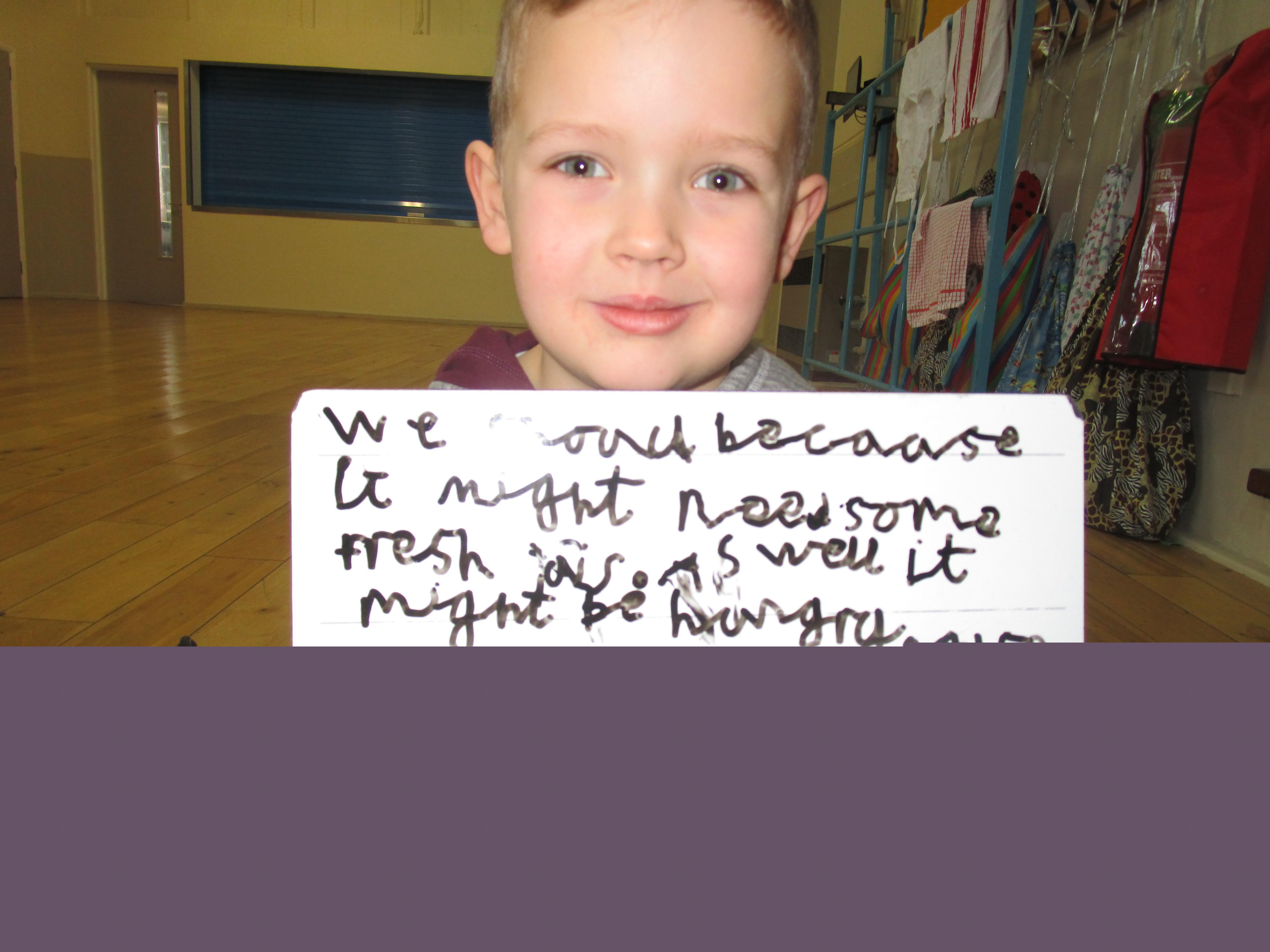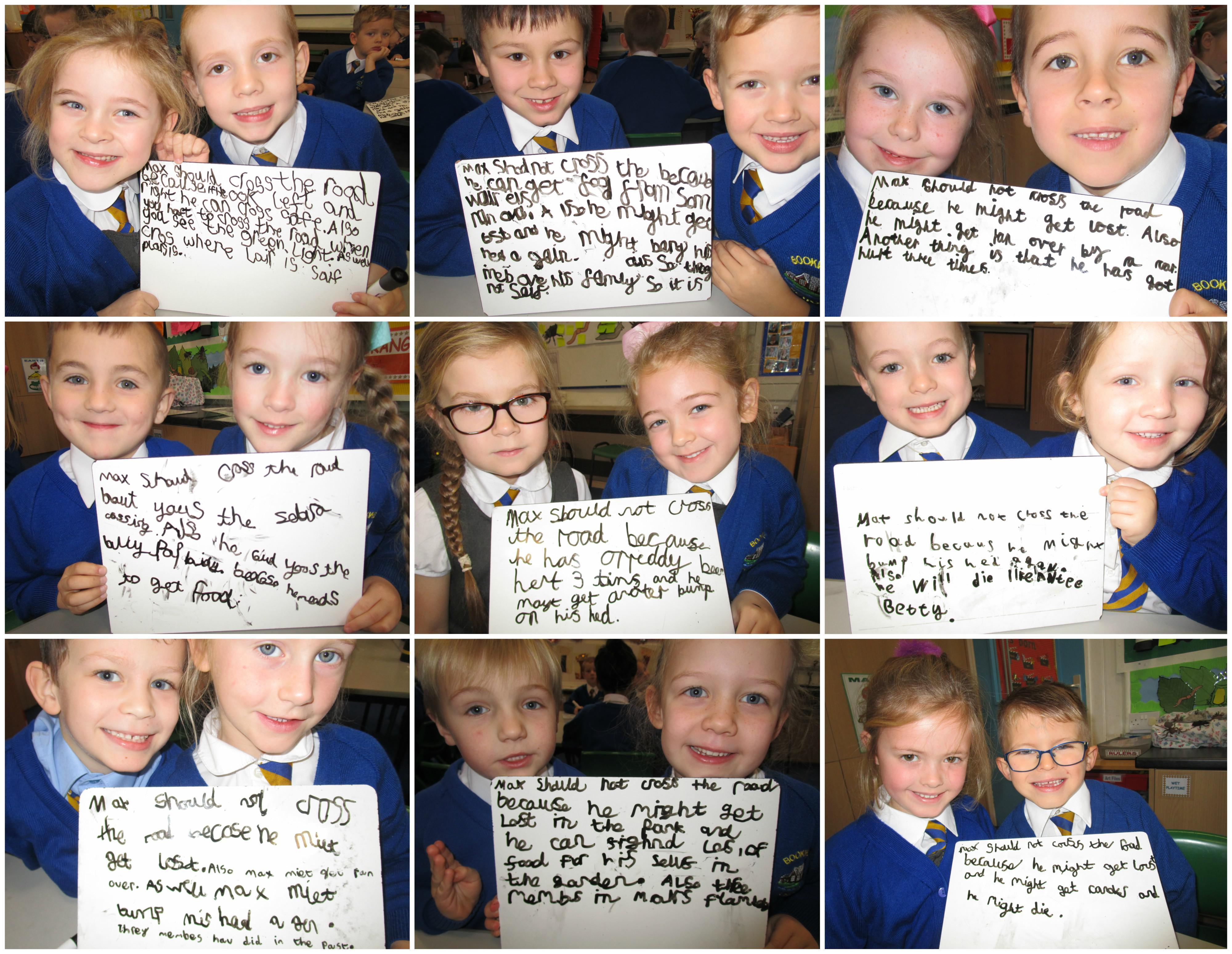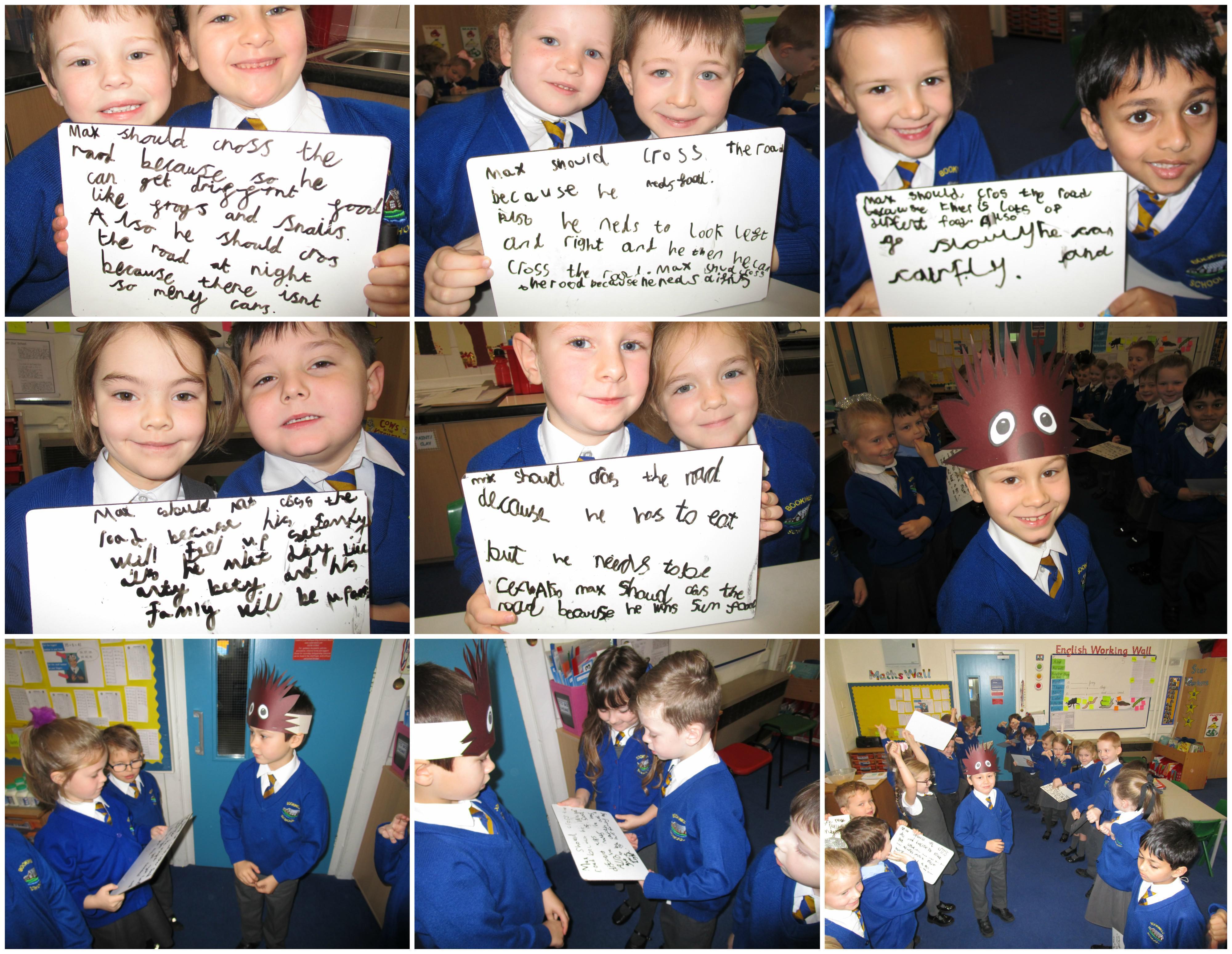 Today the children have been sequencing the Hodgeheg story. They have also been thinking of reasons why Max should and should not cross the road, using the word ‘because to help explain why. After they had thought of their reason a decision alley took place whereby the children told ‘Max’ their reason. ‘Max’ decided not to cross the road because he could find food in gardens on his street and also because it was safer.