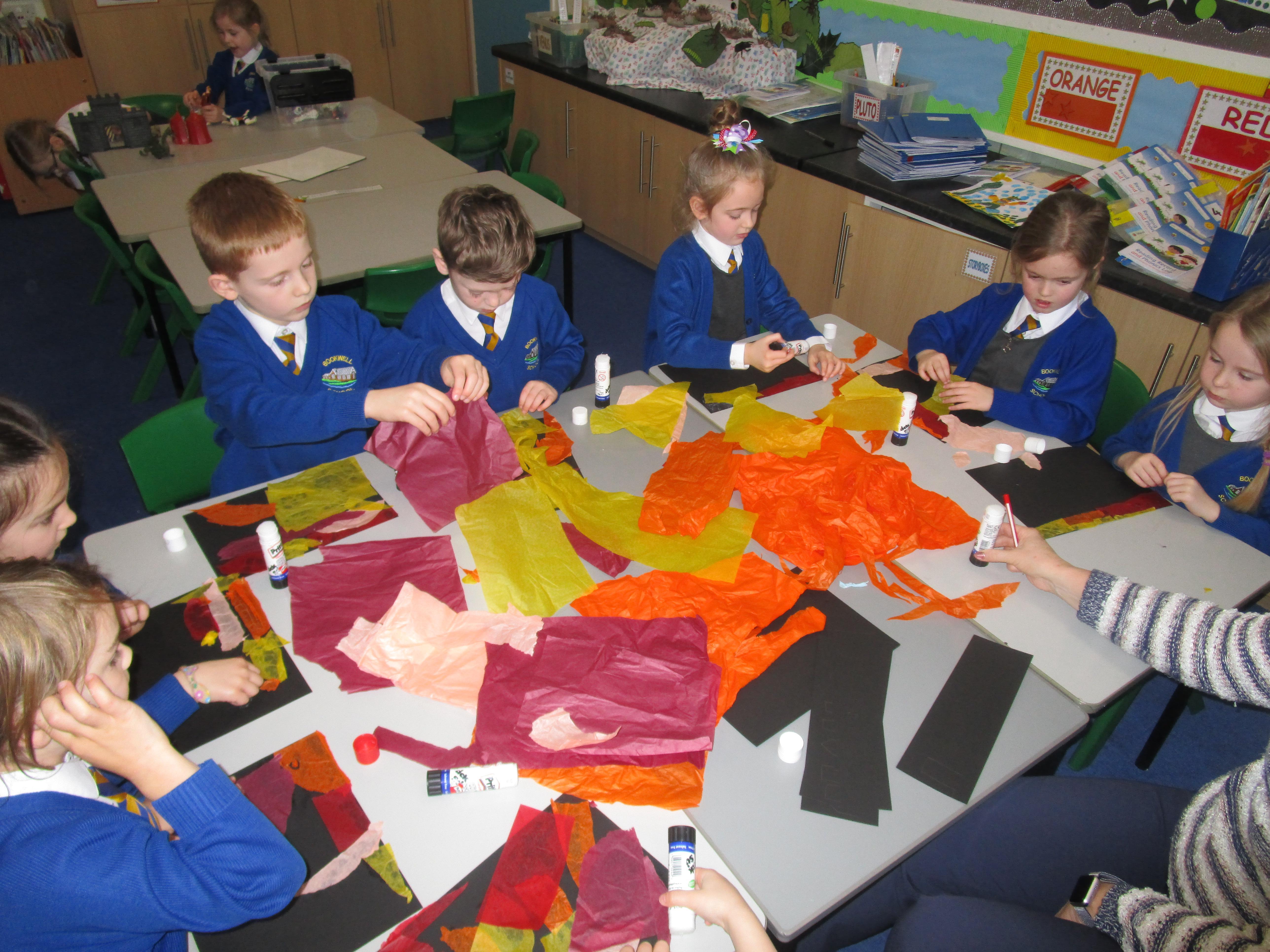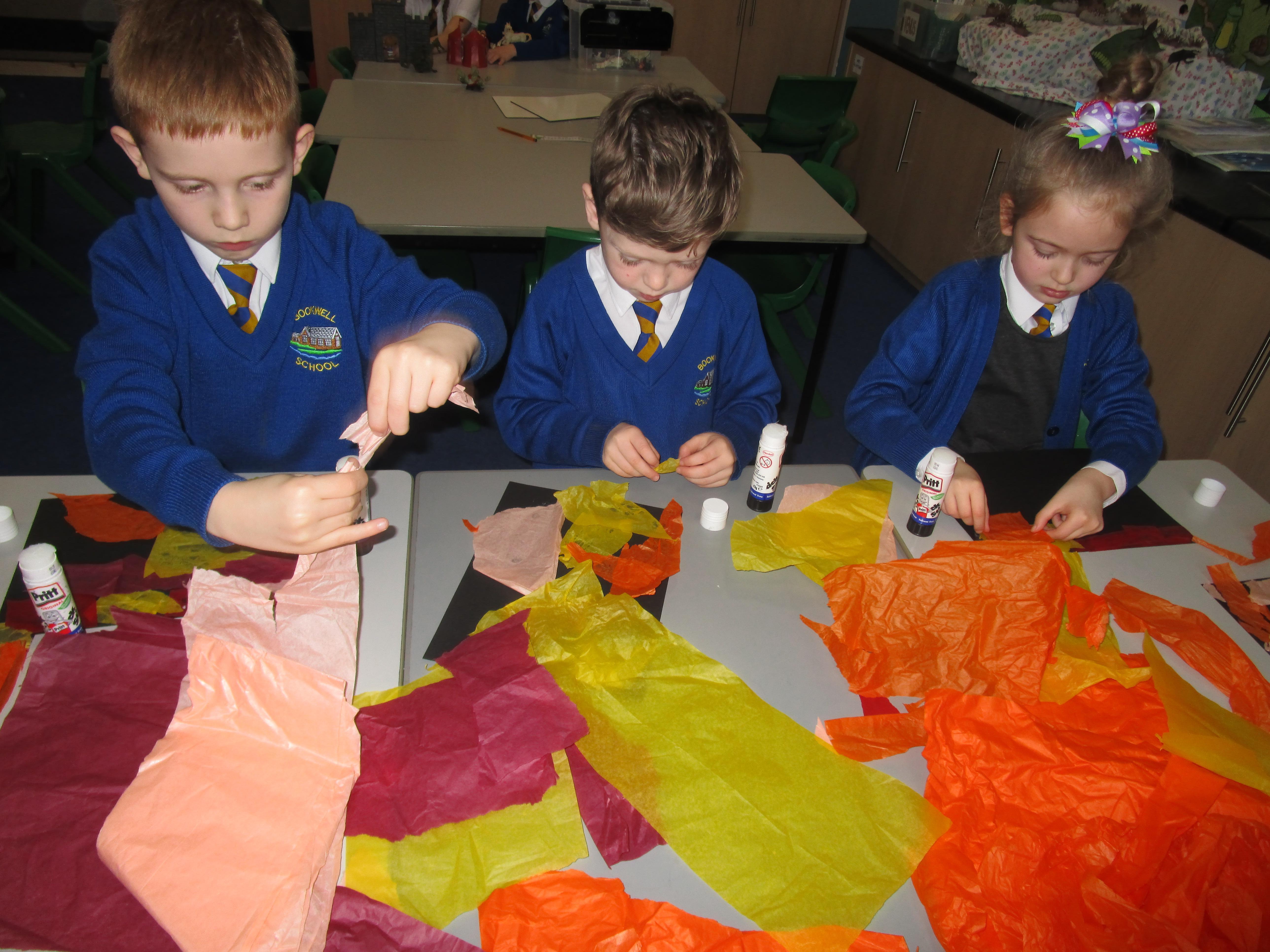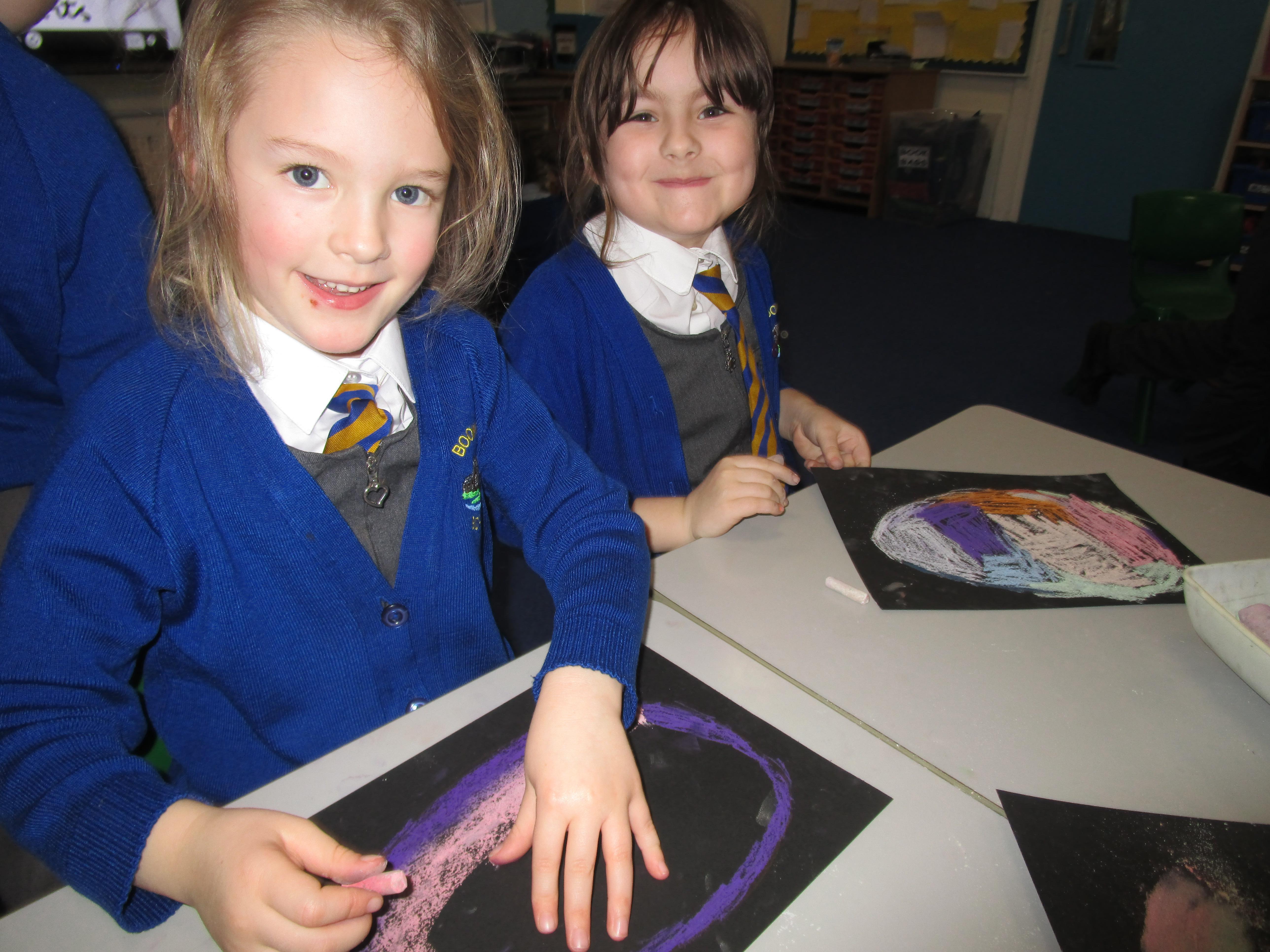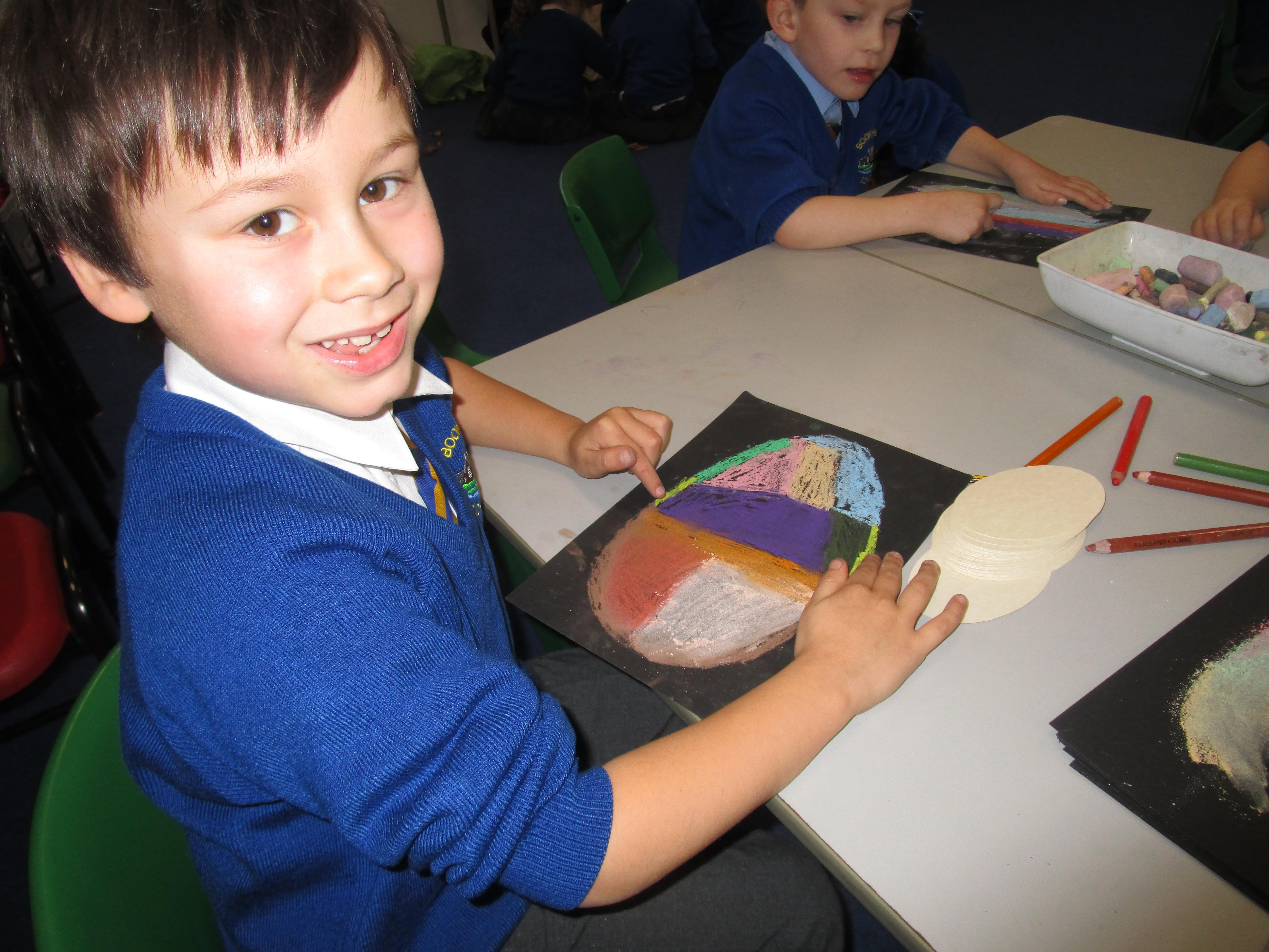 The children have created some lovely art work this week! Some children made The Great Fire of London collages with tissue paper whilst others created dragon eggs with chalk.