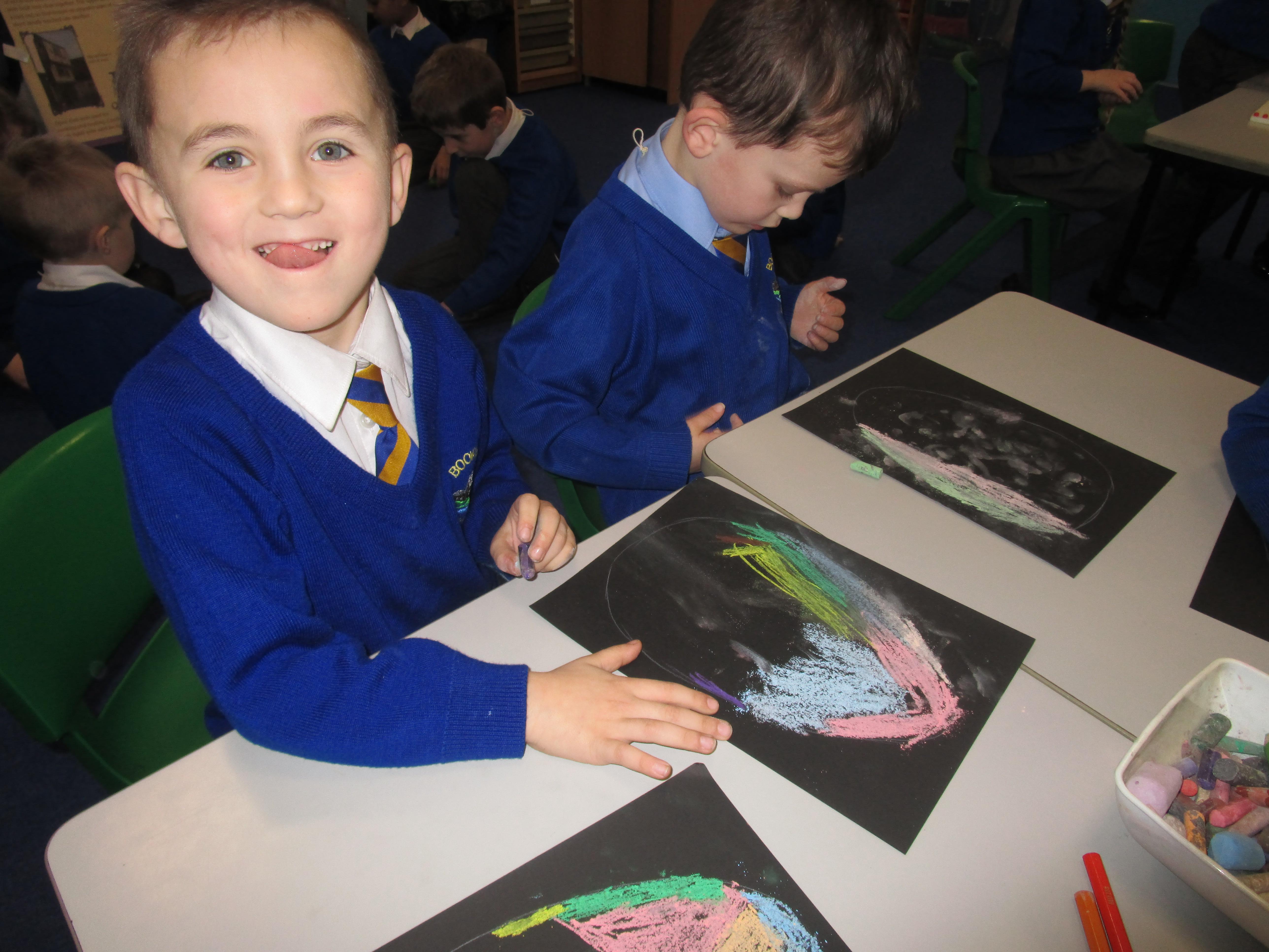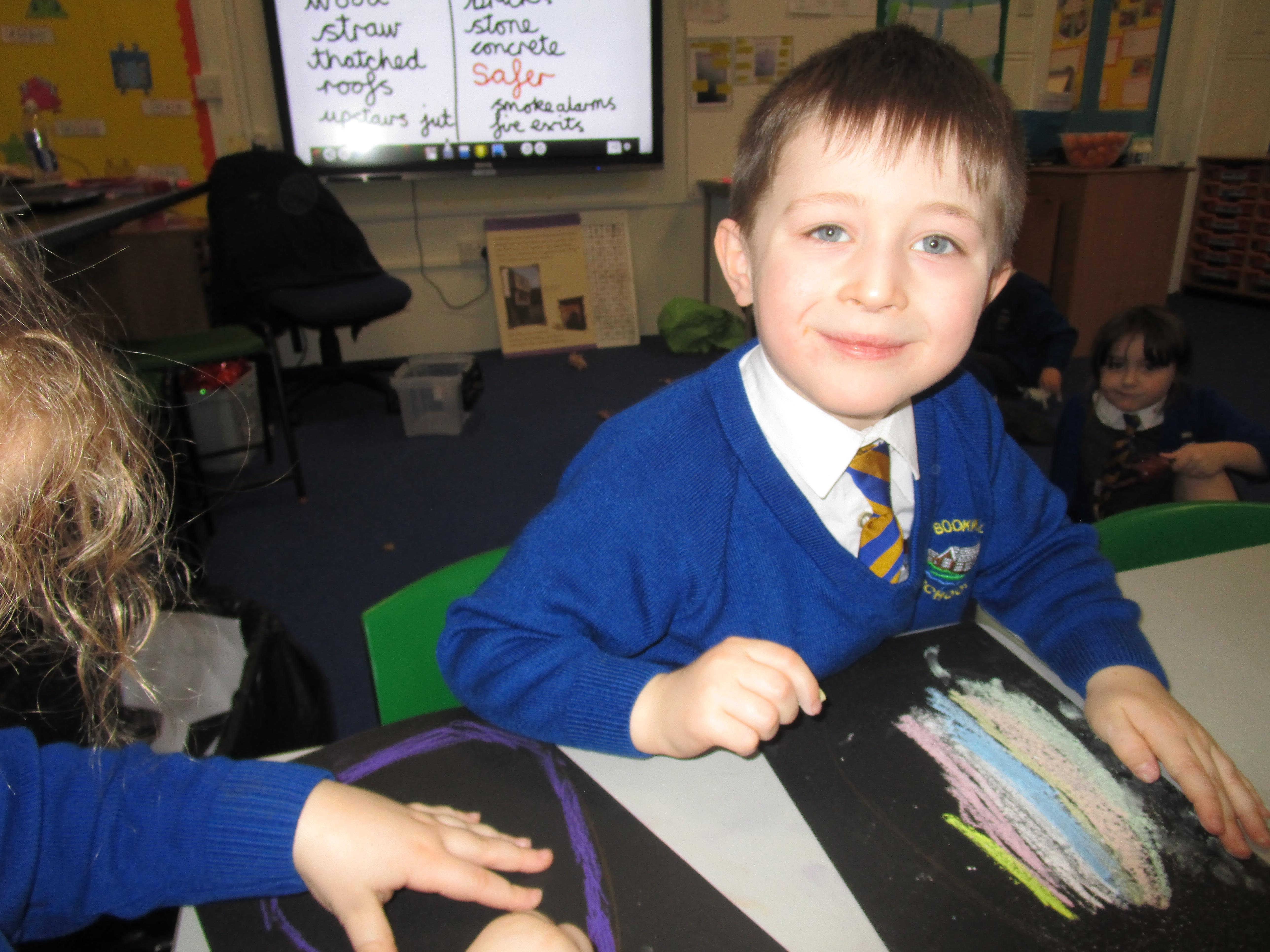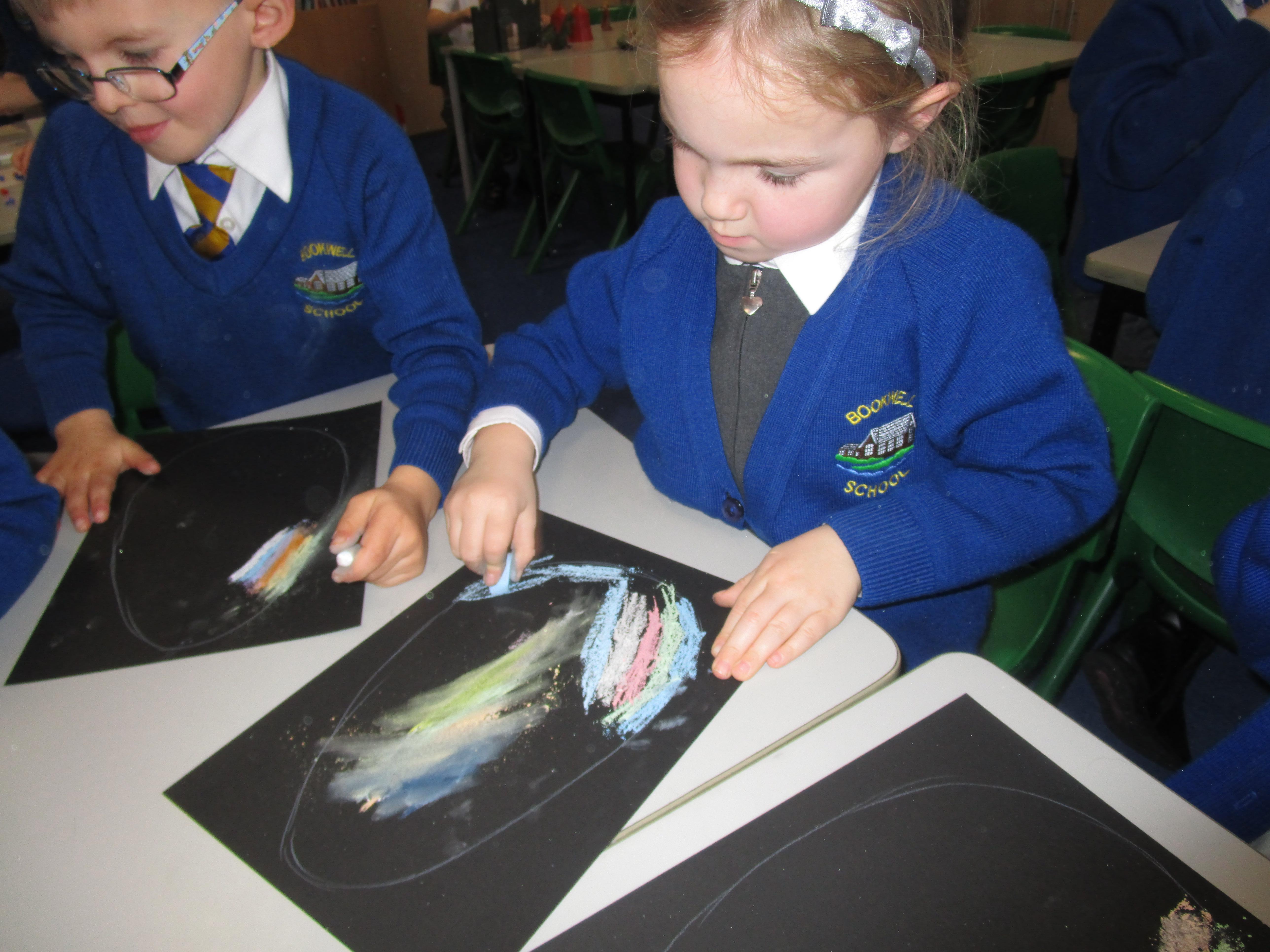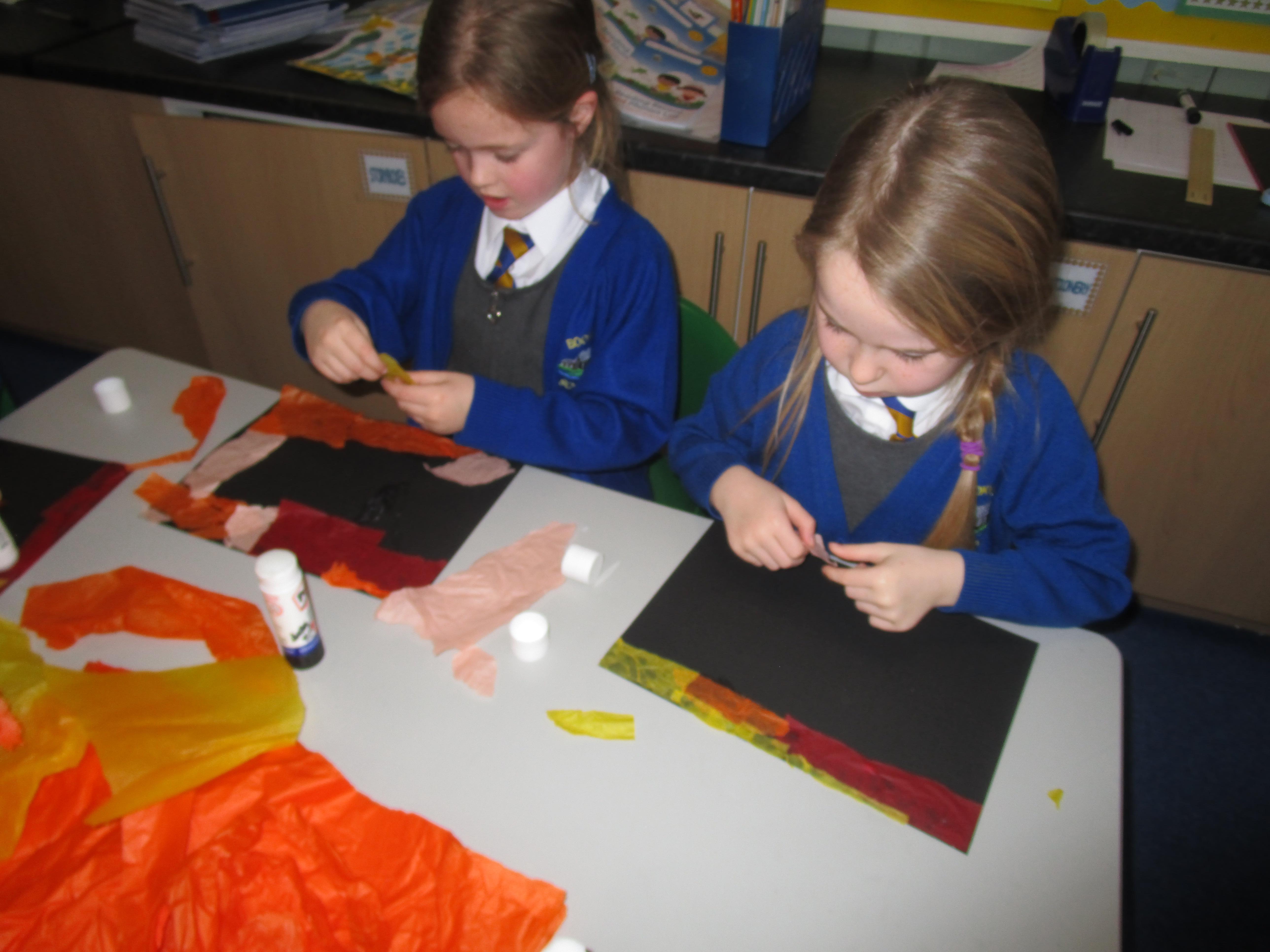 The children have created some lovely art work this week! Some children made The Great Fire of London collages with tissue paper whilst others created dragon eggs with chalk.