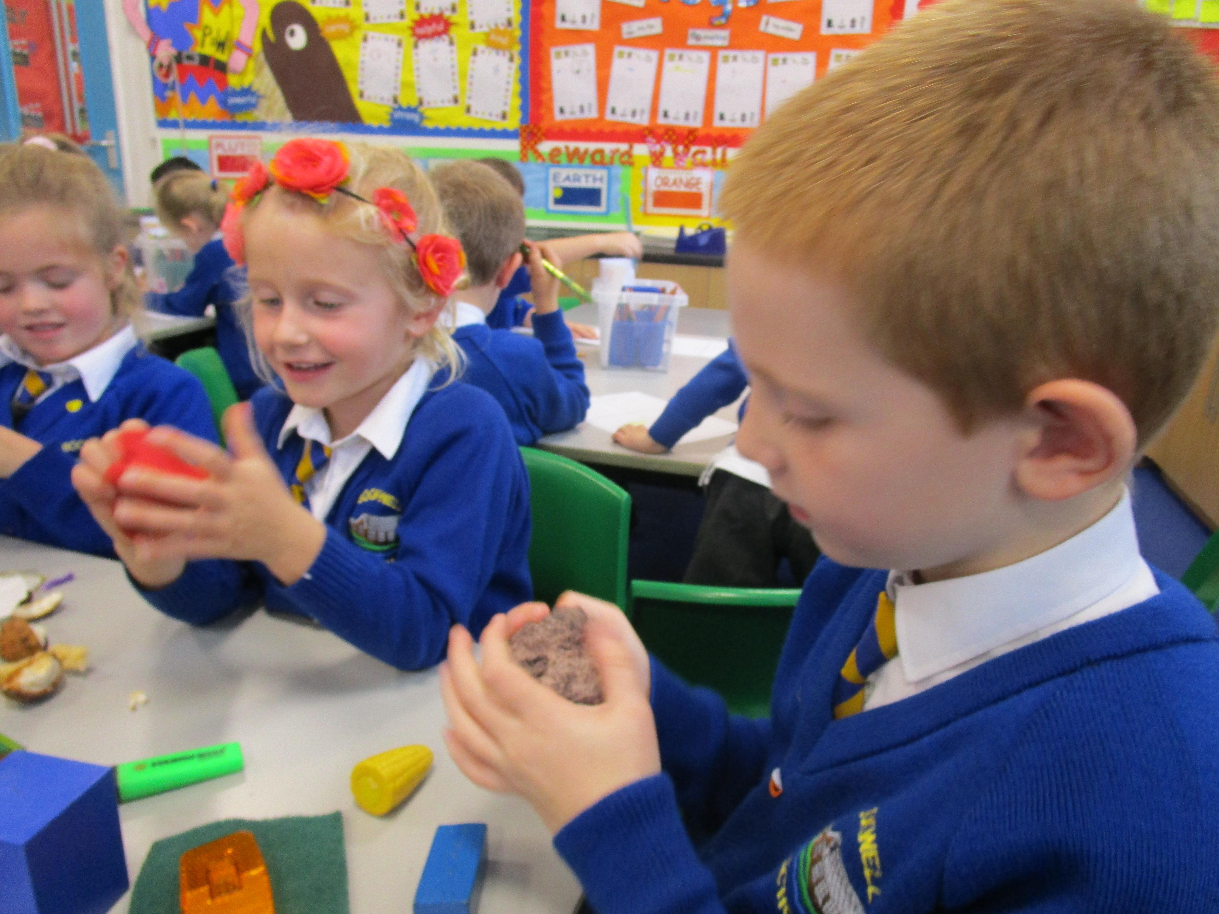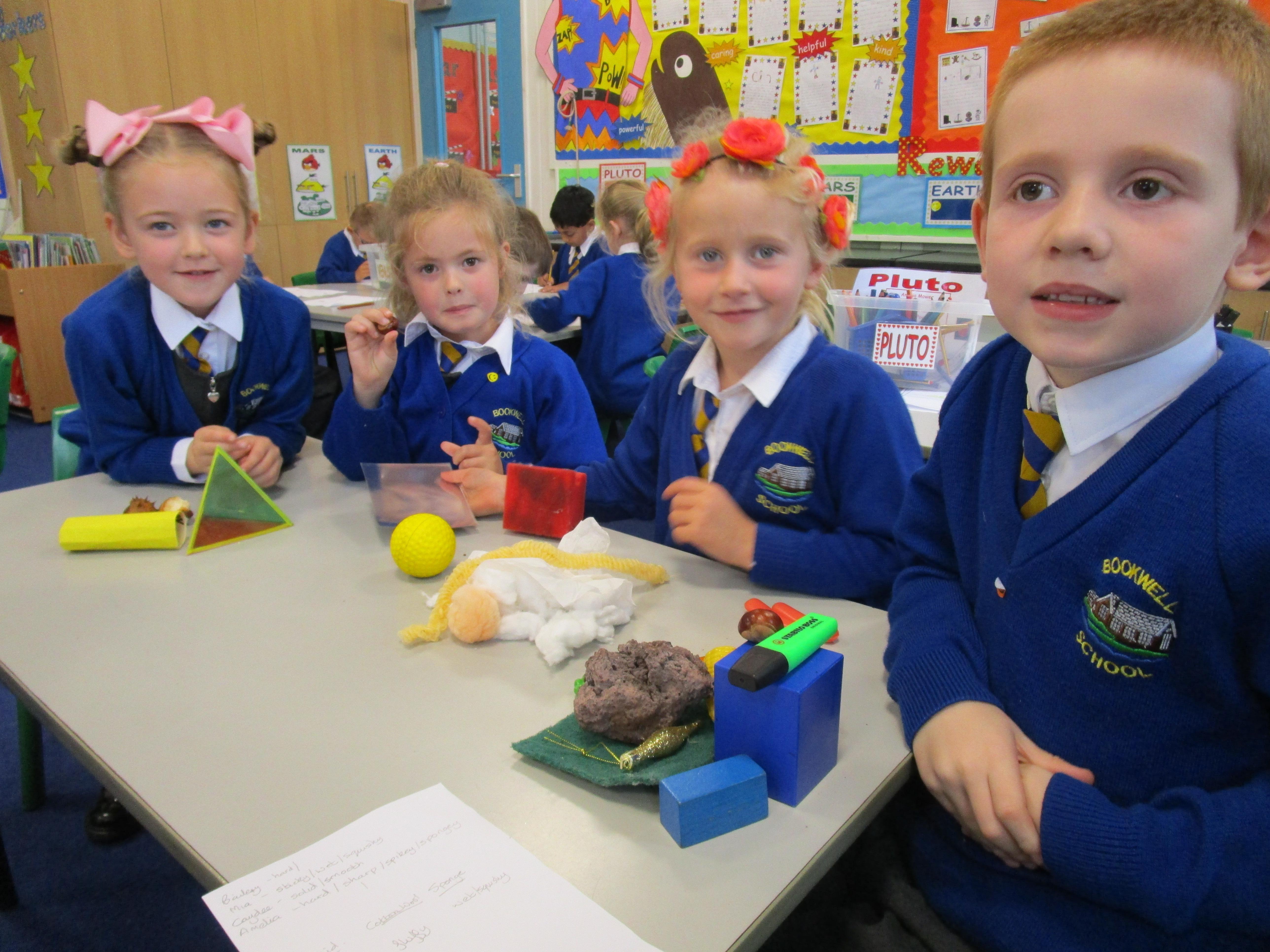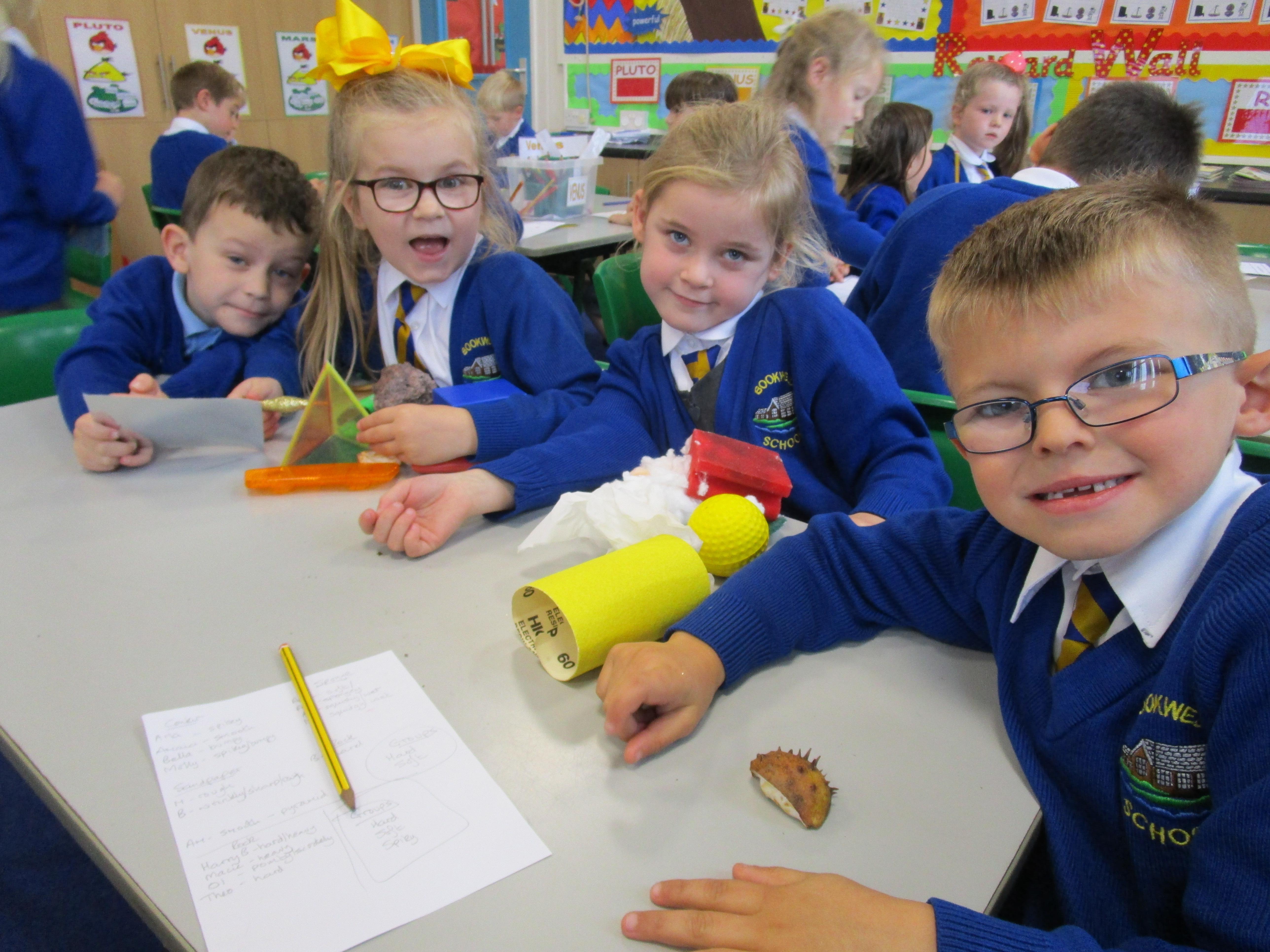 The children have been working hard sorting and grouping different materials according to their properties. The properties the groups listed were that the materials were either: hard, soft, rough, smooth, squidgy, prickly, woolly and furry.