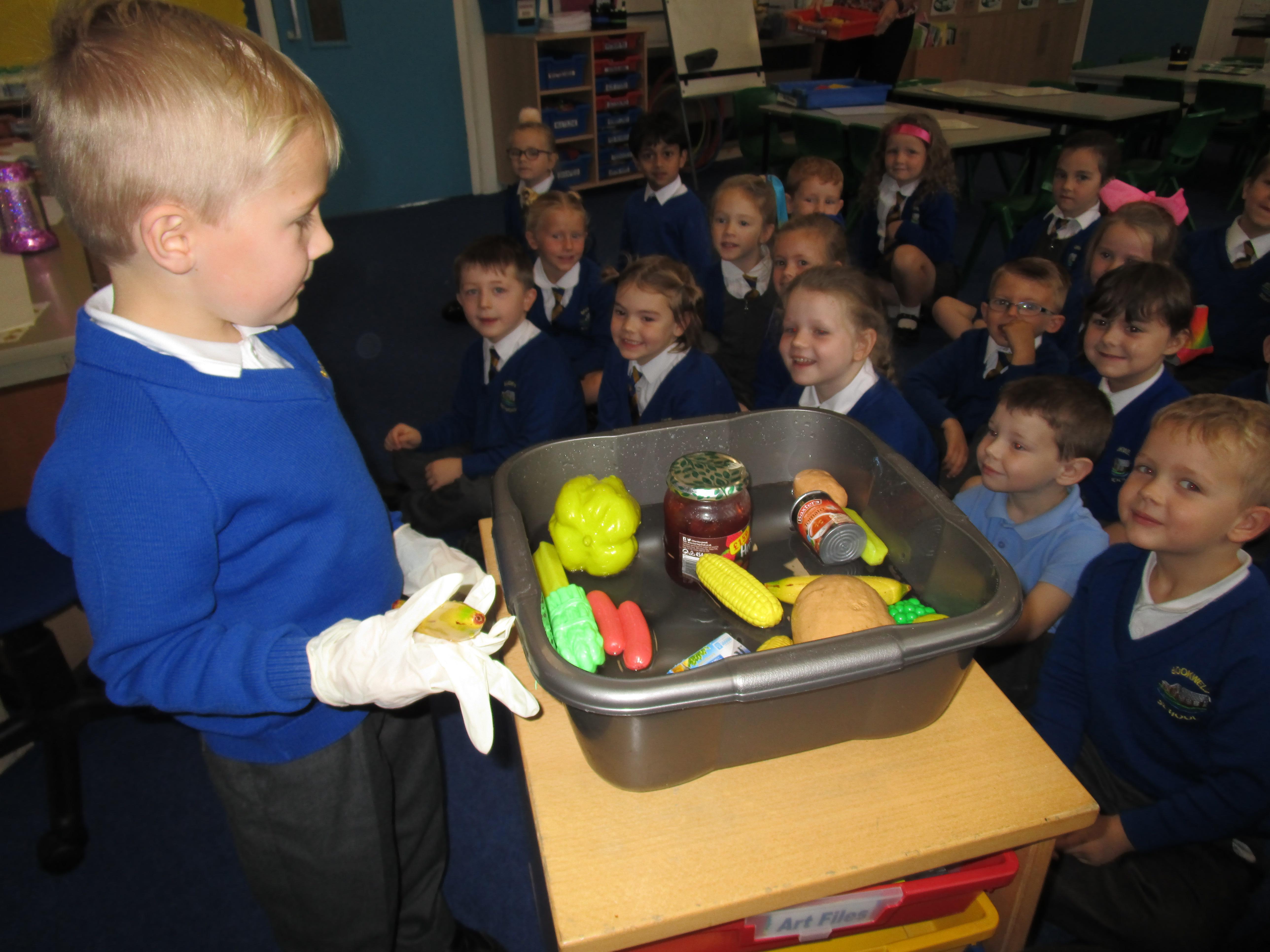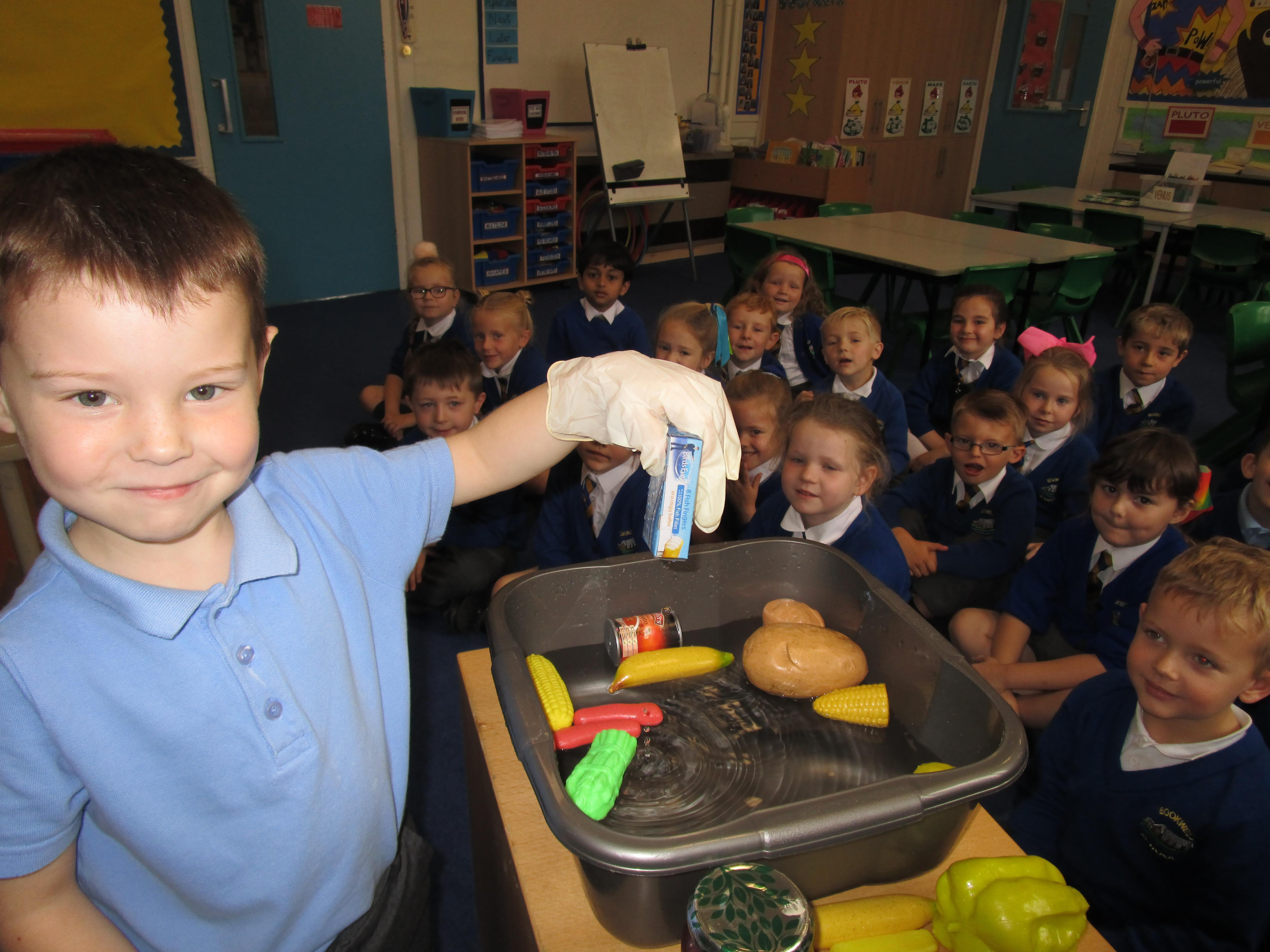 The children have been exploring the sink that Traction Man had to go in to rescue Scrubbing Brush. They were excited to discover all of the different obects in the sink. We spent time describing each item and thinking of adjectives the children could use when describing each item. Later in the week the children will be writing about the items that they could see in the sink