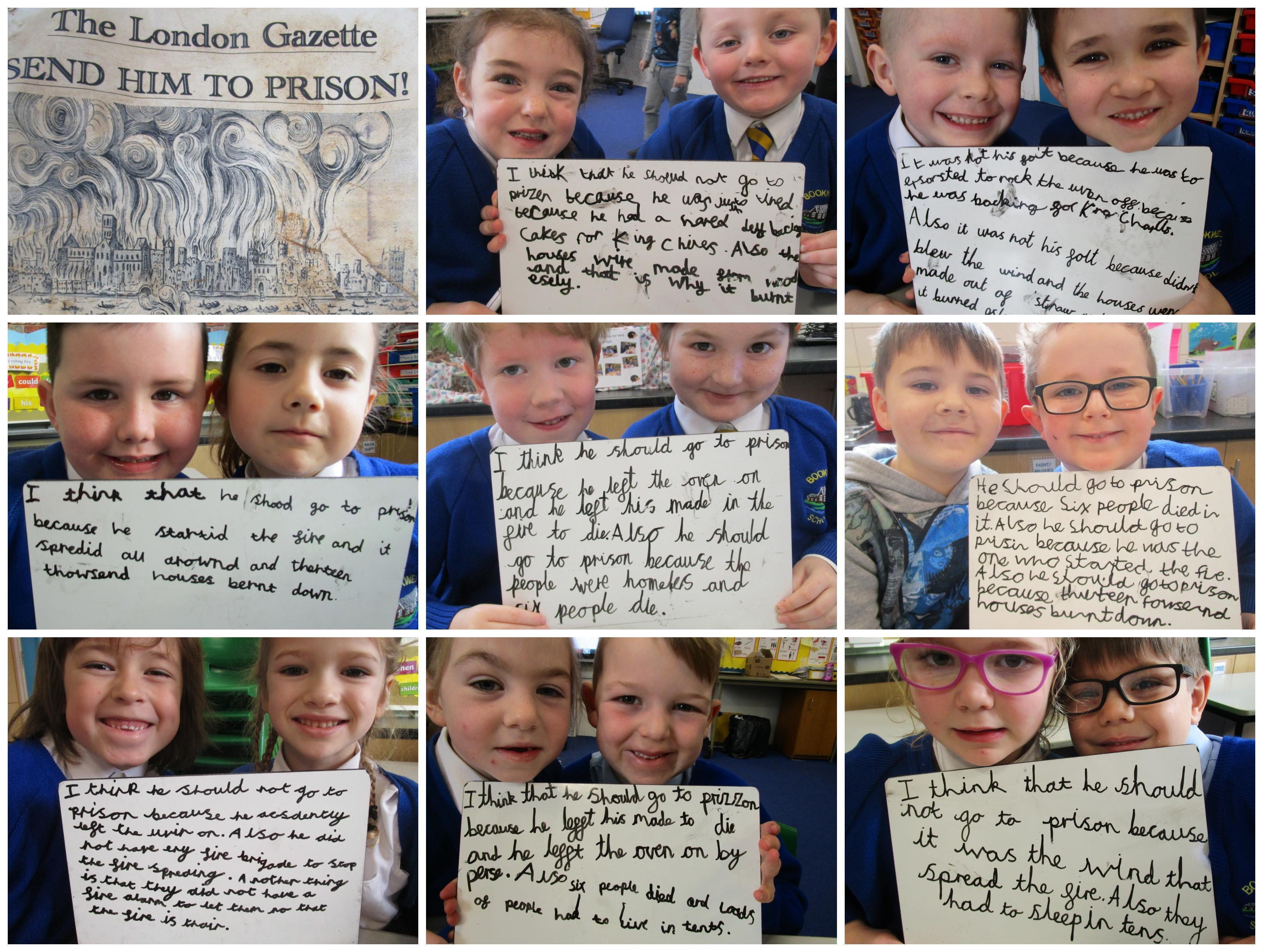 Today in class we completed our Great Fire of London topic. First the children had to think of questions to ask Thomas Farriner and then they had to write opposing arguments for why he should or should not have gone to prison. The children decided that he should go to prison because he started the fire and he did not help his maid escape to safety.
